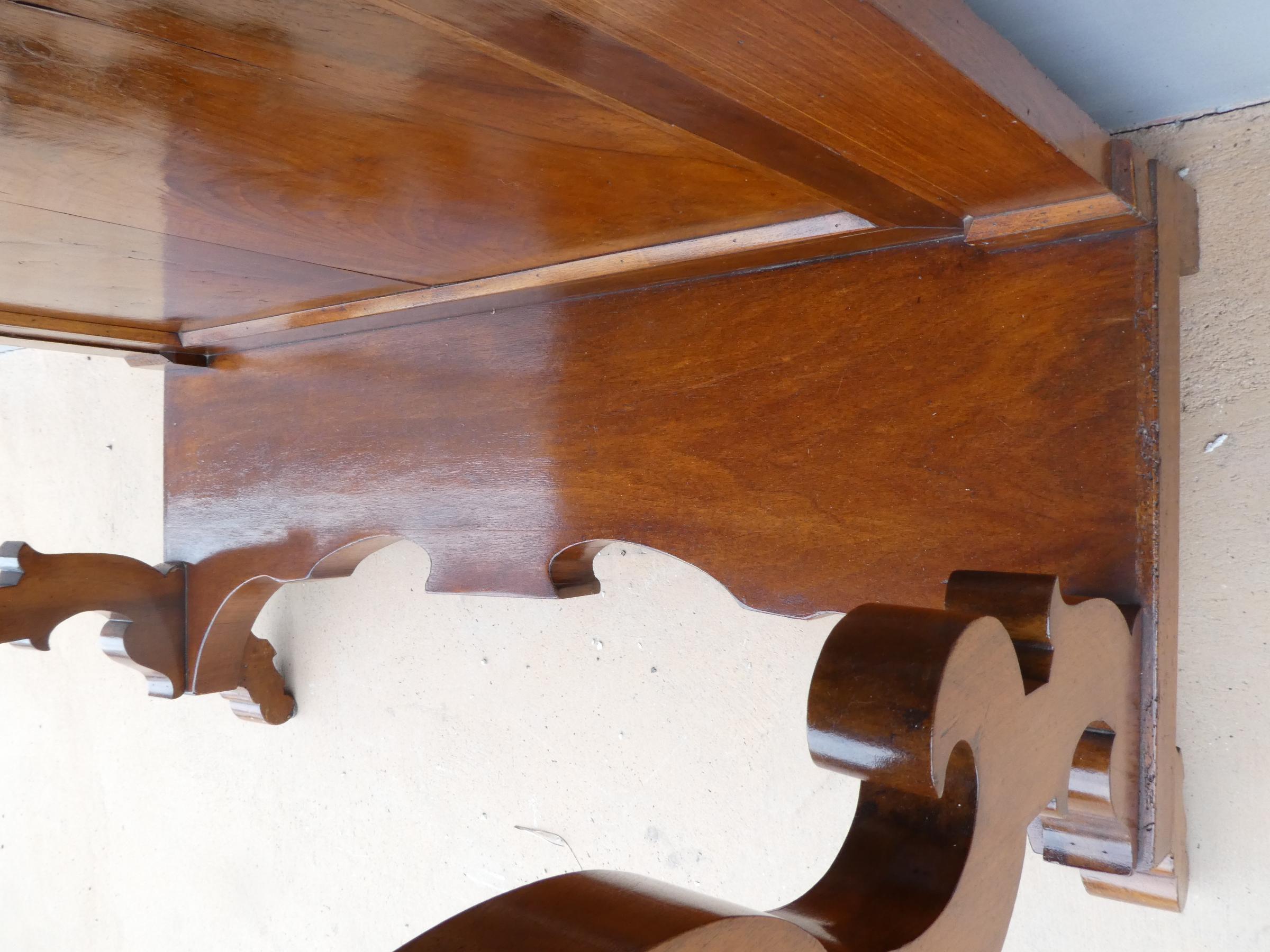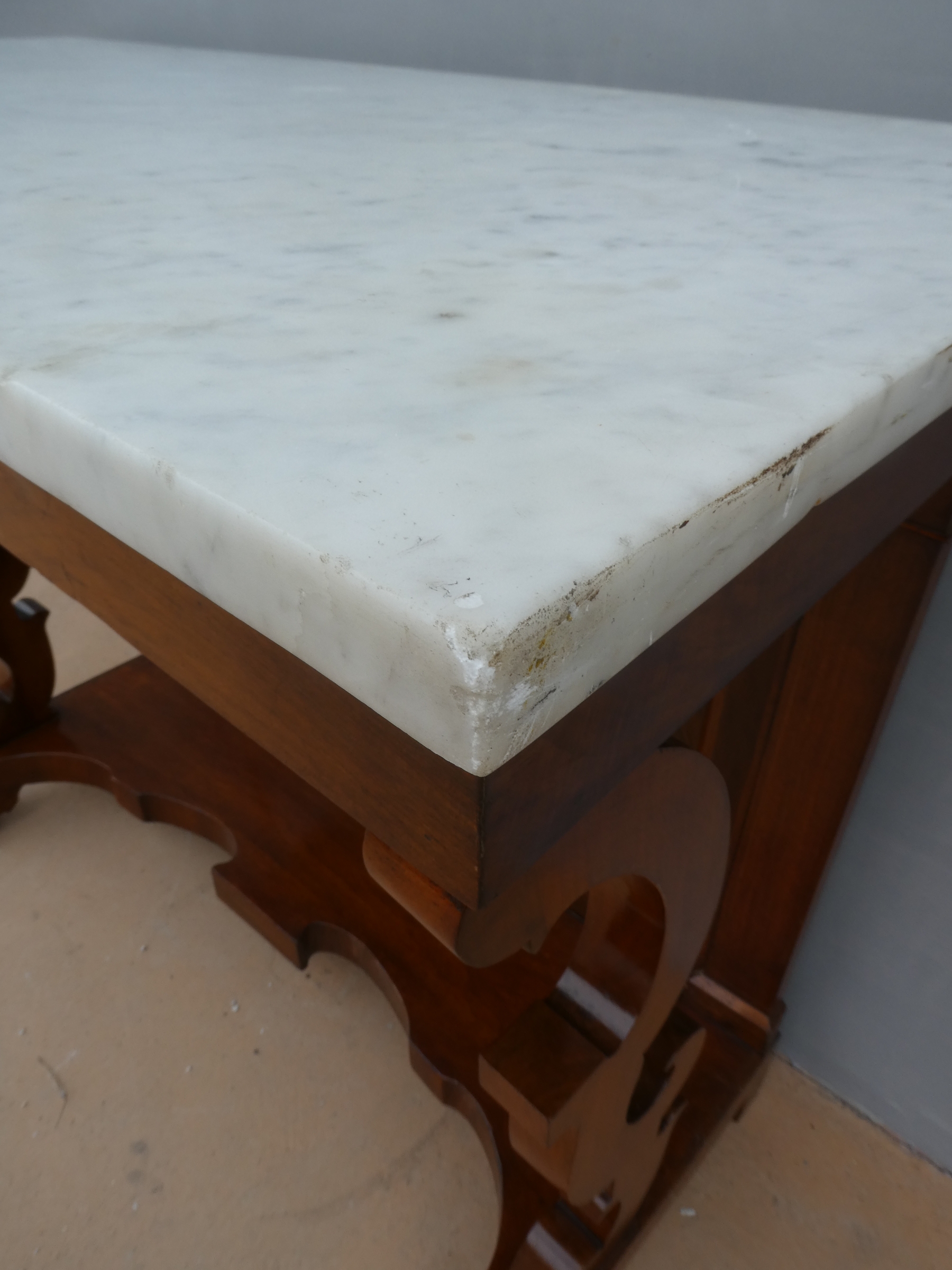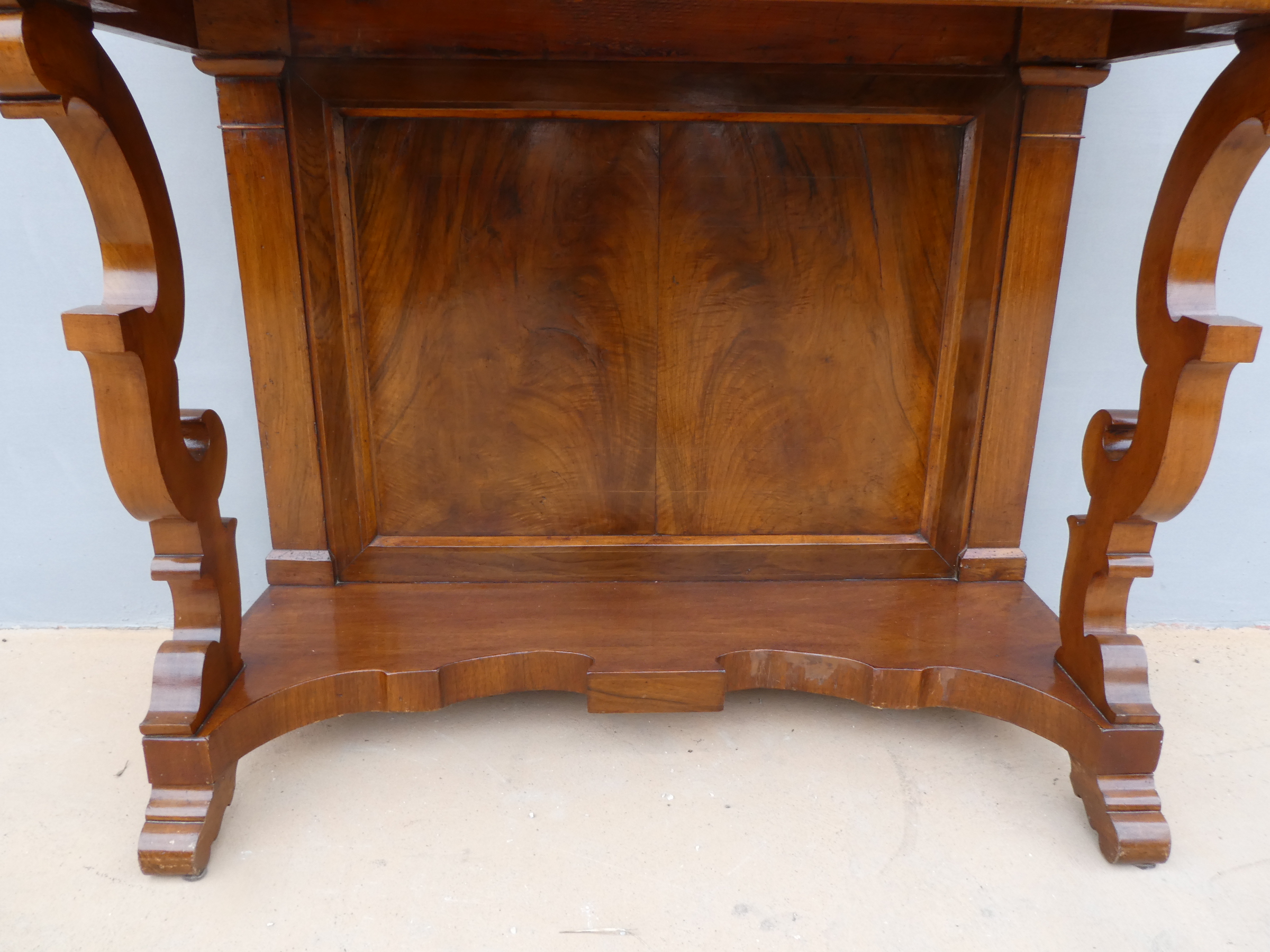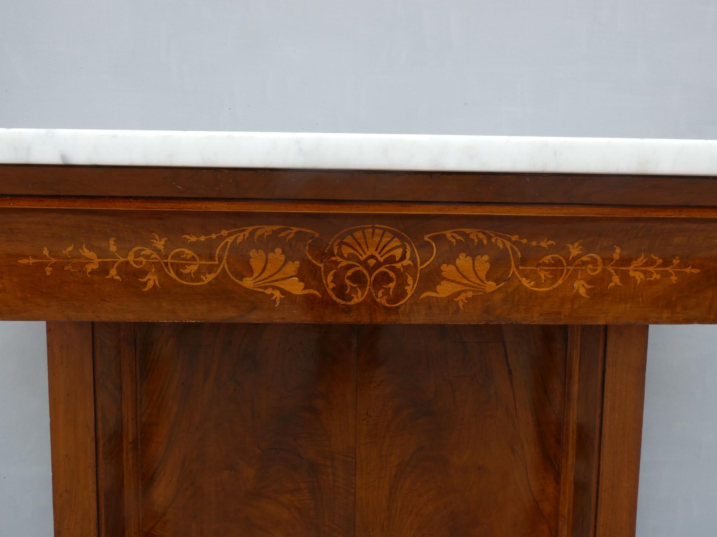 Console mobile d’appoggio ligure st.Carlo X, dotata di un piano d’appoggio in marmo ed appartenente d’epoca alla seconda metà dell’800. La struttura si presenta solida ed armoniosa, e vanta proporzioni sapientemente equilibrate. La ricerca di un decoro mirato si riflette anche sulla scelta d’impreziosire il corpo con delicati intarsi, che spiccano contrastanti sulla raffinata superficie in noce che fa da sfondo. Necessita di leggeri interventi di restauro.