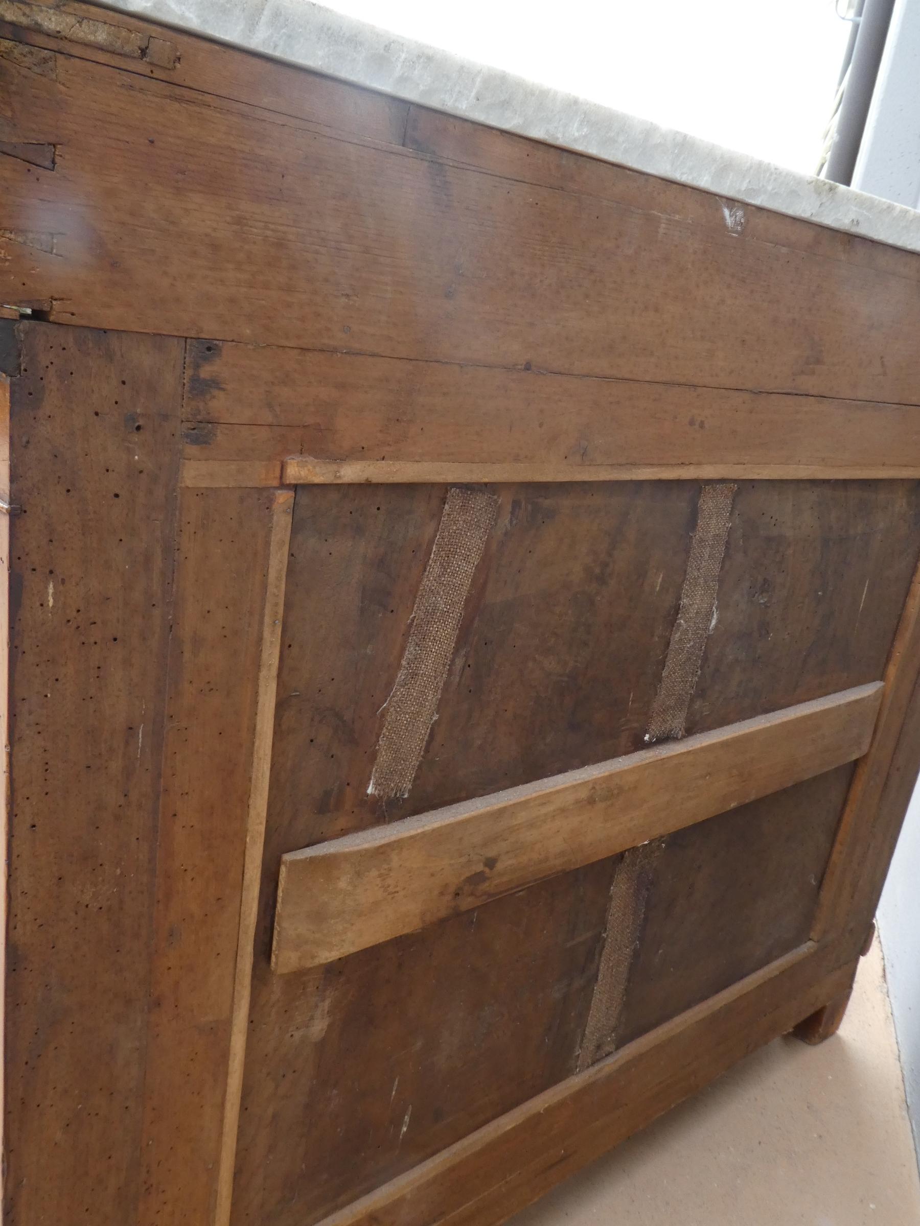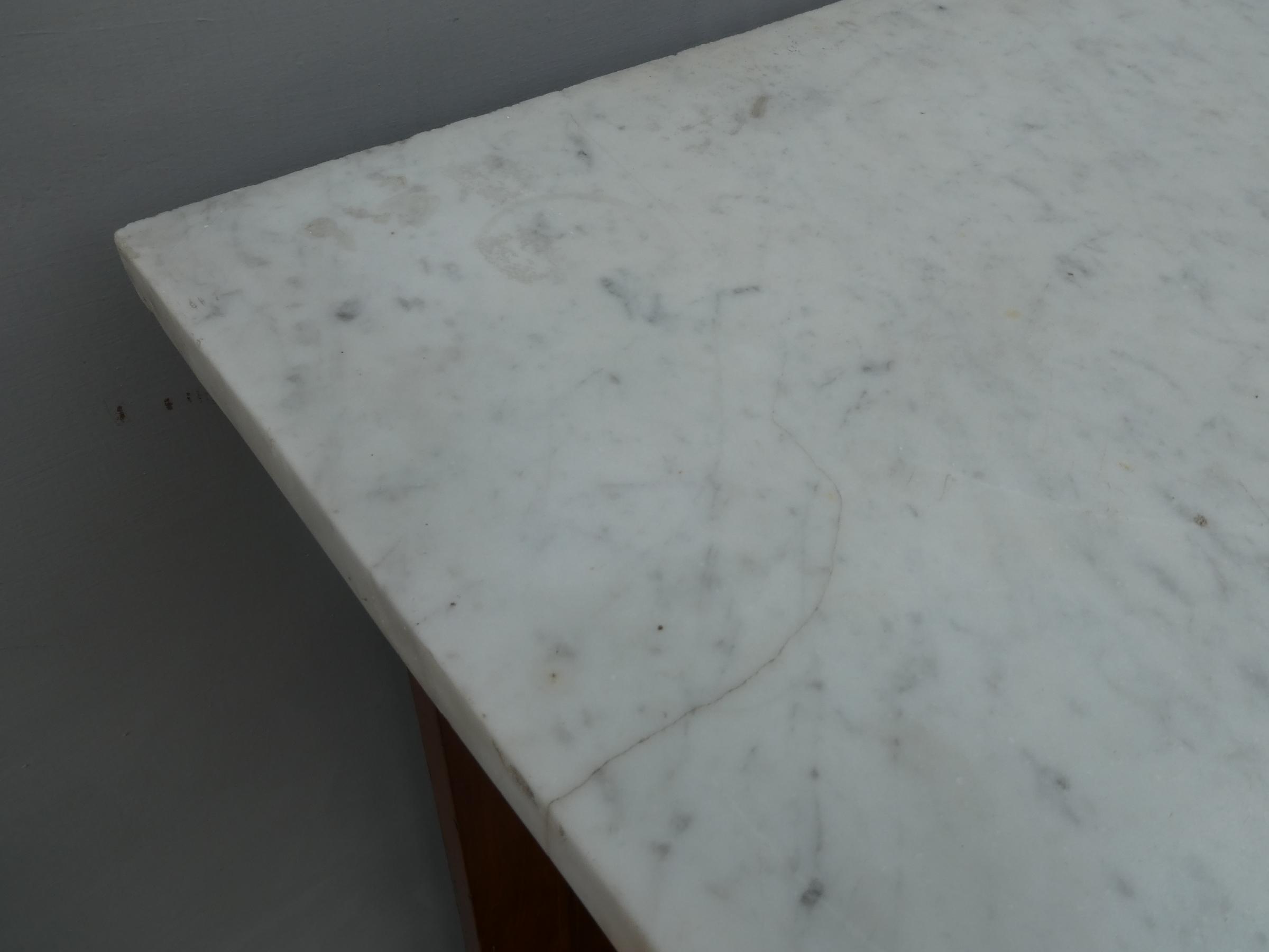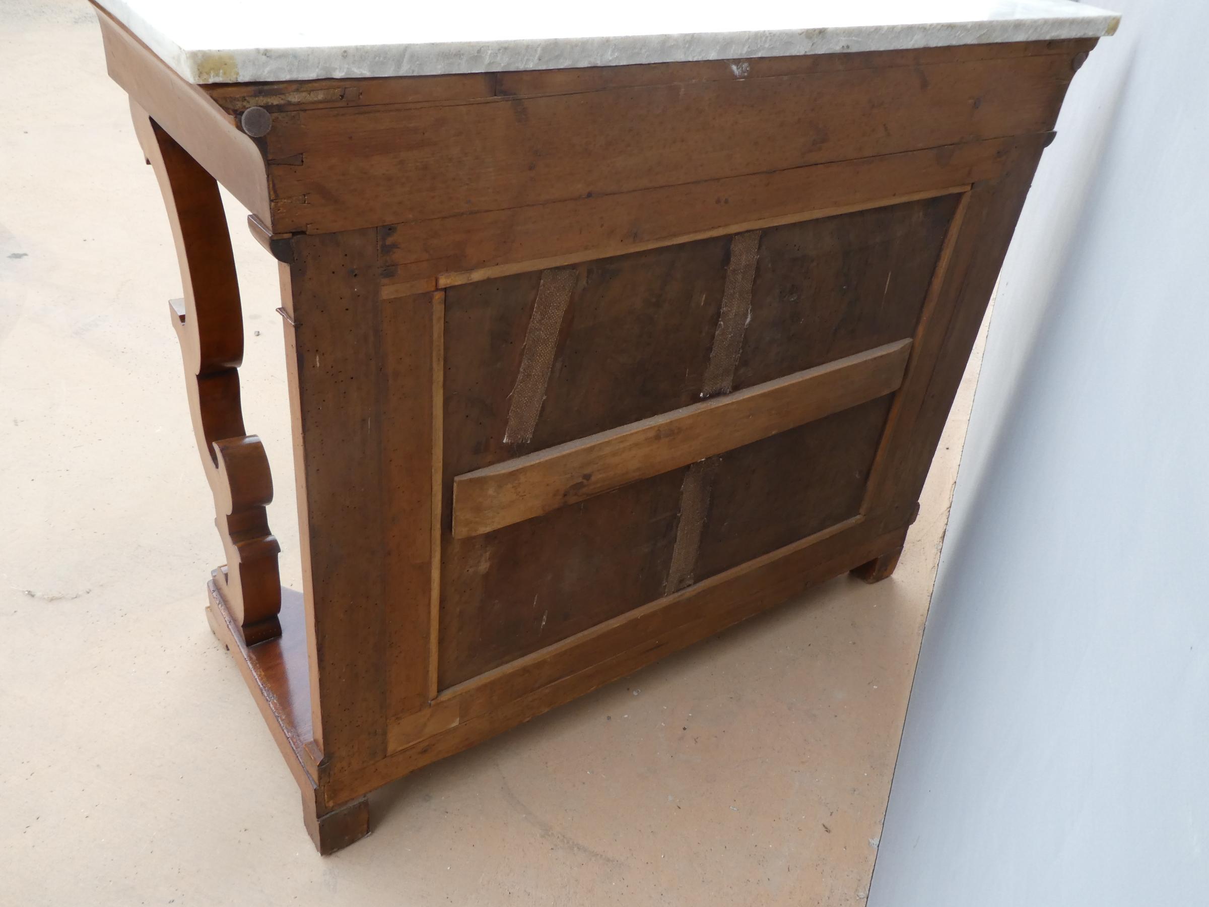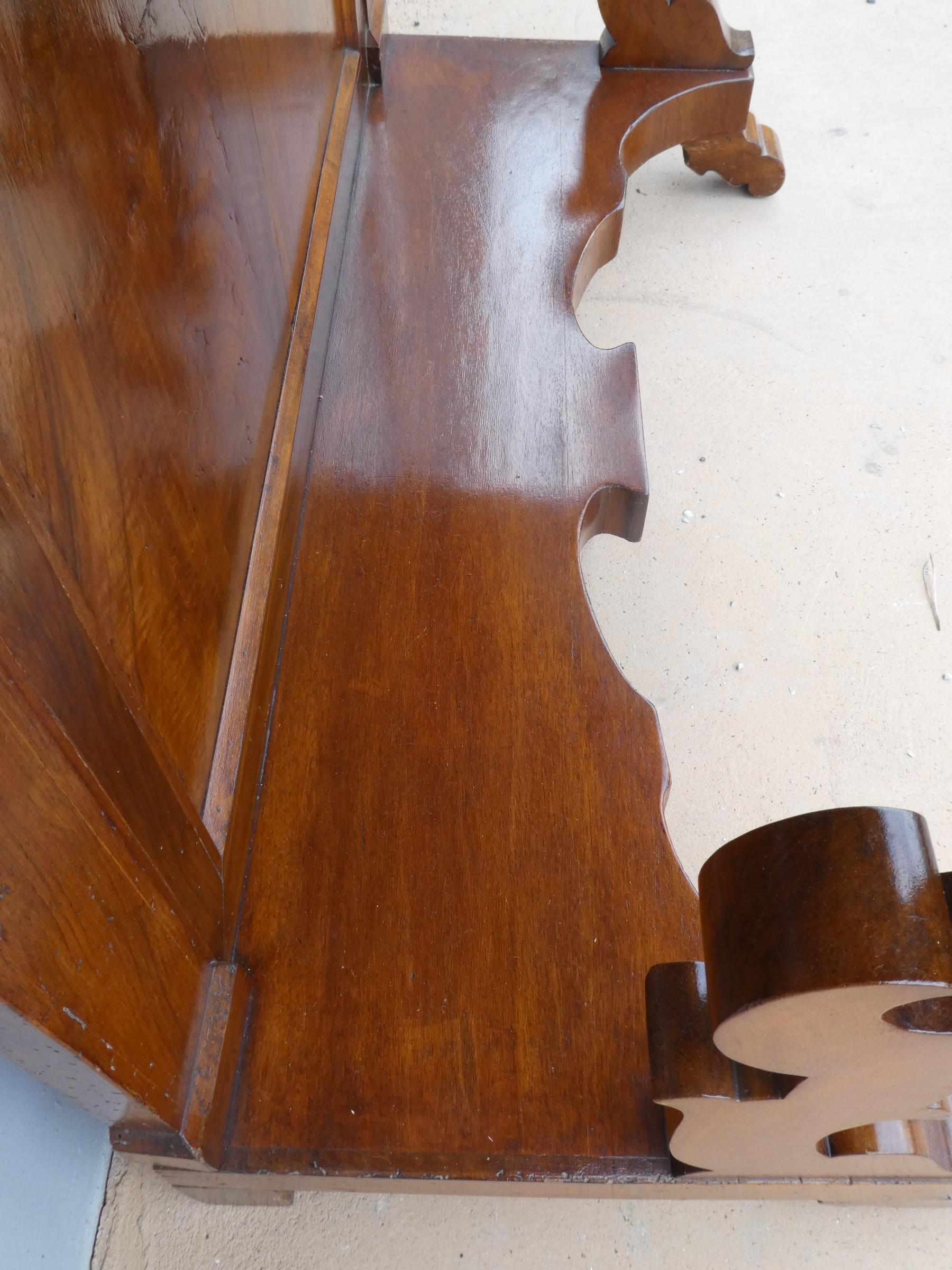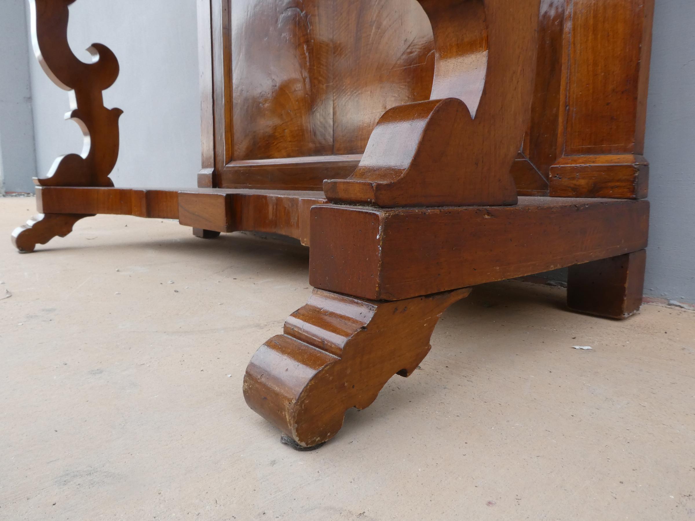 Console mobile d’appoggio ligure st.Carlo X, dotata di un piano d’appoggio in marmo ed appartenente d’epoca alla seconda metà dell’800. La struttura si presenta solida ed armoniosa, e vanta proporzioni sapientemente equilibrate. La ricerca di un decoro mirato si riflette anche sulla scelta d’impreziosire il corpo con delicati intarsi, che spiccano contrastanti sulla raffinata superficie in noce che fa da sfondo. Necessita di leggeri interventi di restauro.