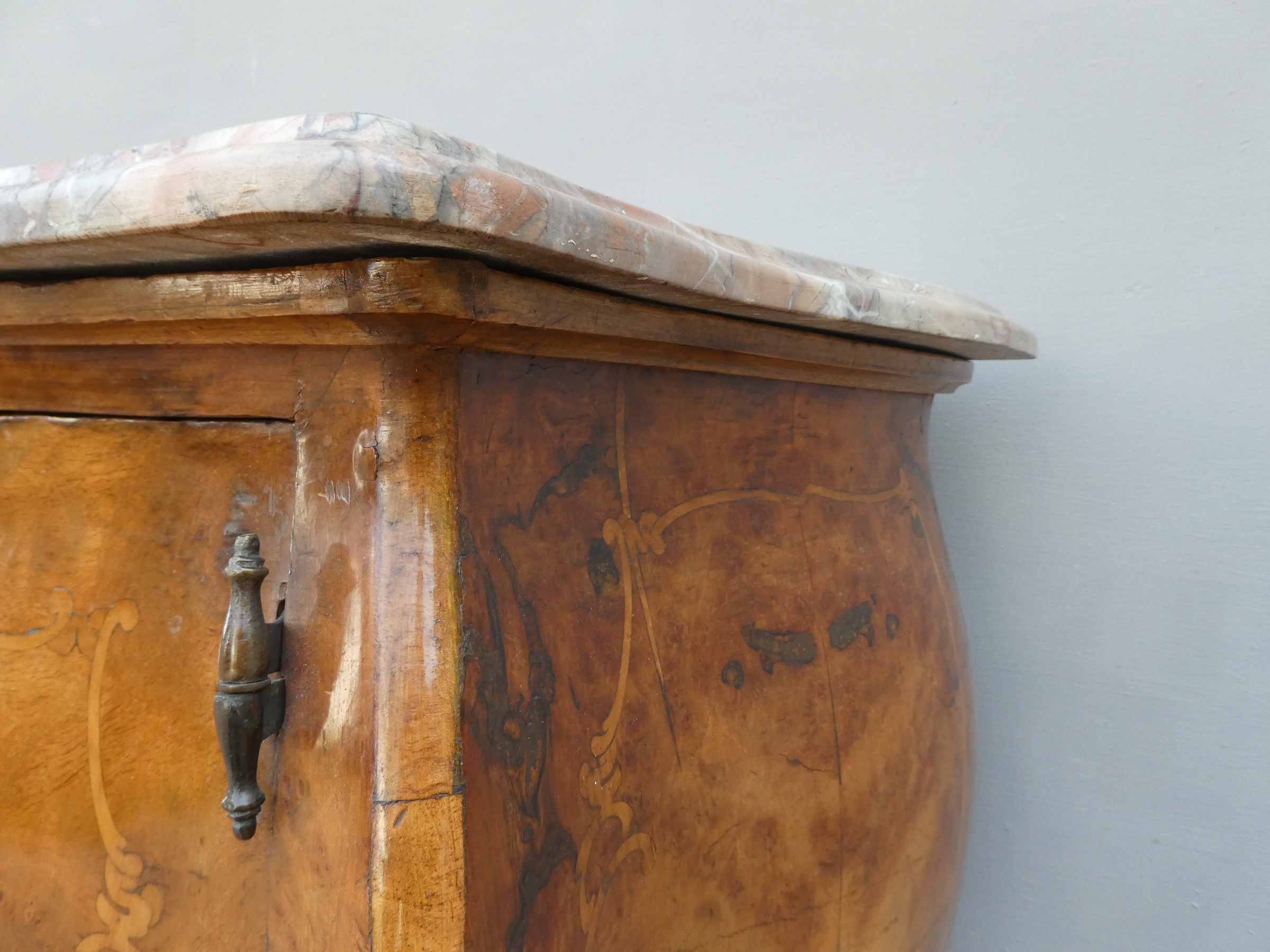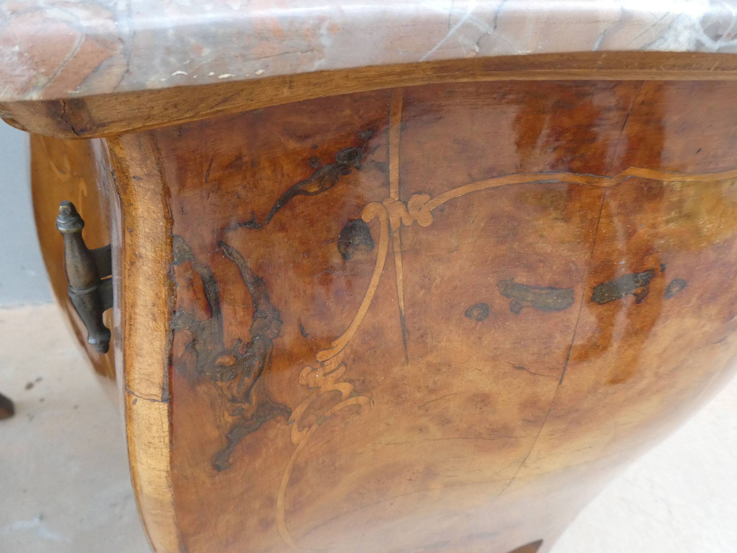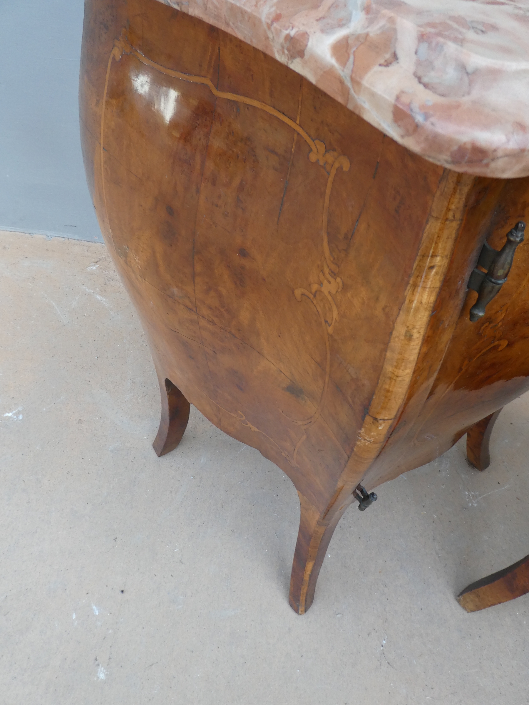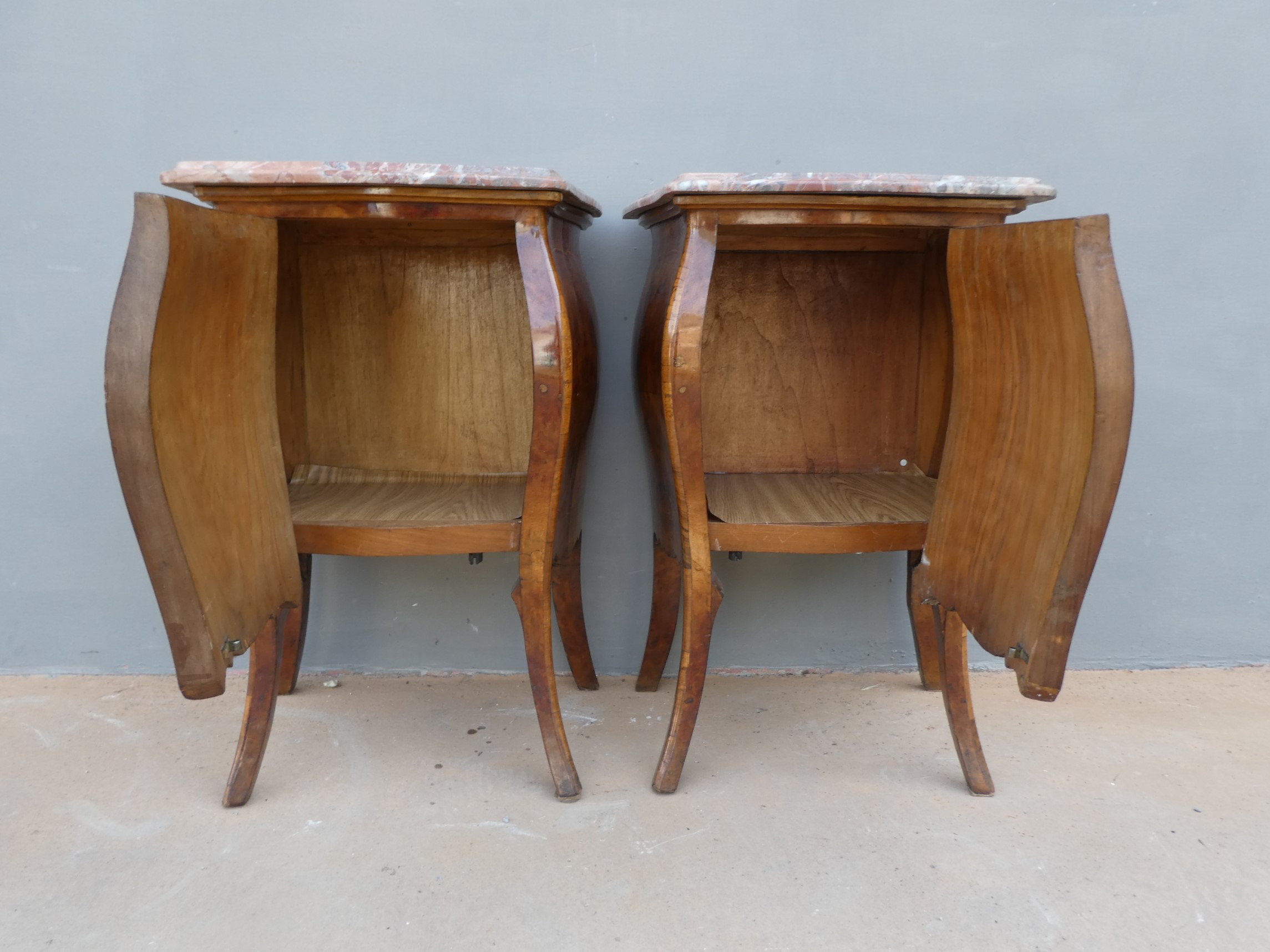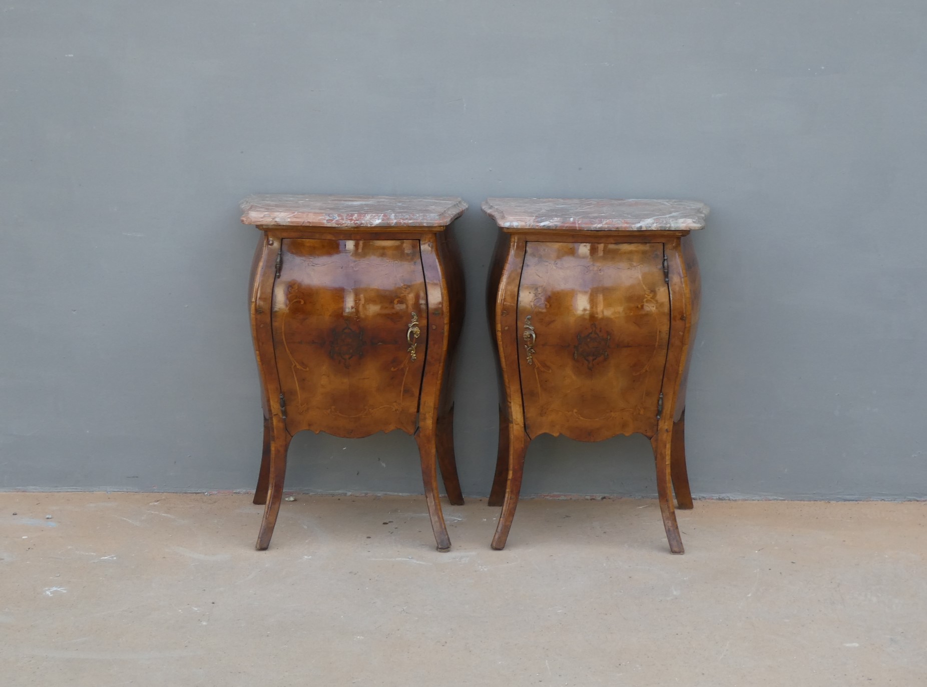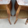 Coppia di comodini mobiletti ad un’anta stile Luigi XV, dotati di un piano d’appoggio in marmo ed appartenenti d’epoca alla metà ‘900. Semplici ed armoniosi nella linea, ottengono il loro effetto decorativo grazie ai minuziosi intarsi che spicuno dei due piani in marmo ècano contrastanti sulla superficie impiallacciata in noce che fa da fondo. Necessitano di leggeri interventi di restauro; i piani in marmo sono stati incollati/stuccati nel tempo (foto).