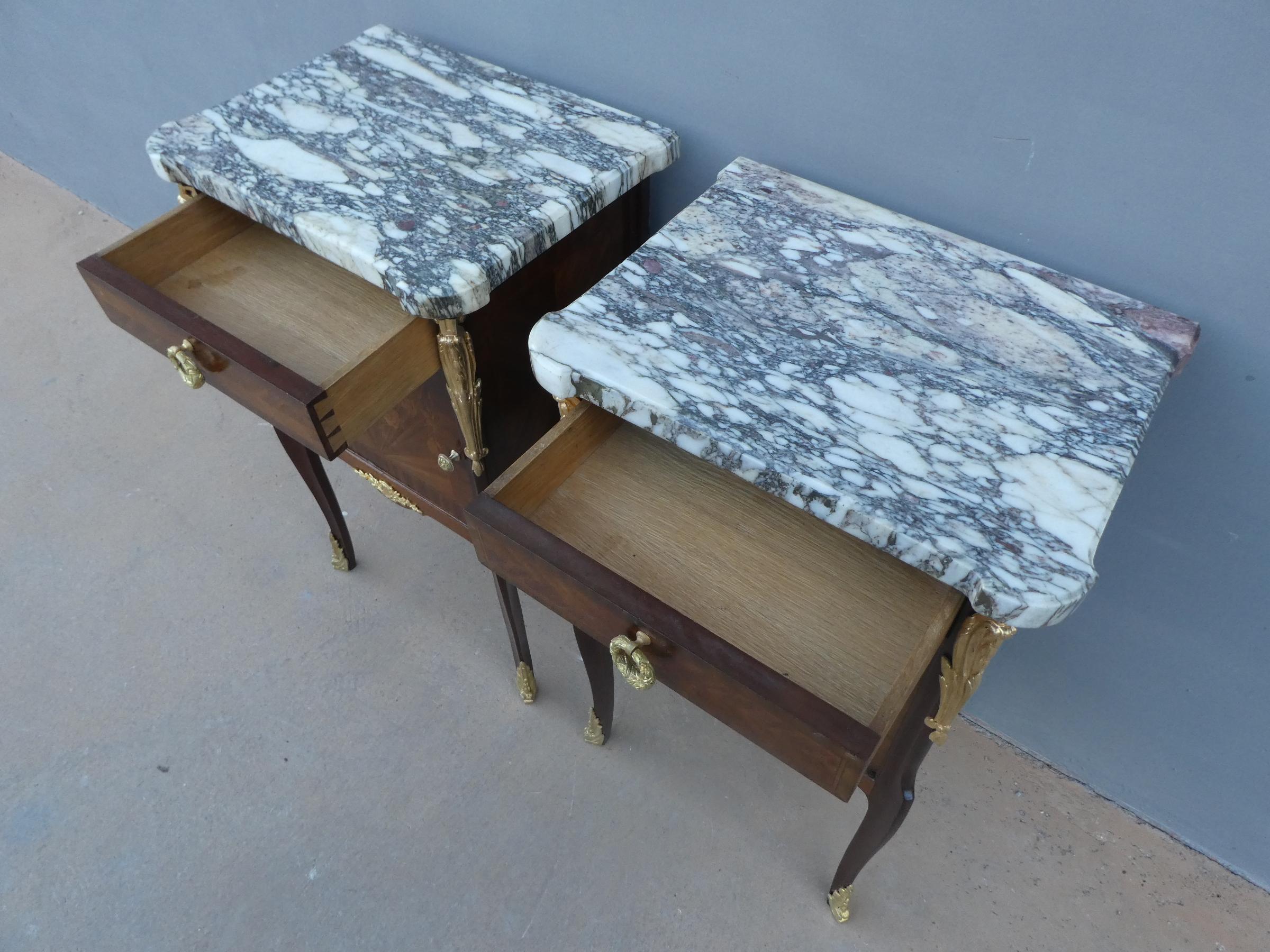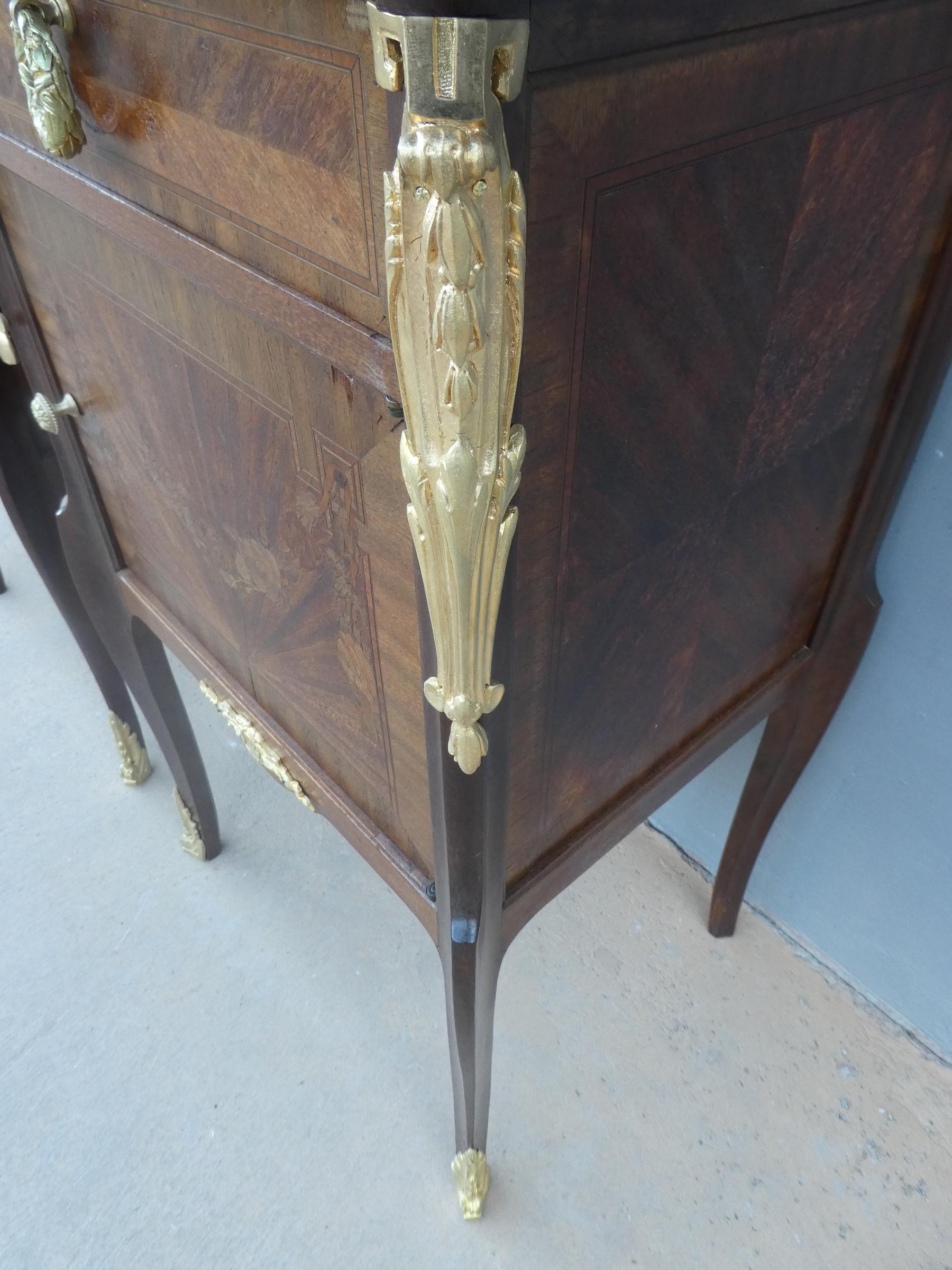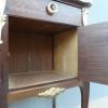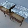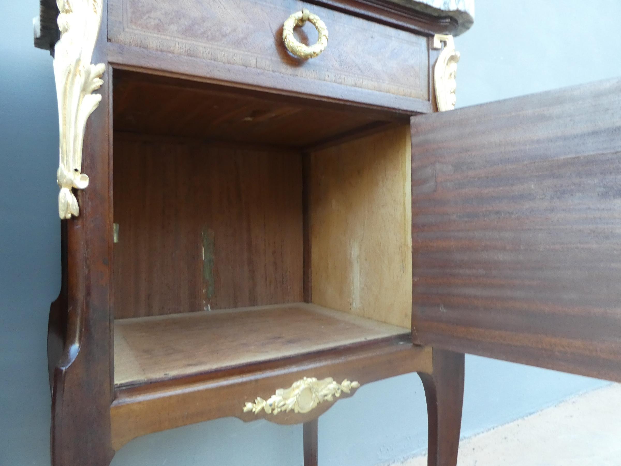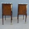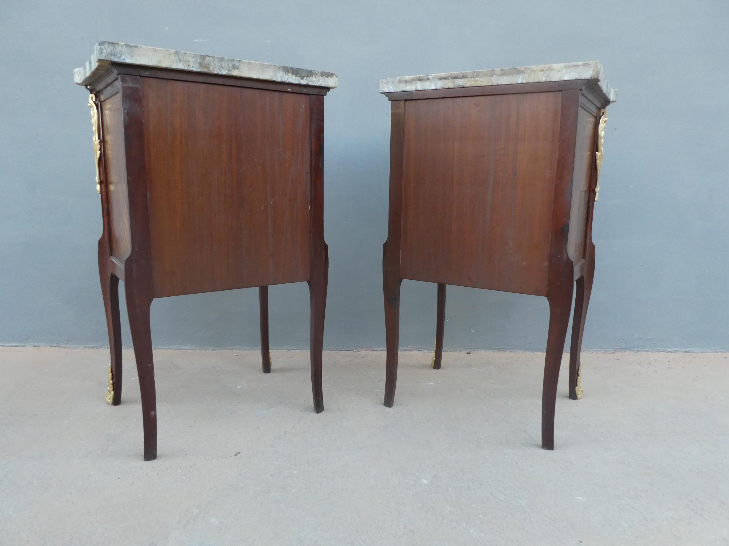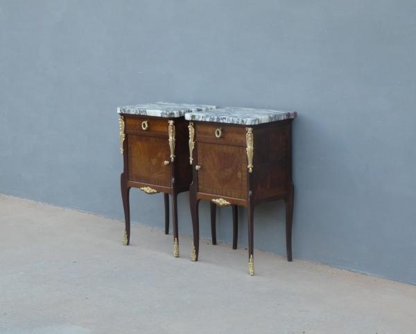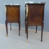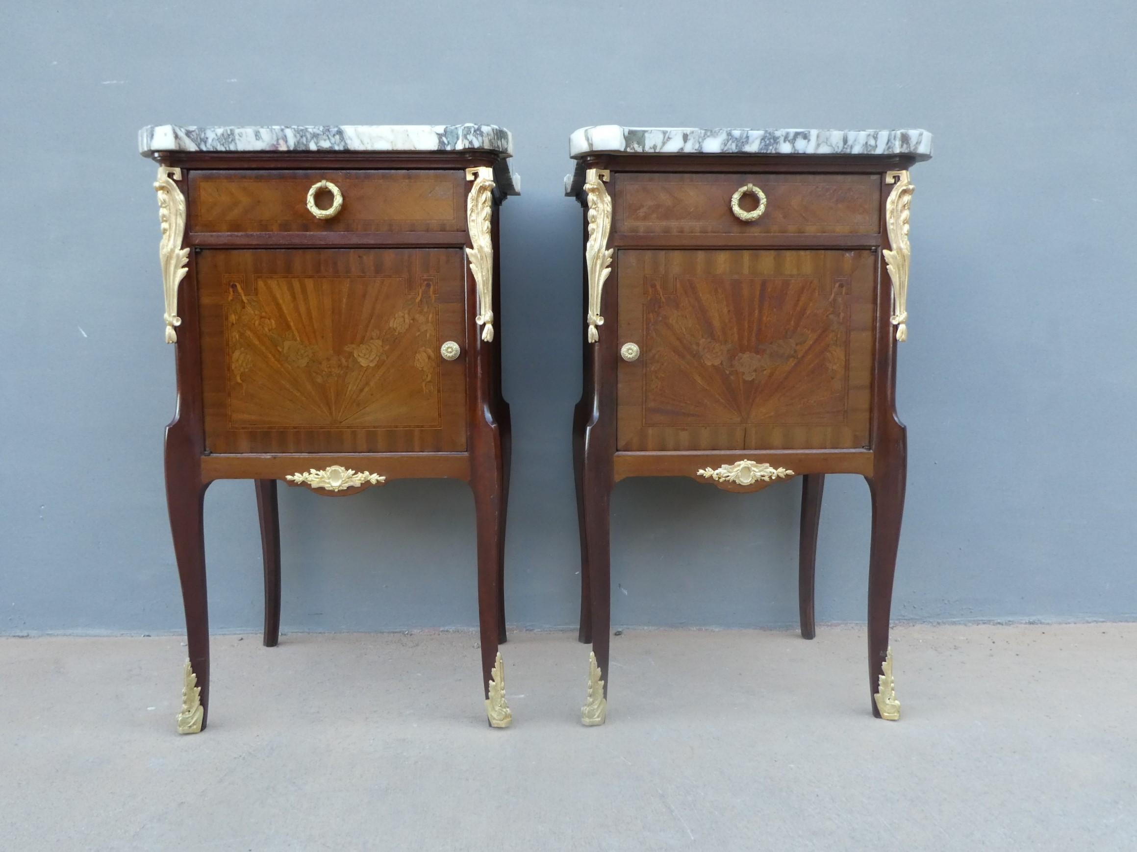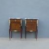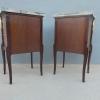 Coppia di comodini mobiletti in stile Luigi XV dotati di un’antina e un cassetto frontale, appartenenti d’epoca alla prima metà del ‘900. Eleganti ed armoniosi nella linea, ottengono il loro effetto decorativo grazie all’uso dai delicati intarsi/filetti, che spiccano contrastanti sull’elegante superficie in mogano che fa da sfondo, e delle lucenti applicazioni dorate che, oltre ad avere un scopo decorativo, hanno il compito di proteggere le parti più vulnerabili del mobile. Necessitano di qualche intervento di restauro (foto).