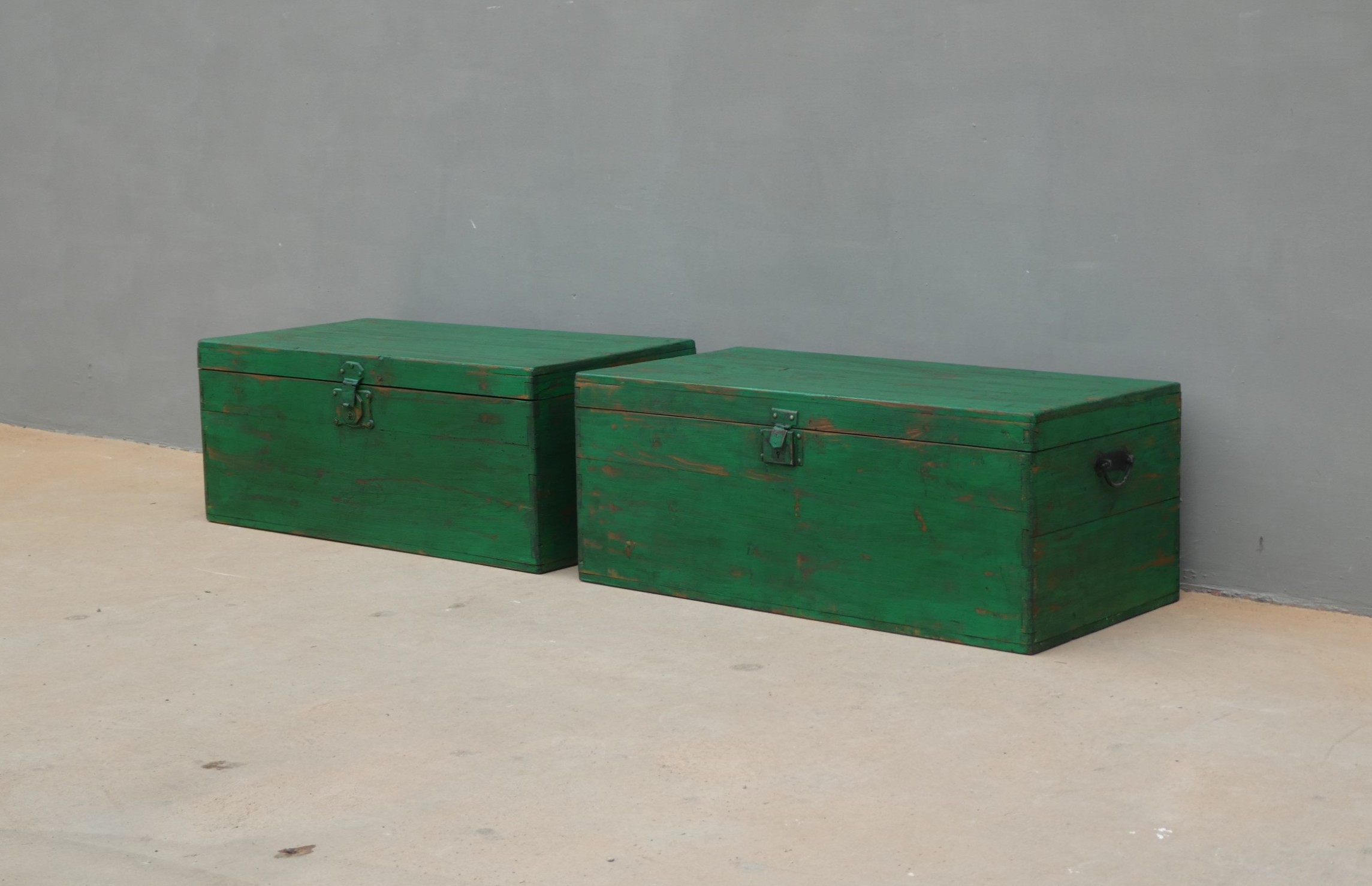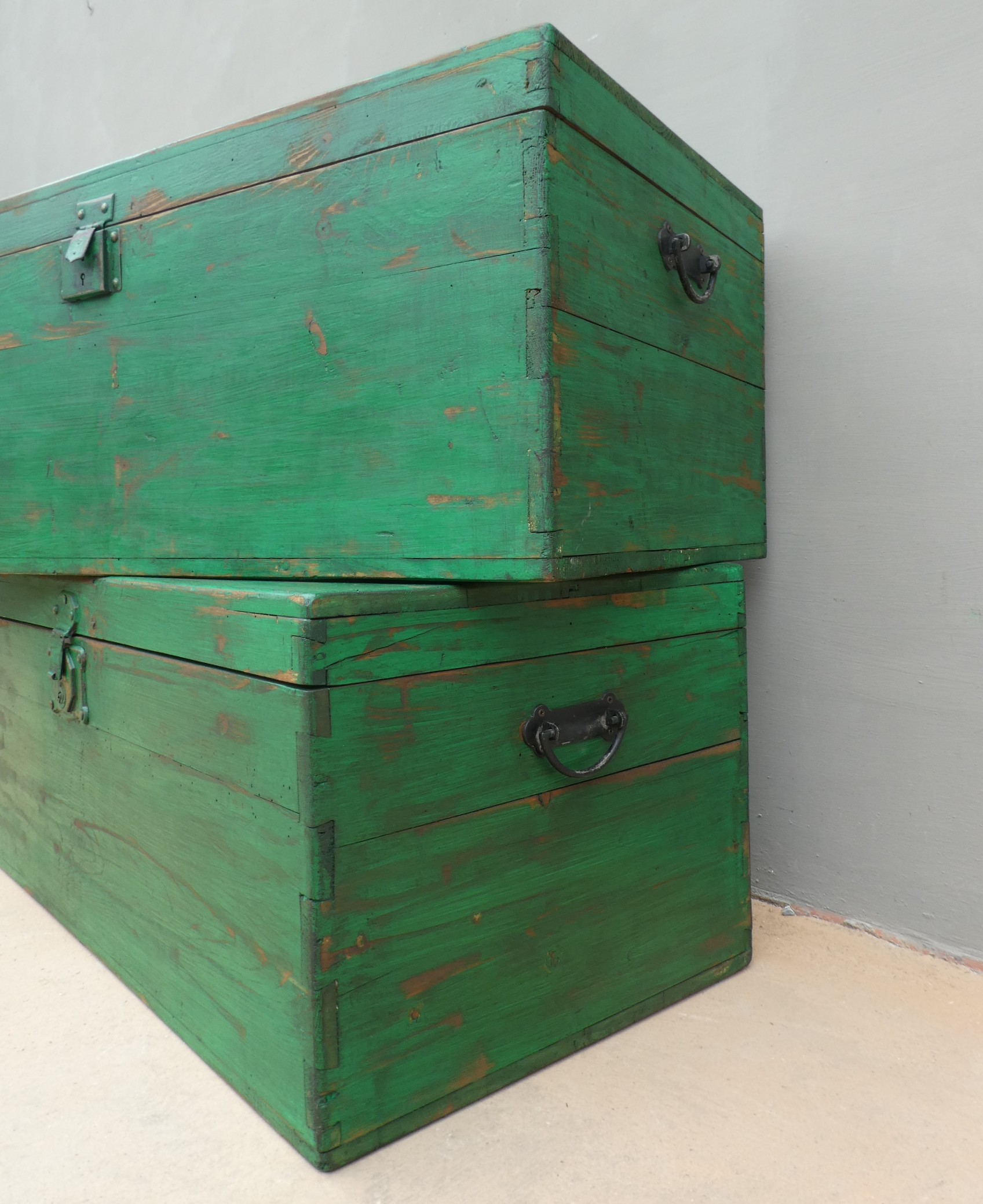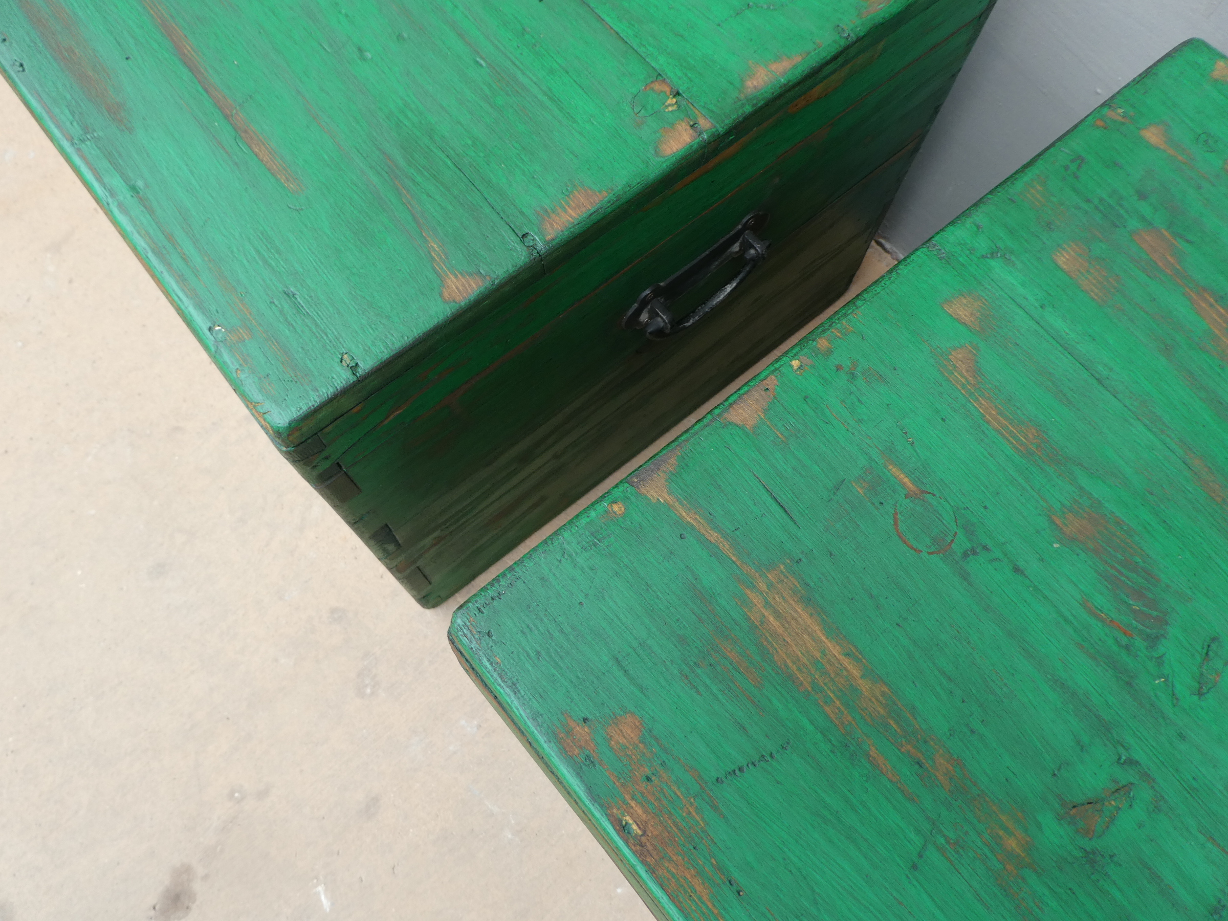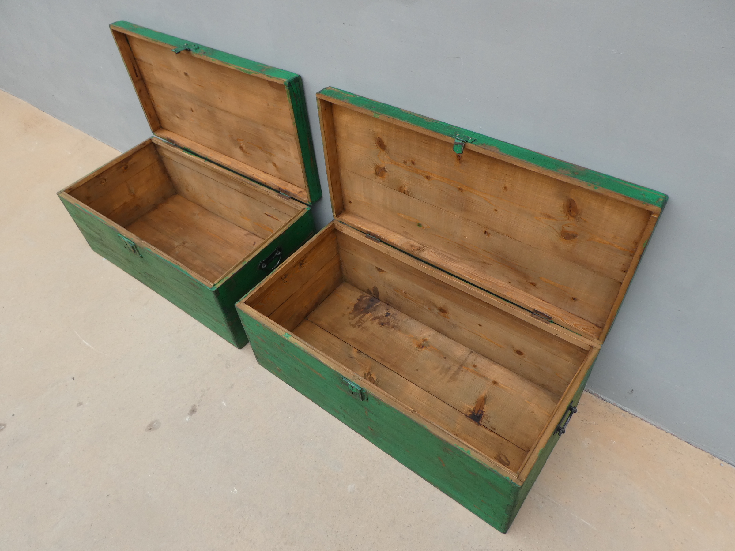 Coppia di bauli cassapanche contenitori da arredo corredate da un piano apribile, laccate e rifinite con la tecnica “Shabby Chic”. Si presentano come un funzionale e versatile elemento d’arredo, capaci di dare un tocco d’originalità all’ambiente. Necessitano di piccoli interventi di restauro (facoltativi – foto), presentano alcuni fori di tarlo. Epoca prima metà ‘900.
