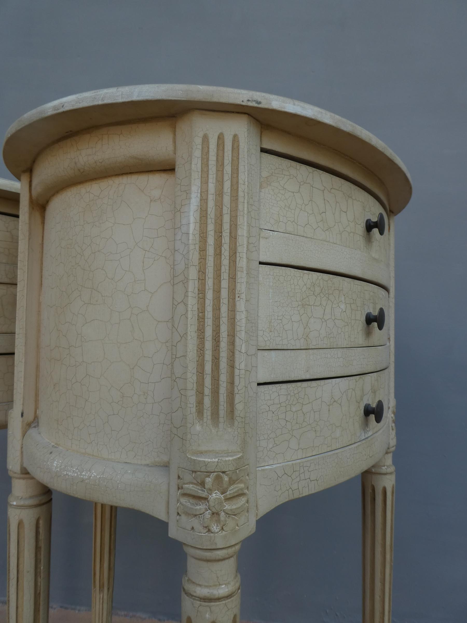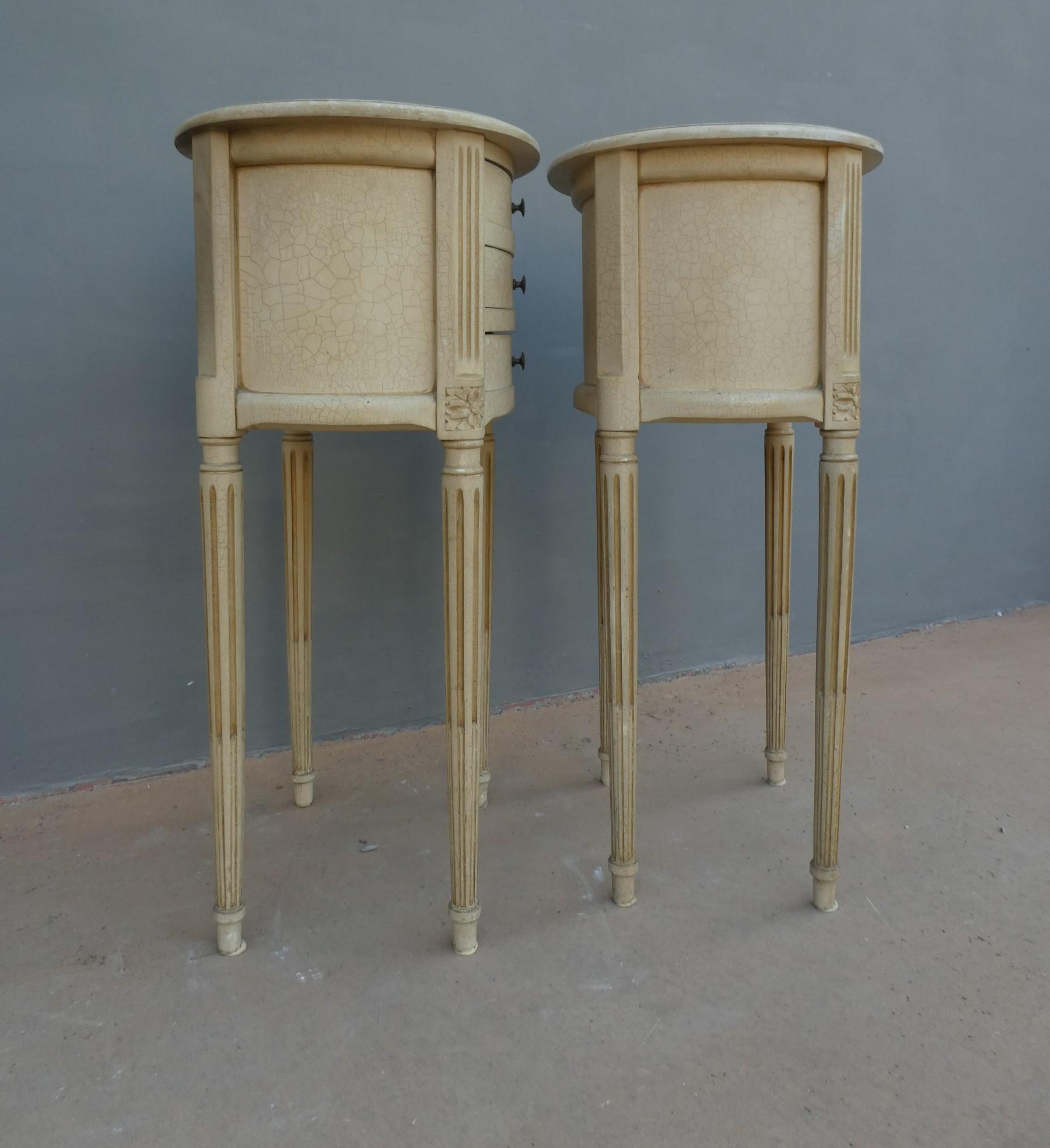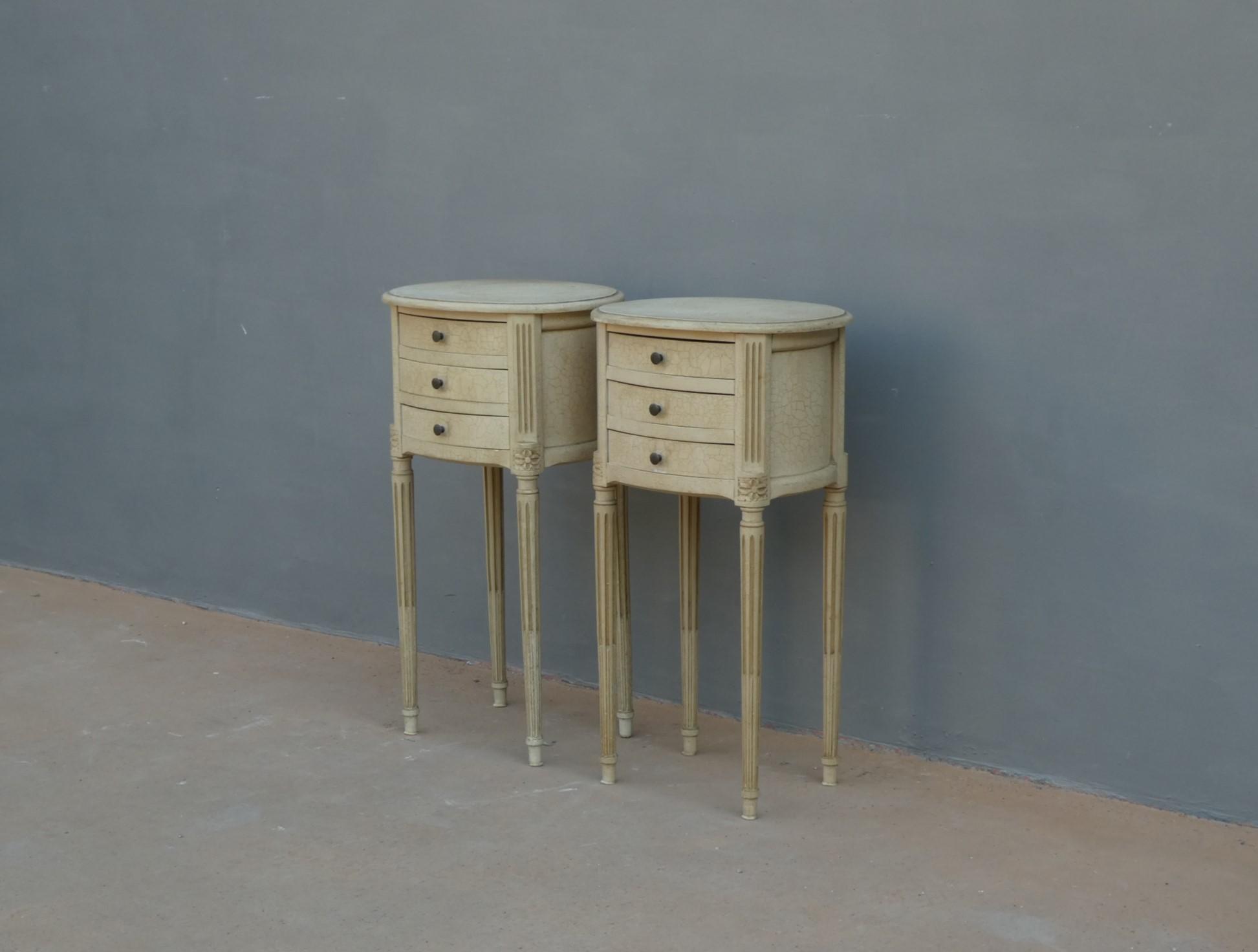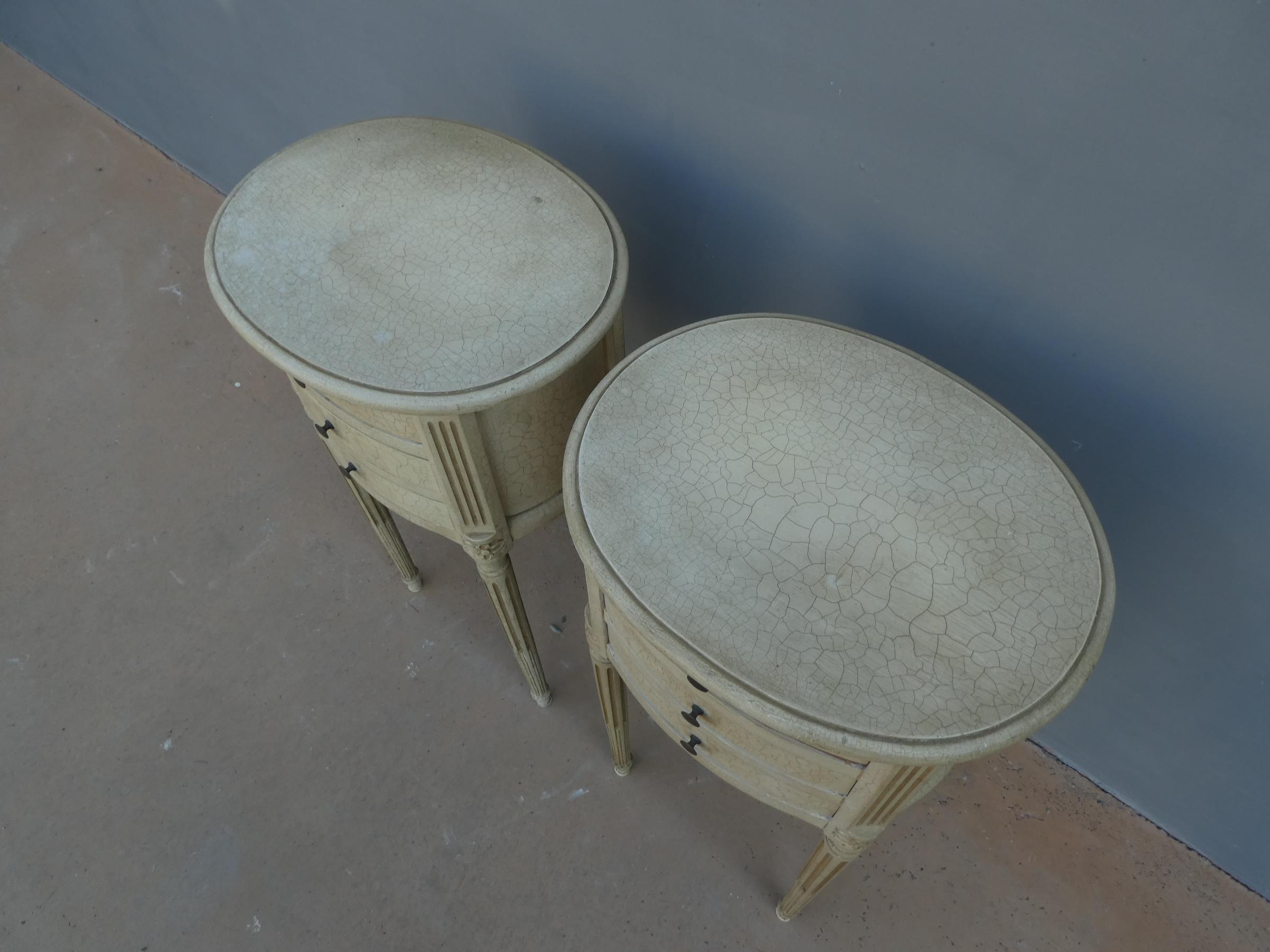 Coppia di tavolini mobiletti comodini ovali laccati in stile Luigi XVI, corredati da tre cassetti frontali ed appartenenti d’epoca alla metà del ‘900. Semplici nella linea, sono contraddistinti da lunghi montanti sgusciati e da delicati intagli floreali sugli angoli della fascia, caratteristici dello stile. Necessita di qualche interventi di restauro; sono presenti macchie/aloni (foto).
