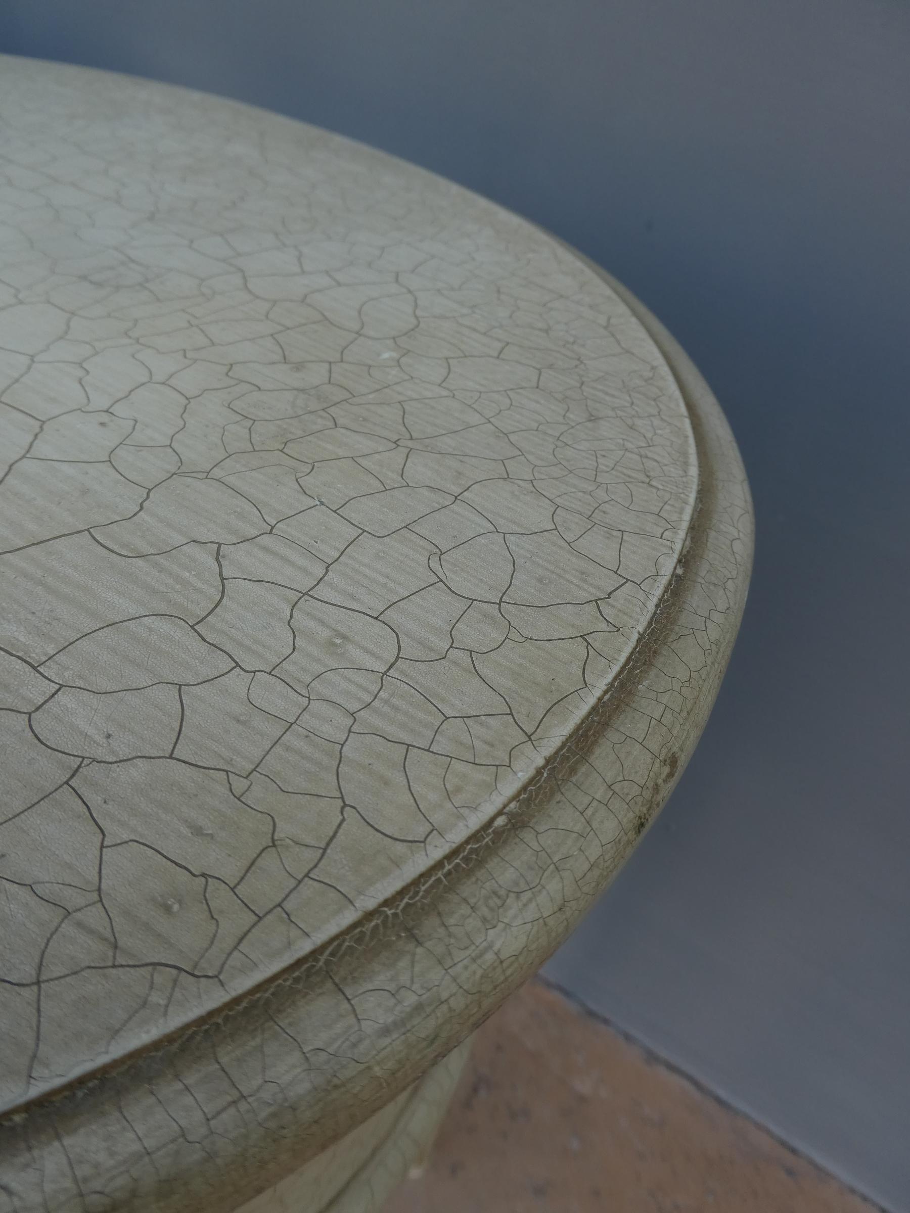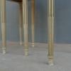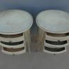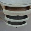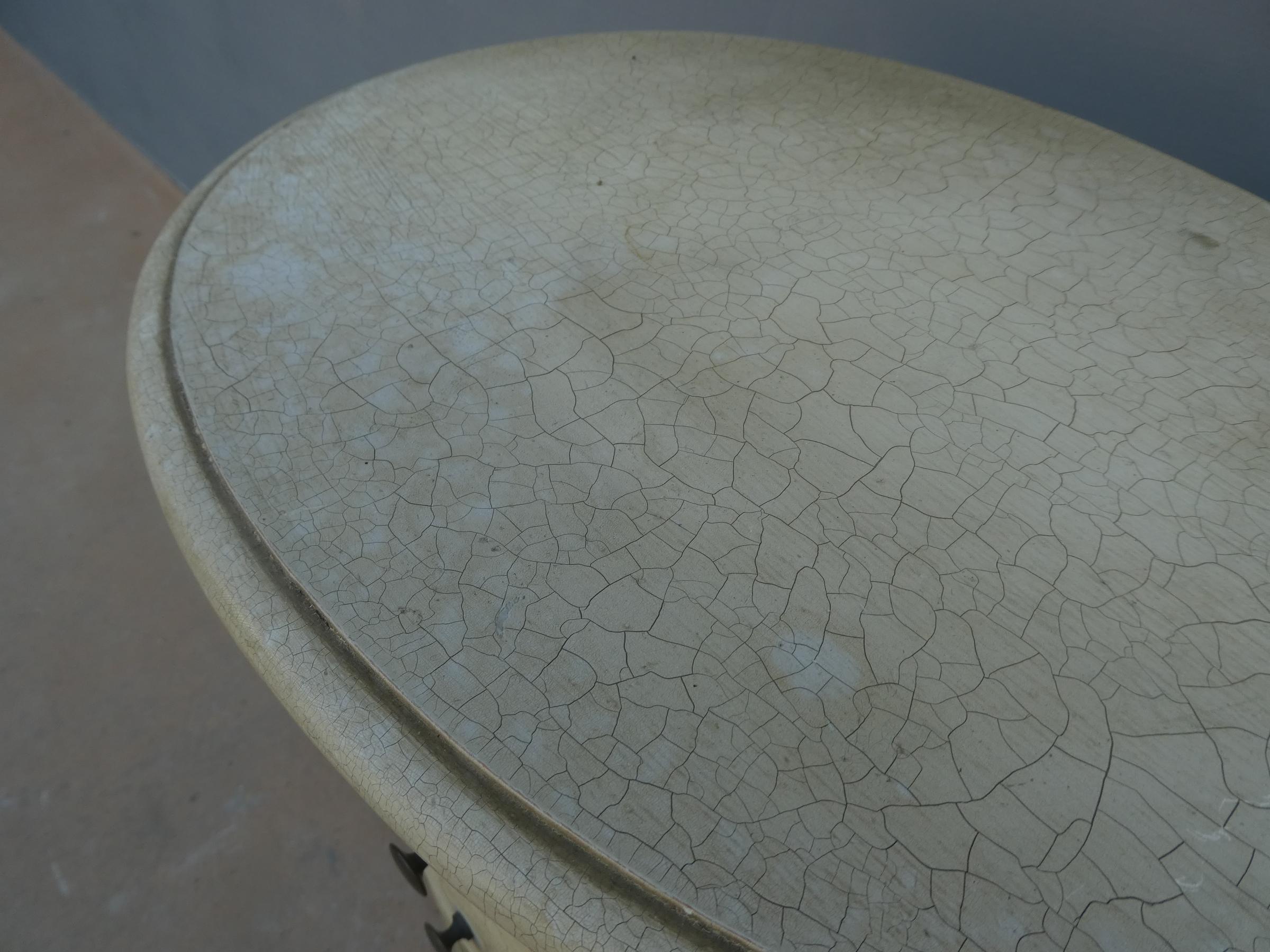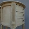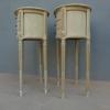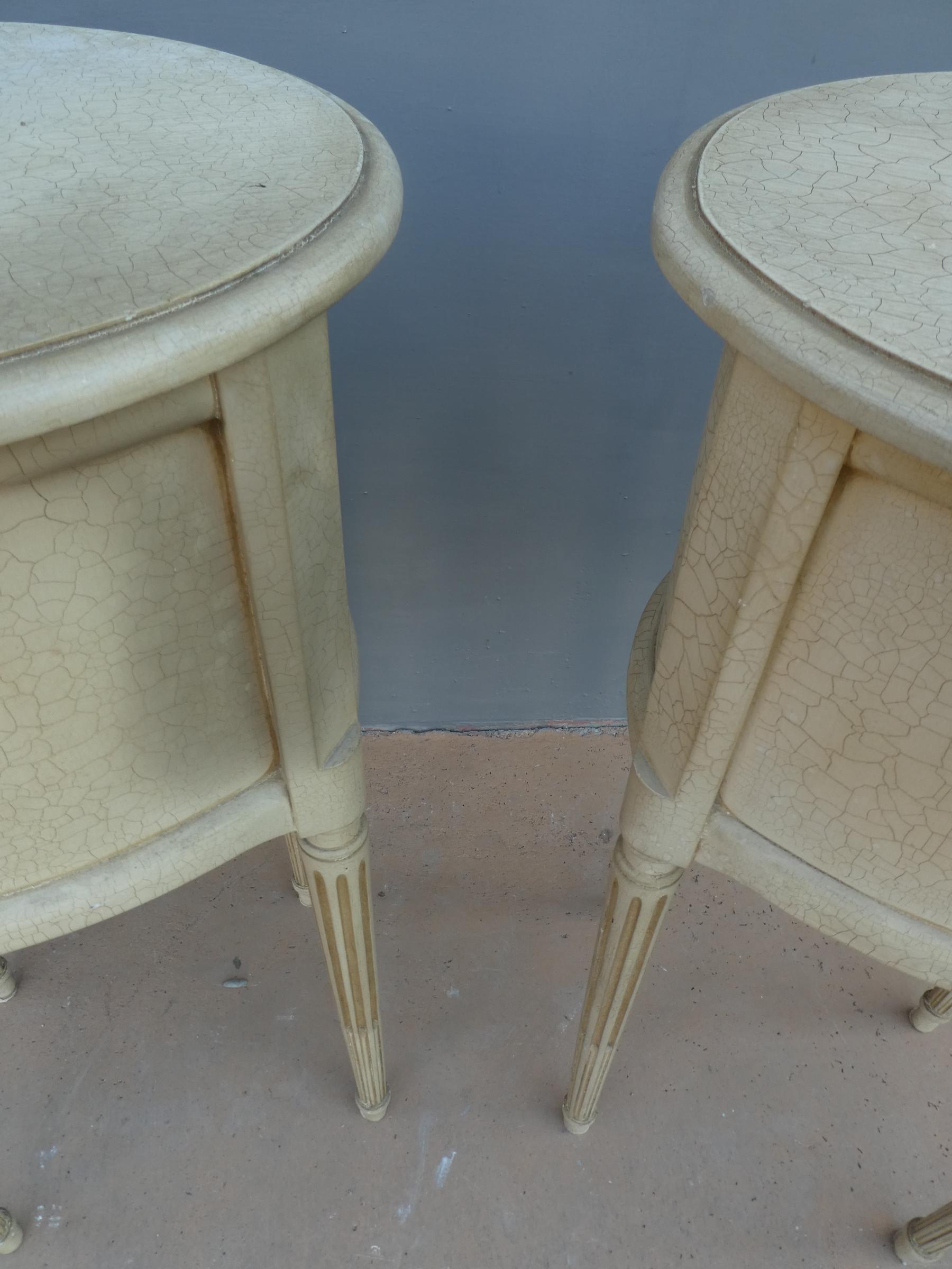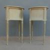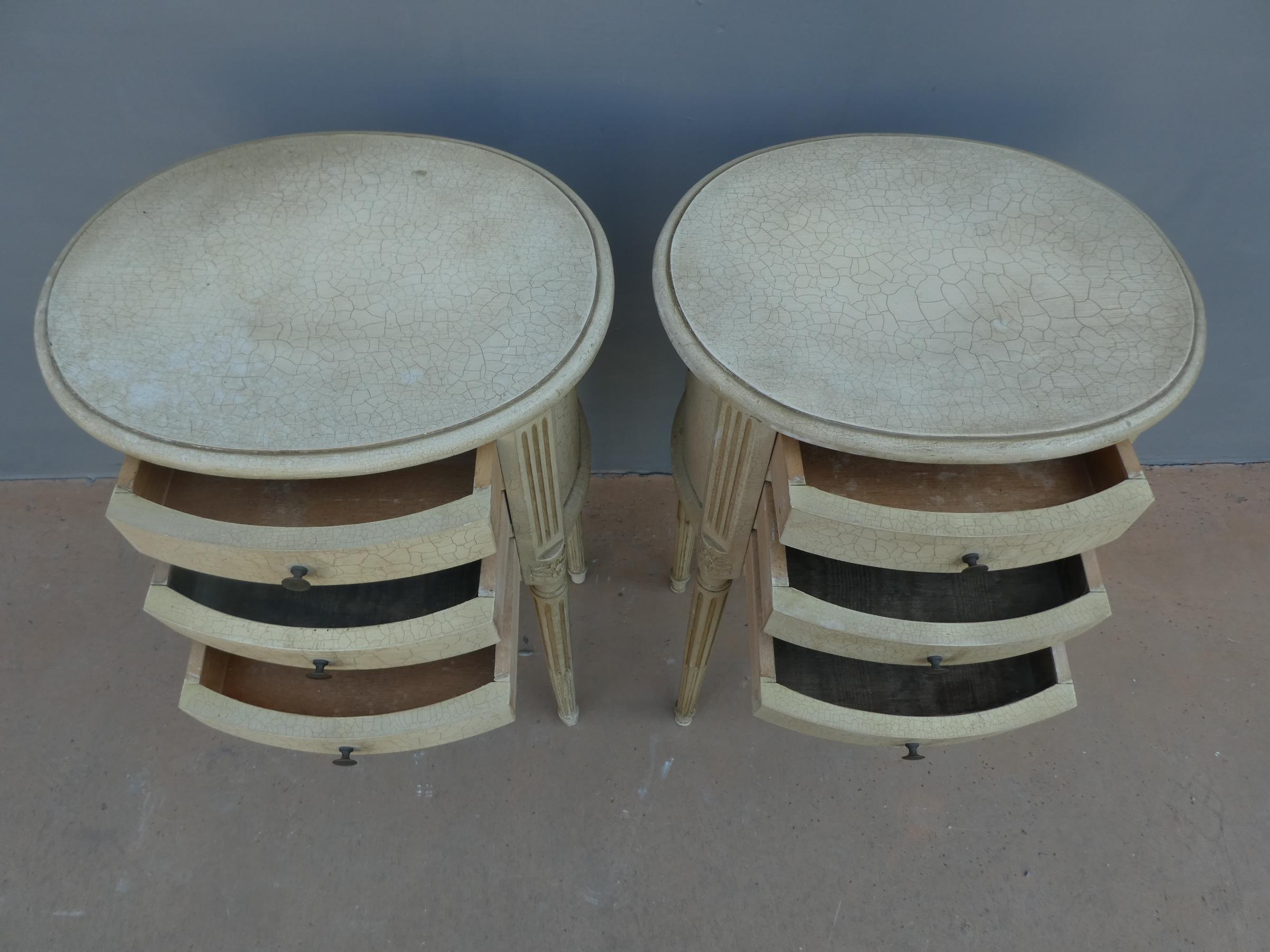 Coppia di tavolini mobiletti comodini ovali laccati in stile Luigi XVI, corredati da tre cassetti frontali ed appartenenti d’epoca alla metà del ‘900. Semplici nella linea, sono contraddistinti da lunghi montanti sgusciati e da delicati intagli floreali sugli angoli della fascia, caratteristici dello stile. Necessita di qualche interventi di restauro; sono presenti macchie/aloni (foto).