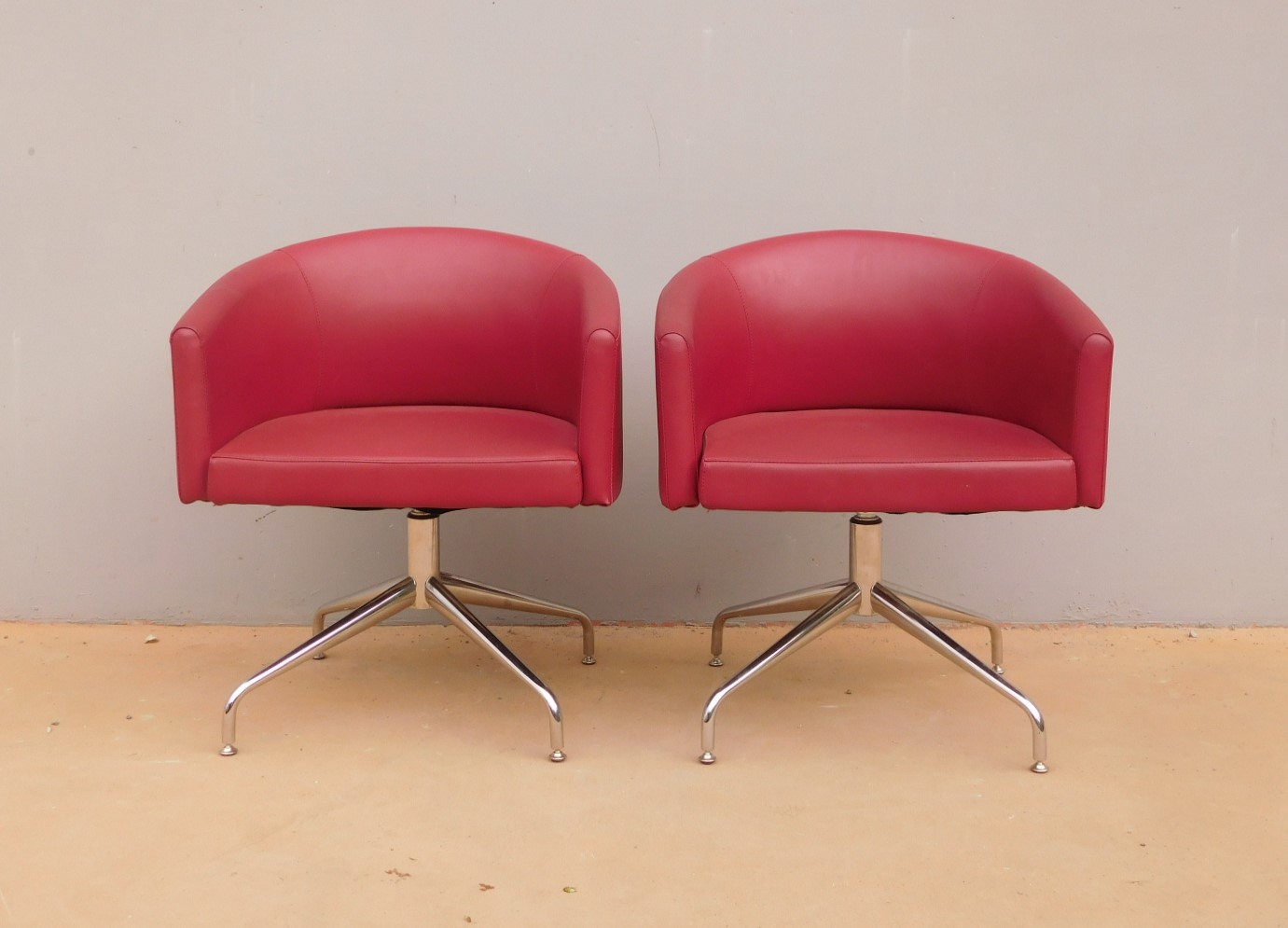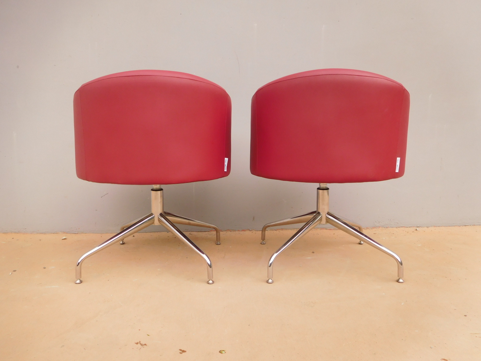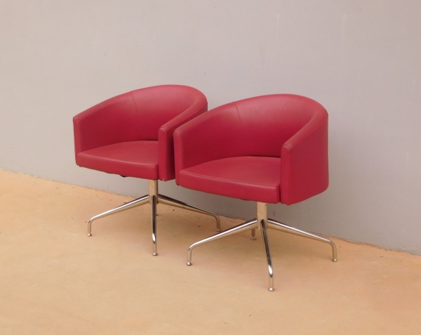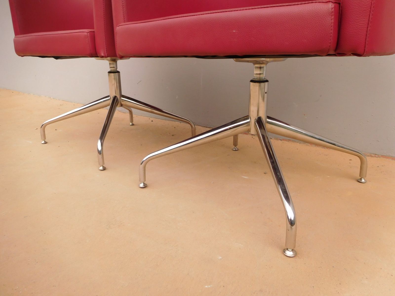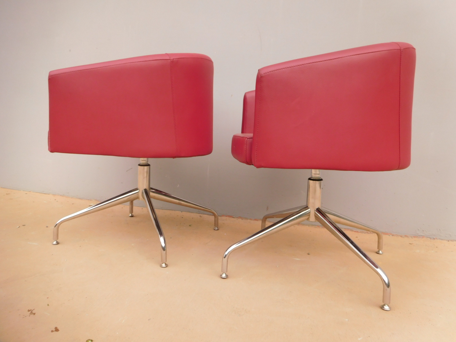 Coppia di poltrone girevoli rivestite in morbida ecopelle. La struttura è costituita da un basso ed imbottito schienale ed una confortevole seduta. E’ sostenuta da una base in acciaio, ramificata su quattro montanti d’appoggio. Presenta piccoli segni d’usura. Il cavalletto delle gambe è smontabile. Appartenente d’epoca alla seconda metà del ‘900.