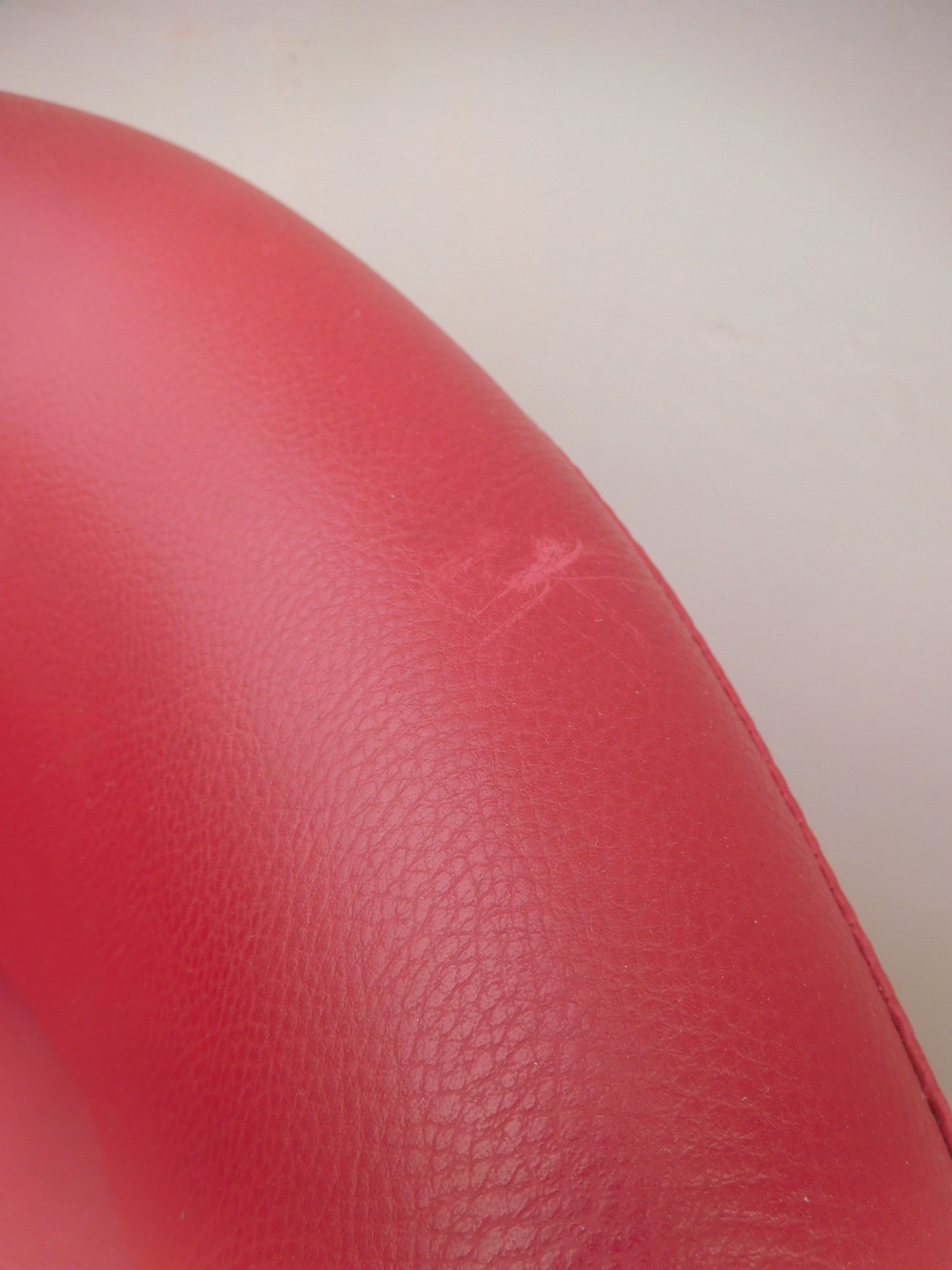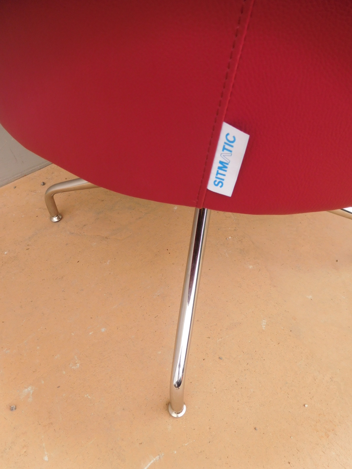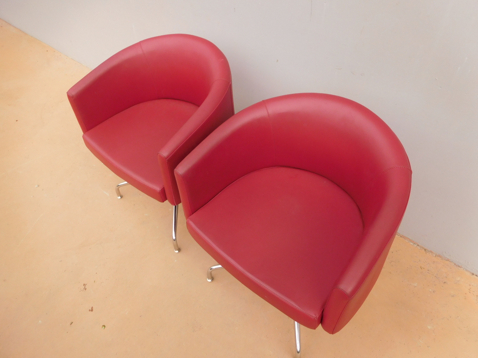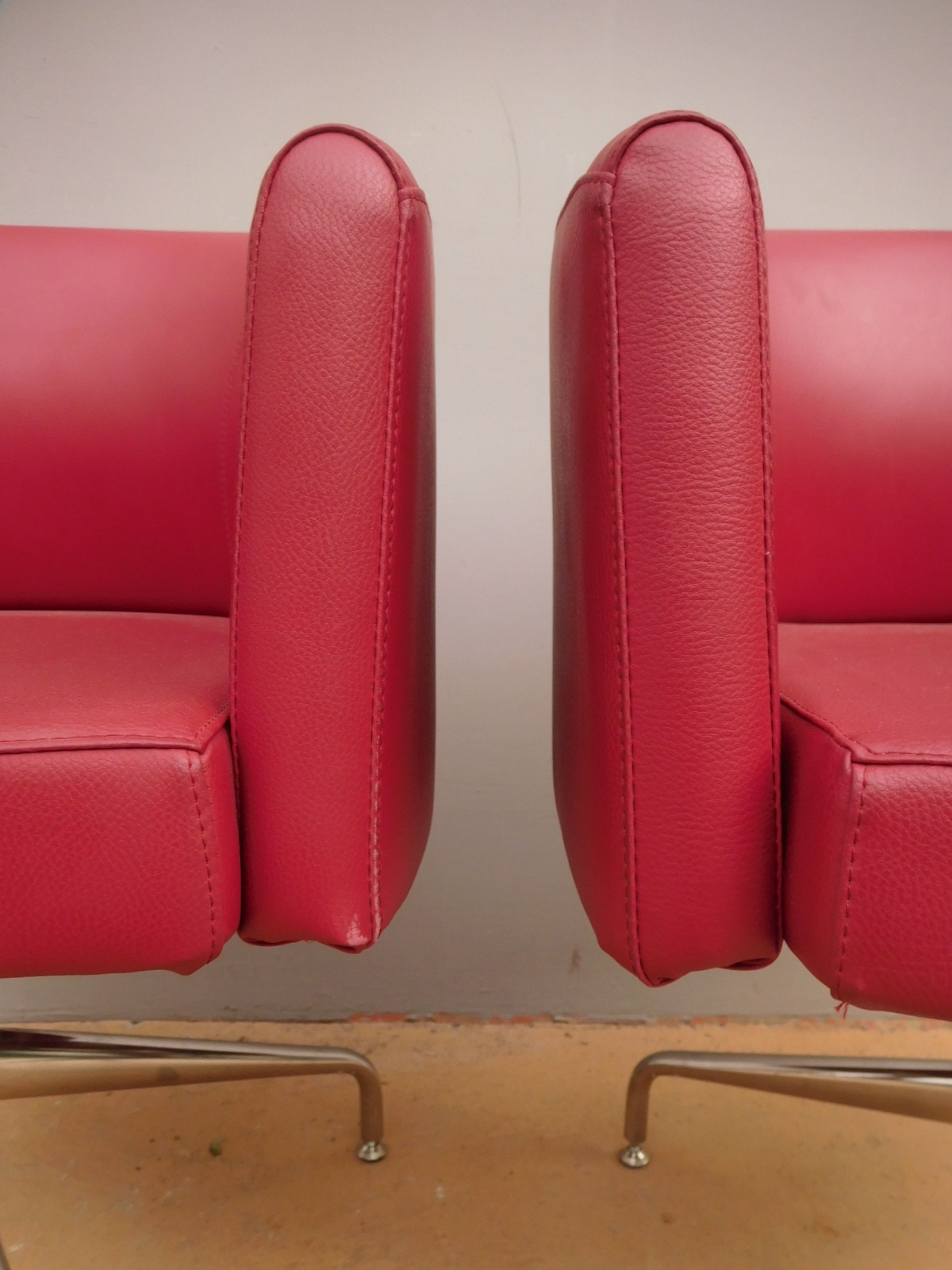Coppia di poltrone girevoli rivestite in morbida ecopelle. La struttura è costituita da un basso ed imbottito schienale ed una confortevole seduta. E’ sostenuta da una base in acciaio, ramificata su quattro montanti d’appoggio. Presenta piccoli segni d’usura. Il cavalletto delle gambe è smontabile. Appartenente d’epoca alla seconda metà del ‘900.