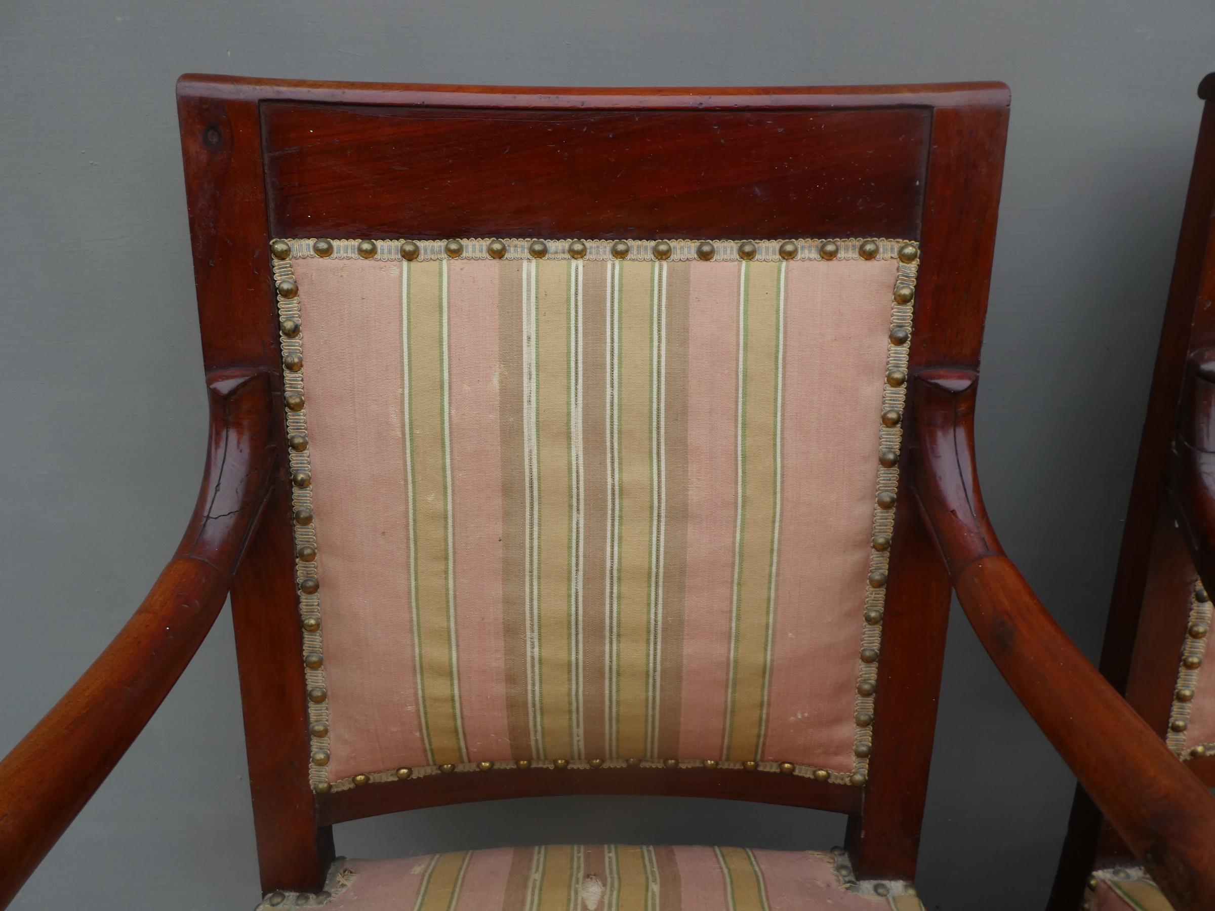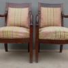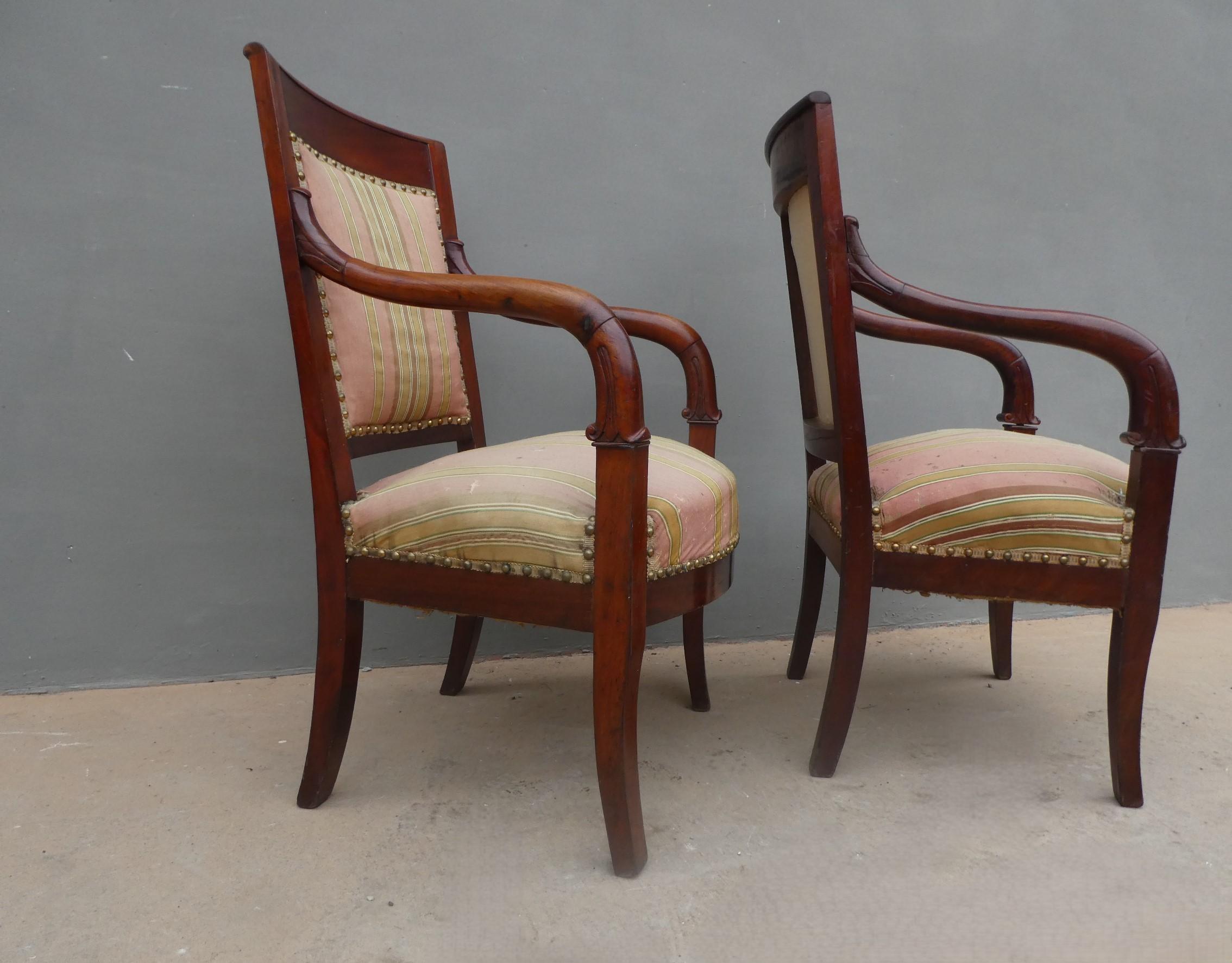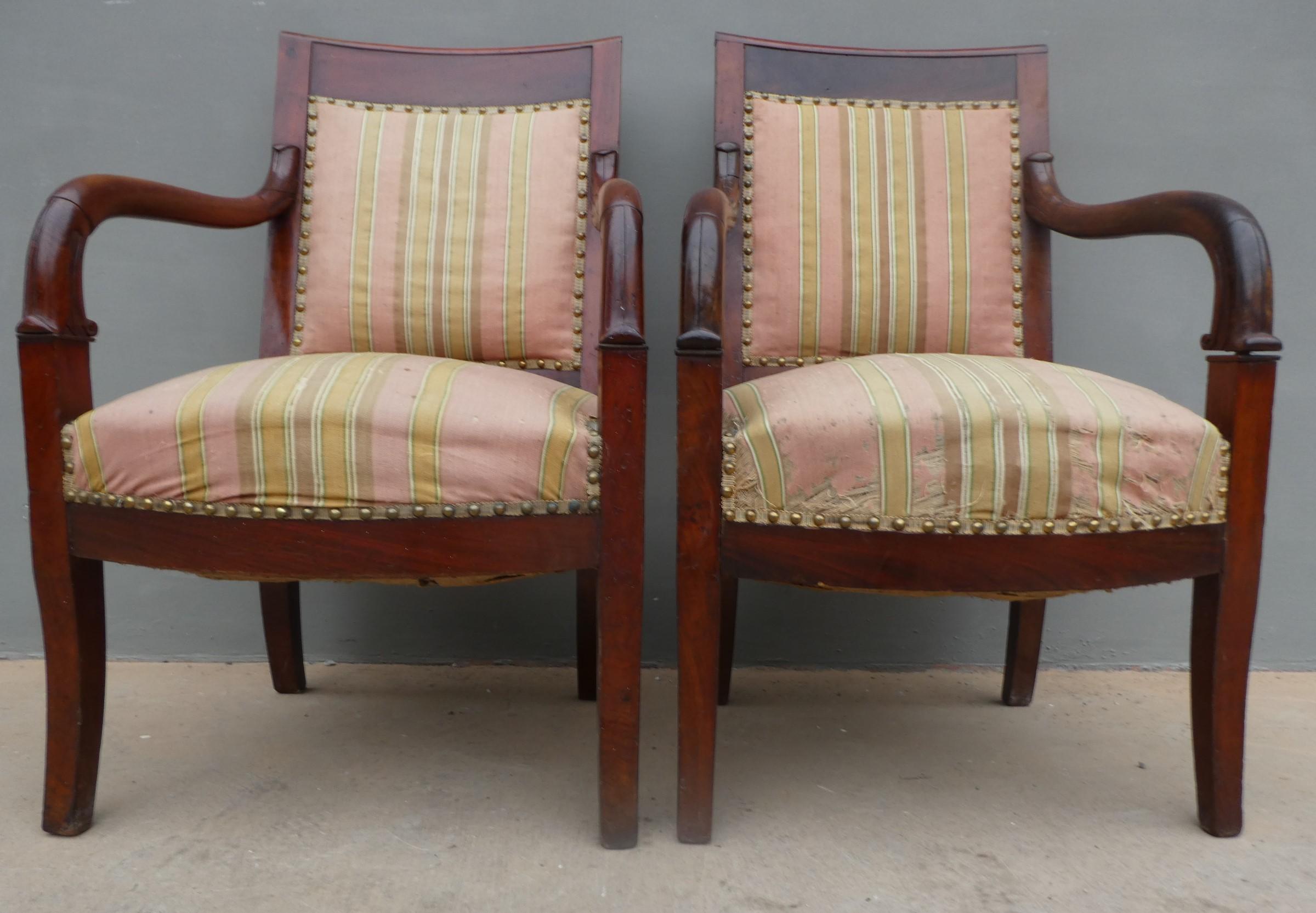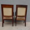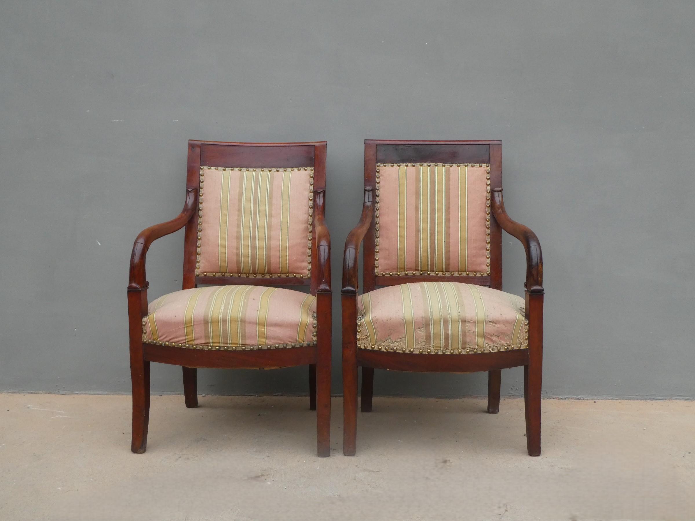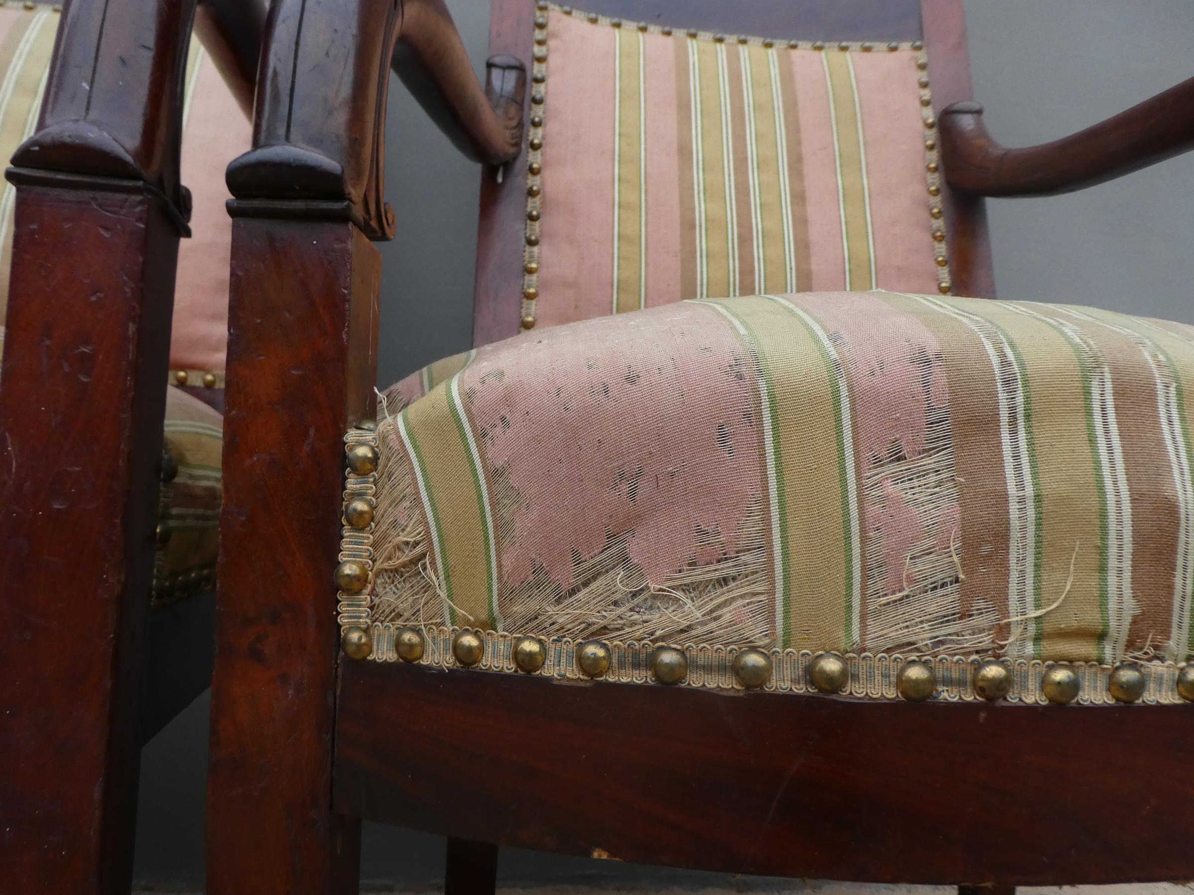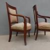 Coppia di poltrone realizzate in legno di mogano, appartenenti d’epoca alla seconda metà dell’800. Lo stile Impero predilige schienali dritti ed essenziali, sedute appena arrotondate nella parte frontale e gambe anteriori a sciabola che formano, con i supporti dei braccioli, un solo elemento. Necessitano di alcuni interventi di restauro – il tessuto va sostituito.