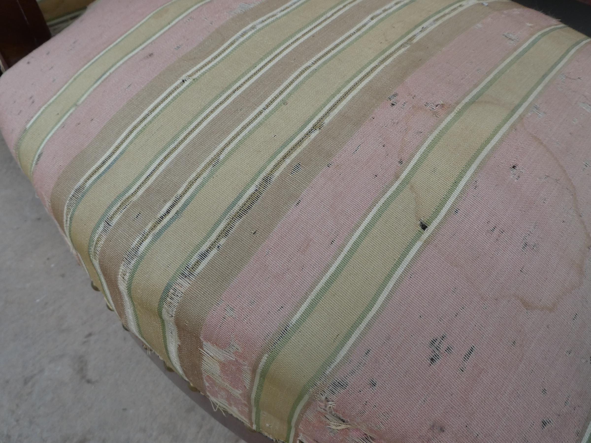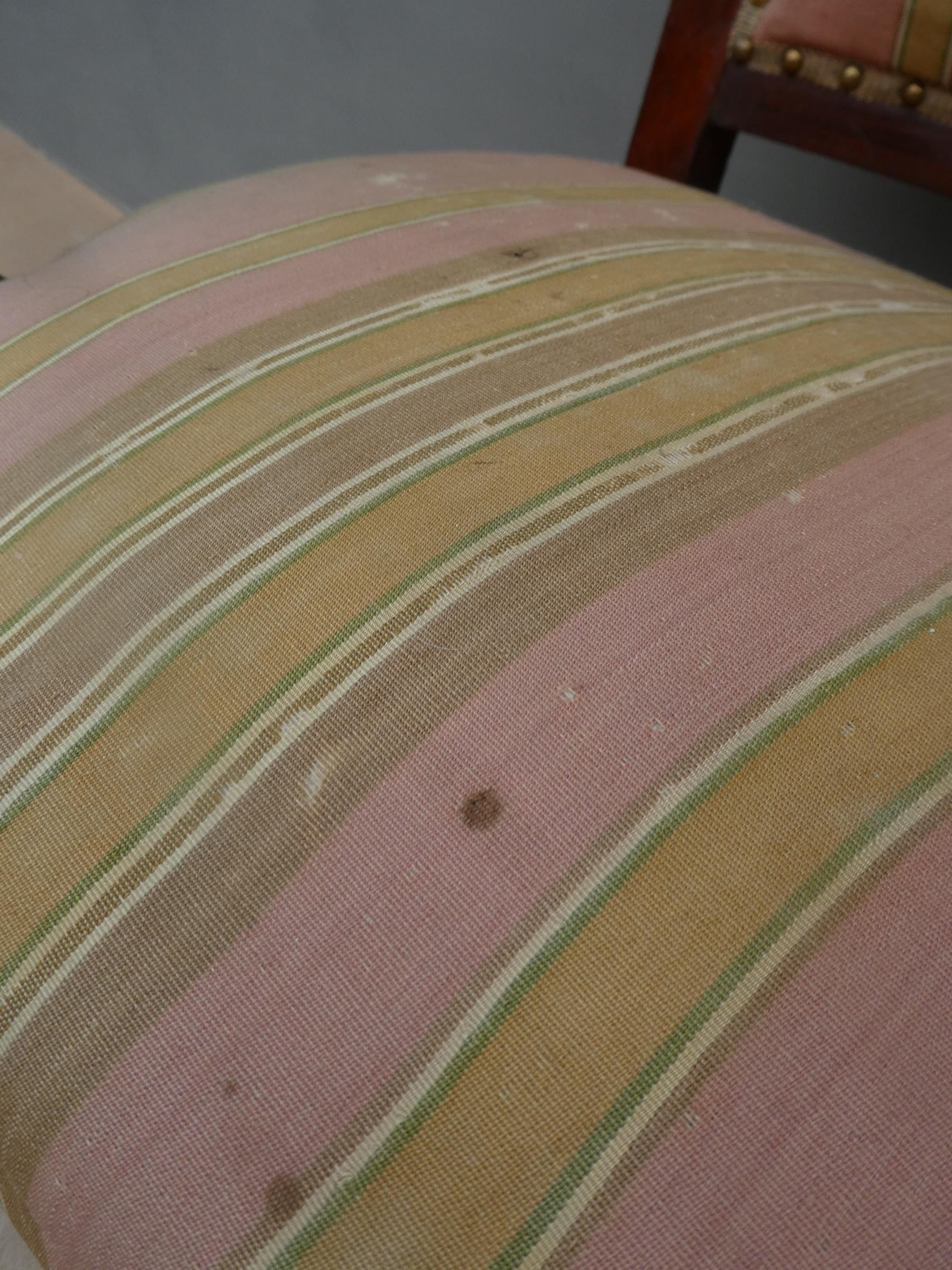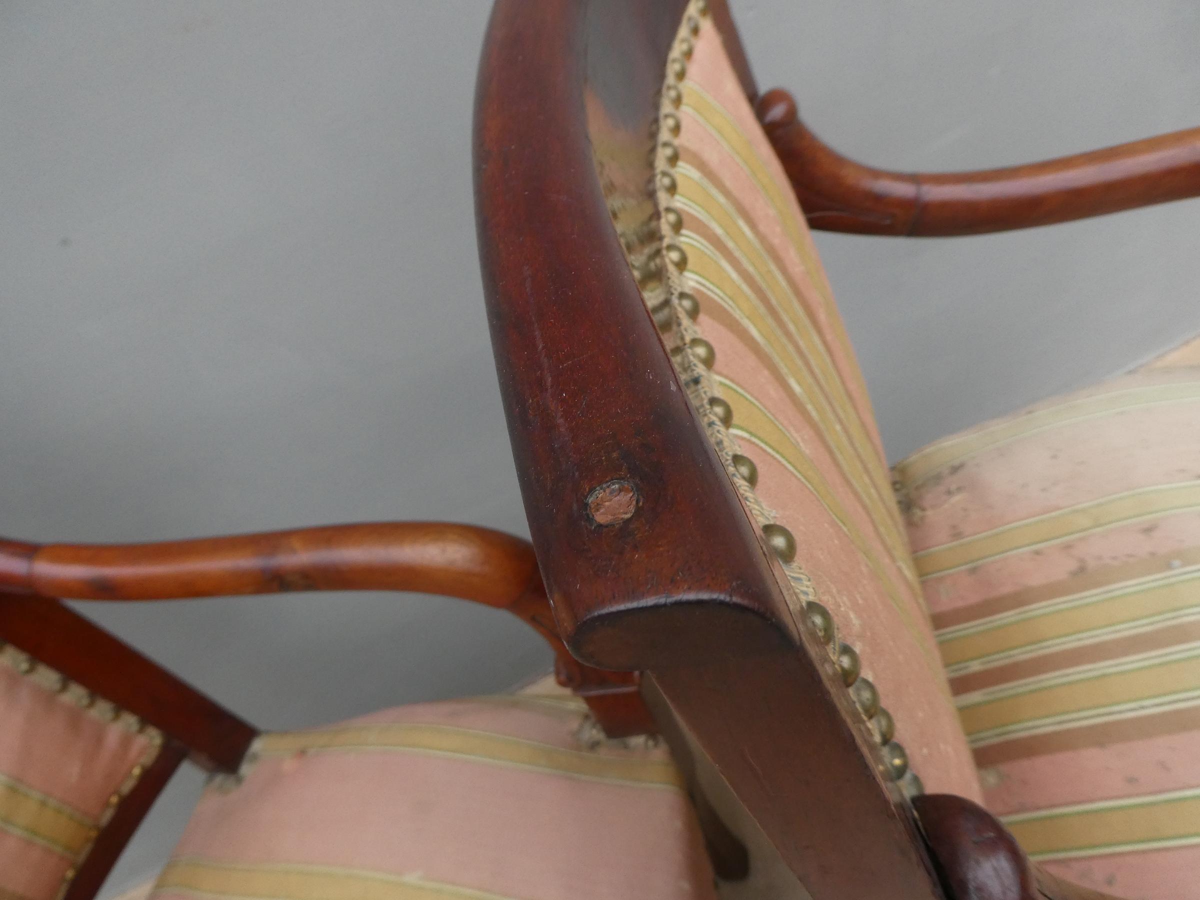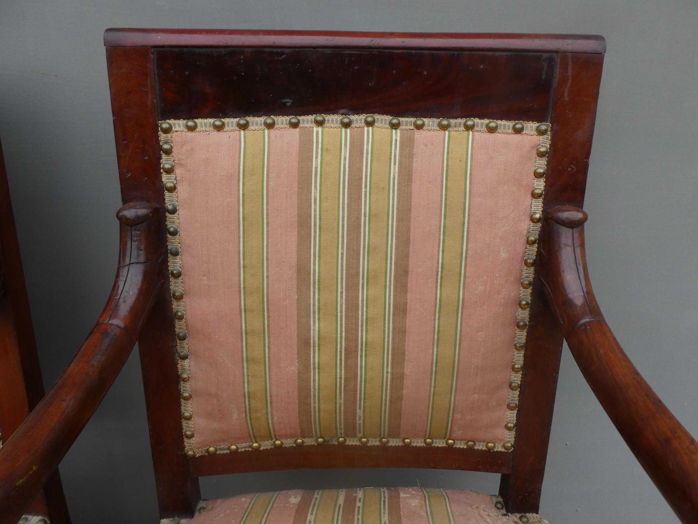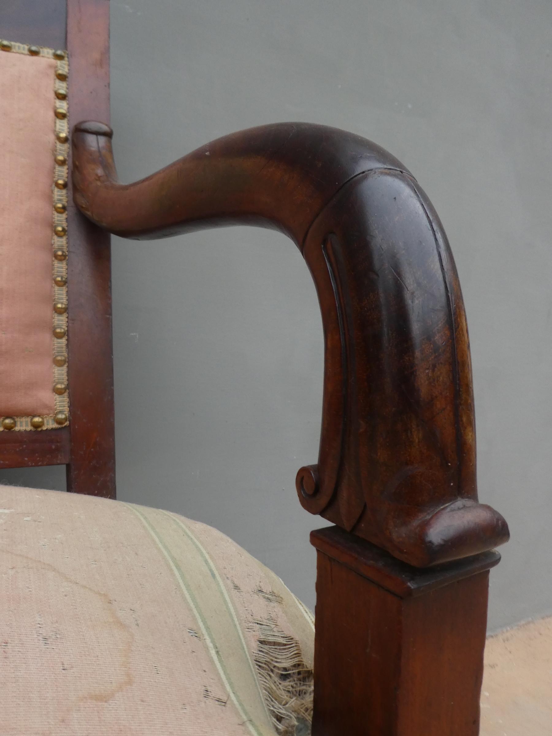 Coppia di poltrone realizzate in legno di mogano, appartenenti d’epoca alla seconda metà dell’800. Lo stile Impero predilige schienali dritti ed essenziali, sedute appena arrotondate nella parte frontale e gambe anteriori a sciabola che formano, con i supporti dei braccioli, un solo elemento. Necessitano di alcuni interventi di restauro – il tessuto va sostituito.
