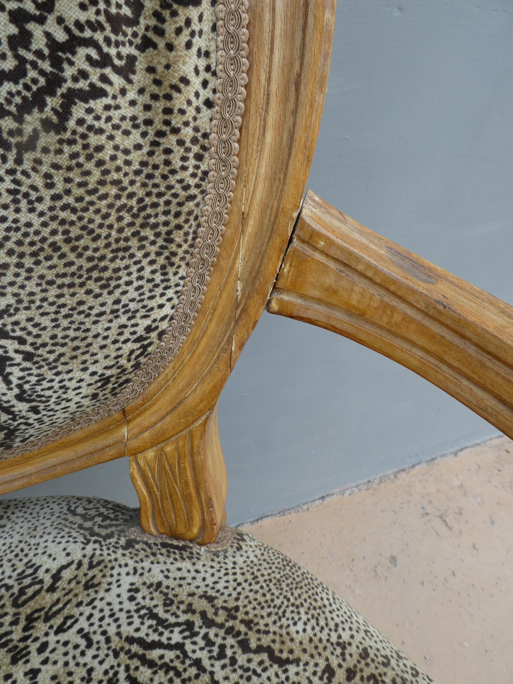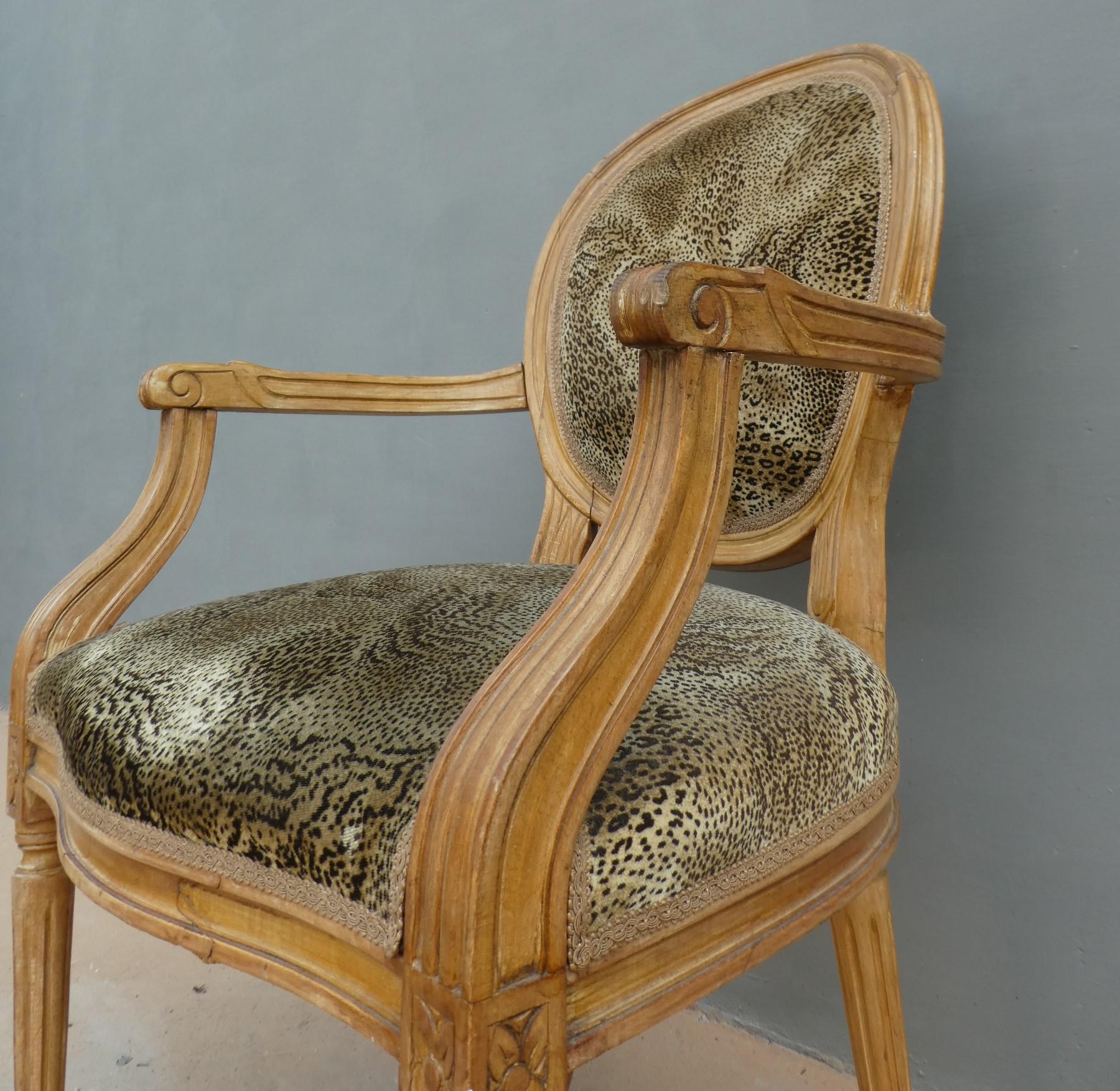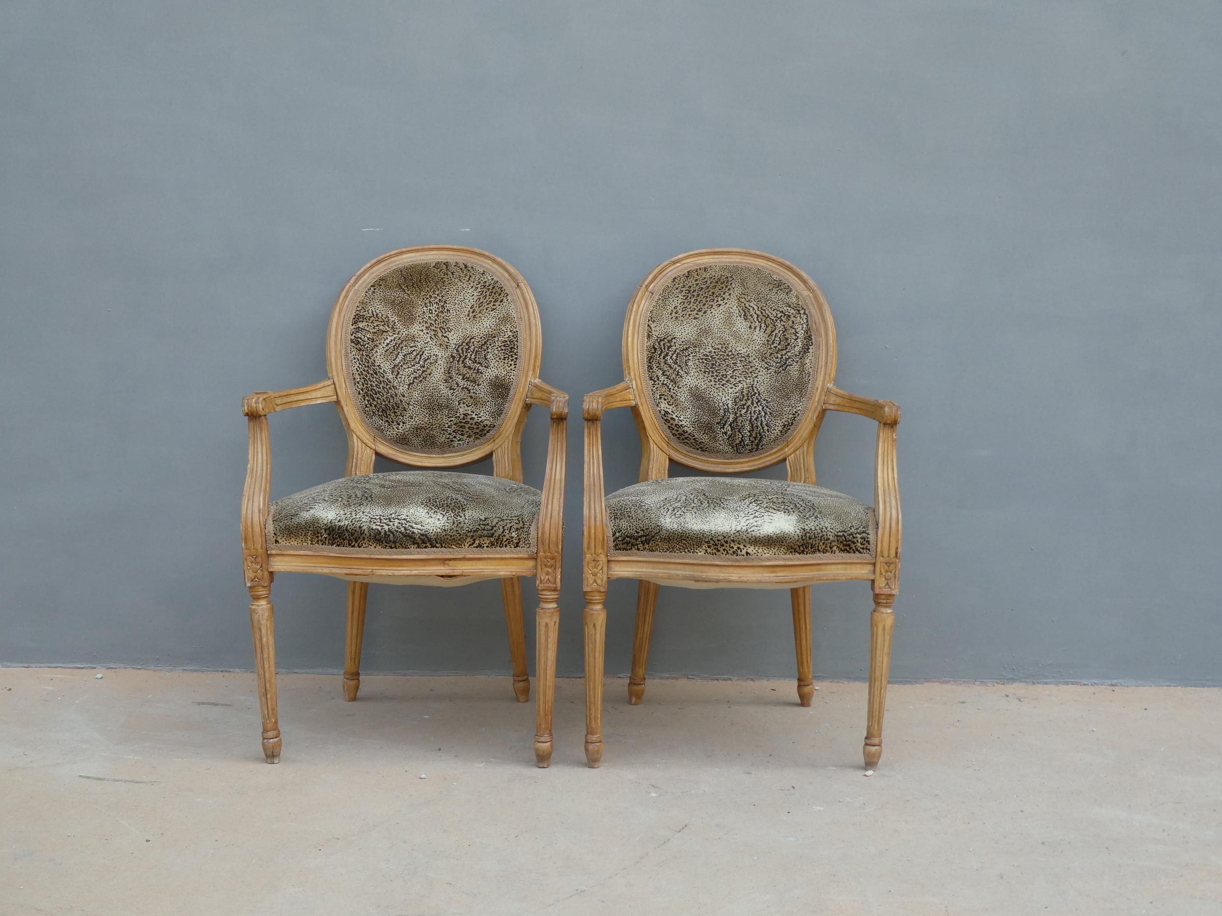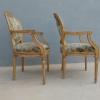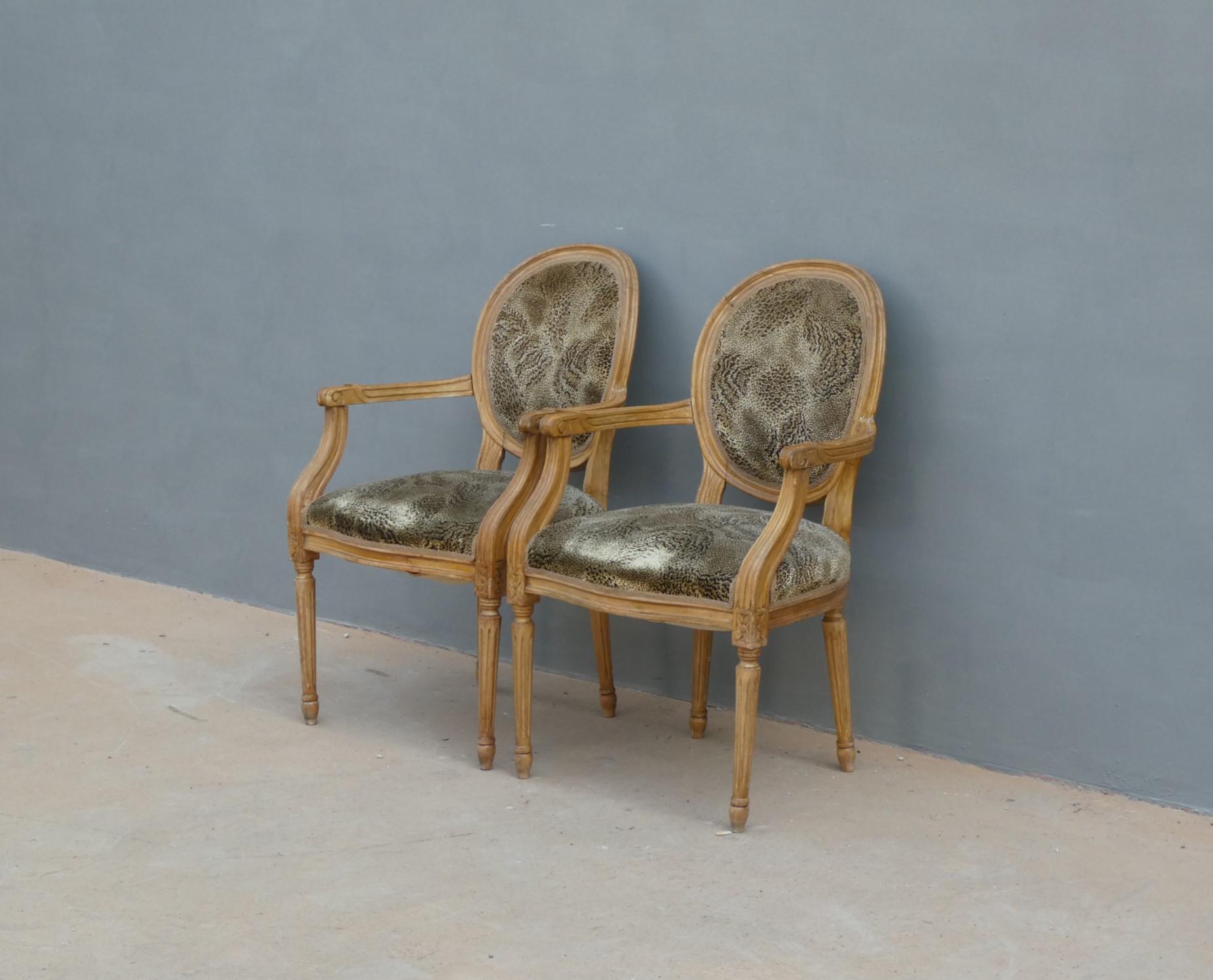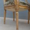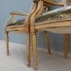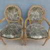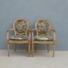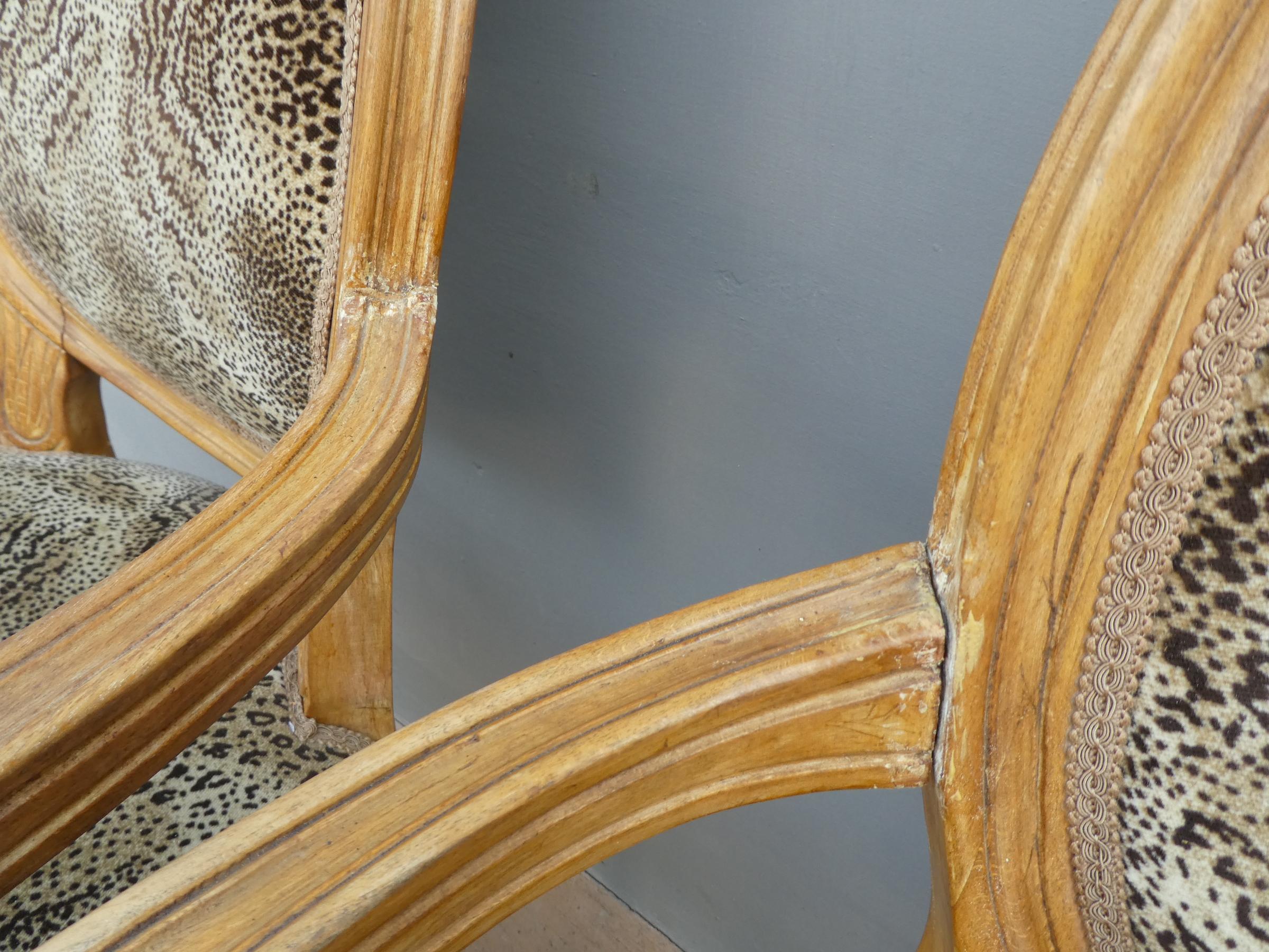 Coppia di poltrone stile Luigi XVI con schienale a ‘medaglione’, realizzate in legno di faggio e rivestite interamente in tessuto. Un caratteristico esempio di seduta dalla raffinata eleganza: decorata con ‘dadi’ agli angoli della cintura, arricchiti da un motivo floreale interno, sostenuta da gambe rastremate verso il basso ed impreziosite con delicate sgusciature. Necessitano di leggeri interventi di restauro – il tessuto è usurato e strappato sul retro. Epoca metà ‘900.