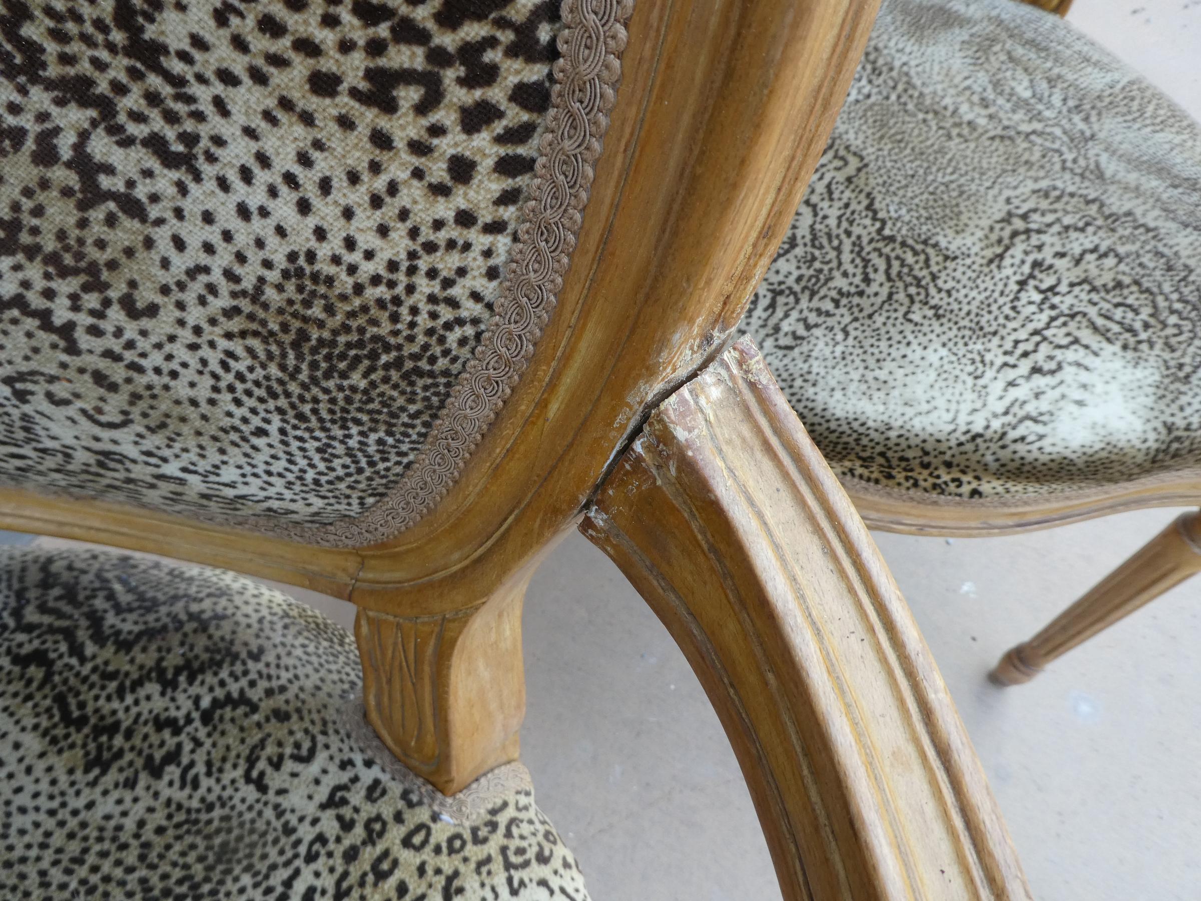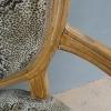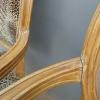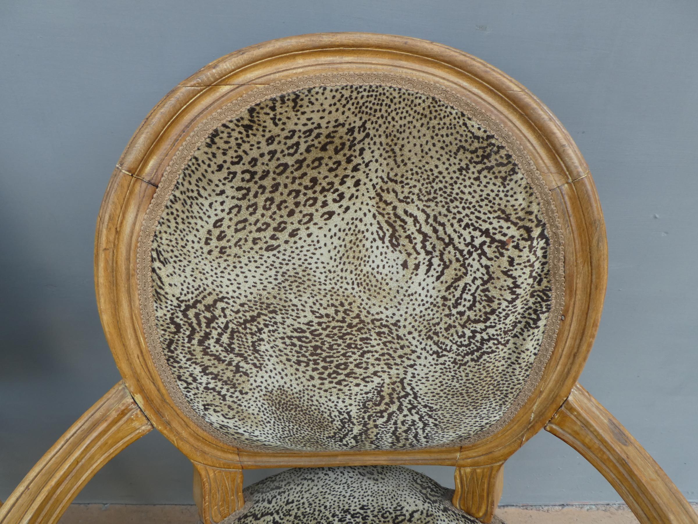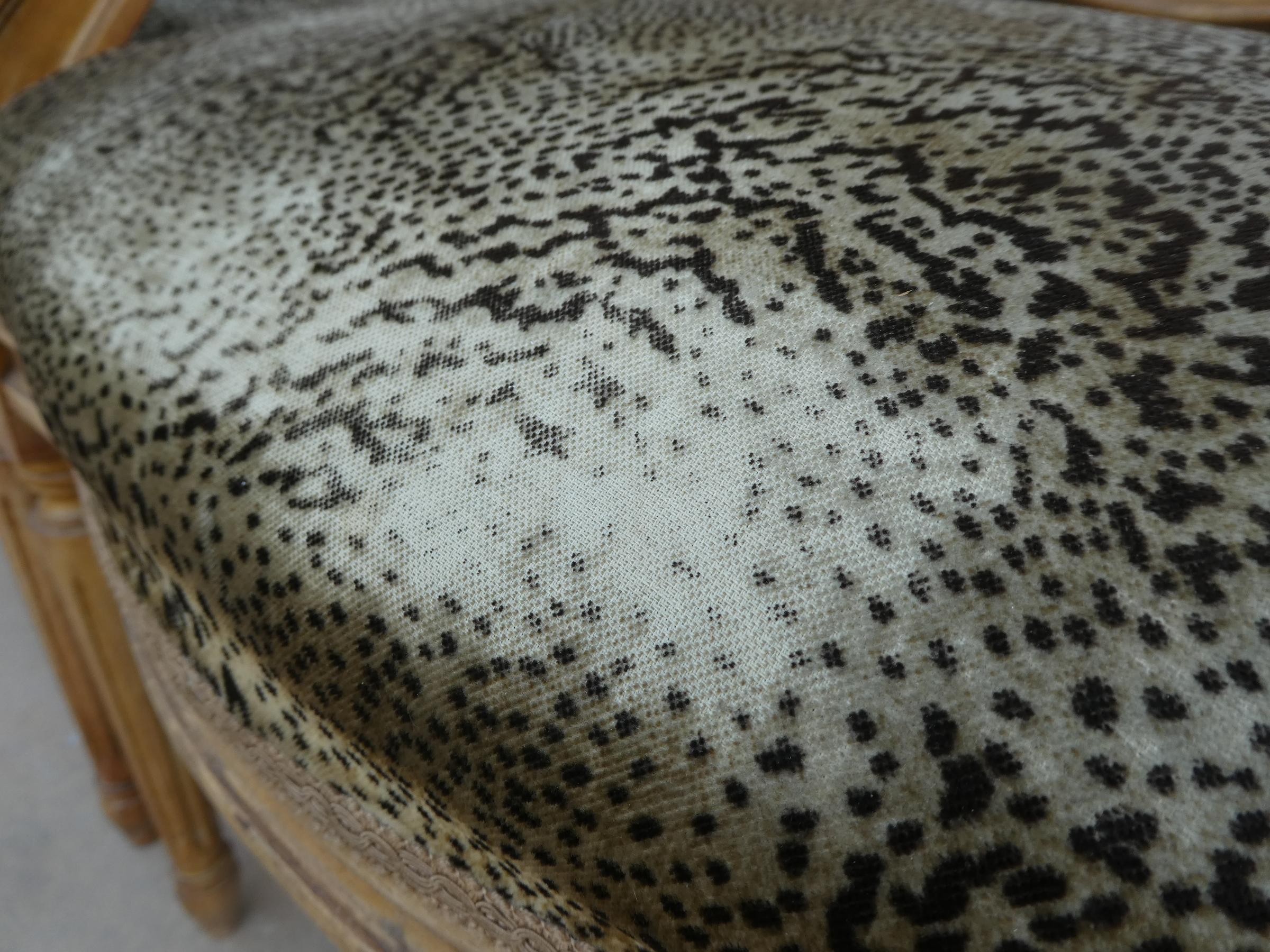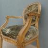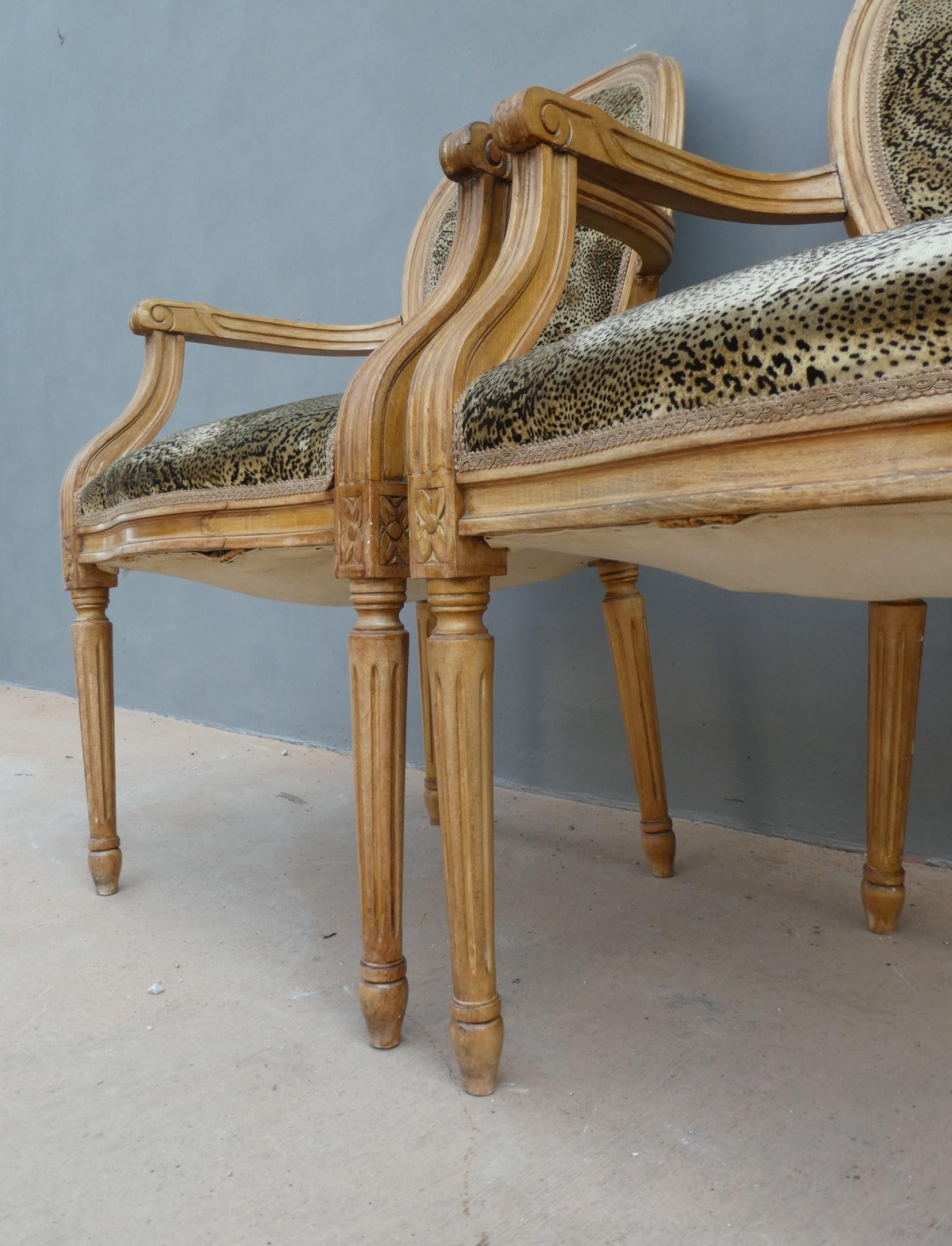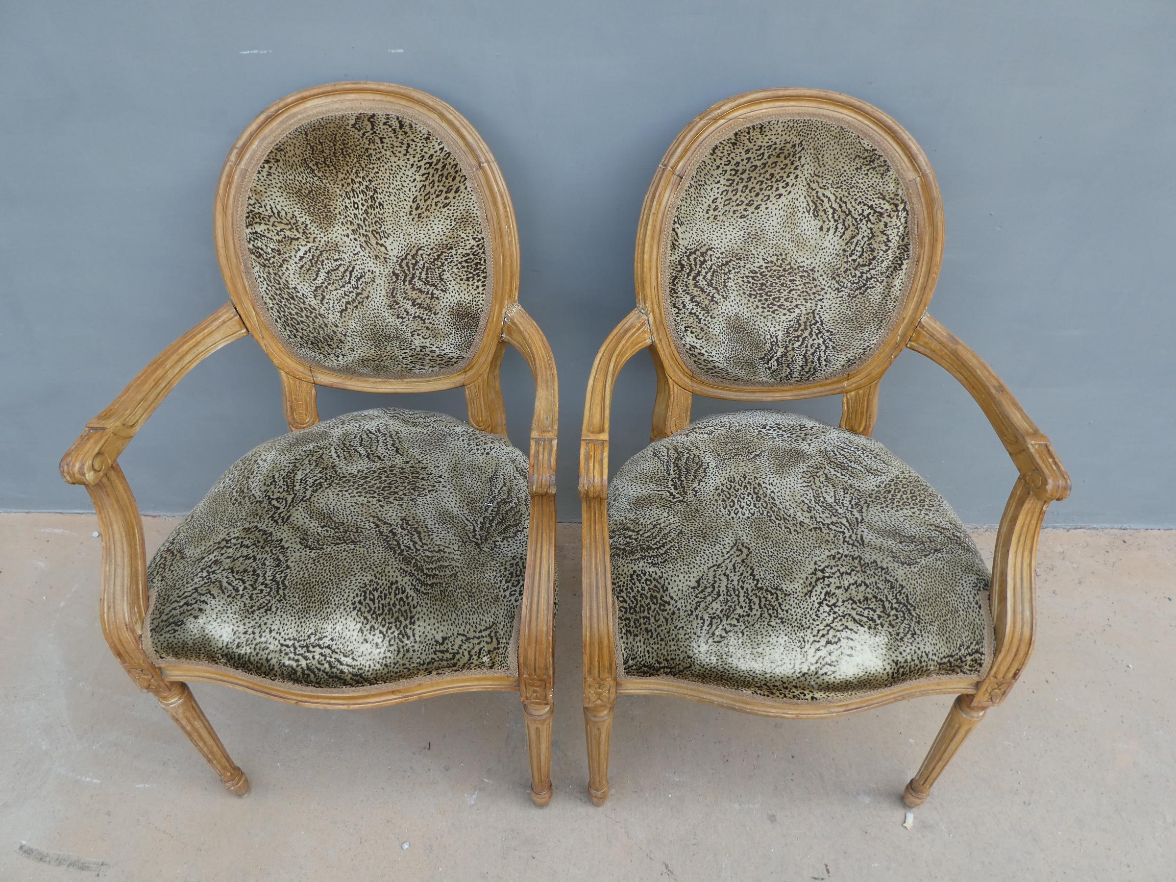 Coppia di poltrone stile Luigi XVI con schienale a ‘medaglione’, realizzate in legno di faggio e rivestite interamente in tessuto. Un caratteristico esempio di seduta dalla raffinata eleganza: decorata con ‘dadi’ agli angoli della cintura, arricchiti da un motivo floreale interno, sostenuta da gambe rastremate verso il basso ed impreziosite con delicate sgusciature. Necessitano di leggeri interventi di restauro – il tessuto è usurato e strappato sul retro. Epoca metà ‘900.