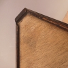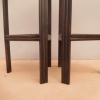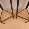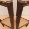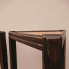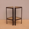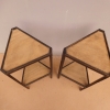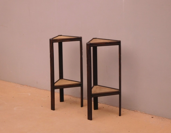 Coppia di tavolini alzatine etager ad angolo dotati di due ripiani fissi d’appoggio, laccati e rifiniti con la tecnica “Shabby Chic” che prevede l’uso di colori chiari e colori più scuri che affiorano dopo il trattamento d’usura. Ciò che rende elegante ed originale questi mobiletti, è il contrasto creato dalla lacca utilizzata per il corpo, con quella dei ripiani, lasciati a legno naturale (compensato). Epoca metà ‘900.