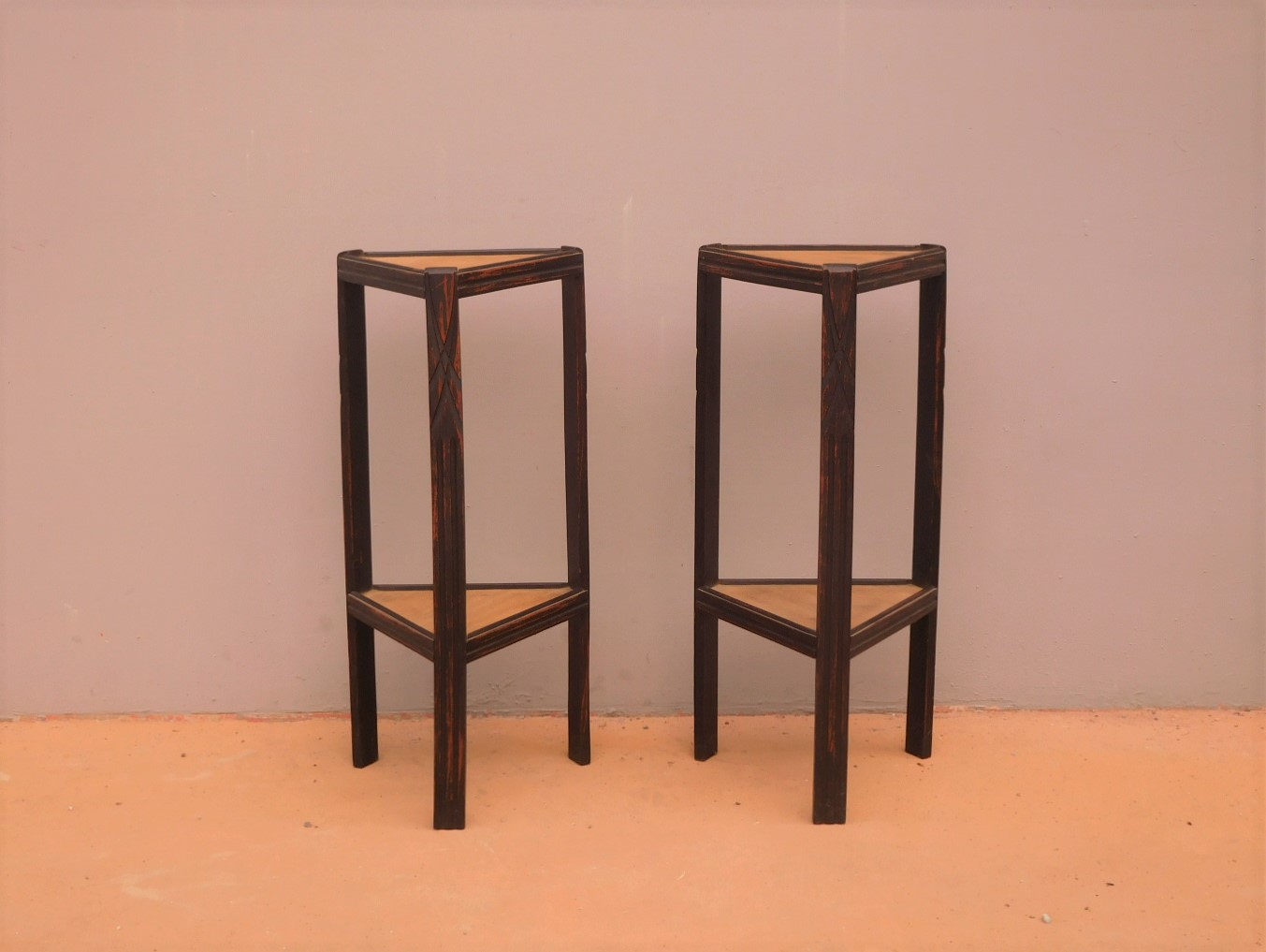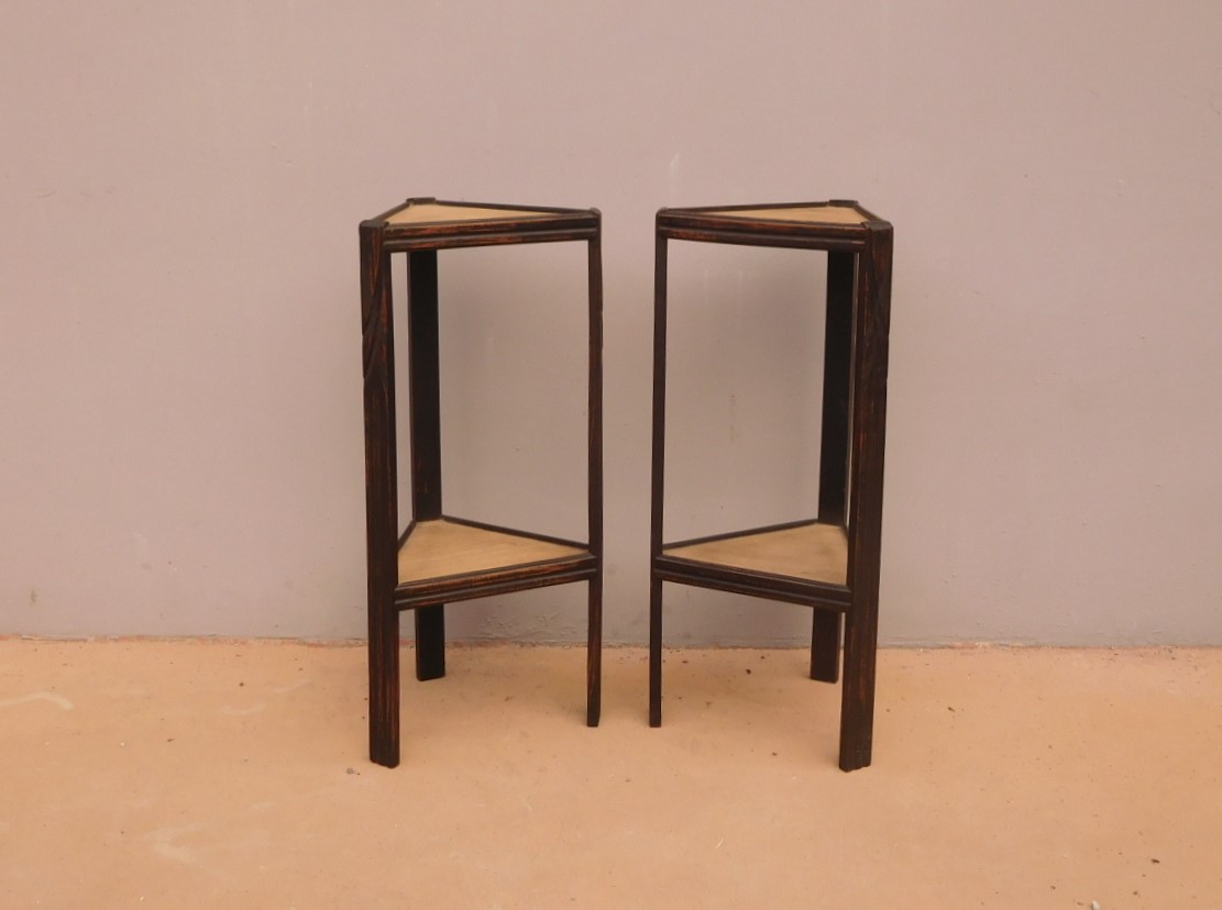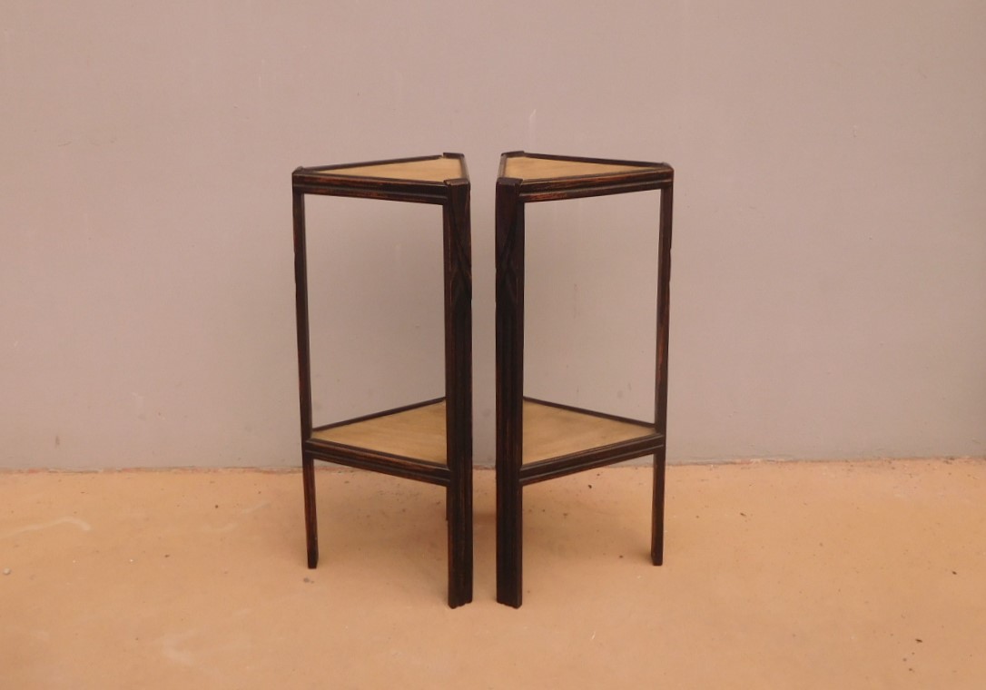 Coppia di tavolini alzatine etager ad angolo dotati di due ripiani fissi d’appoggio, laccati e rifiniti con la tecnica “Shabby Chic” che prevede l’uso di colori chiari e colori più scuri che affiorano dopo il trattamento d’usura. Ciò che rende elegante ed originale questi mobiletti, è il contrasto creato dalla lacca utilizzata per il corpo, con quella dei ripiani, lasciati a legno naturale (compensato). Epoca metà ‘900.