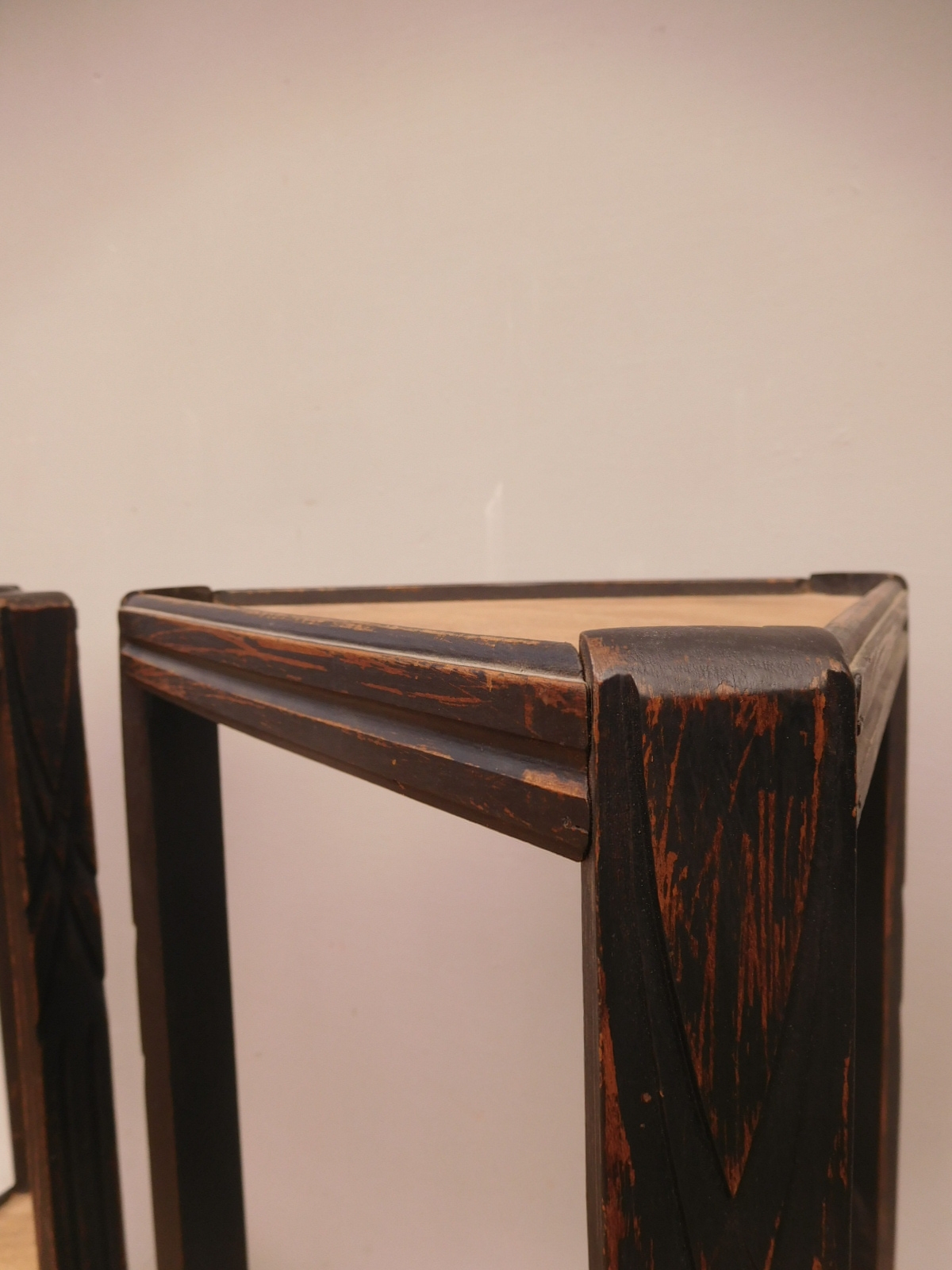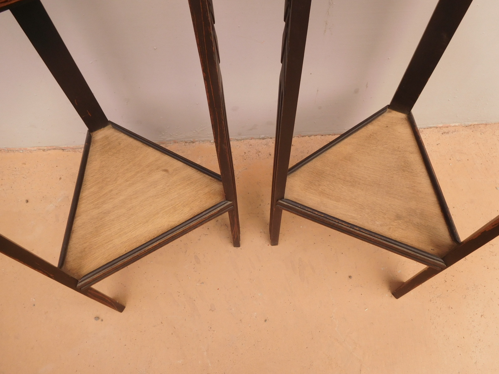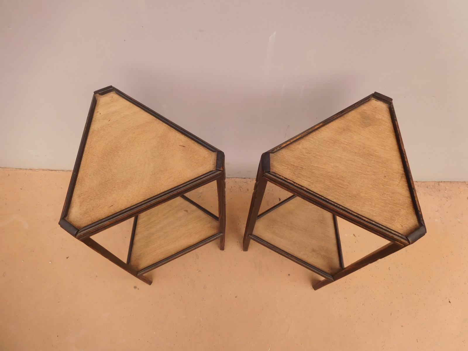 Coppia di tavolini alzatine etager ad angolo dotati di due ripiani fissi d’appoggio, laccati e rifiniti con la tecnica “Shabby Chic” che prevede l’uso di colori chiari e colori più scuri che affiorano dopo il trattamento d’usura. Ciò che rende elegante ed originale questi mobiletti, è il contrasto creato dalla lacca utilizzata per il corpo, con quella dei ripiani, lasciati a legno naturale (compensato). Epoca metà ‘900.