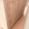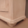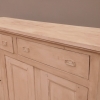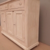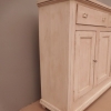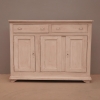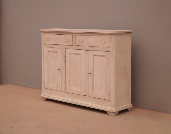 Bancone credenza mobile realizzato in legno, dotato di tre ante e due cassetti frontali, particolari dimensioni, laccato e rifinito con la tecnica “Shabby Chic” che prevede l’uso di colori chiari e colori scuri che affiorano dopo il trattamento d’usura. La lineare struttura conferisce una sobria eleganza. La ricerca di un decoro essenziale si riflette anche sui montanti, privi di elementi decorativi. All’interno dispone di un ripiano. Recente ricostruzione (legno nuovo e vecchio).