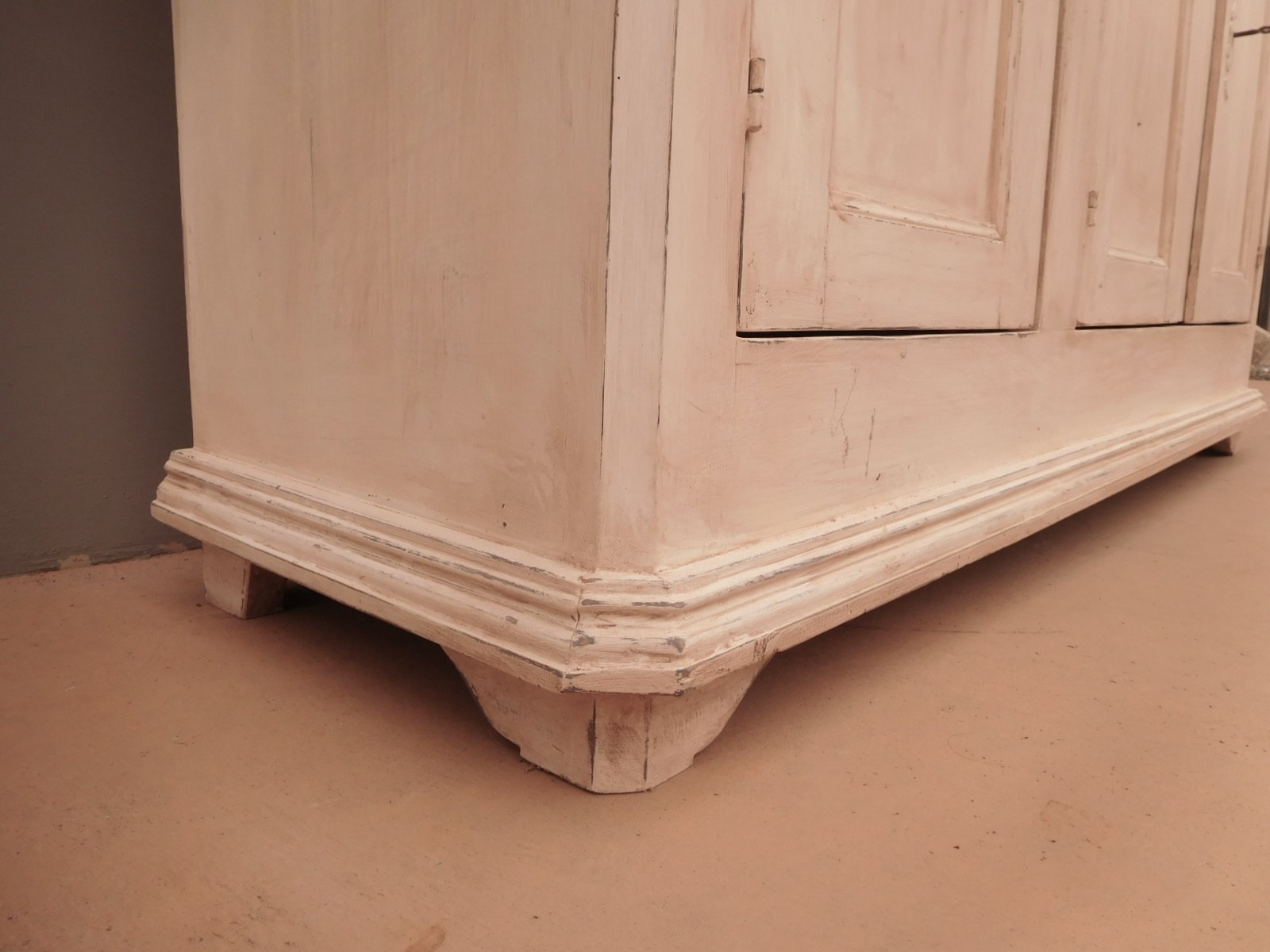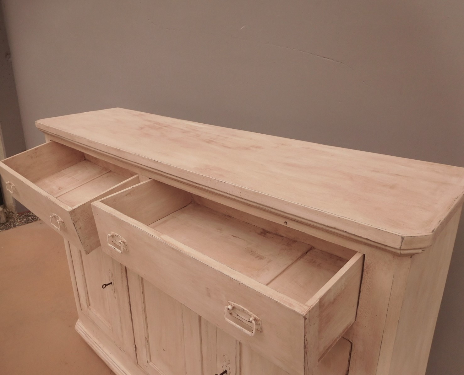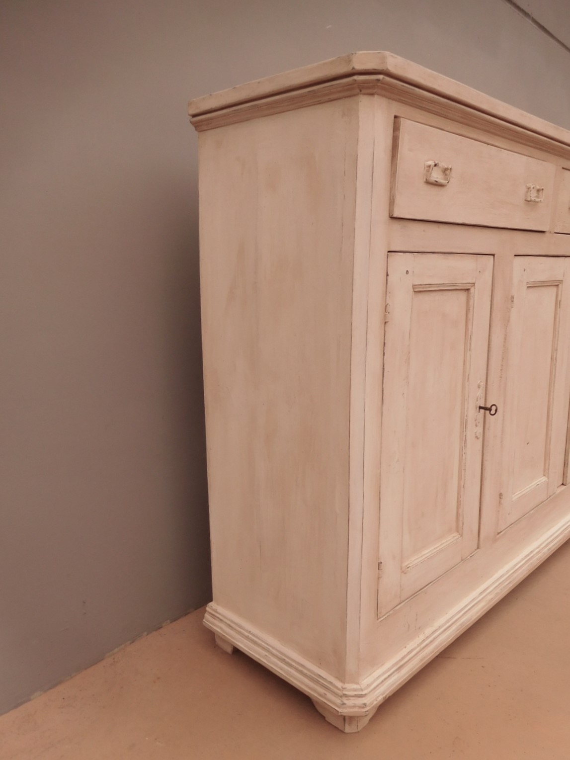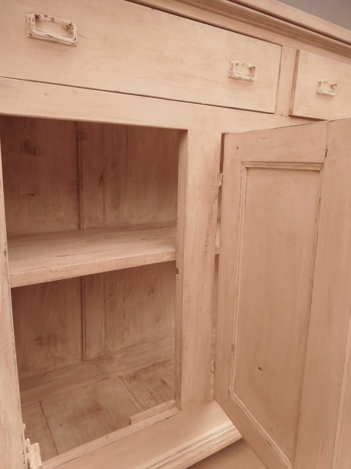 Bancone credenza mobile realizzato in legno, dotato di tre ante e due cassetti frontali, particolari dimensioni, laccato e rifinito con la tecnica “Shabby Chic” che prevede l’uso di colori chiari e colori scuri che affiorano dopo il trattamento d’usura. La lineare struttura conferisce una sobria eleganza. La ricerca di un decoro essenziale si riflette anche sui montanti, privi di elementi decorativi. All’interno dispone di un ripiano. Recente ricostruzione (legno nuovo e vecchio).
