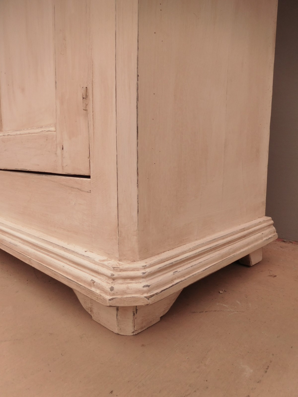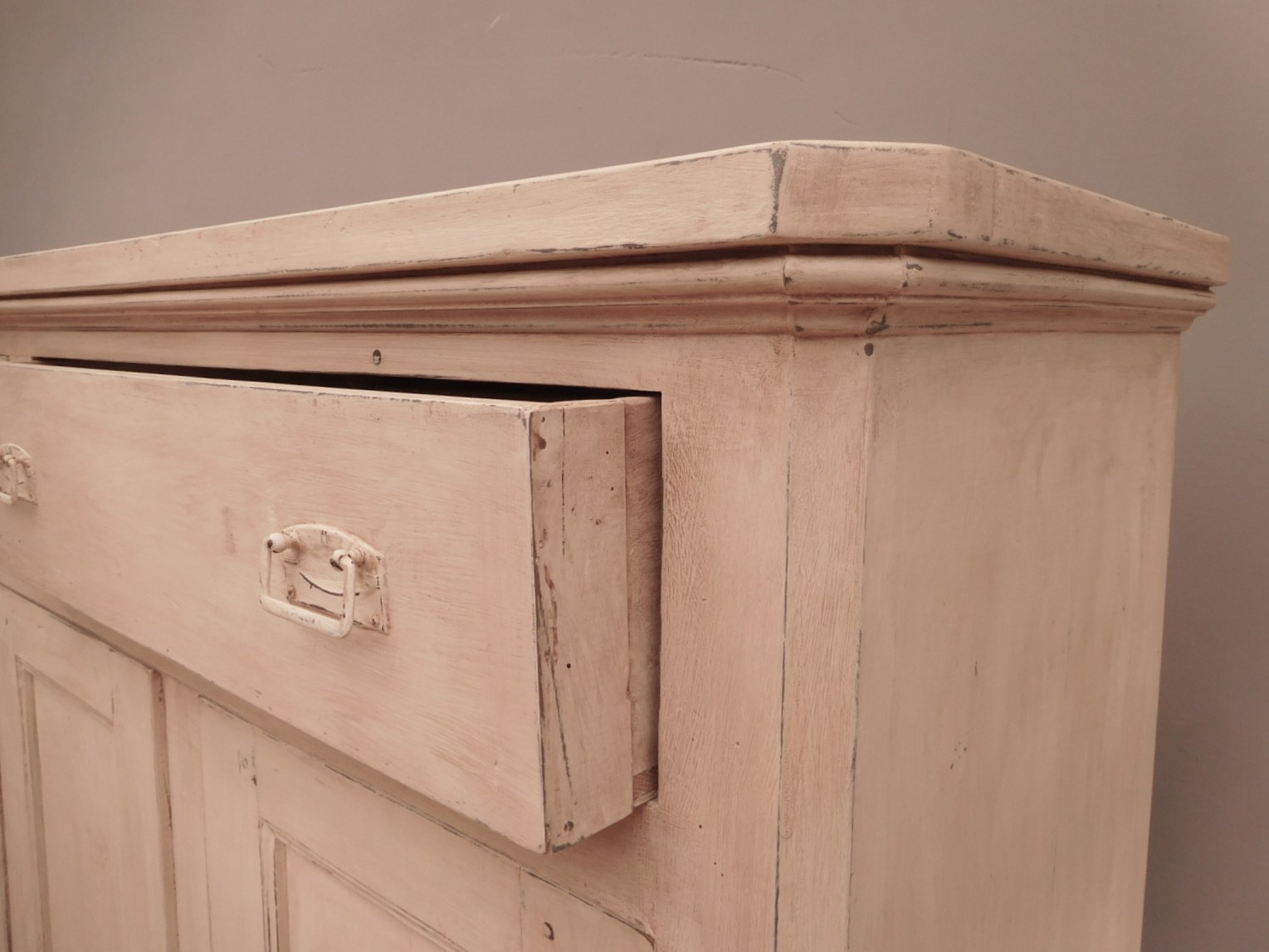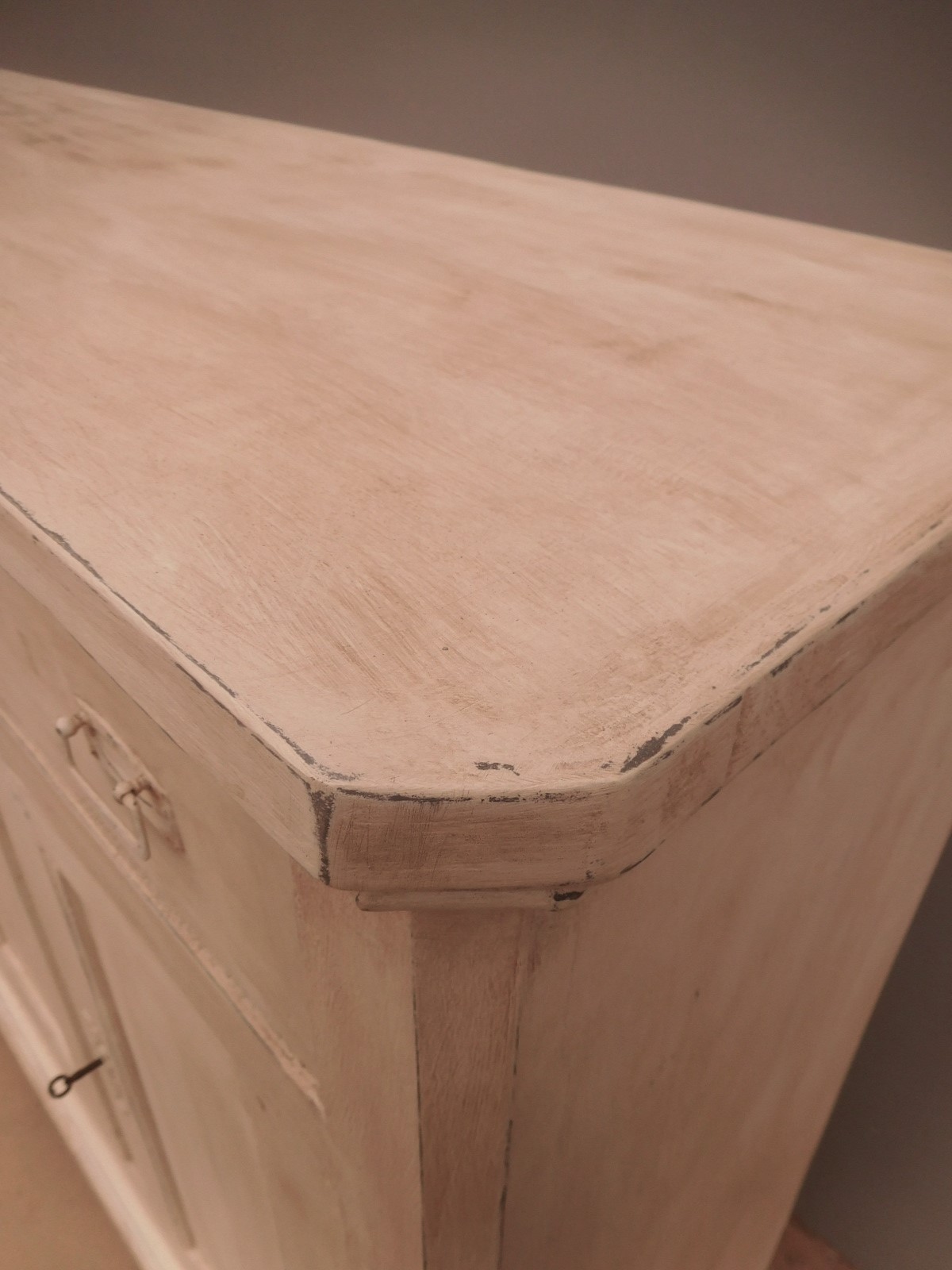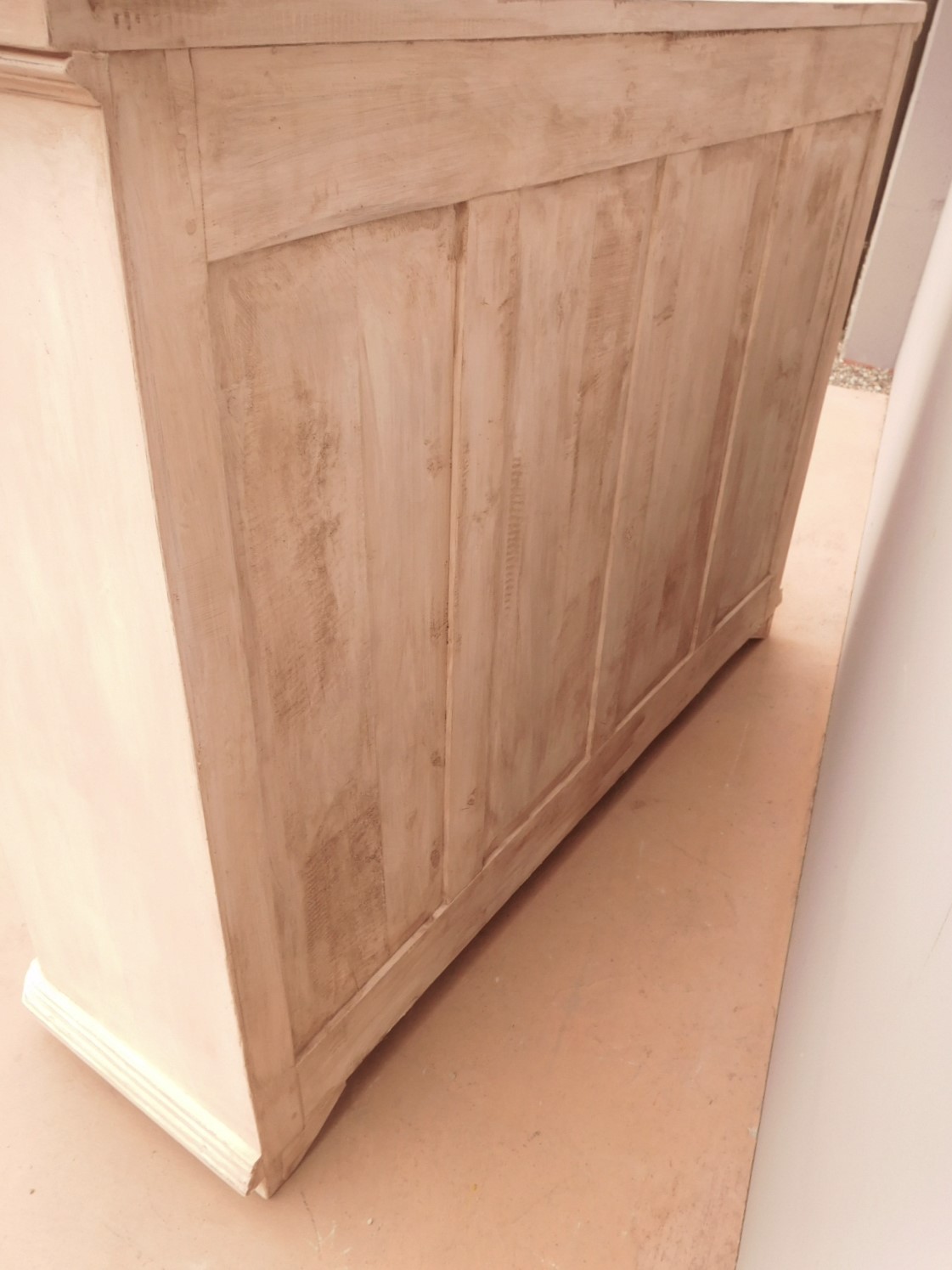 Bancone credenza mobile realizzato in legno, dotato di tre ante e due cassetti frontali, particolari dimensioni, laccato e rifinito con la tecnica “Shabby Chic” che prevede l’uso di colori chiari e colori scuri che affiorano dopo il trattamento d’usura. La lineare struttura conferisce una sobria eleganza. La ricerca di un decoro essenziale si riflette anche sui montanti, privi di elementi decorativi. All’interno dispone di un ripiano. Recente ricostruzione (legno nuovo e vecchio).