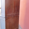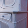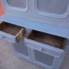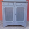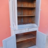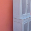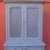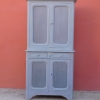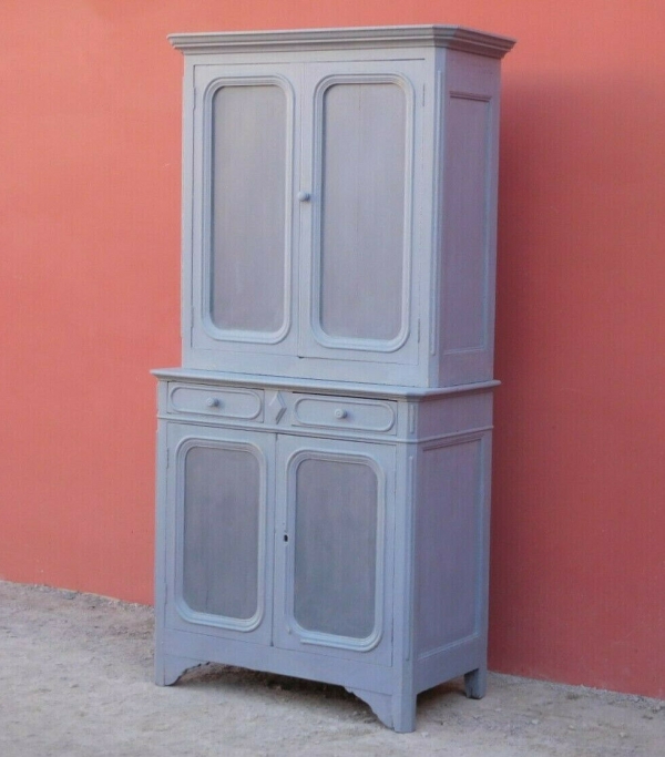 Credenza buffet doppia con alzata a due ante, particolari dimensioni, realizzata in legno e successivamente laccata e rifinita con la tecnica “Shabby Chic” che prevede l’uso di colori chiari e colori più scuri che affiorano dopo il trattamento d’usura. La rigida e lineare struttura conferisce una sobria eleganza. La ricerca di un decoro essenziale si riflette anche sui montanti, privi di elementi decorativi. All’interno dispone di diversi ripiani e, frontalmente, di due cassetti. Divisibile in due corpi. Epoca fine ‘800.