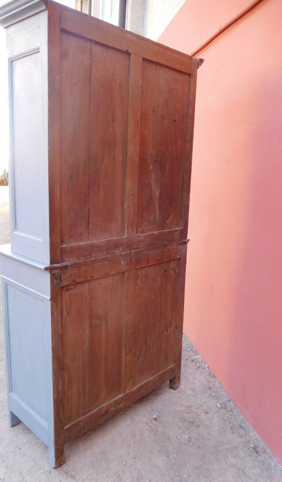 Credenza buffet doppia con alzata a due ante, particolari dimensioni, realizzata in legno e successivamente laccata e rifinita con la tecnica “Shabby Chic” che prevede l’uso di colori chiari e colori più scuri che affiorano dopo il trattamento d’usura. La rigida e lineare struttura conferisce una sobria eleganza. La ricerca di un decoro essenziale si riflette anche sui montanti, privi di elementi decorativi. All’interno dispone di diversi ripiani e, frontalmente, di due cassetti. Divisibile in due corpi. Epoca fine ‘800.