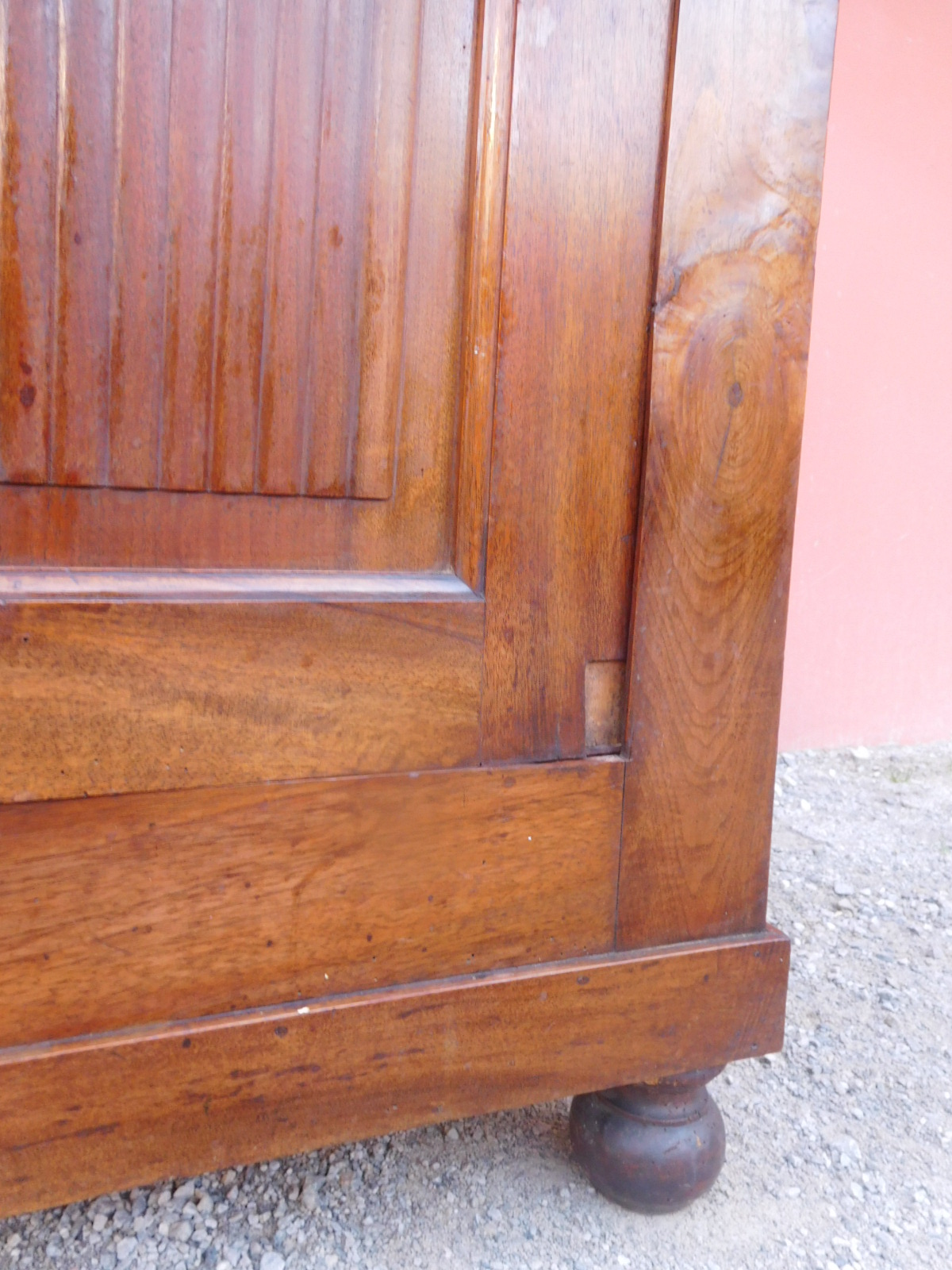 Credenza buffet doppia con alzata a due ante, impreziosita dai caratteristici pannelli ‘grissinati’, dotata di un cassetto centrale e di un’asse a sfilo estraibile, appartenente d’epoca alla metà dell’800. La struttura si presenta semplice e lineare, e vanta proporzioni sapientemente equilibrate. La ricerca di un decoro mirato si riflette anche sulla scelta d’utilizzare la noce, una nota essenza caratterizzata da fitte venature di tonalità più scura. Due piccoli pezzi di cornice sono stati rifatti nel tempo. Necessita d’interventi di restauro e sono presenti fori di tarlo.