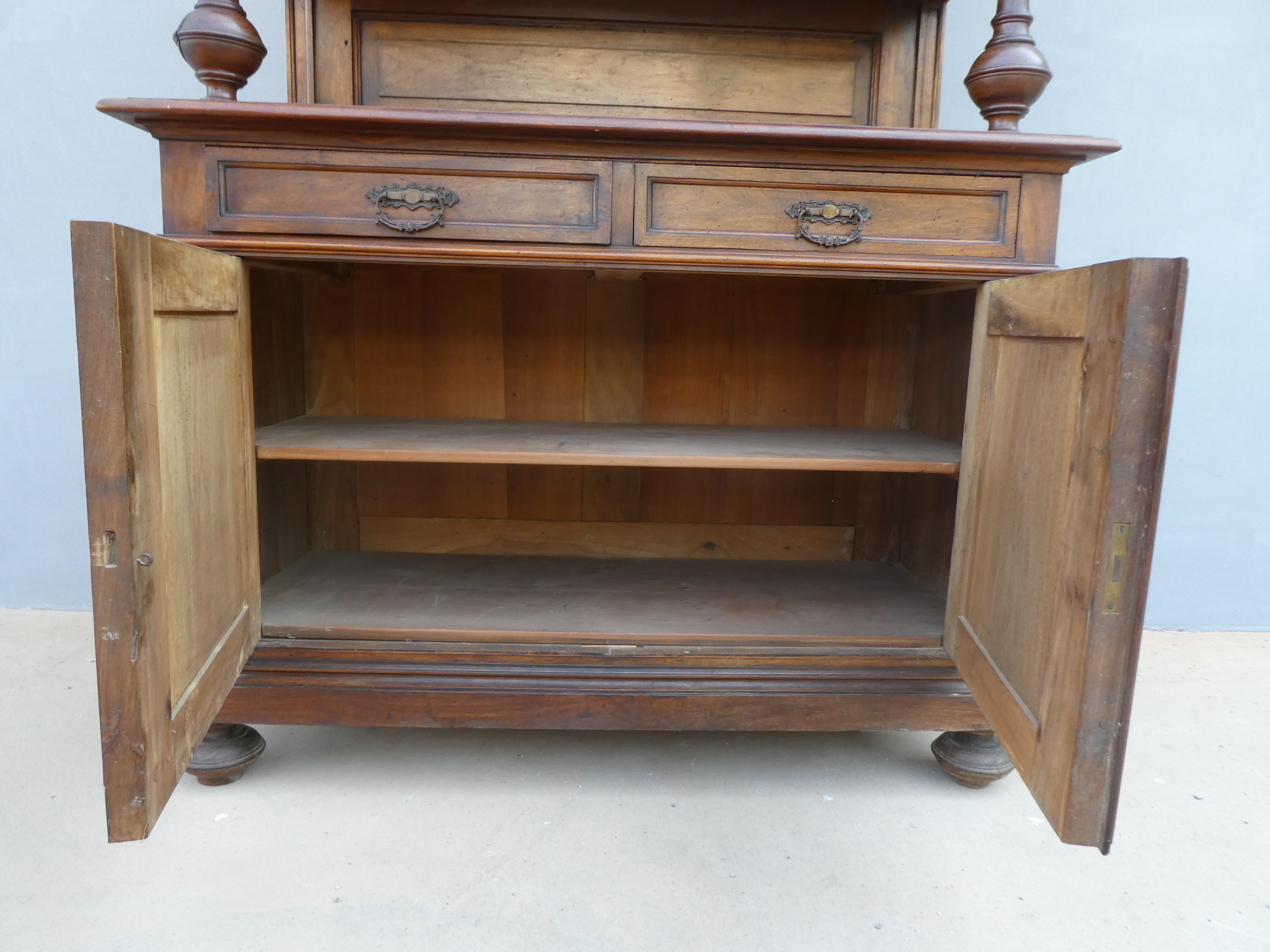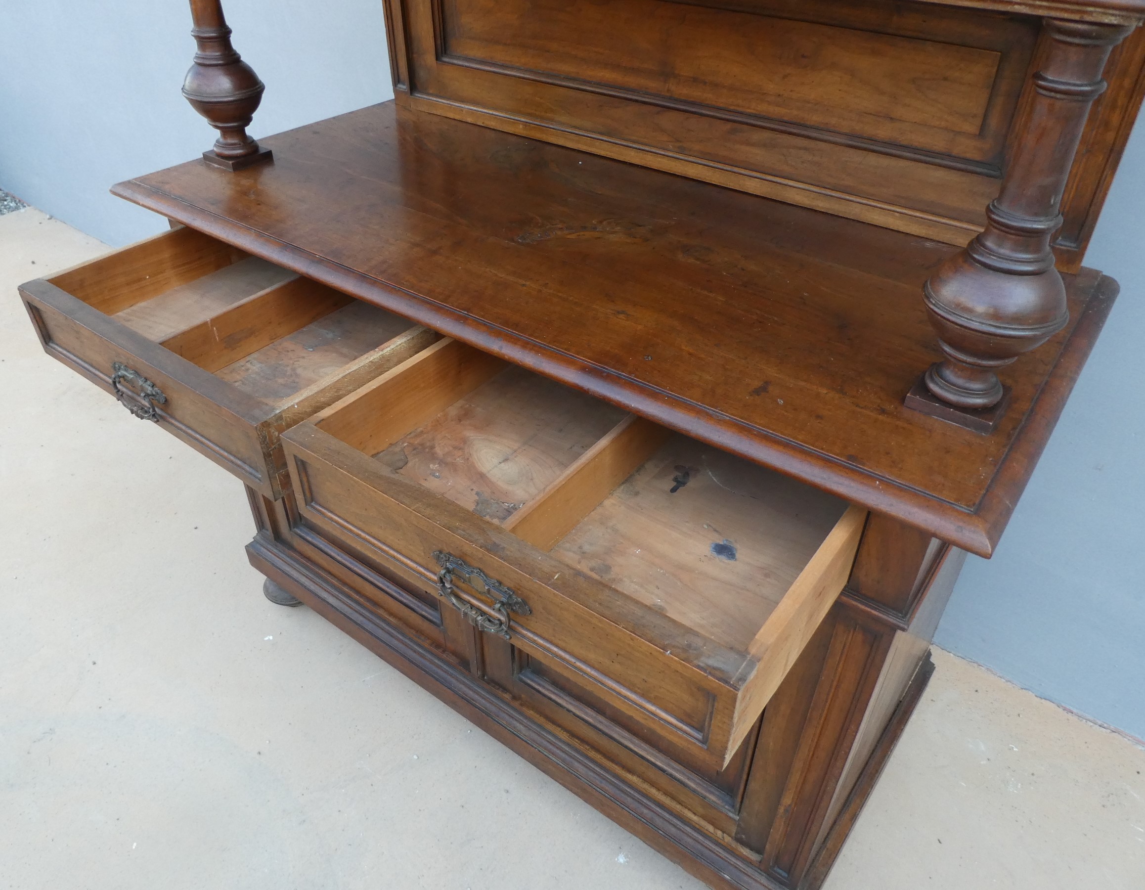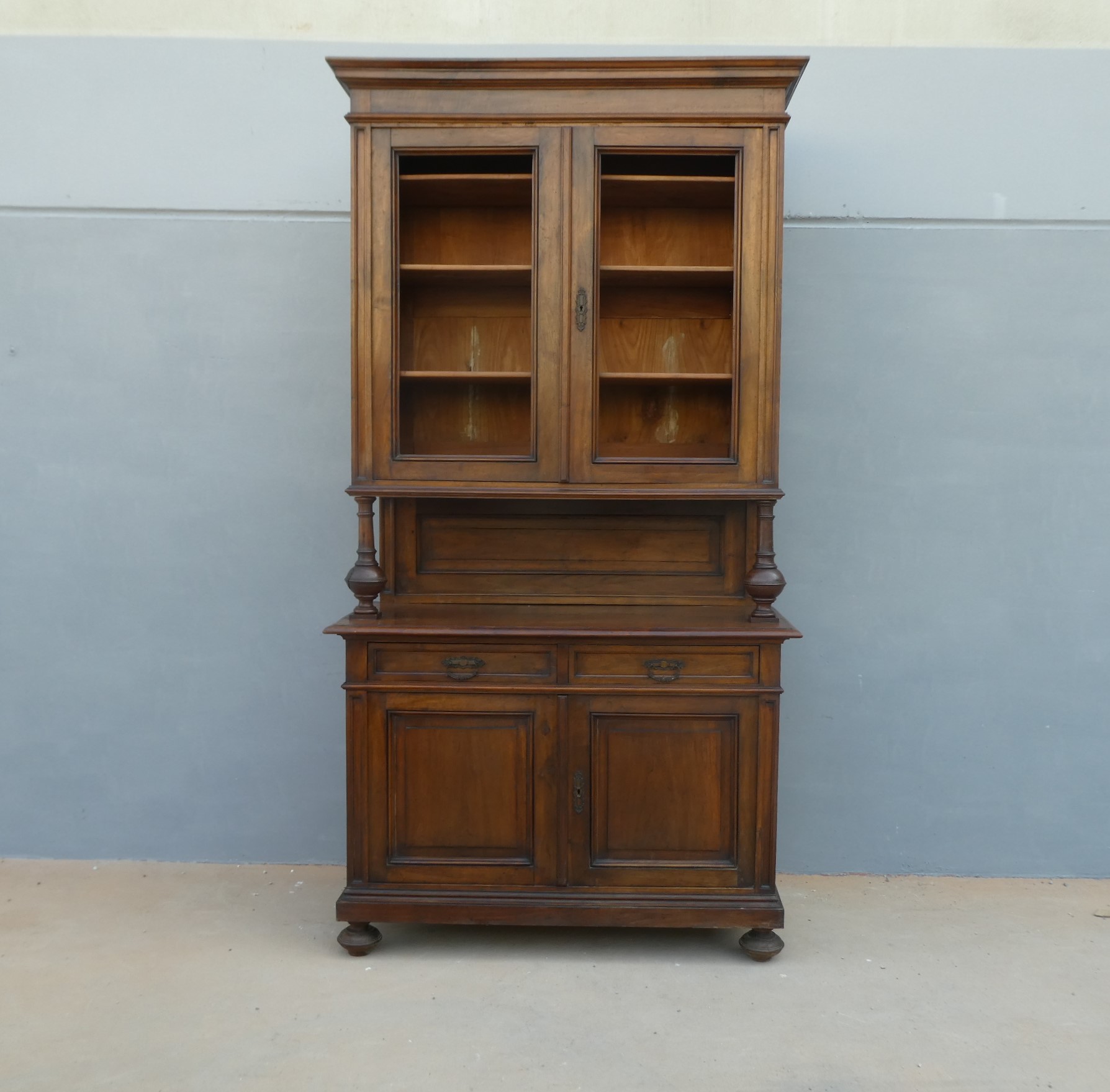 Credenza buffet doppio corpo con alzata (vetri mancanti) e doppio cassetto frontale, realizzata in noce massello ed appartenente d’epoca alla fine dell’800. La semplicità della struttura, dove il senso della misura viene rigorosamente rispettato, è il risultato di una raffinata eleganza. La ricerca di un decoro essenziale, si rispecchia anche sulla scelta dei montanti, privi di elementi decorativi. Dispone di ripiani interni ed è divisibile in due corpi. Necessita di qualche intervento di restauro e sono presenti fori di tarlo.