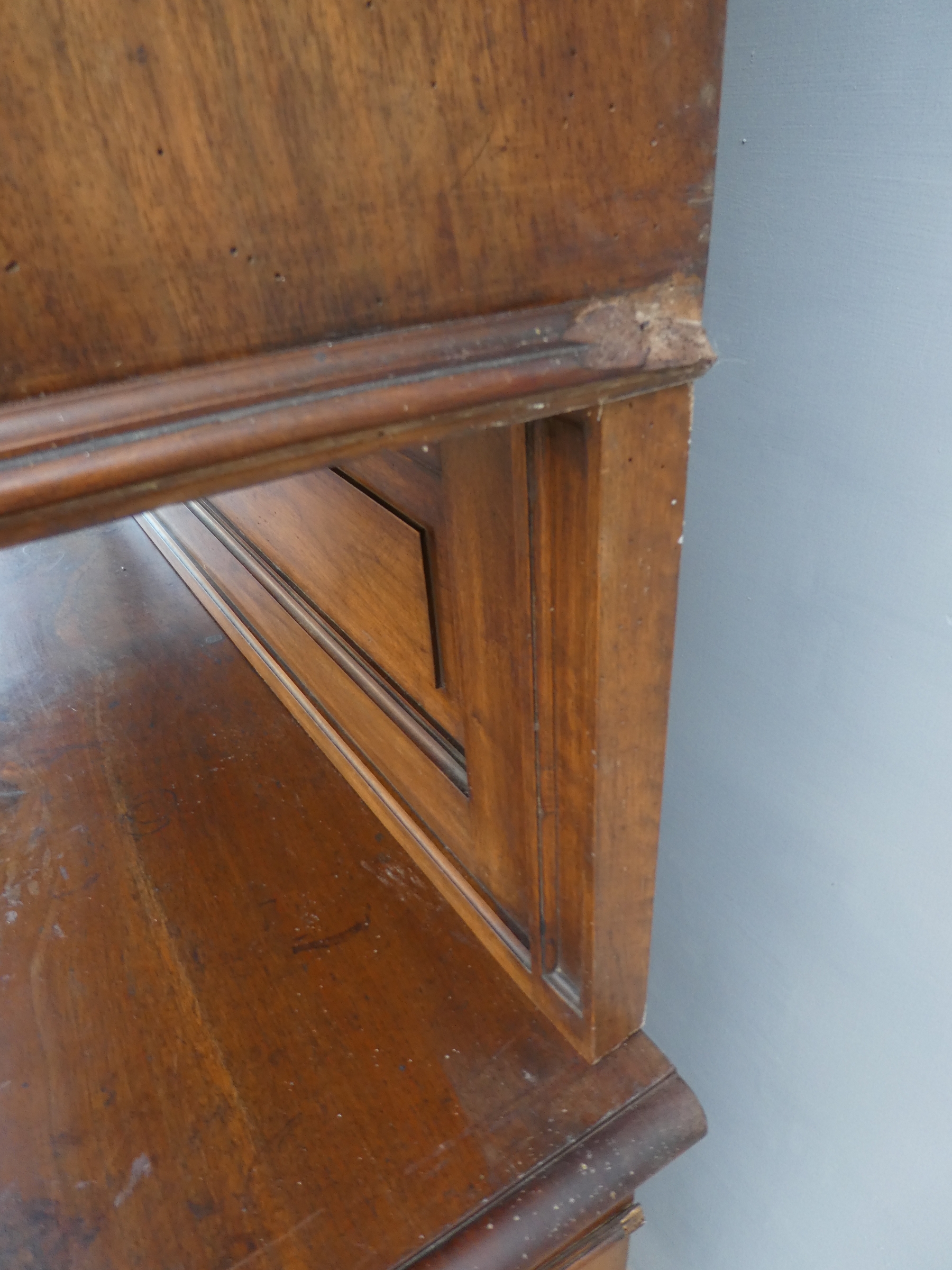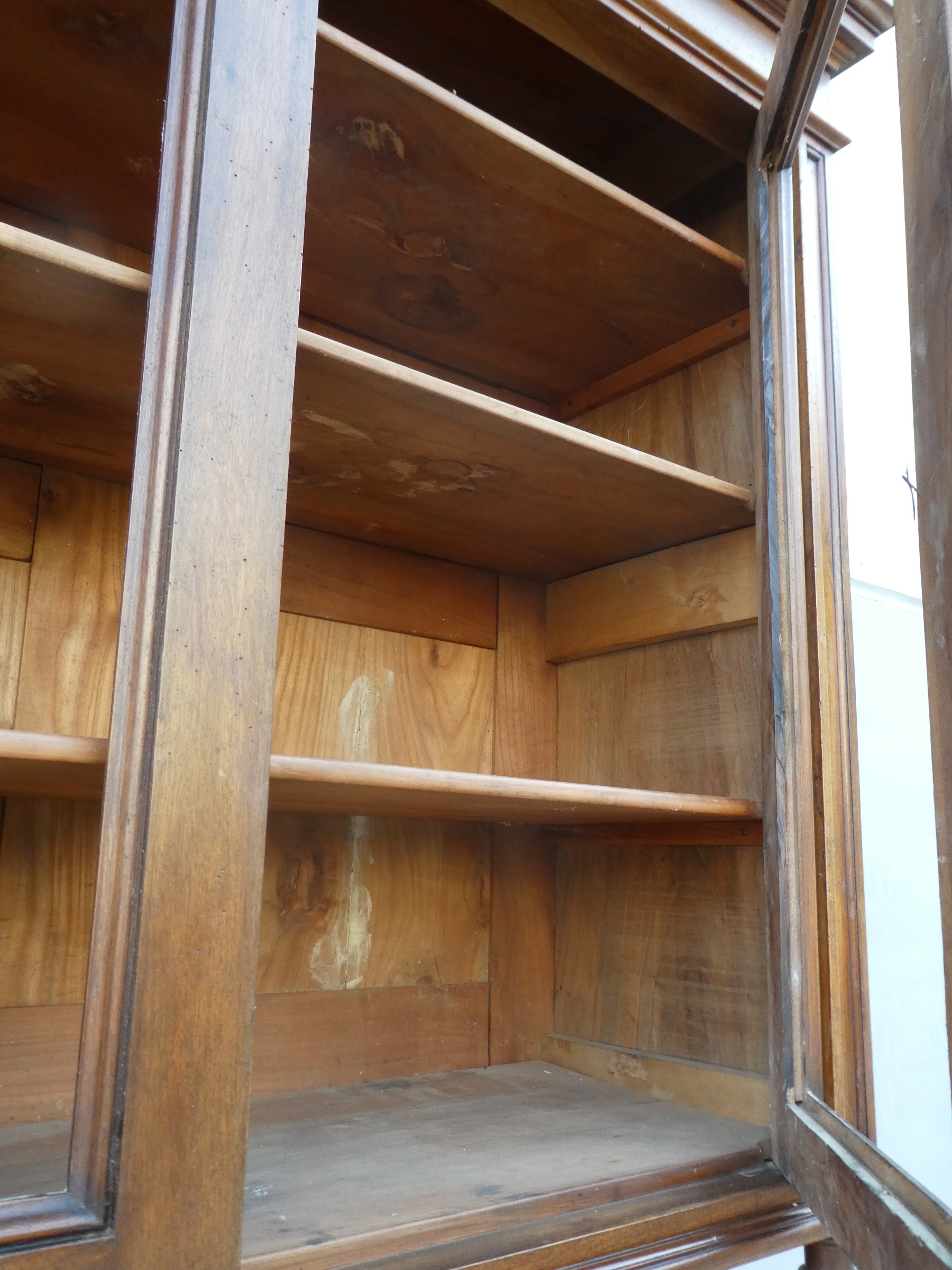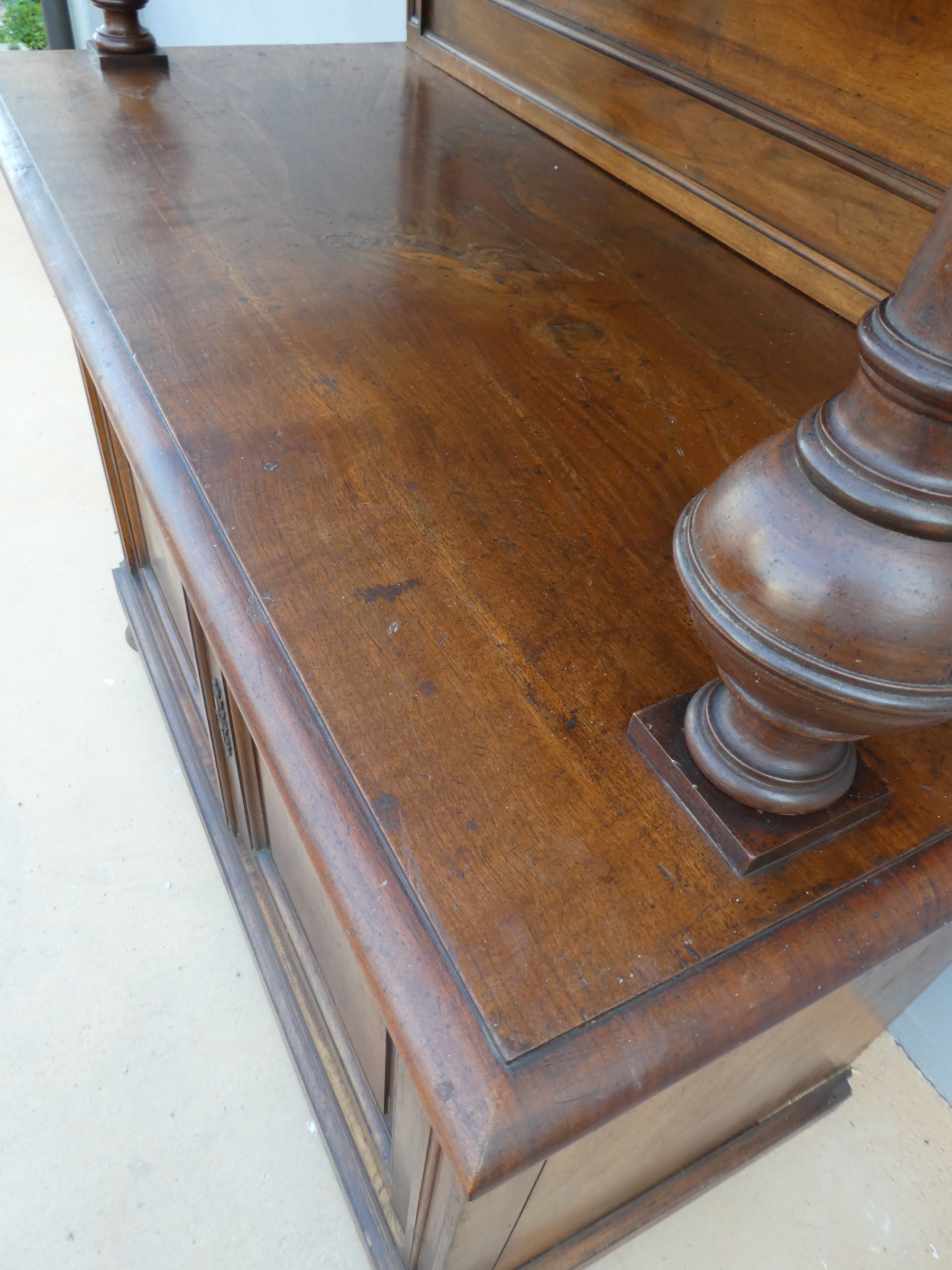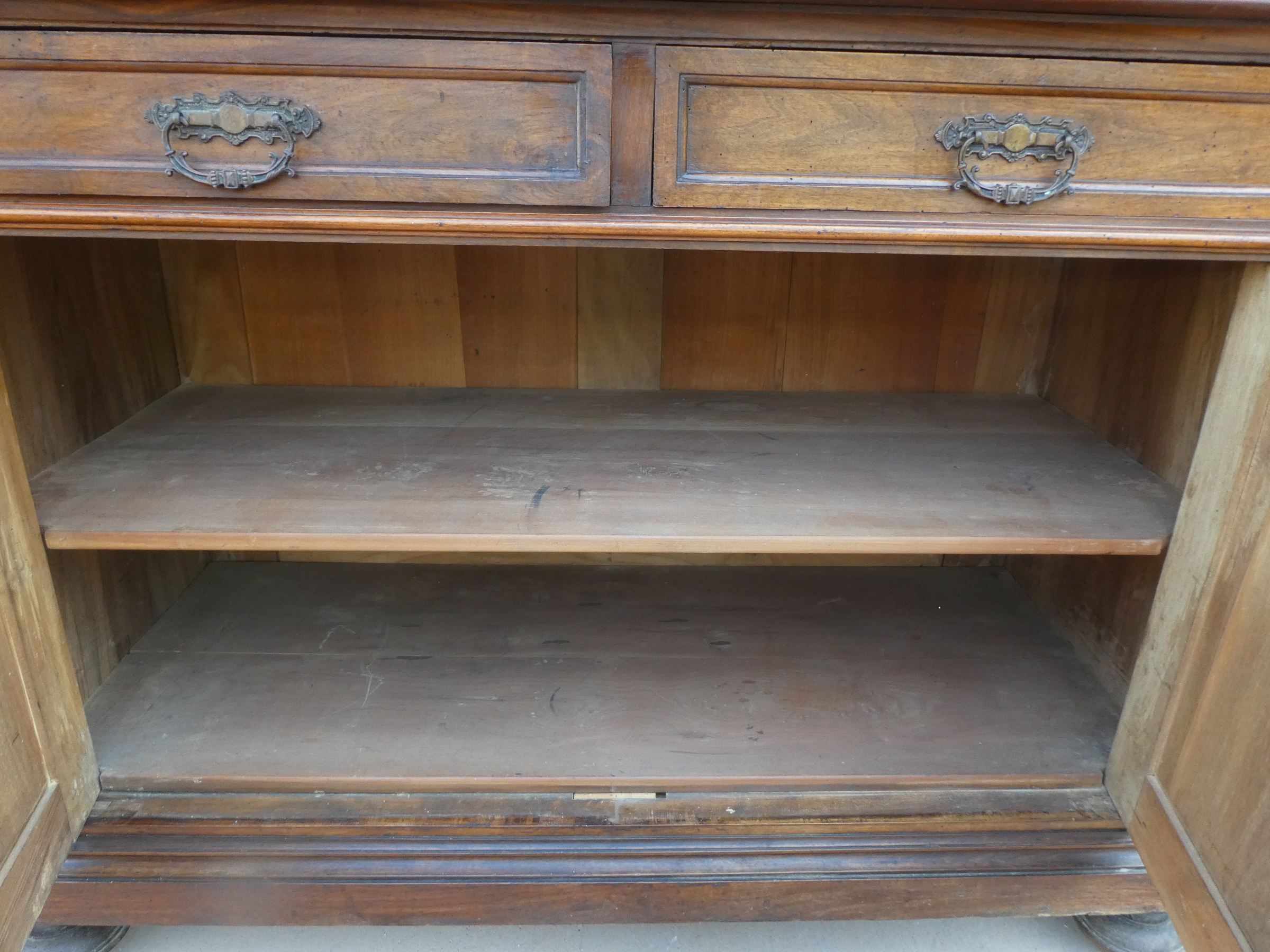 Credenza buffet doppio corpo con alzata (vetri mancanti) e doppio cassetto frontale, realizzata in noce massello ed appartenente d’epoca alla fine dell’800. La semplicità della struttura, dove il senso della misura viene rigorosamente rispettato, è il risultato di una raffinata eleganza. La ricerca di un decoro essenziale, si rispecchia anche sulla scelta dei montanti, privi di elementi decorativi. Dispone di ripiani interni ed è divisibile in due corpi. Necessita di qualche intervento di restauro e sono presenti fori di tarlo.
