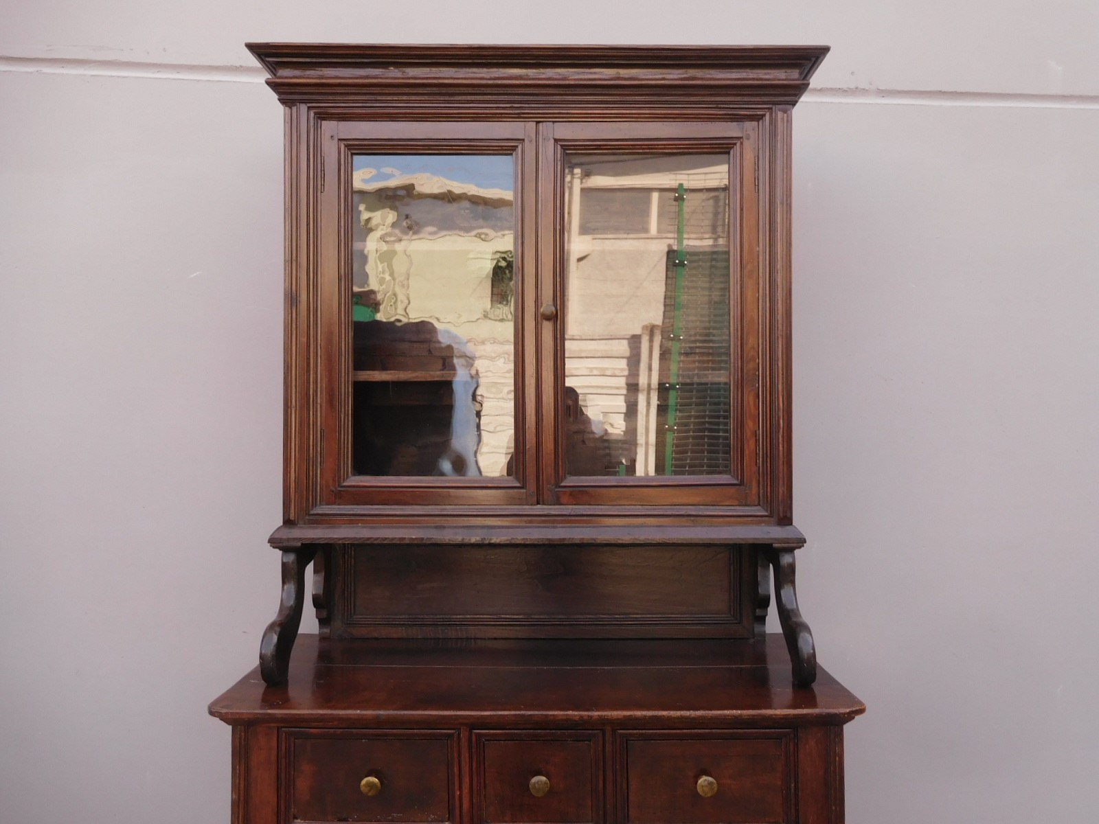 Credenza buffet doppio corpo con alzata a vetri e tre cassetti frontali, realizzata in legni misti, appartenente d’epoca alla fine dell’800. La semplicità della struttura, dove il senso della misura viene rigorosamente rispettato, è il risultato di una sobria eleganza. La ricerca di un decoro essenziale si rispecchia anche sulla scelta dei montanti, privi di elementi decorativi. Dispone di ripiani interni. Divisibile in due corpi (base + alzata). Necessita di alcuni interventi di restauro e sono presenti fori di tarlo.