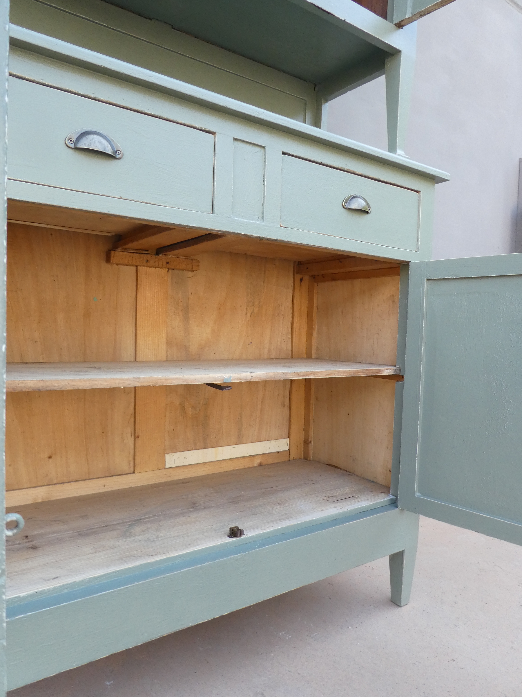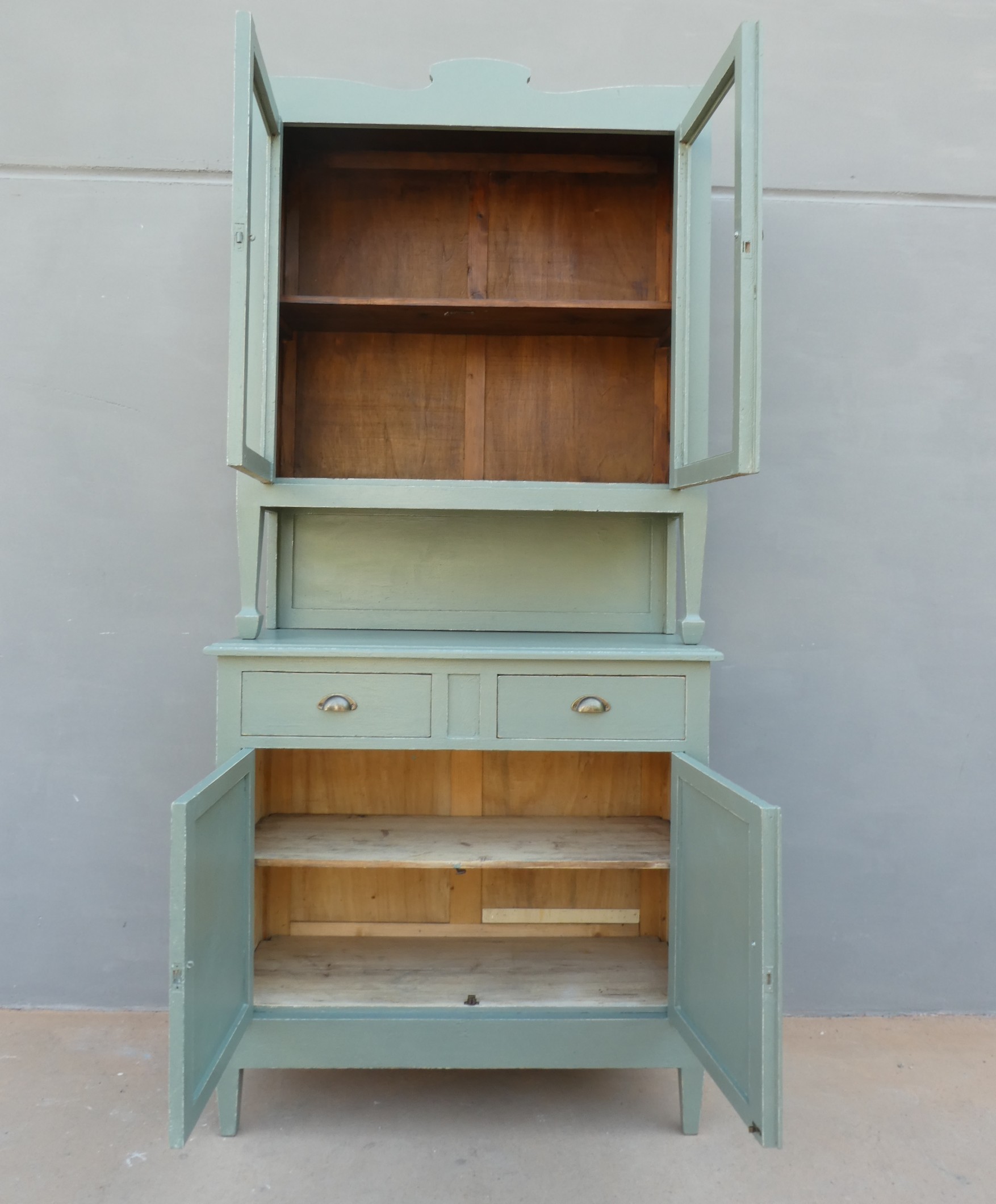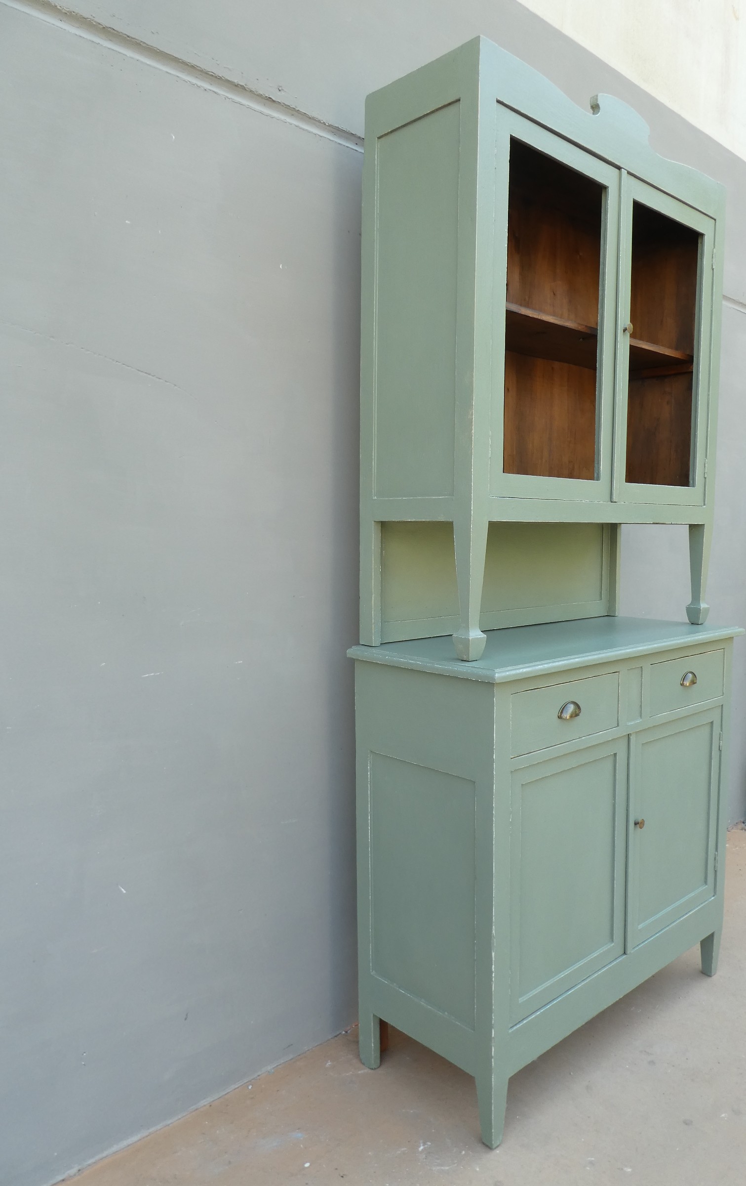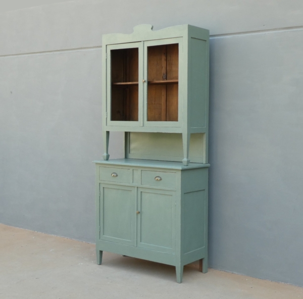 Credenza doppia buffet con alzata laccata e rifinita con la tecnica “Shabby Chic” che prevede l’uso di colori chiari in superficie e colori più scuri che affiorano dopo il trattamento d’usura. La semplice e lineare struttura conferisce una sobria eleganza. La ricerca di un decoro essenziale si riflette anche sui montanti, privi di elementi decorativi. Divisibile in due corpi. Mancano i vetri ed i pannelli sono in compensato. Epoca metà ‘900.