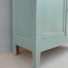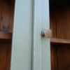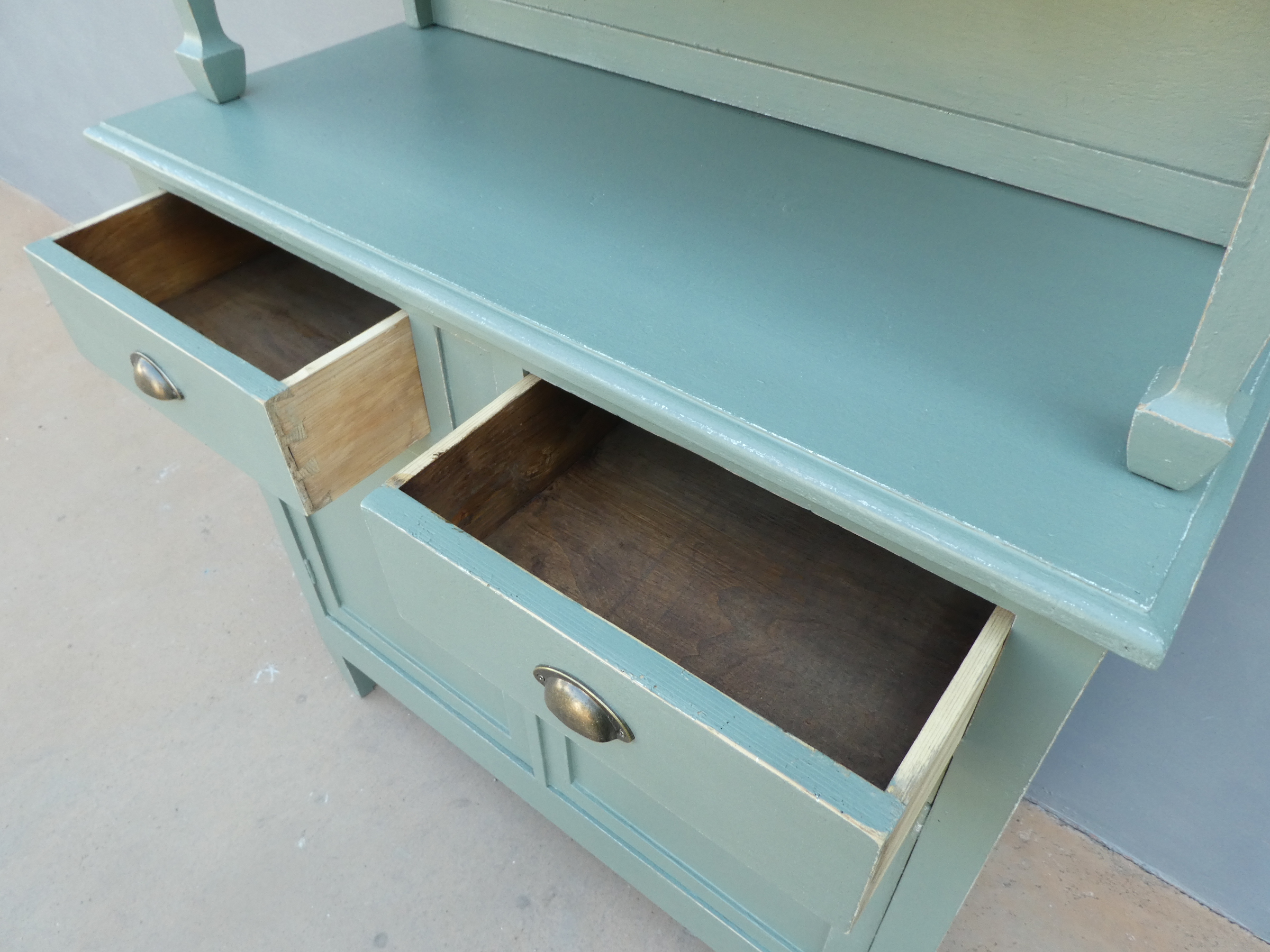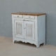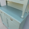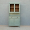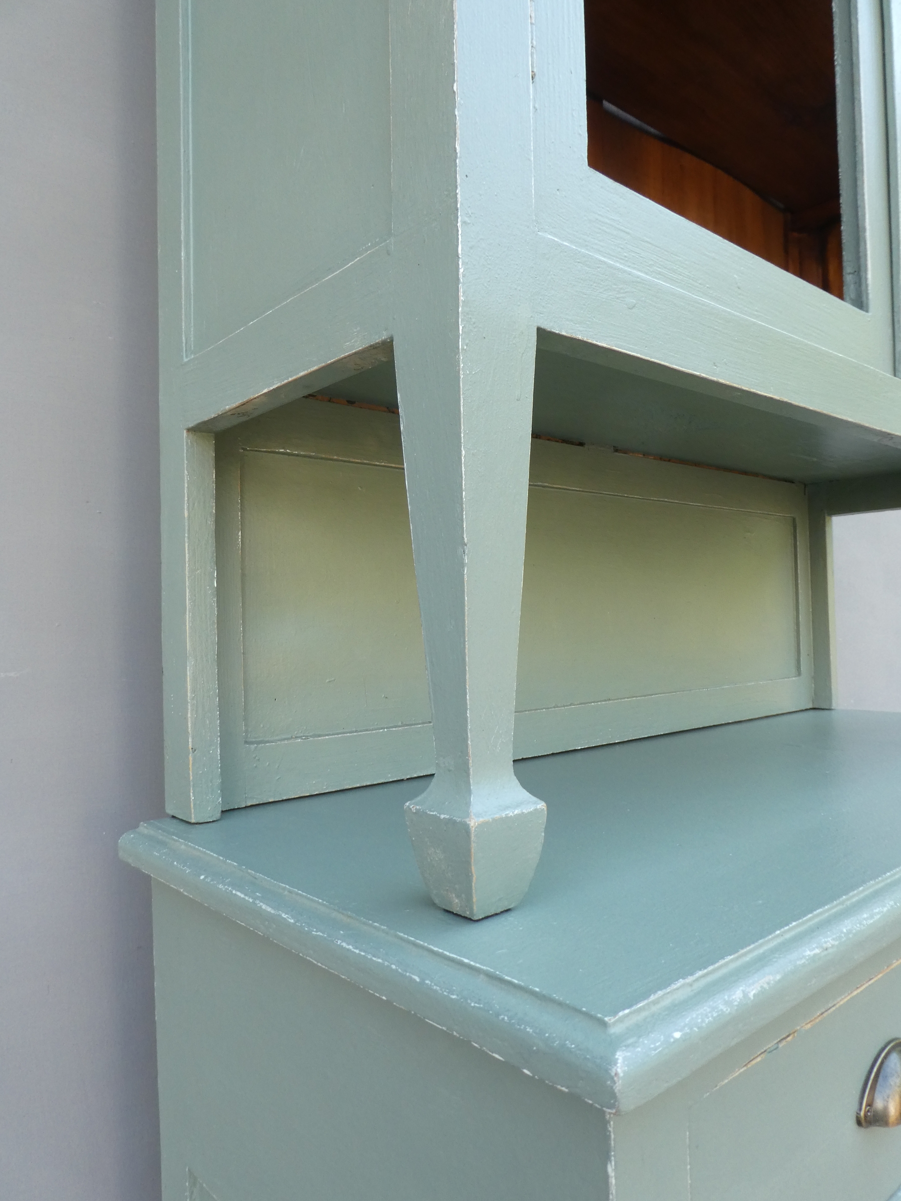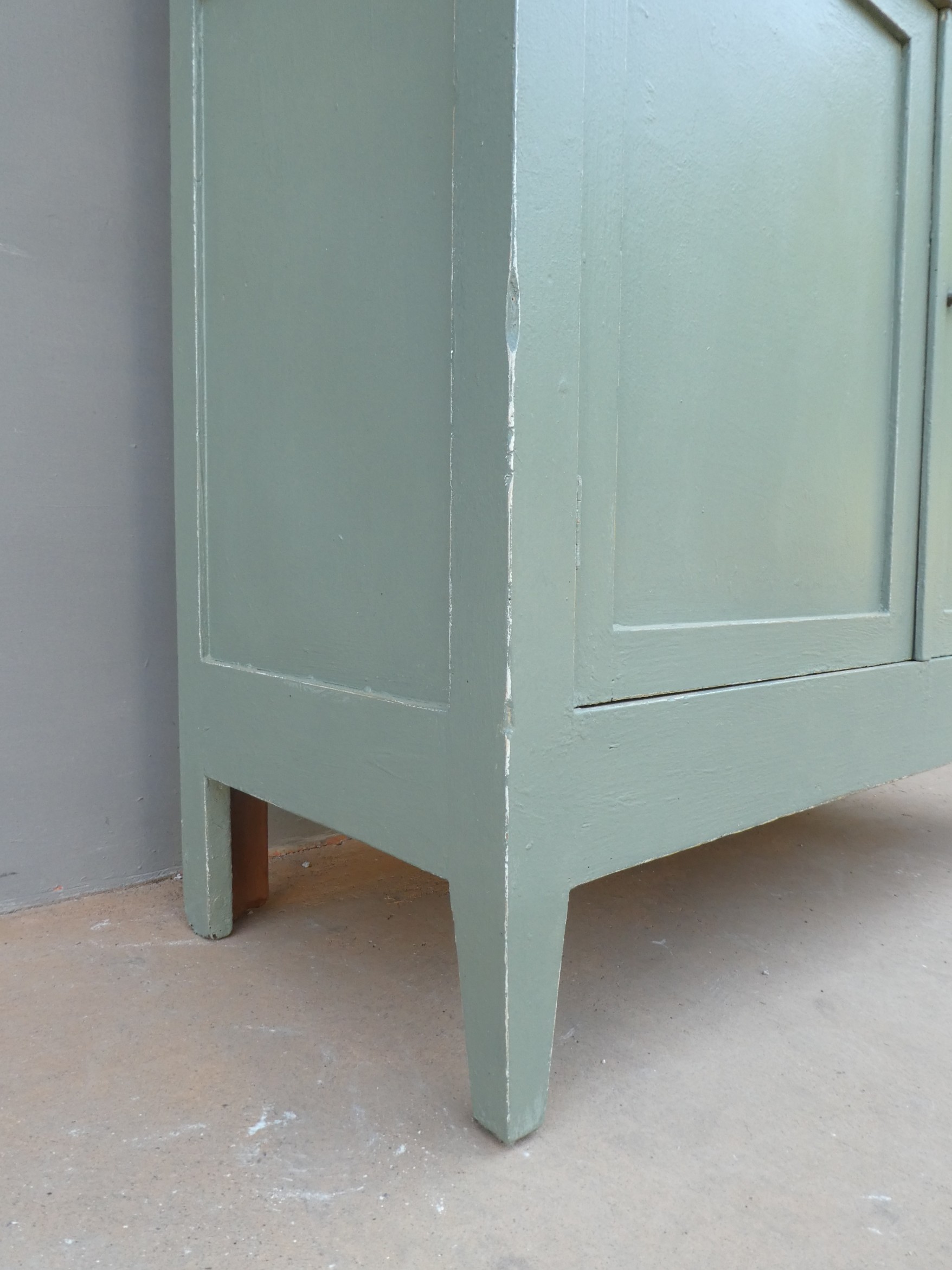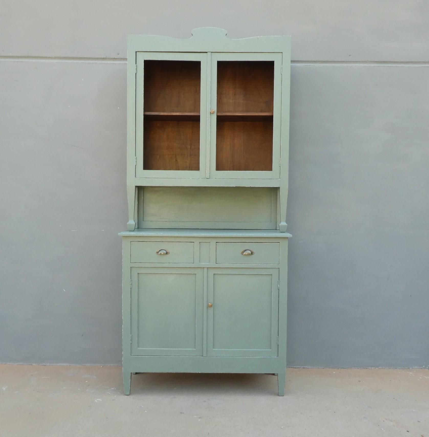 Credenza doppia buffet con alzata laccata e rifinita con la tecnica “Shabby Chic” che prevede l’uso di colori chiari in superficie e colori più scuri che affiorano dopo il trattamento d’usura. La semplice e lineare struttura conferisce una sobria eleganza. La ricerca di un decoro essenziale si riflette anche sui montanti, privi di elementi decorativi. Divisibile in due corpi. Mancano i vetri ed i pannelli sono in compensato. Epoca metà ‘900.