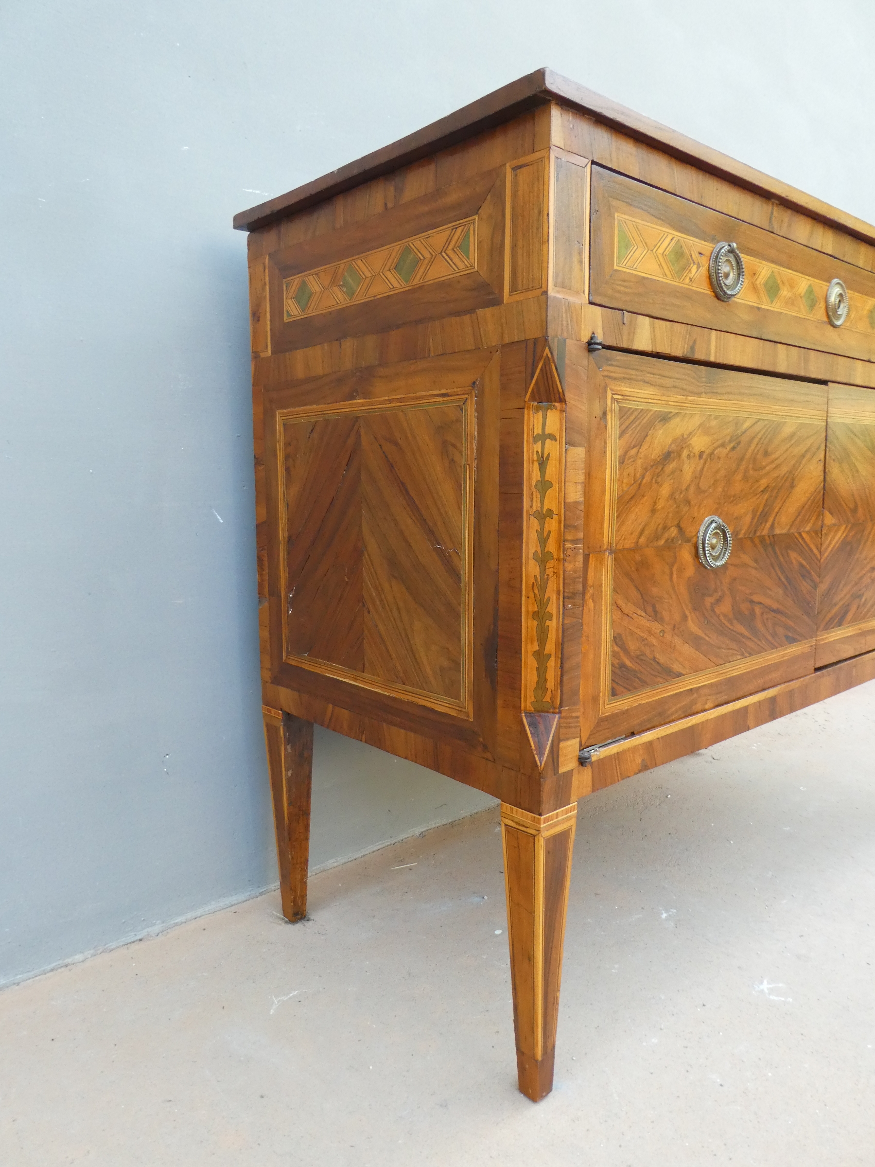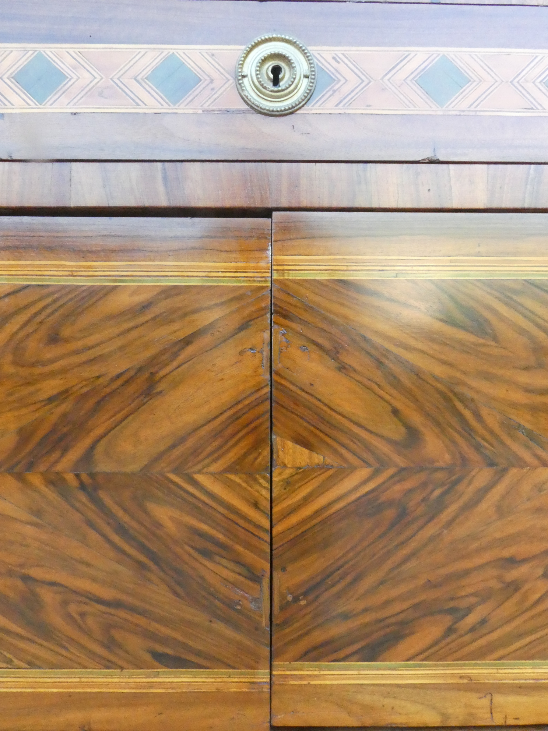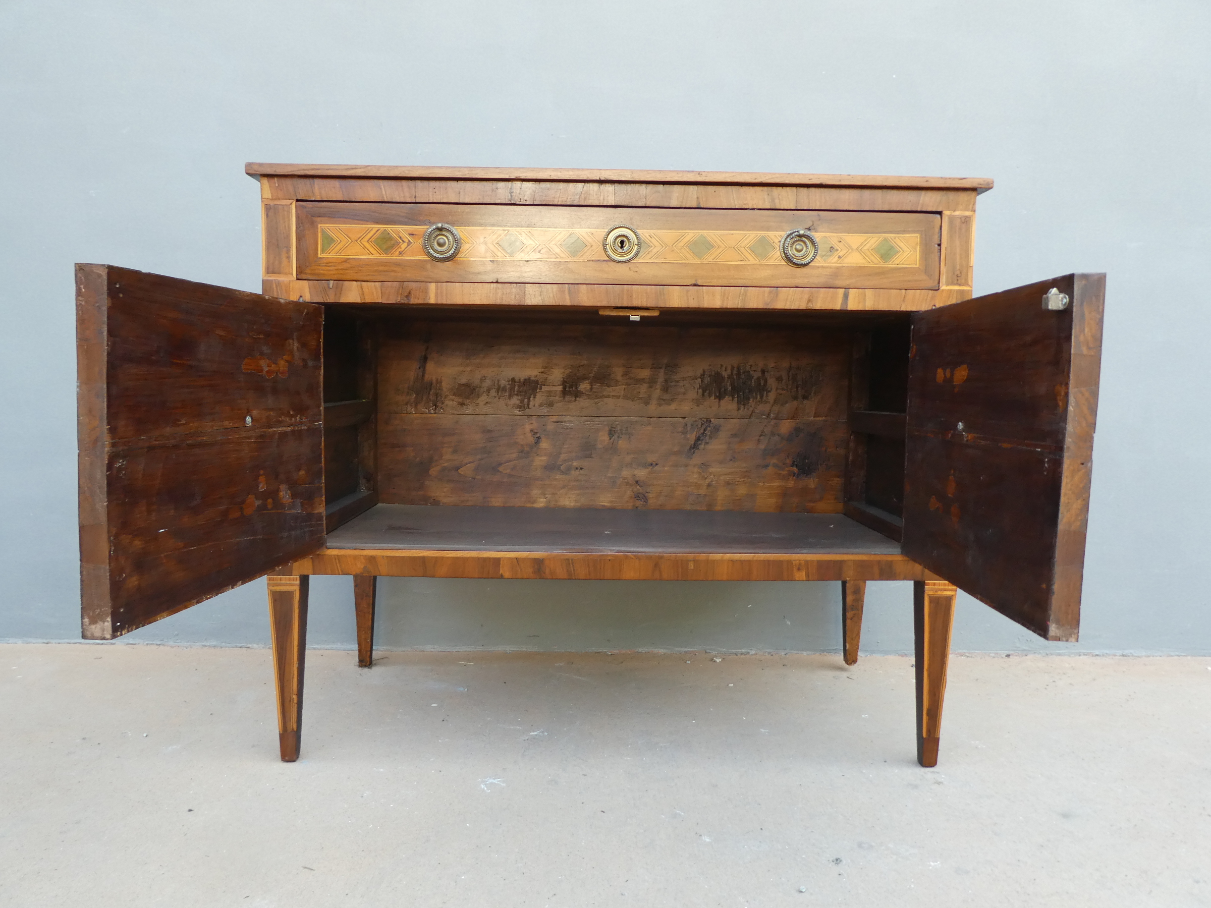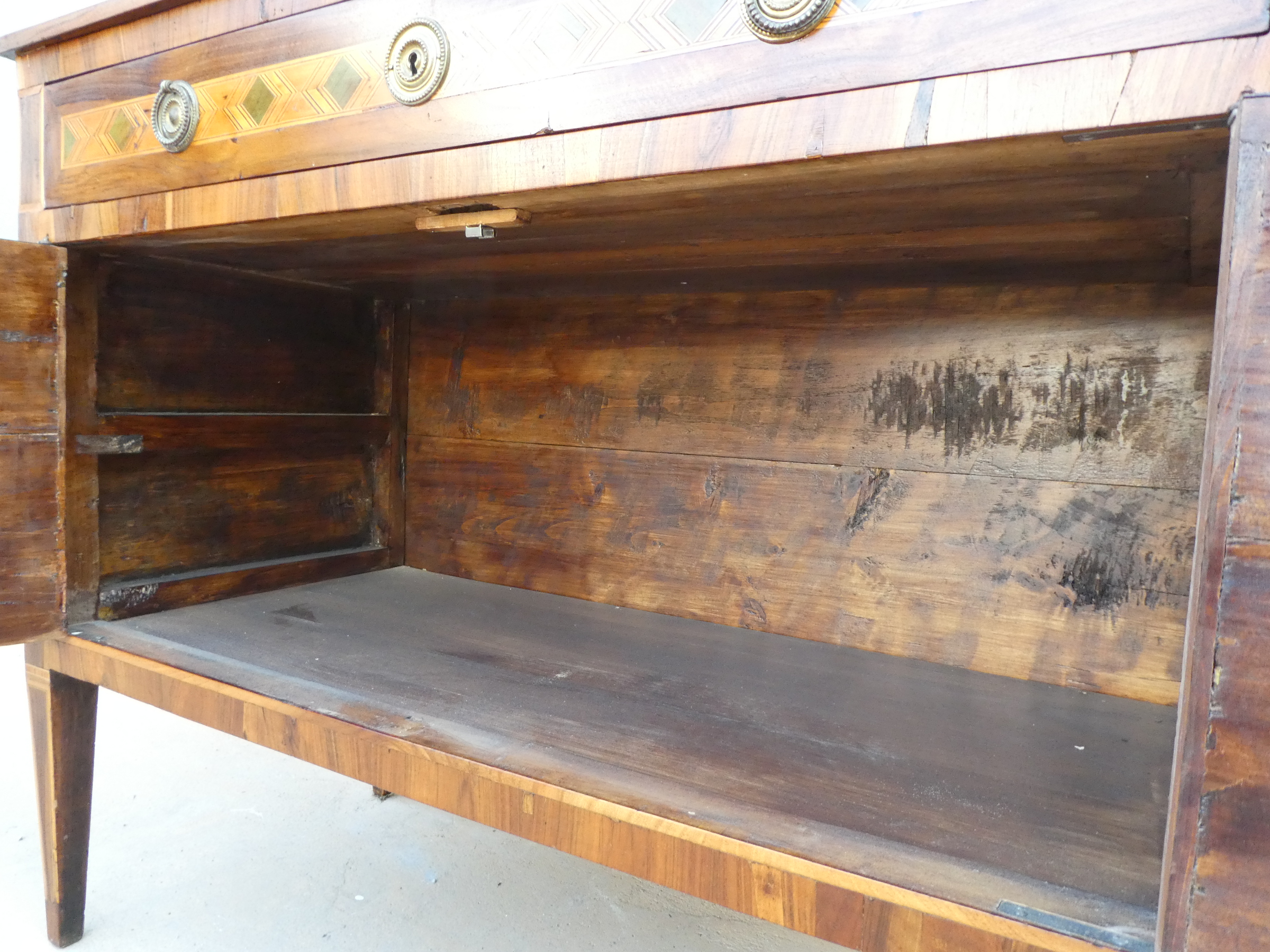 Credenza mobile st.Luigi XVI corredato da due ante ed un cassetto frontale. La struttura si presenta semplice e lineare, e vanta proporzioni armoniose e sapientemente equilibrate. Il mobile ottiene il suo effetto decorativo grazie ai minuziosi intarsi/filetti, che spiccano contrastanti sulla raffinata superficie lastronata in noce che fa da sfondo. Necessita di alcuni interventi di restauro (foto) – la struttura ha subito modifiche nel tempo. Epoca ‘800.