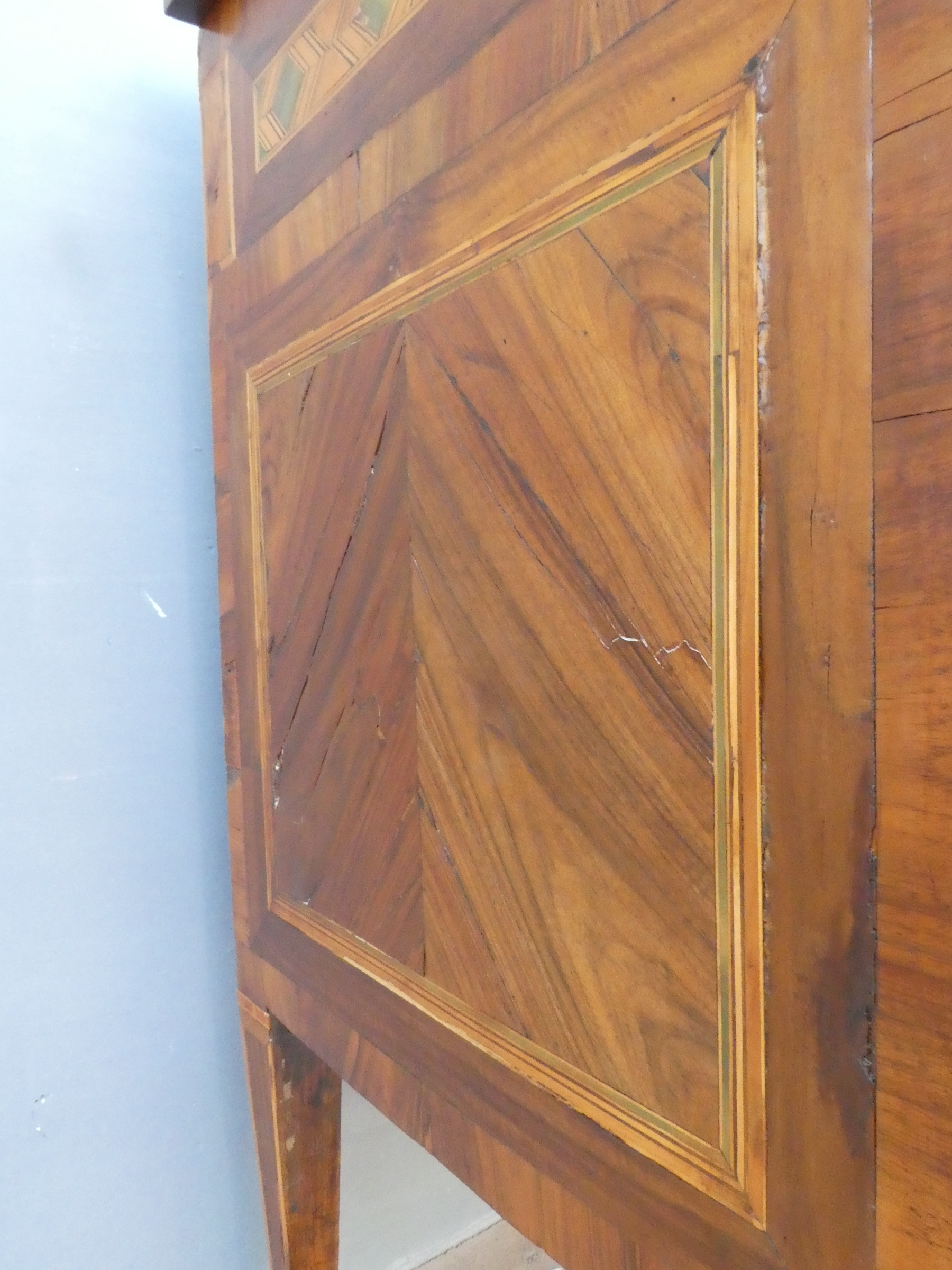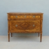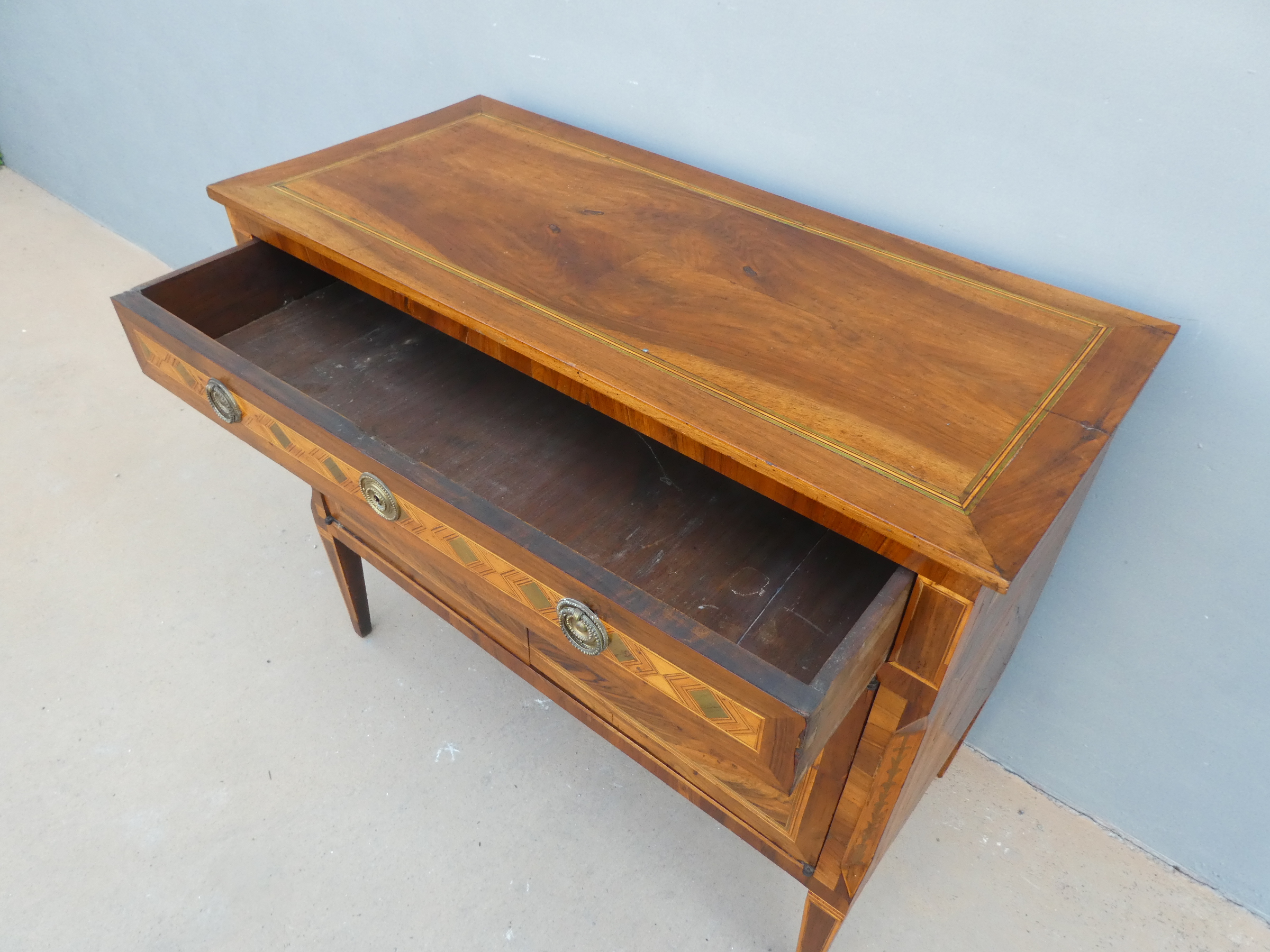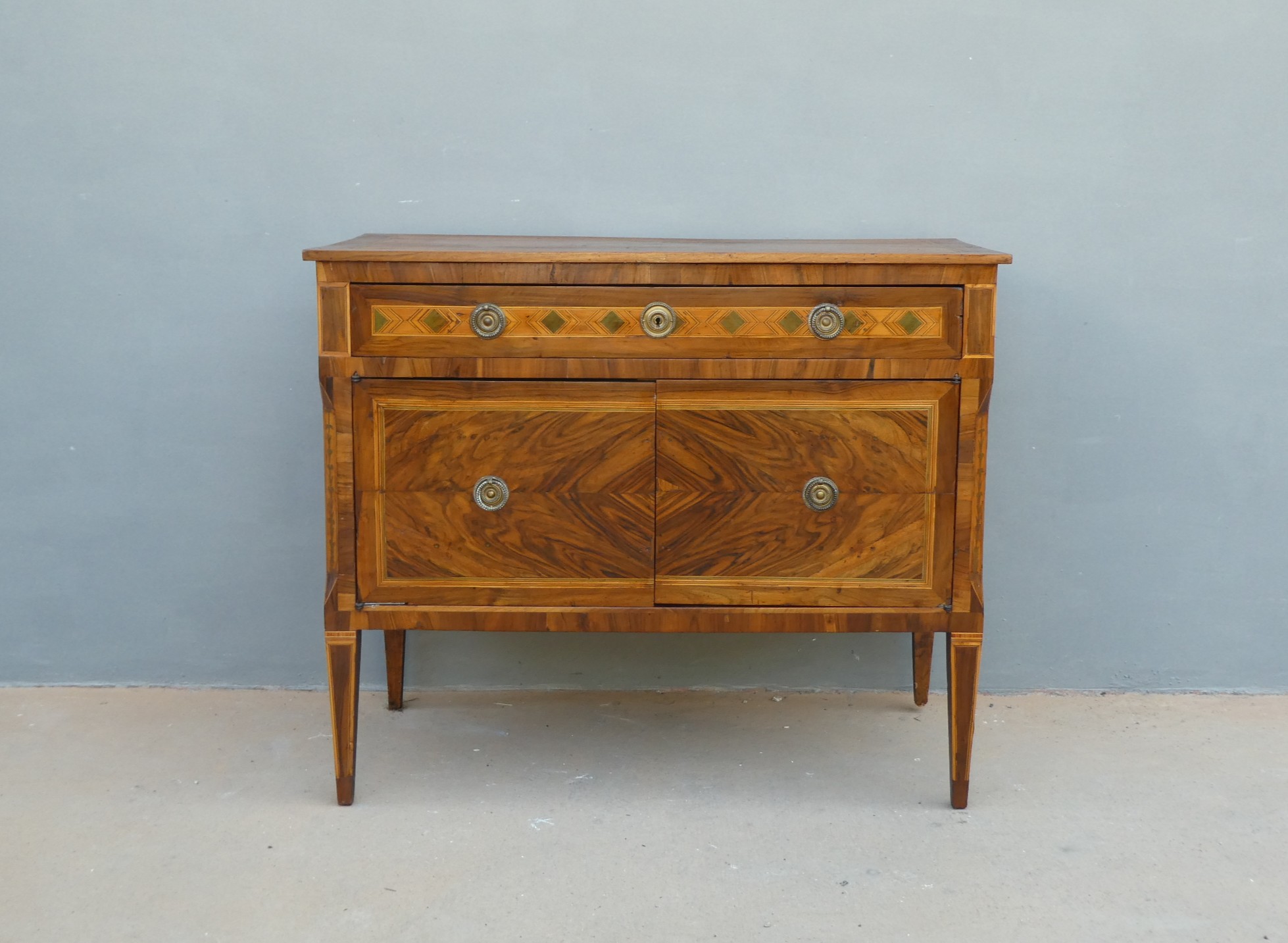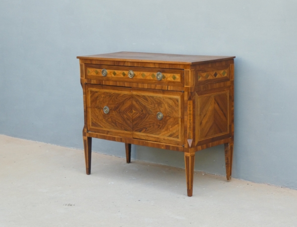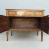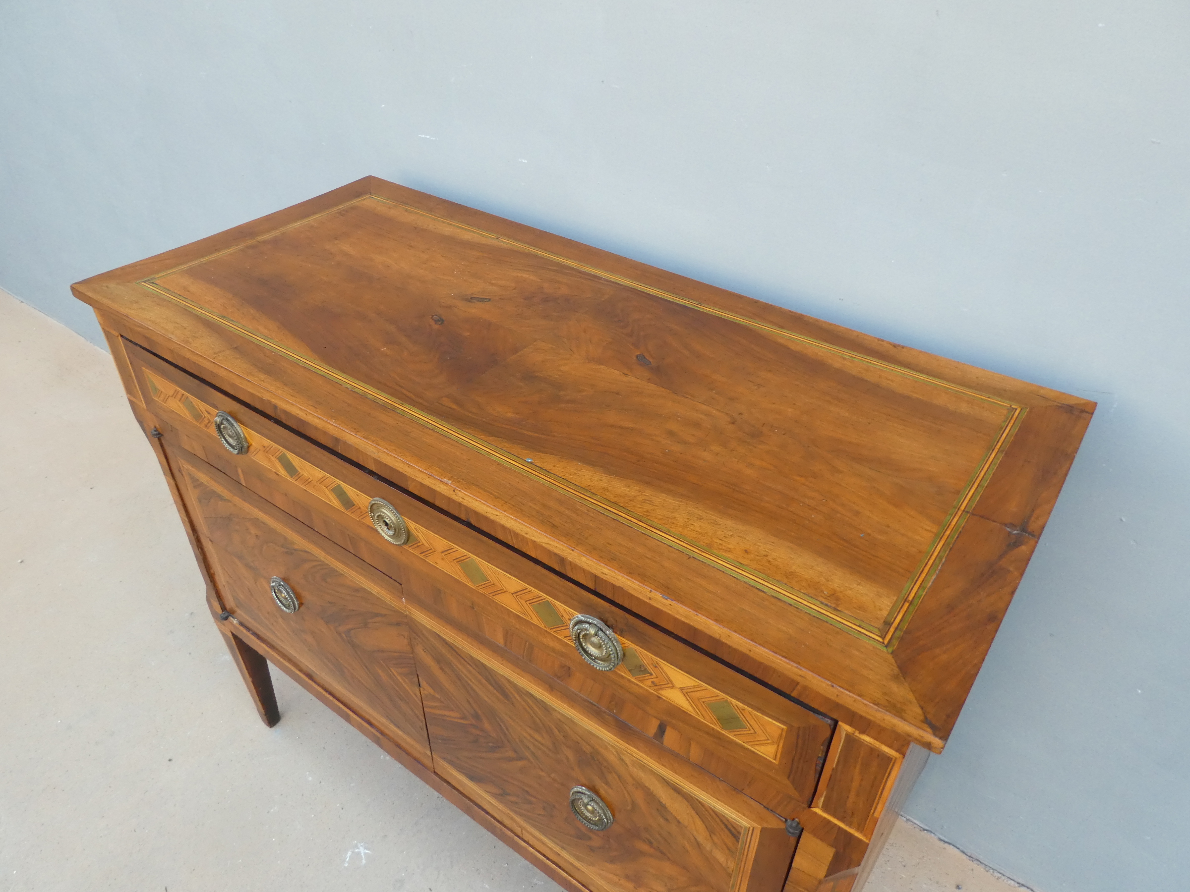 Credenza mobile st.Luigi XVI corredato da due ante ed un cassetto frontale. La struttura si presenta semplice e lineare, e vanta proporzioni armoniose e sapientemente equilibrate. Il mobile ottiene il suo effetto decorativo grazie ai minuziosi intarsi/filetti, che spiccano contrastanti sulla raffinata superficie lastronata in noce che fa da sfondo. Necessita di alcuni interventi di restauro (foto) – la struttura ha subito modifiche nel tempo. Epoca ‘800.