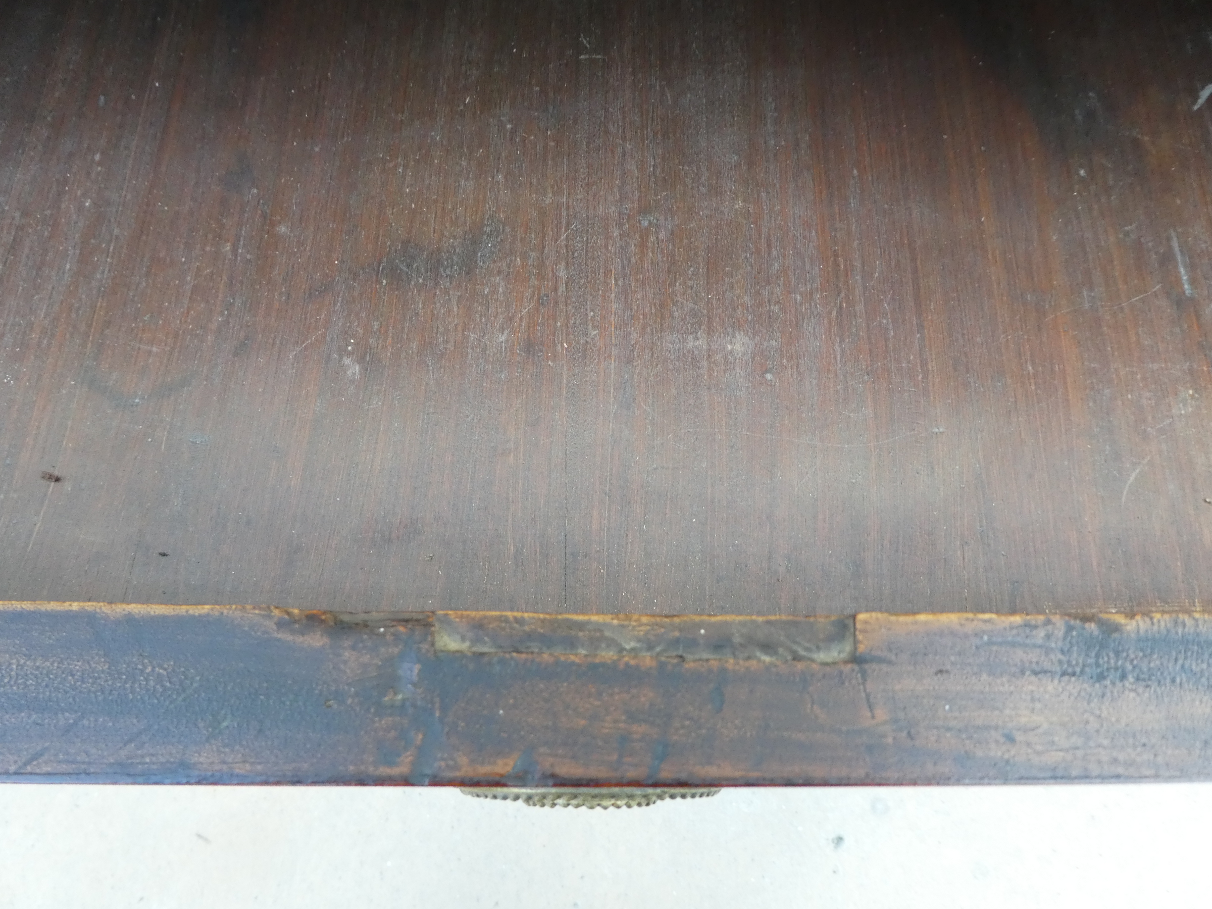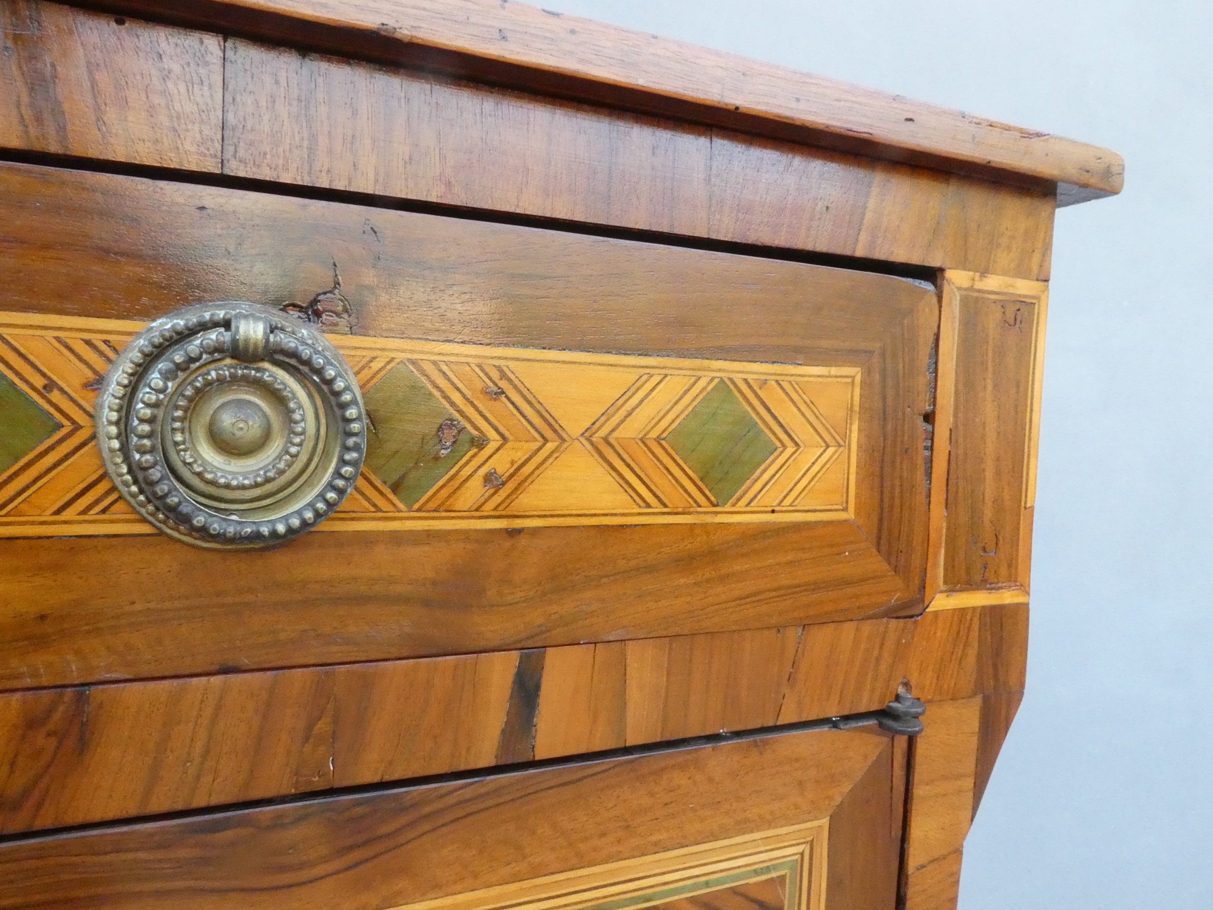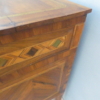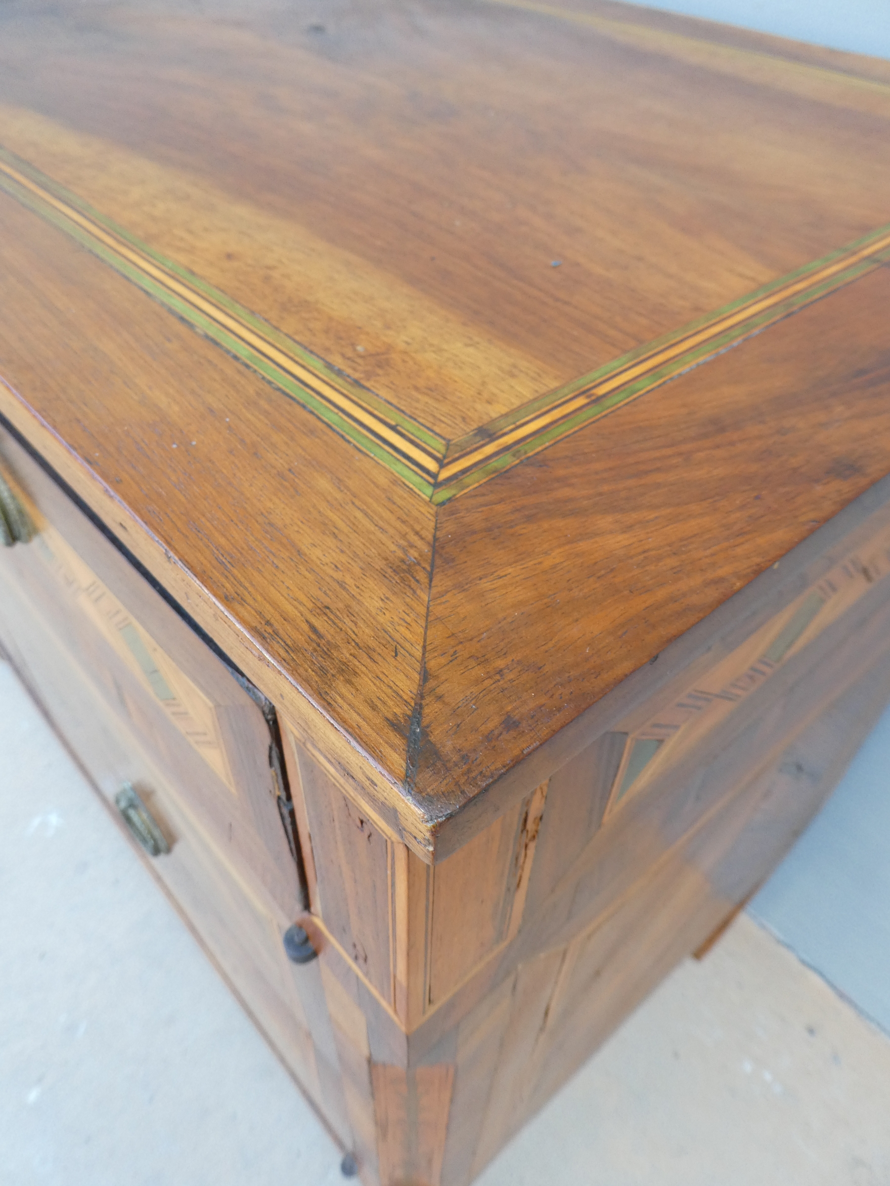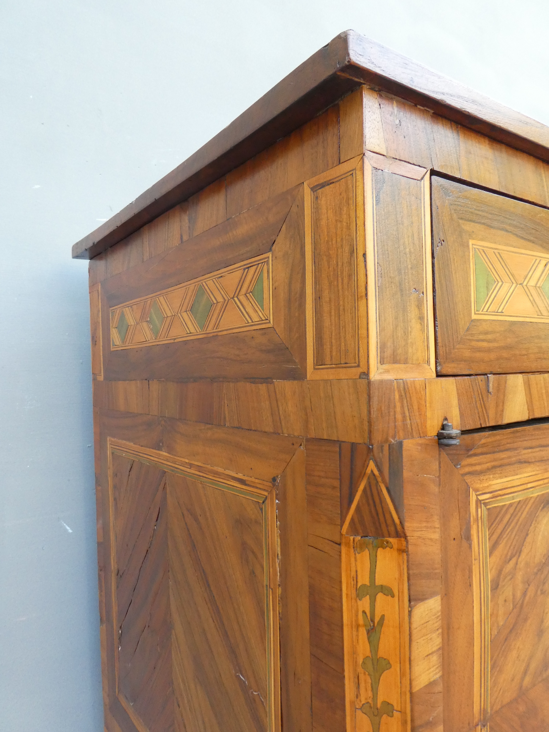 Credenza mobile st.Luigi XVI corredato da due ante ed un cassetto frontale. La struttura si presenta semplice e lineare, e vanta proporzioni armoniose e sapientemente equilibrate. Il mobile ottiene il suo effetto decorativo grazie ai minuziosi intarsi/filetti, che spiccano contrastanti sulla raffinata superficie lastronata in noce che fa da sfondo. Necessita di alcuni interventi di restauro (foto) – la struttura ha subito modifiche nel tempo. Epoca ‘800.