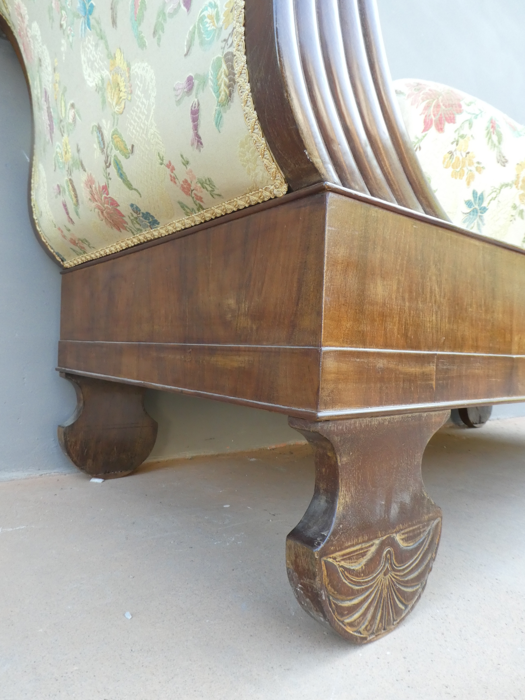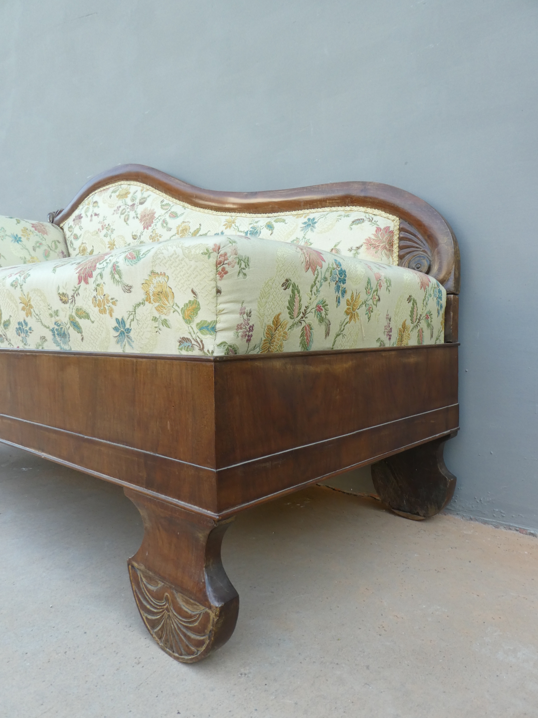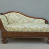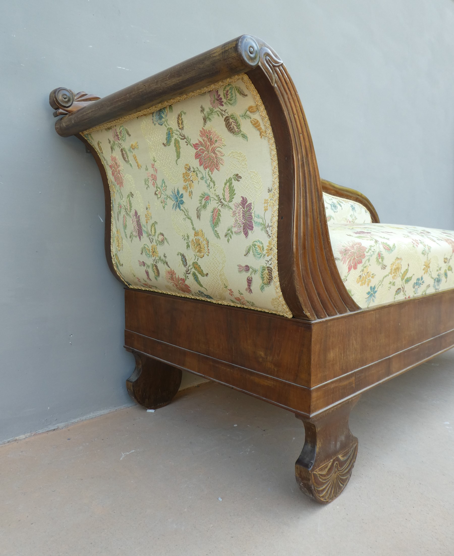 Divano dormeuse chaise longue “letto da giorno” realizzata in mogano e rivestita interamente in tessuto. La particolarità sta nella sua stessa struttura: dotata di un unico appoggio rialzato per la testa, contraddistinta da una sinuosa struttura ed impreziosita con delicati intagli, caratteristici dello stile. Necessita di qualche intervento di restauro, sono presenti piccoli fori di tarlo (principalmente sul retro). Epoca fine ‘800.