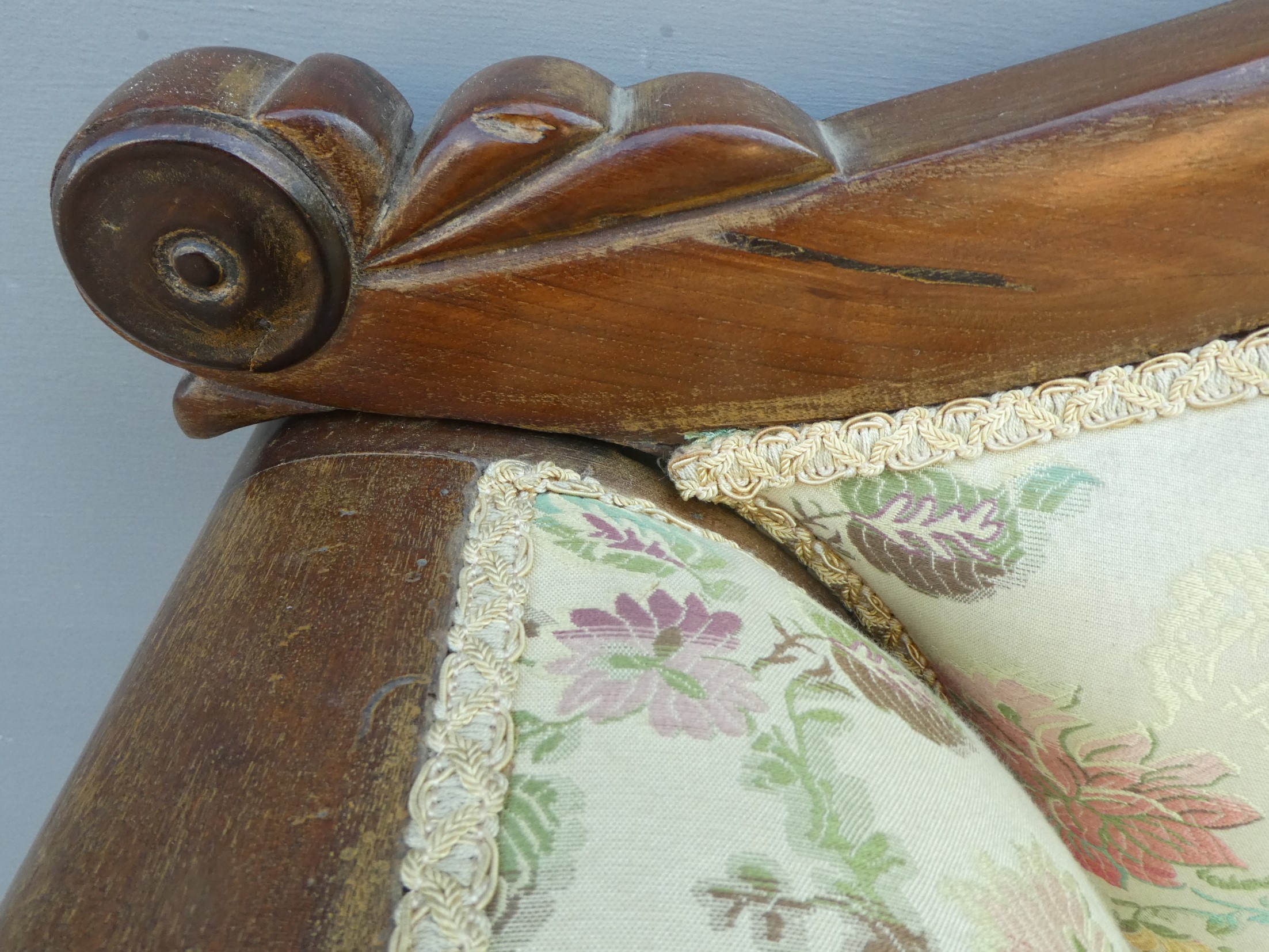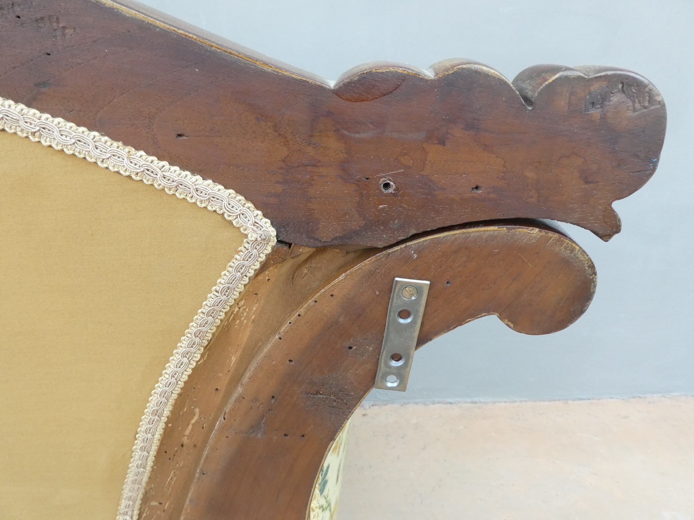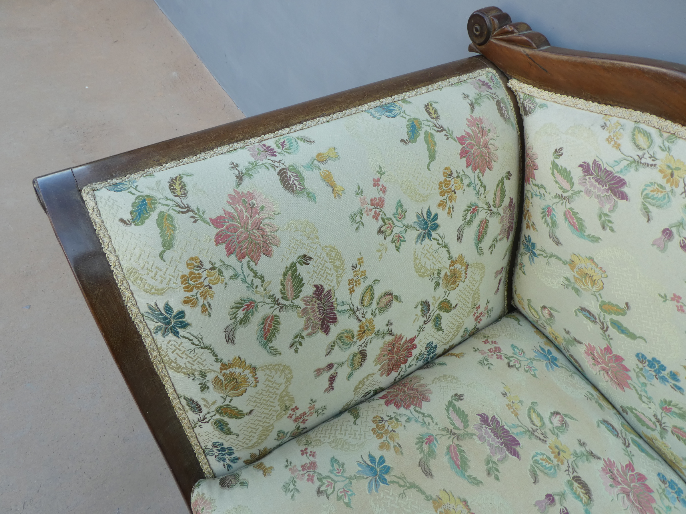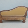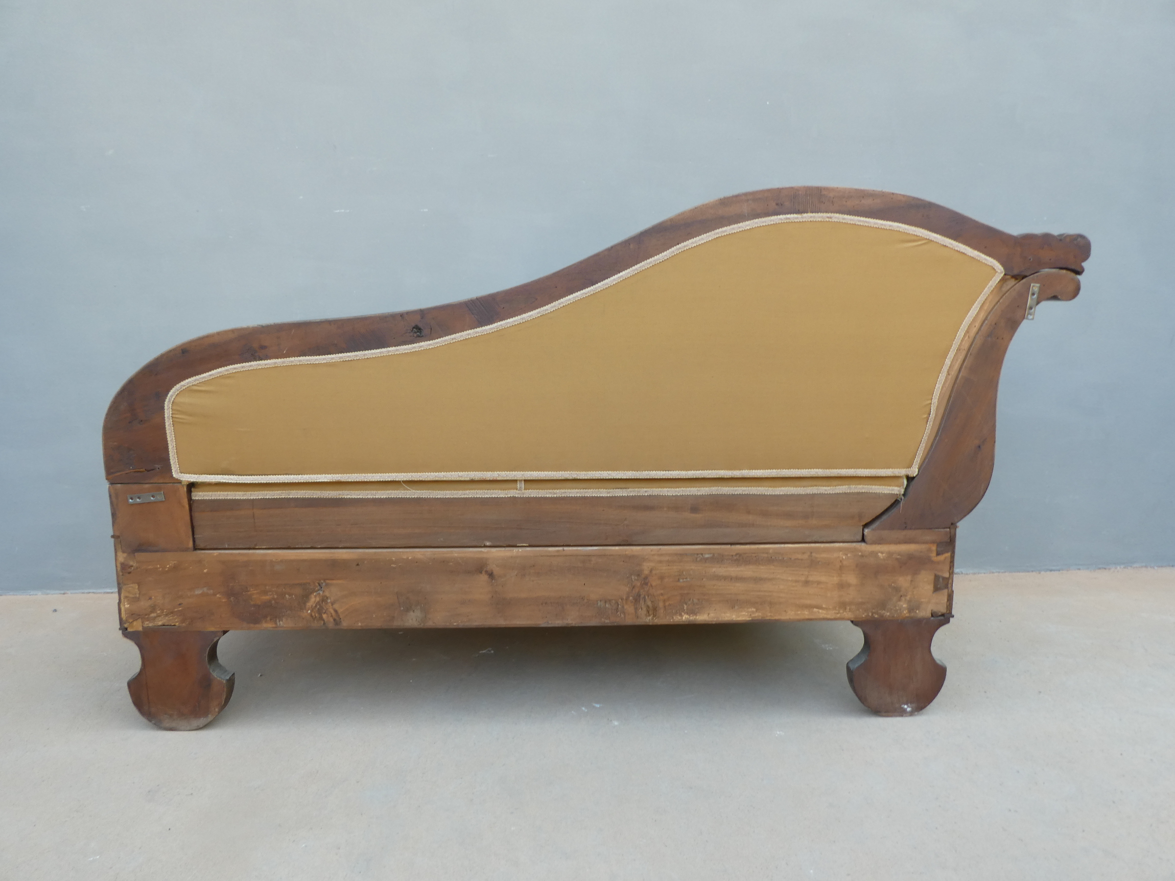 Divano dormeuse chaise longue “letto da giorno” realizzata in mogano e rivestita interamente in tessuto. La particolarità sta nella sua stessa struttura: dotata di un unico appoggio rialzato per la testa, contraddistinta da una sinuosa struttura ed impreziosita con delicati intagli, caratteristici dello stile. Necessita di qualche intervento di restauro, sono presenti piccoli fori di tarlo (principalmente sul retro). Epoca fine ‘800.