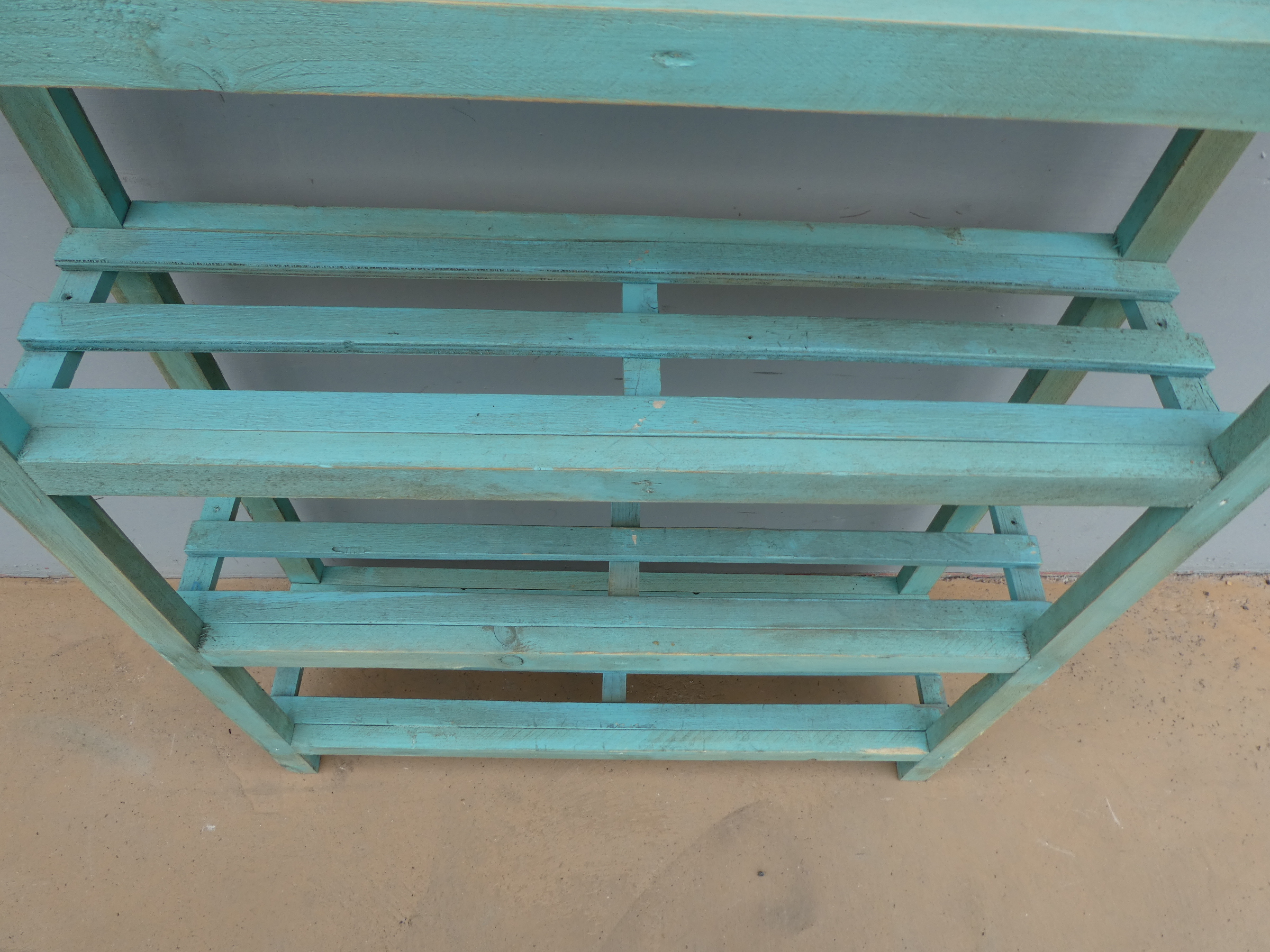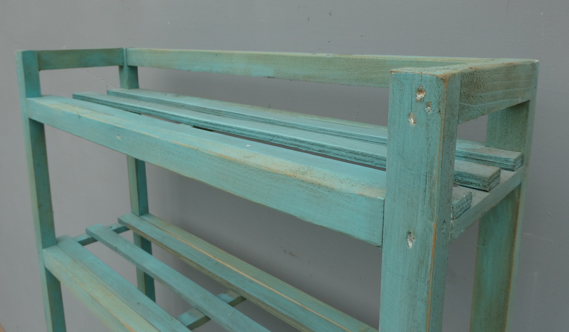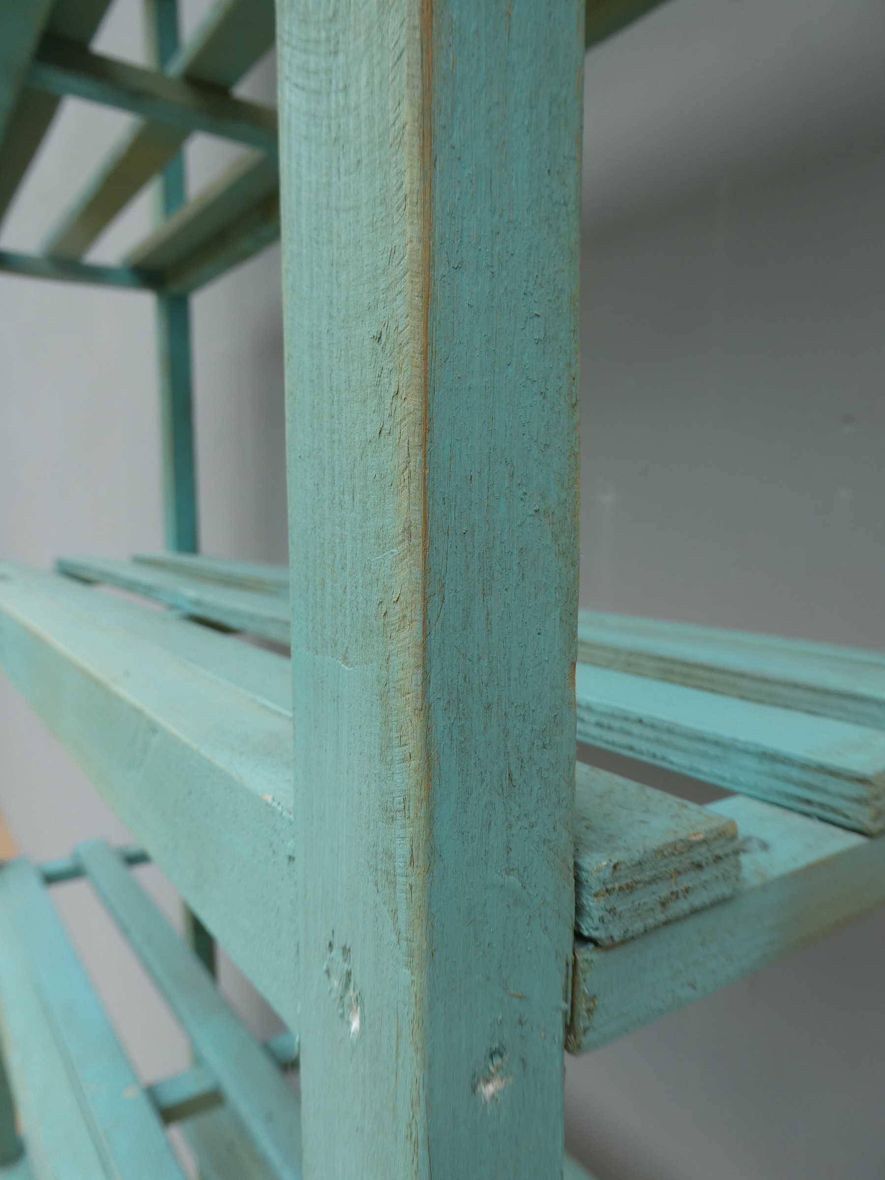 Etager scaffale libreria a ripiani fissi laccato e rifinito con la tecnica Shabby Chic che prevede l’uso di colori chiari e colori più scuri che affiorano dopo il trattamento d’usura. Questo genere di mobile è caratterizzato da geometricità e grande leggerezza. La struttura, infatti, sorretta da lineari montanti, e priva di decorazioni, si presenta semplice ed essenziale. Necessita di leggeri interventi di restauro, epoca seconda metà ‘900 (costruzione artigianale – i listelli non sono in legno massello).