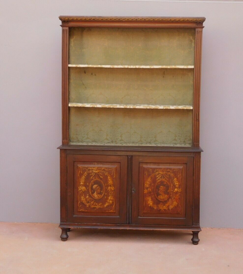 Libreria mobile con alzata a giorno e vetri laterali, particolari dimensioni, epoca fine ‘800. La struttura si presenta semplice e lineare, e vanta proporzioni sapientemente equilibrate. Ciò che la contraddistingue, oltre a creare un forte impatto decorativo, sono i delicati dipinti che risaltano contrastanti sulla scura superficie laccata che fa da sfondo. Necessita di alcuni interventi di restauro – le antine inferiori sono attualmente chiuse e non dispone di chiave.