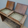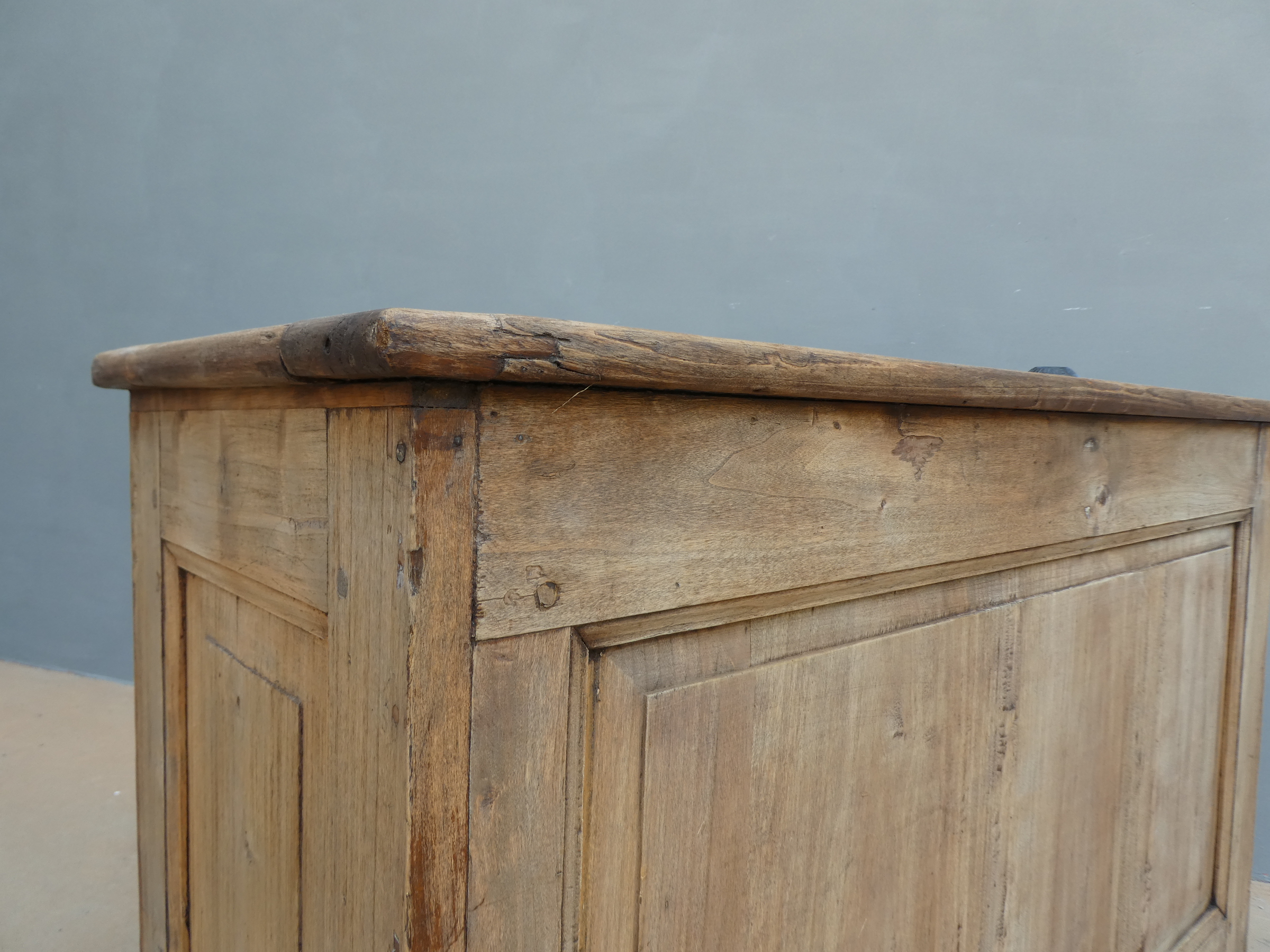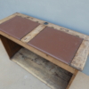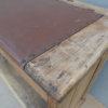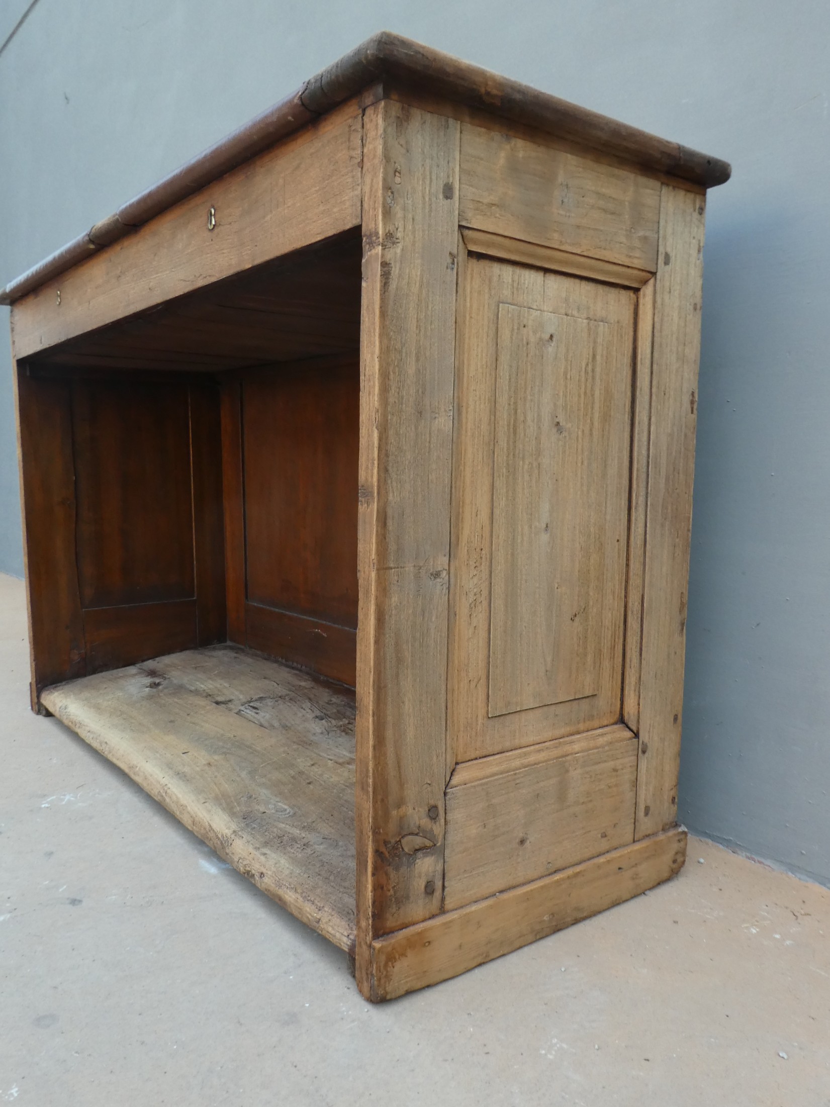 Tavolo bancone da lavoro realizzato in legno massello di pioppo e dotato di un piano d’appoggio corredato da due calatoie apribili e rivestite in pelle. Si presenta come un versatile ed originale elemento d’arredo, capace di dare un tocco di personalità all’ambiente. Necessita di alcuni elementi di restauro, epoca fine ‘800.