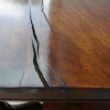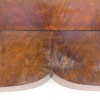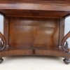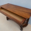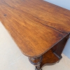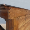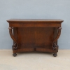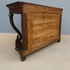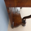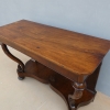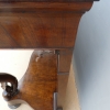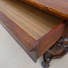 Console mobiletto Carlo X con piano d’appoggio in legno, dotato di un cassetto frontale a ‘scomparsa’ ed appartenente d’epoca alla metà dell’800. La struttura si presenta solida ed armoniosa, e vanta proporzioni sapientemente equilibrate. La ricerca di un decoro mirato si riflette anche sulla scelta d’impreziosire il corpo con delicati intagli, i quali si presentano unicamente sugli armonici montanti anteriori, caratteristici dello stile. Necessita di alcuni interventi di restauro (principalmente sul piano superiore e nel centro di quello inferiore – foto), e sono presenti alcuni fori di tarlo. Epoca metà ‘800.
