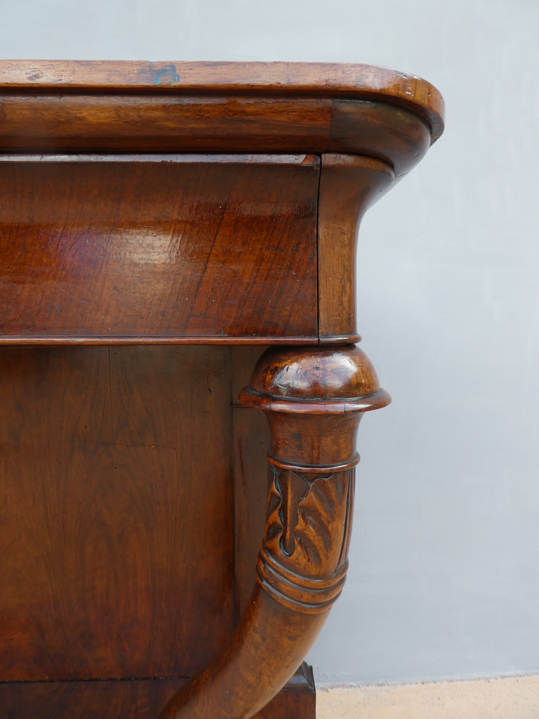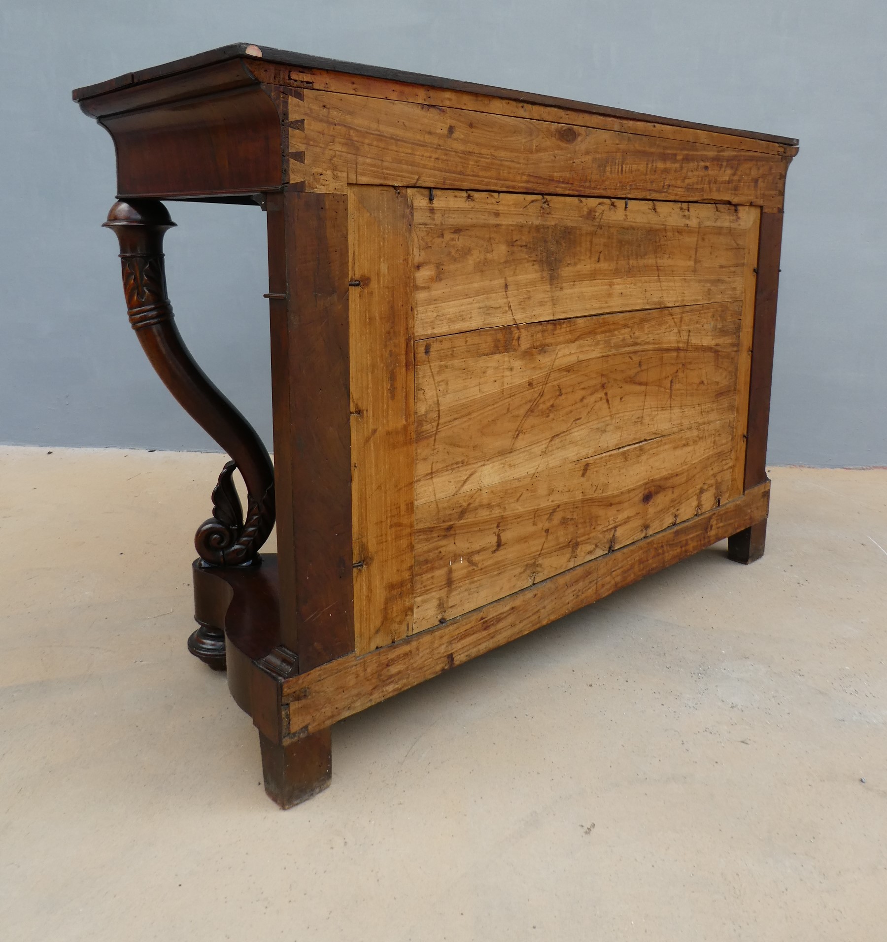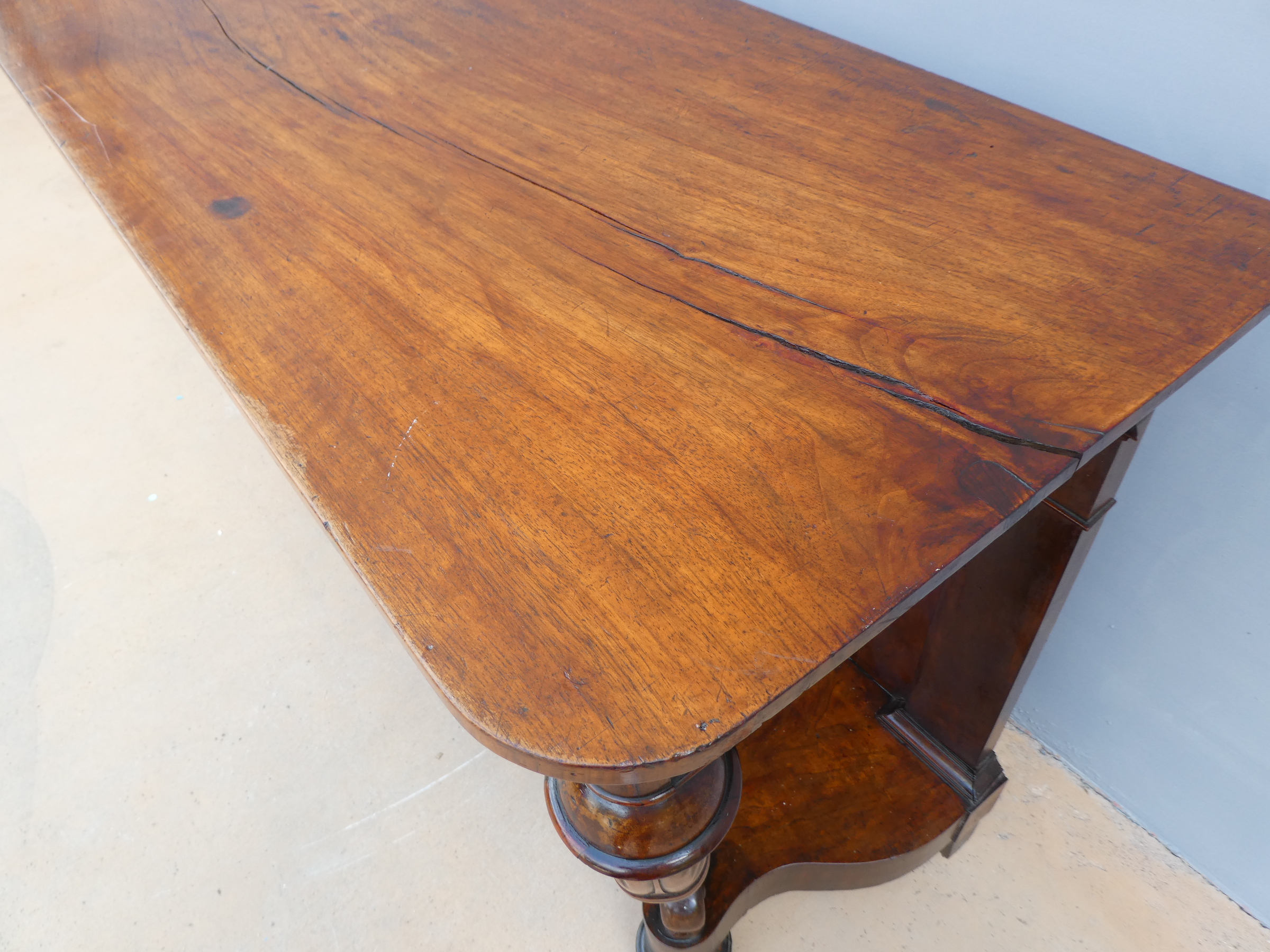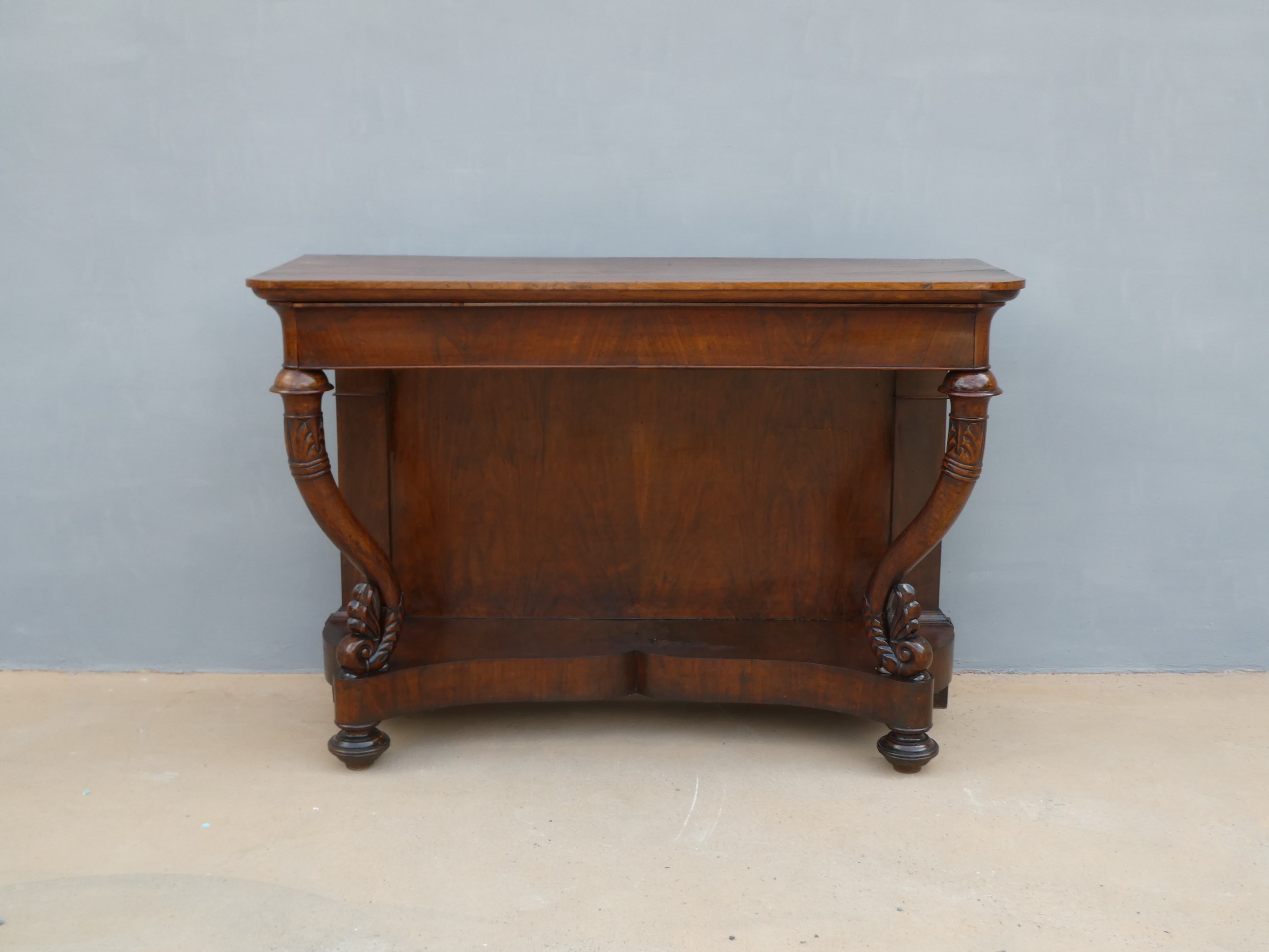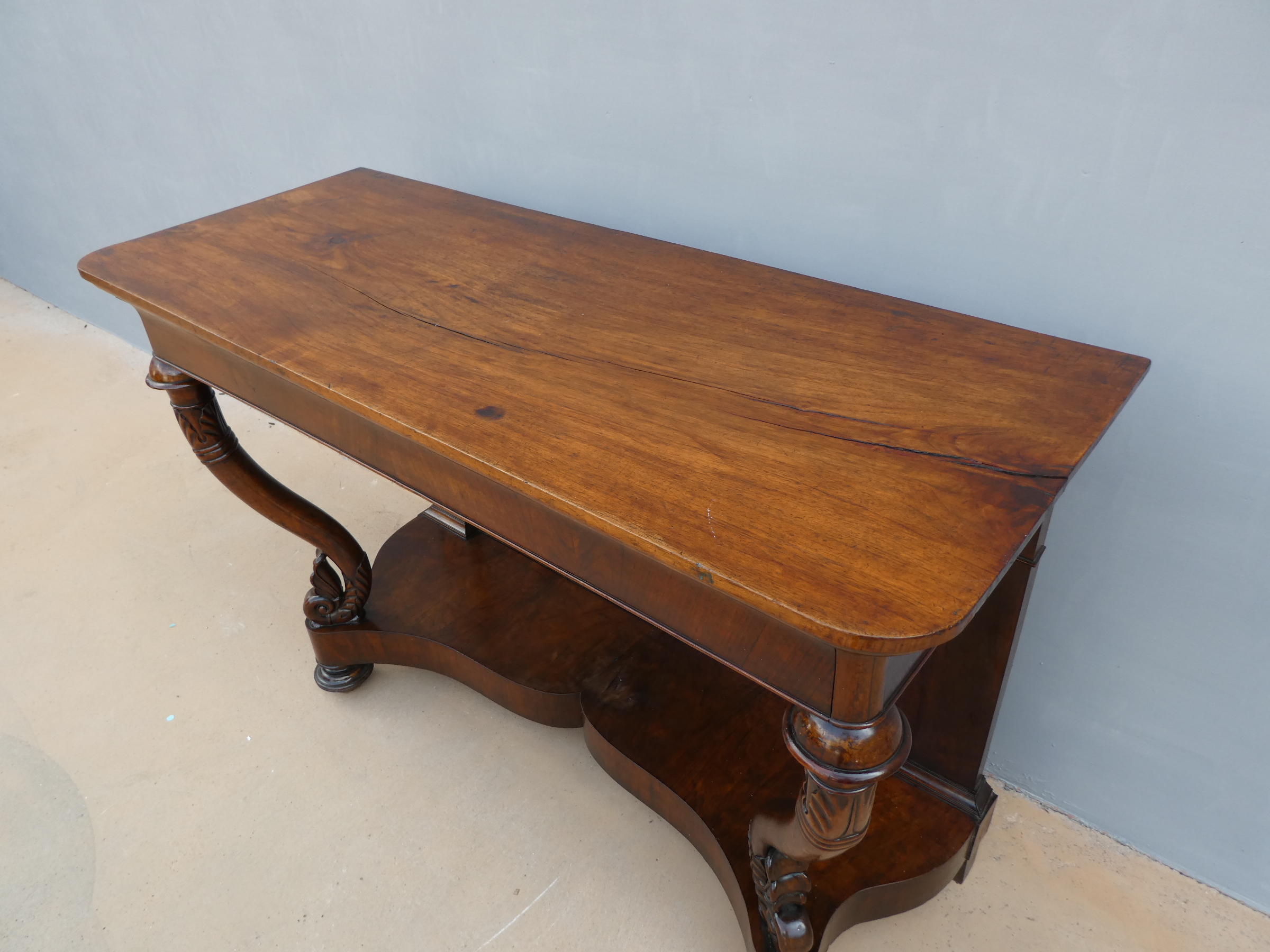 Console mobiletto Carlo X con piano d’appoggio in legno, dotato di un cassetto frontale a ‘scomparsa’ ed appartenente d’epoca alla metà dell’800. La struttura si presenta solida ed armoniosa, e vanta proporzioni sapientemente equilibrate. La ricerca di un decoro mirato si riflette anche sulla scelta d’impreziosire il corpo con delicati intagli, i quali si presentano unicamente sugli armonici montanti anteriori, caratteristici dello stile. Necessita di alcuni interventi di restauro (principalmente sul piano superiore e nel centro di quello inferiore – foto), e sono presenti alcuni fori di tarlo. Epoca metà ‘800.