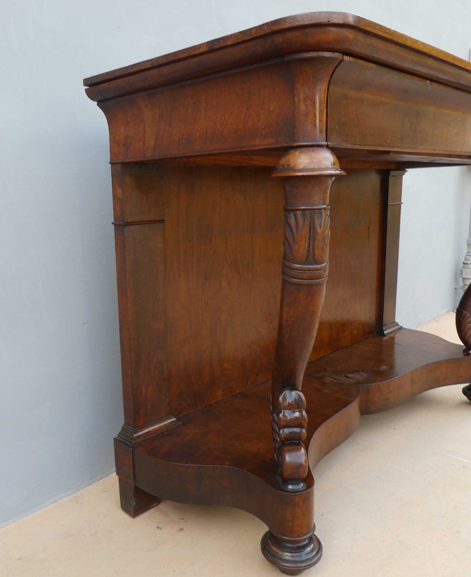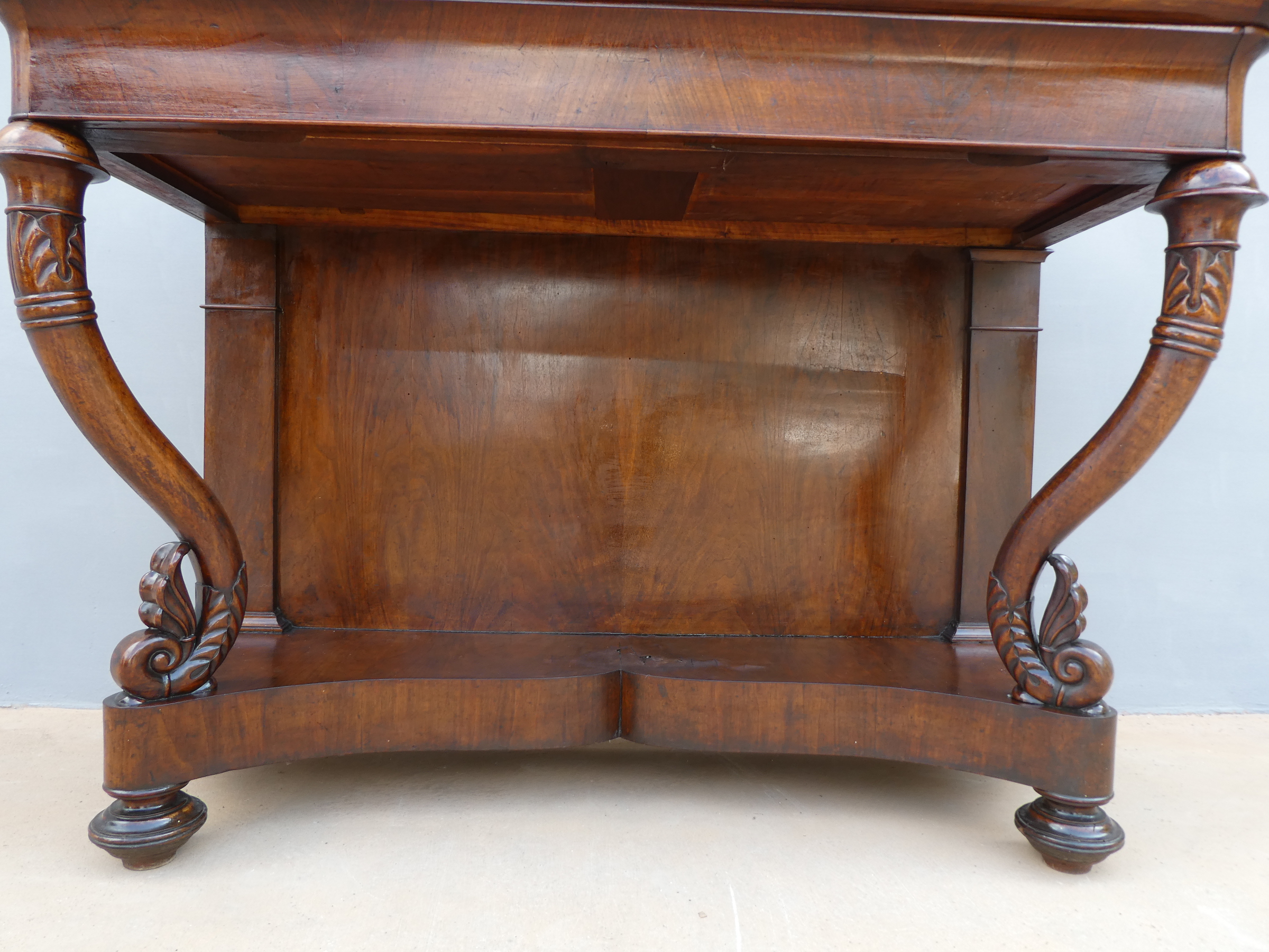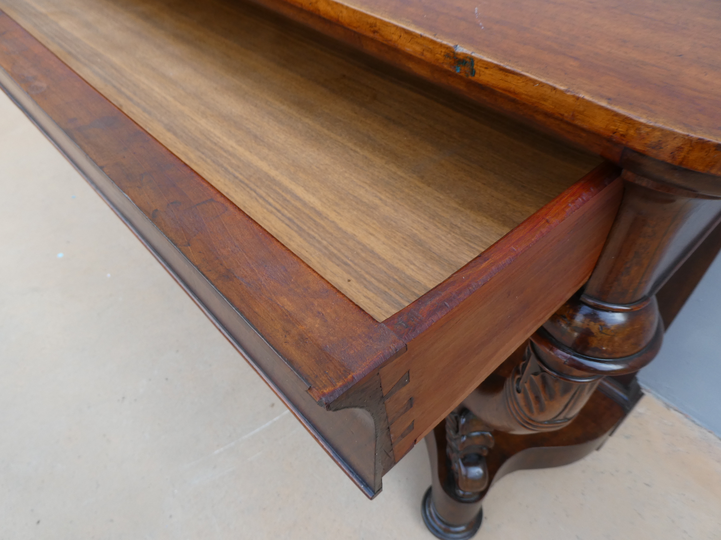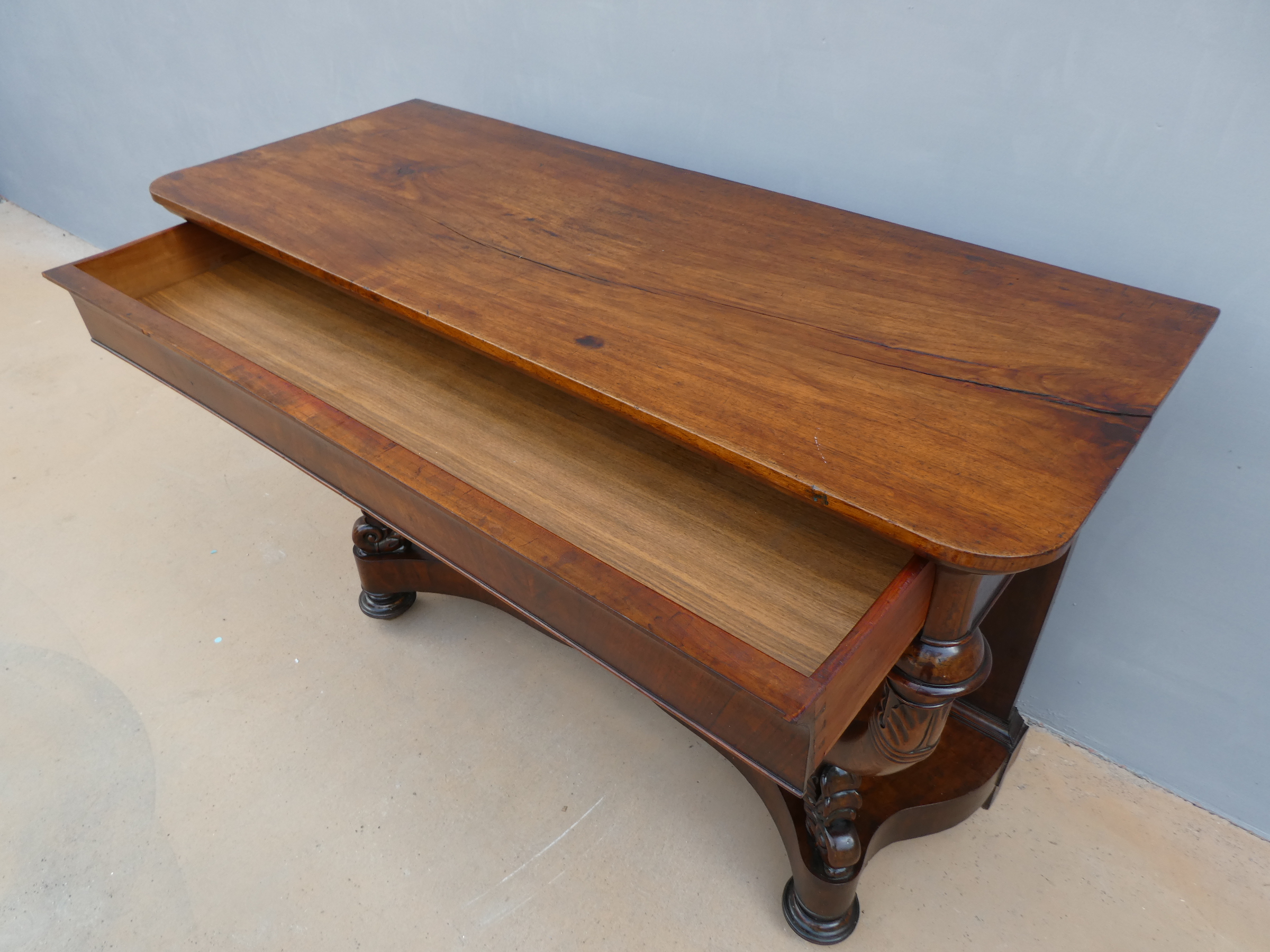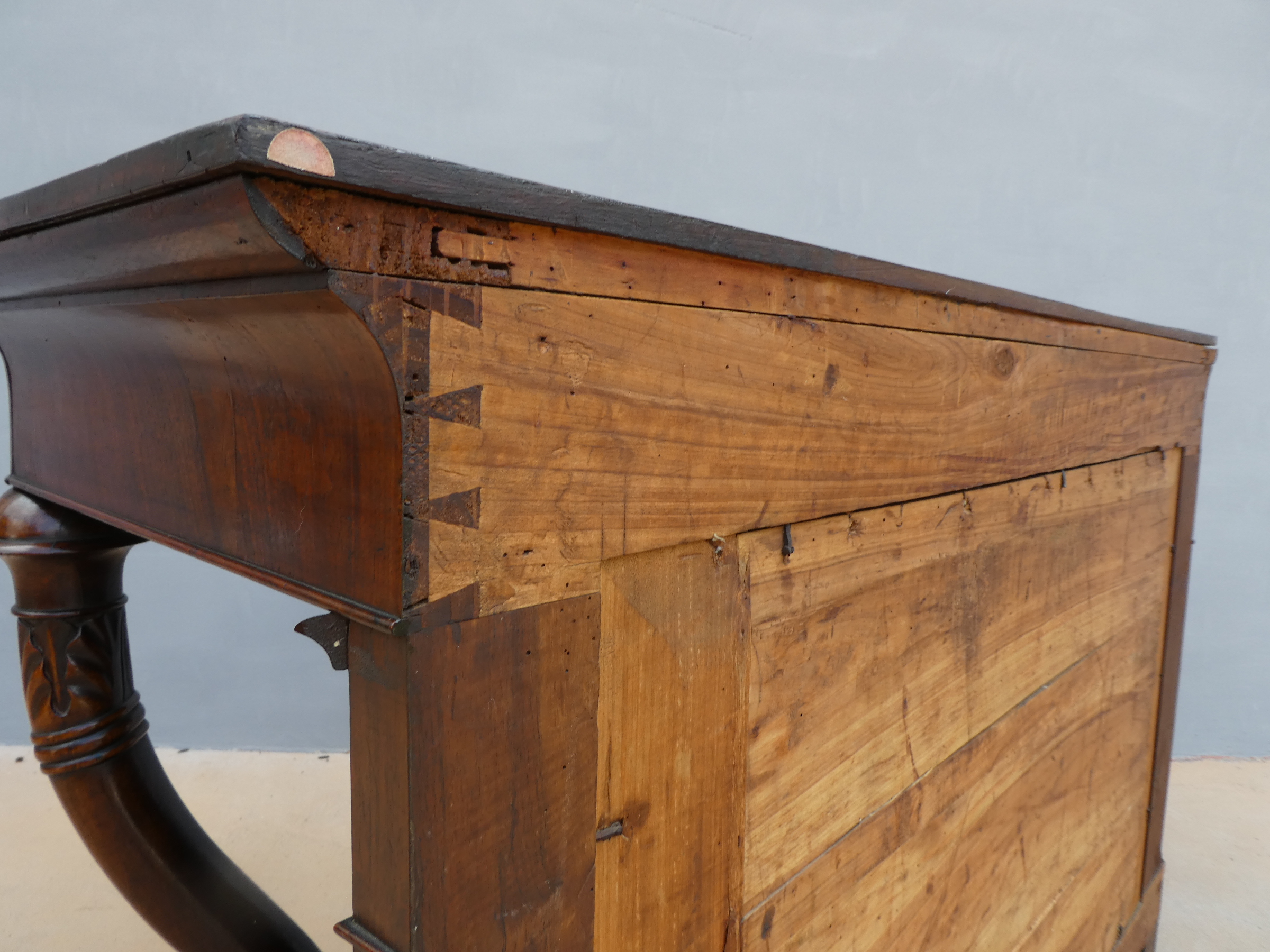 Console mobiletto Carlo X con piano d’appoggio in legno, dotato di un cassetto frontale a ‘scomparsa’ ed appartenente d’epoca alla metà dell’800. La struttura si presenta solida ed armoniosa, e vanta proporzioni sapientemente equilibrate. La ricerca di un decoro mirato si riflette anche sulla scelta d’impreziosire il corpo con delicati intagli, i quali si presentano unicamente sugli armonici montanti anteriori, caratteristici dello stile. Necessita di alcuni interventi di restauro (principalmente sul piano superiore e nel centro di quello inferiore – foto), e sono presenti alcuni fori di tarlo. Epoca metà ‘800.