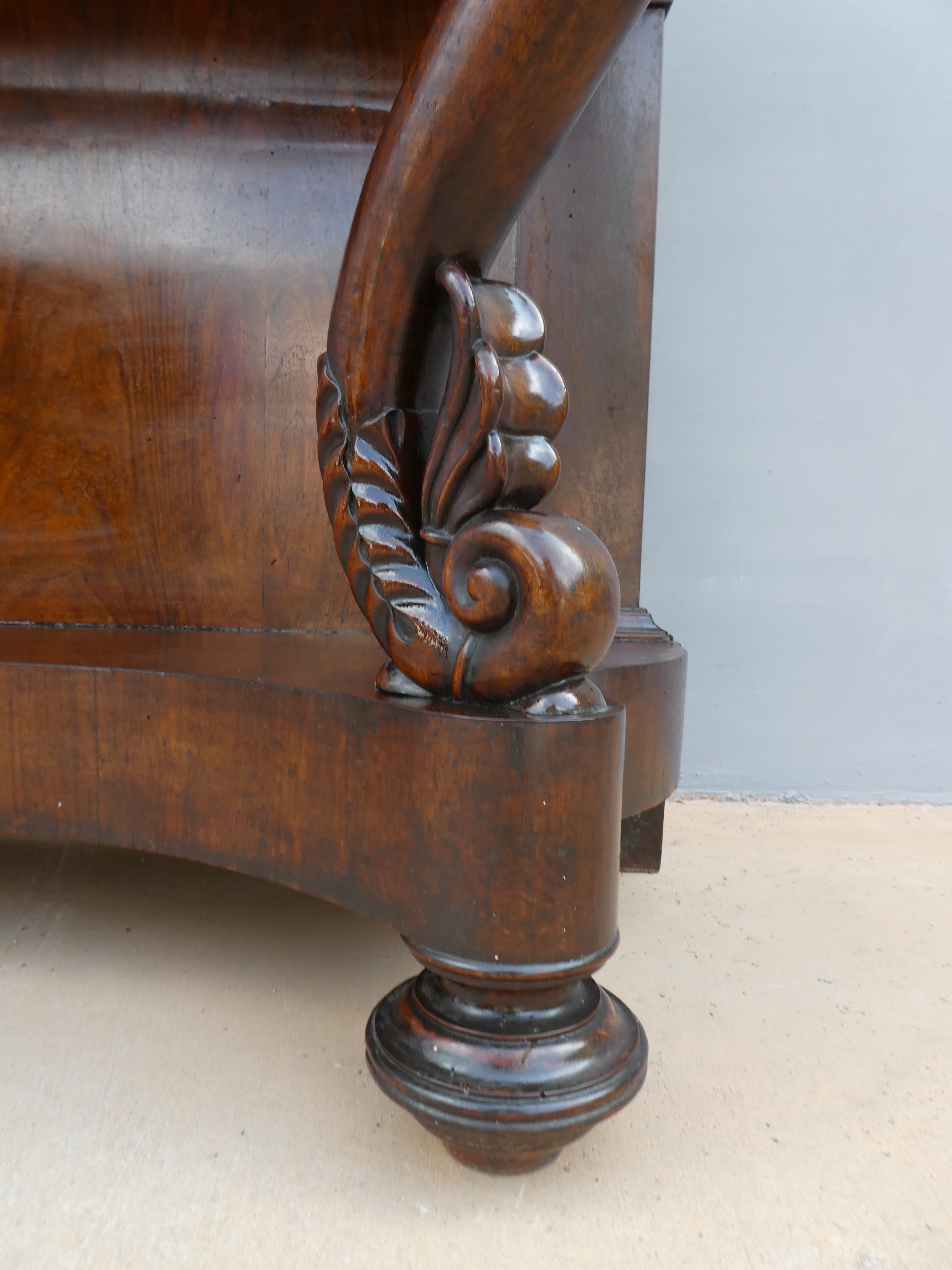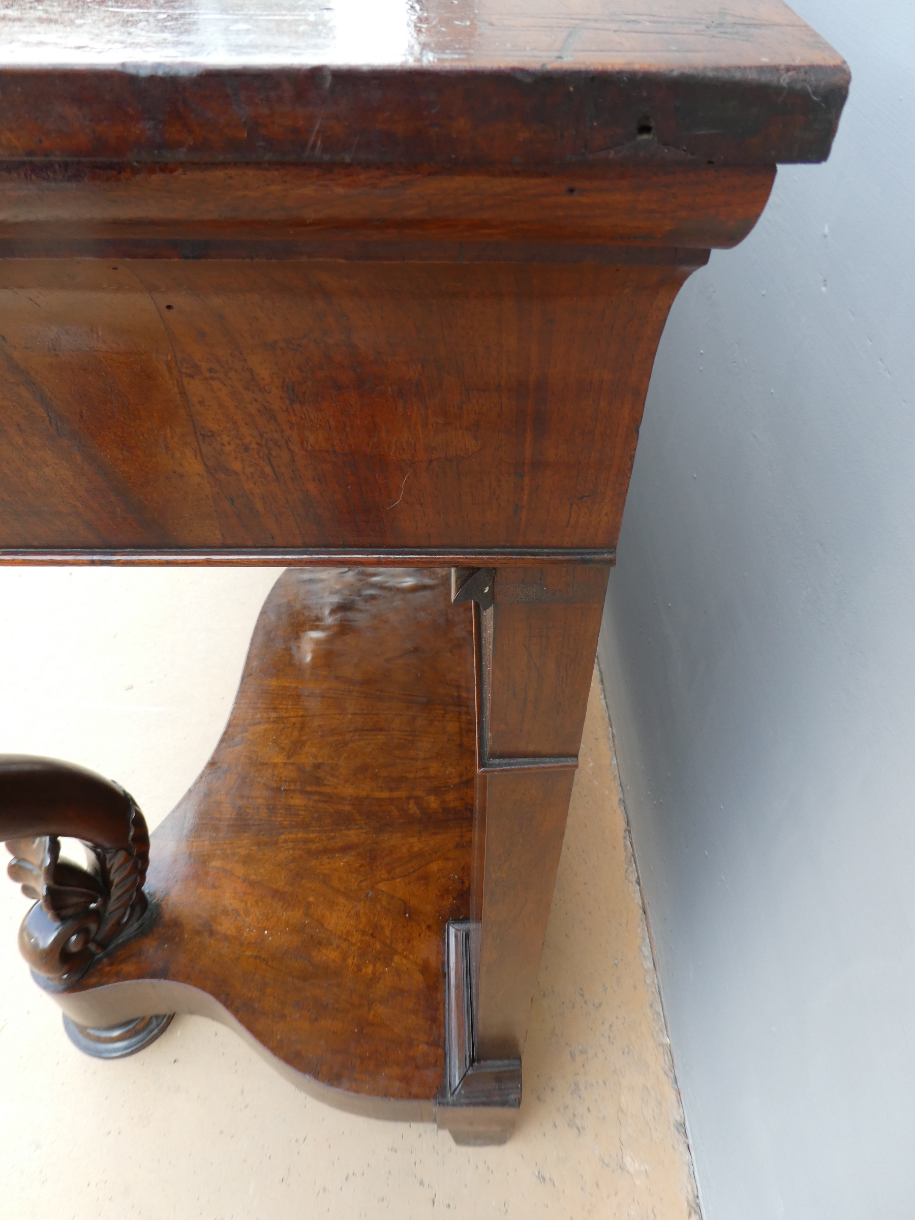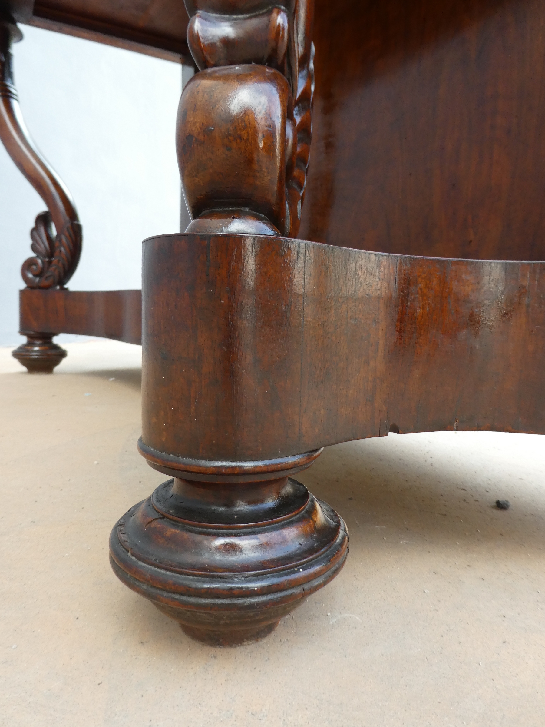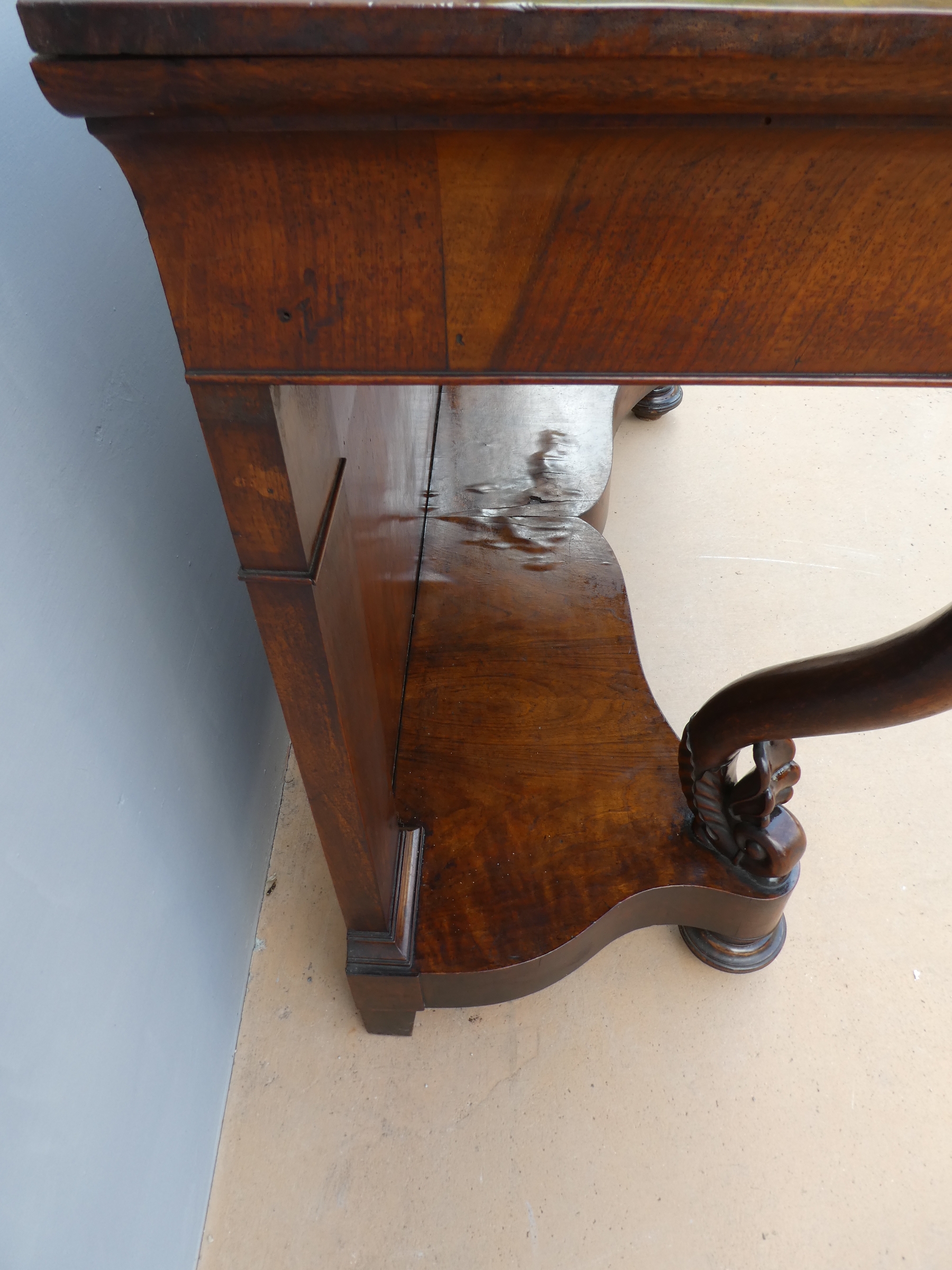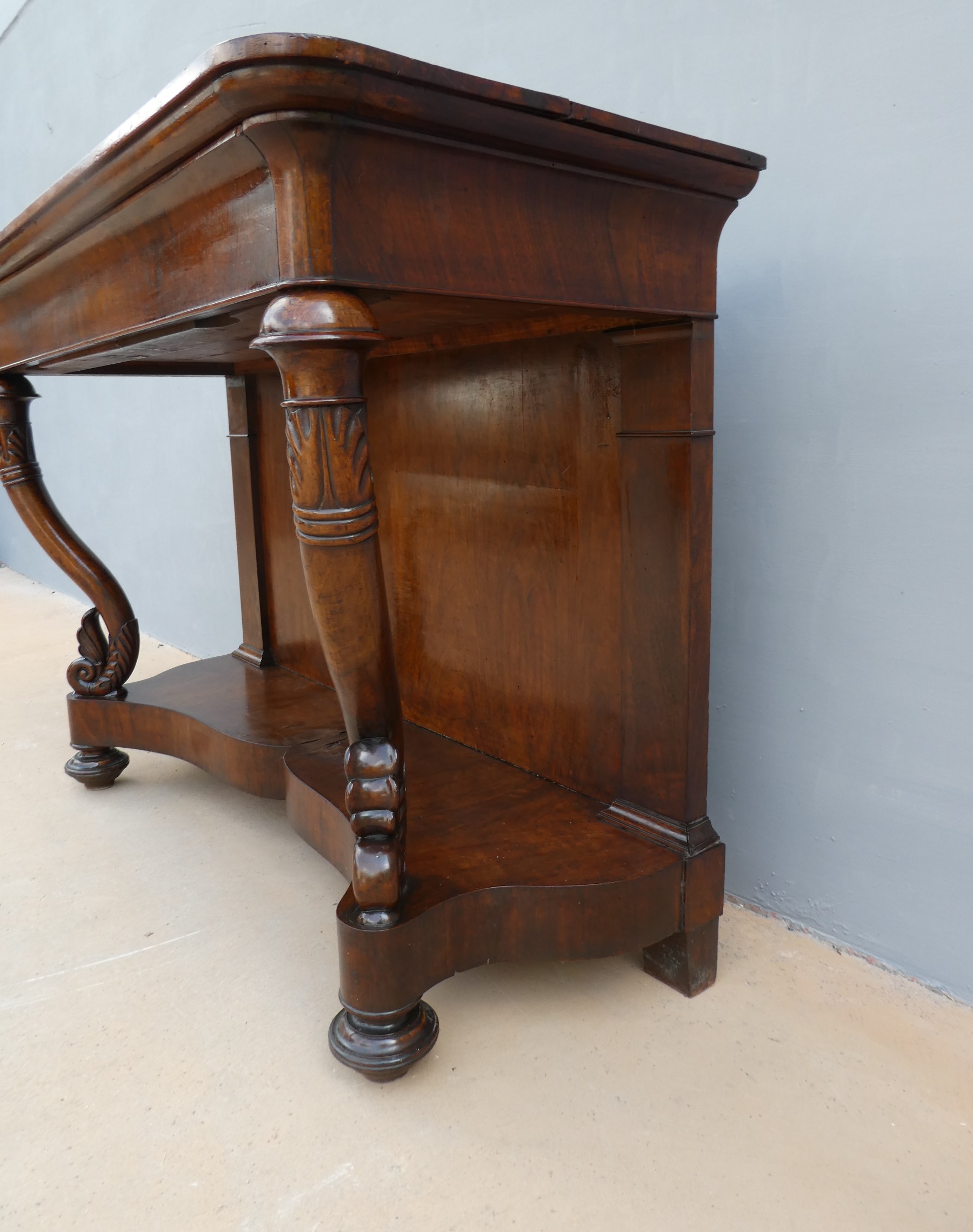 Console mobiletto Carlo X con piano d’appoggio in legno, dotato di un cassetto frontale a ‘scomparsa’ ed appartenente d’epoca alla metà dell’800. La struttura si presenta solida ed armoniosa, e vanta proporzioni sapientemente equilibrate. La ricerca di un decoro mirato si riflette anche sulla scelta d’impreziosire il corpo con delicati intagli, i quali si presentano unicamente sugli armonici montanti anteriori, caratteristici dello stile. Necessita di alcuni interventi di restauro (principalmente sul piano superiore e nel centro di quello inferiore – foto), e sono presenti alcuni fori di tarlo. Epoca metà ‘800.