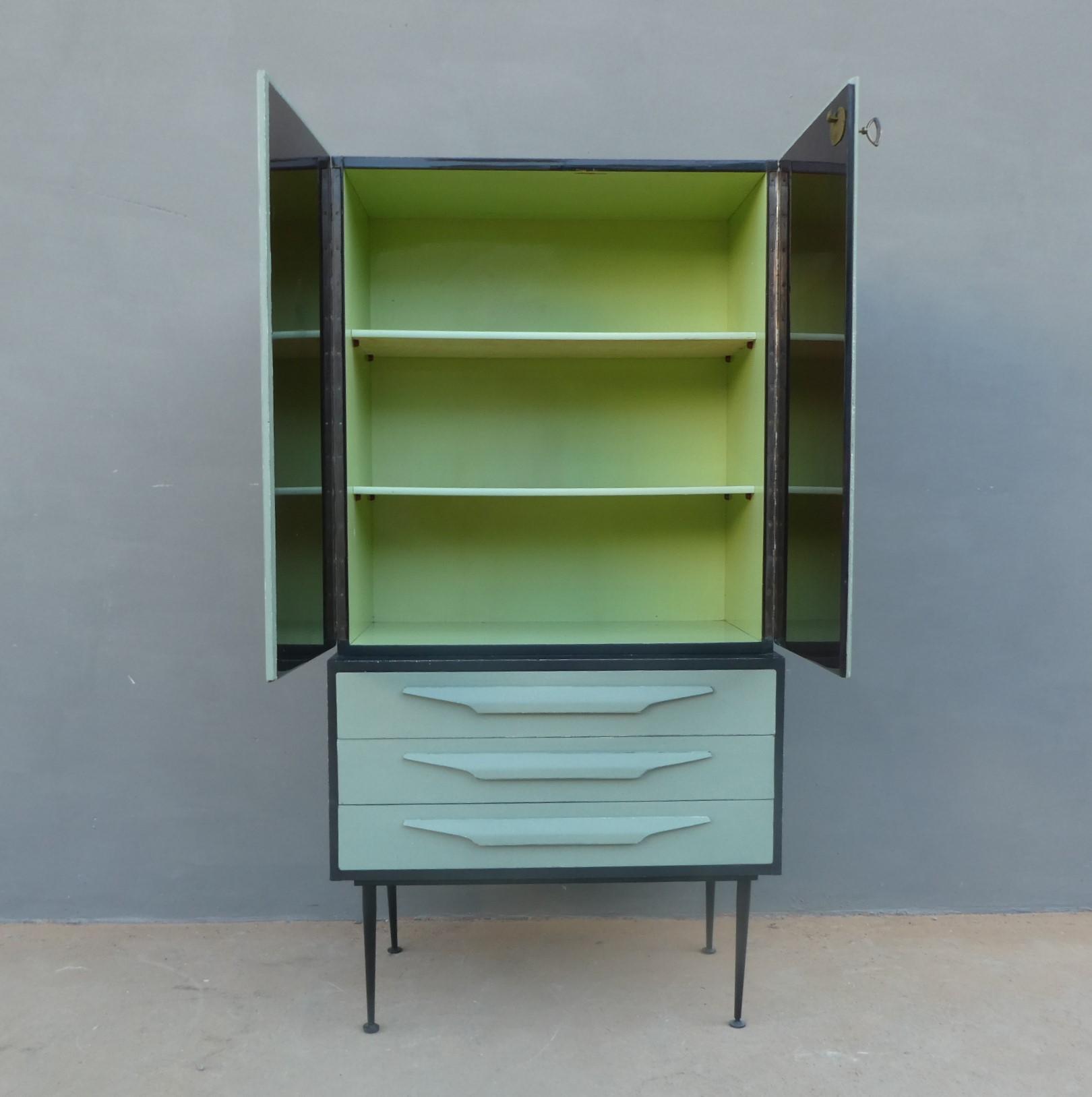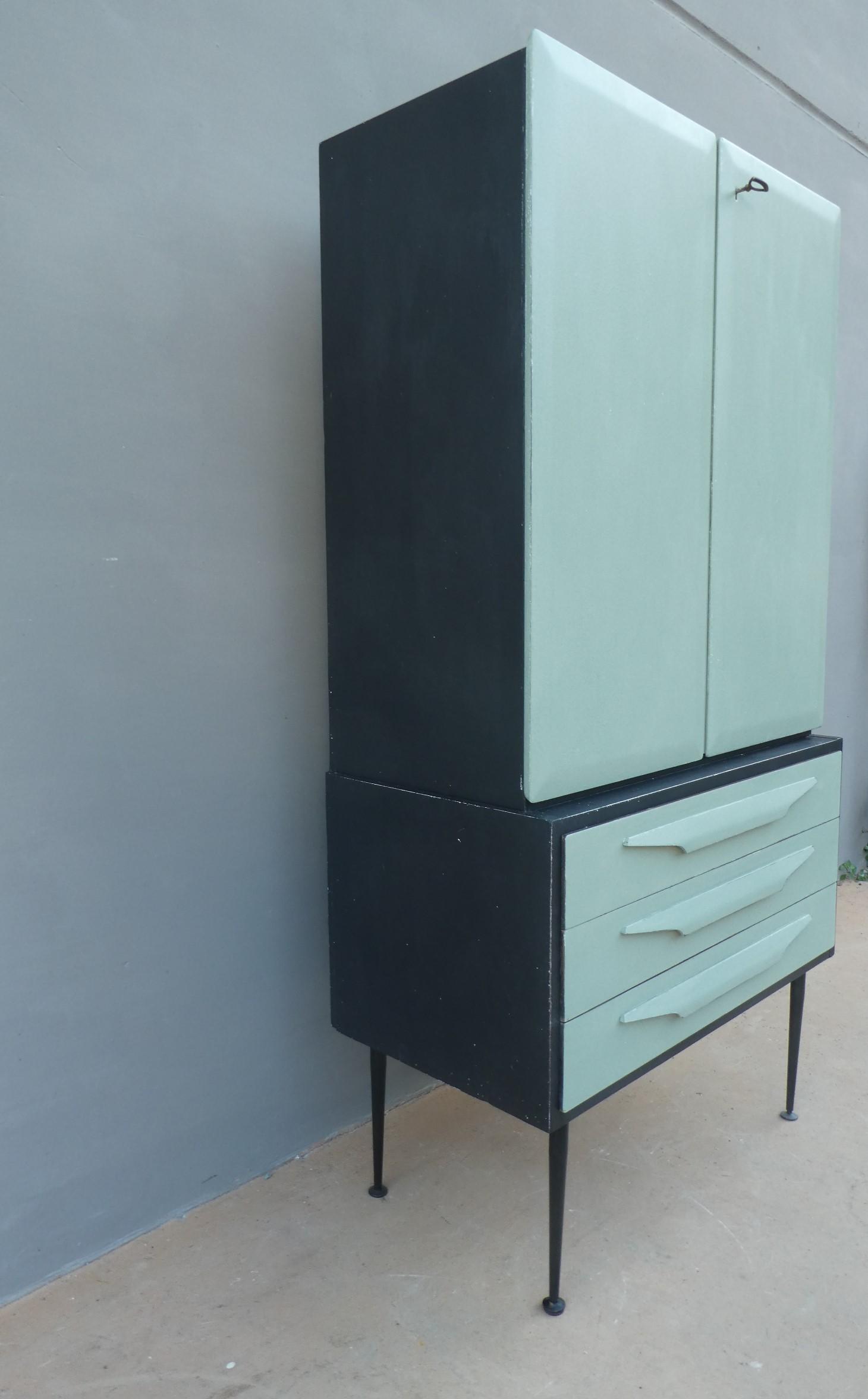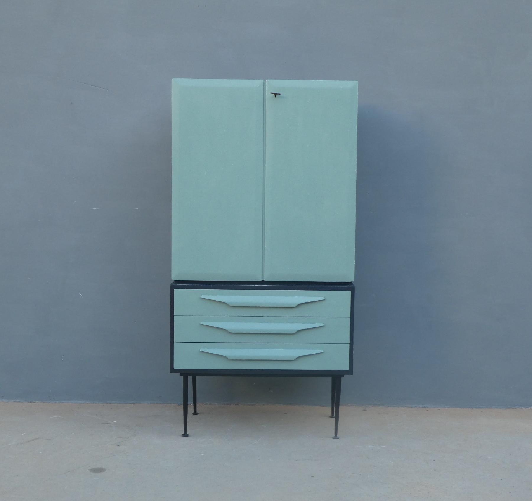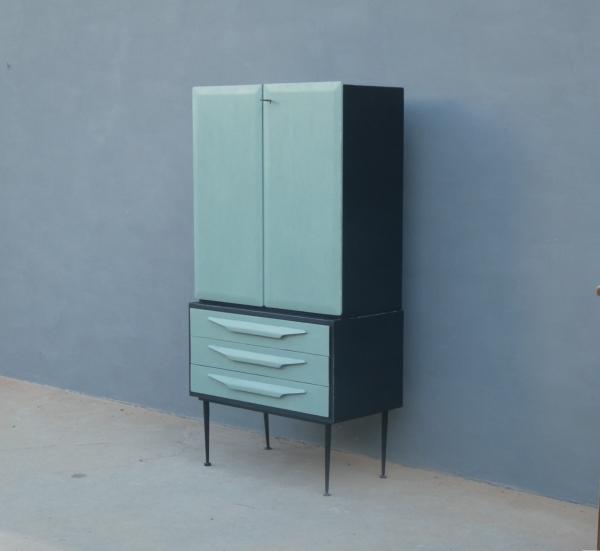 Mobile credenza dotato di due ante e tre cassetti frontali, laccato bicolore e rifinito con la tecnica “Shabby Chic”, che prevede l’uso di colori chiari e colori più scuri che affiorano dopo il trattamento di usura. Questo genere di mobile è caratterizzato da geometricità e grande leggerezza. La struttura, infatti, sorretta da quattro lineari montanti in ferro, e priva di decorazioni, si presenta semplice ed essenziale. Epoca seconda metà ‘900 – modernariato anni ’60.