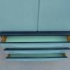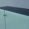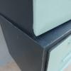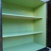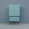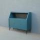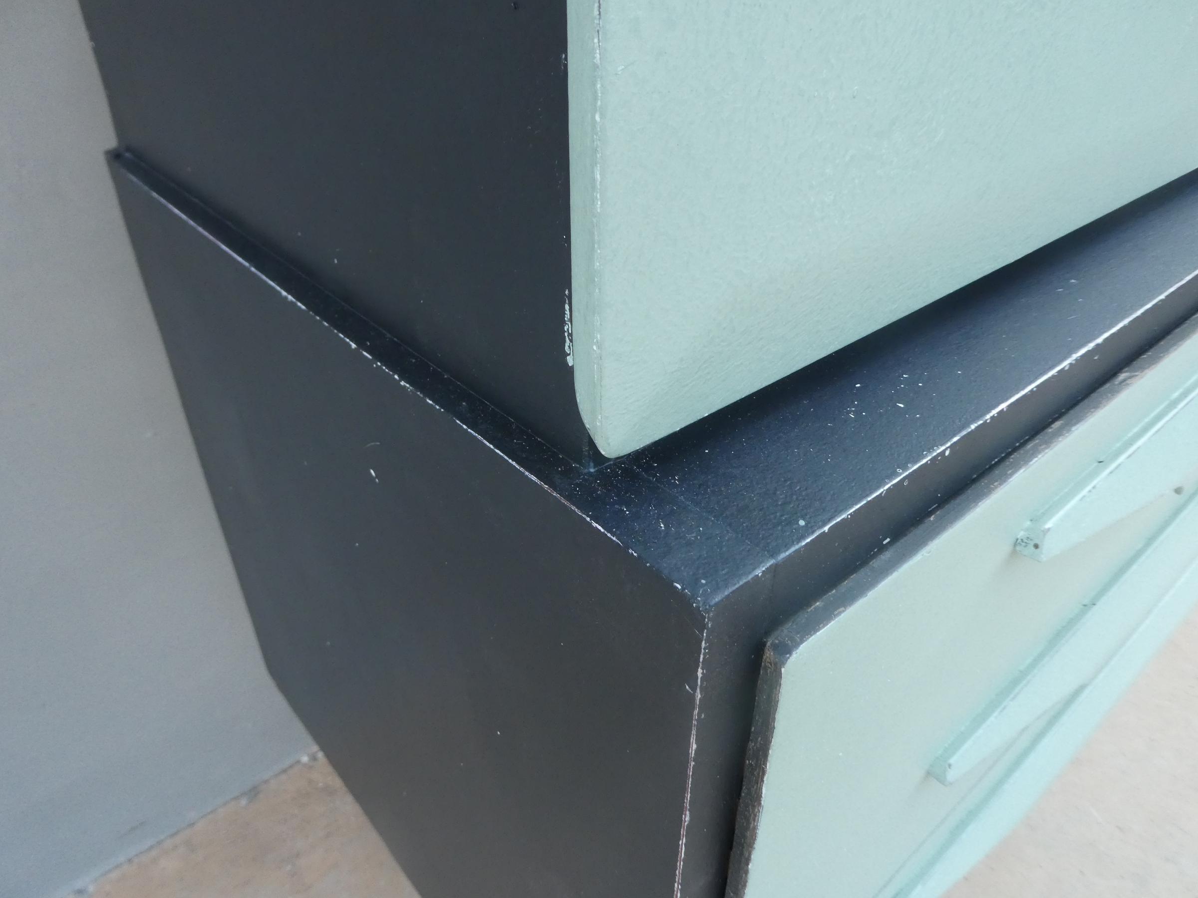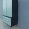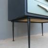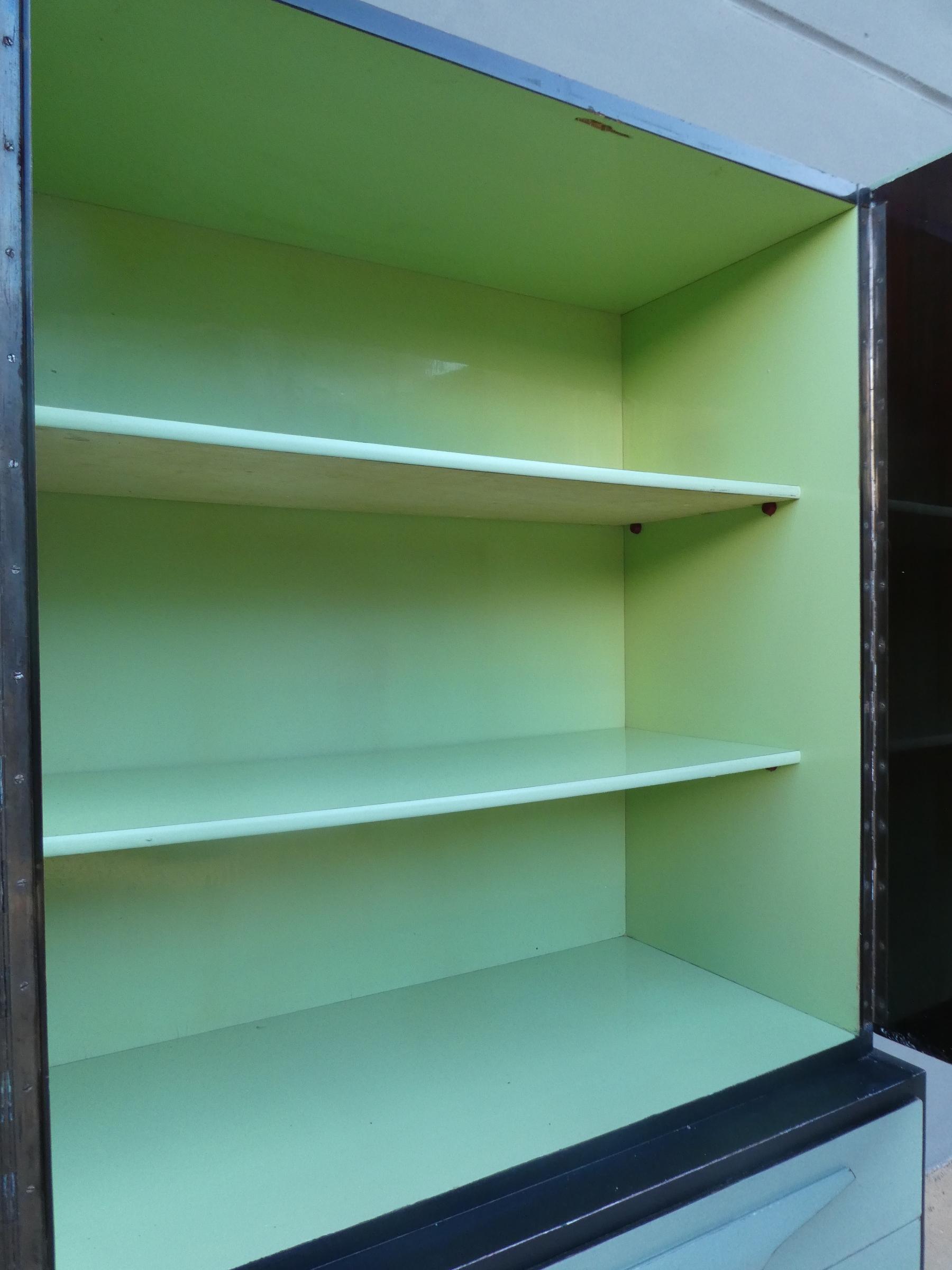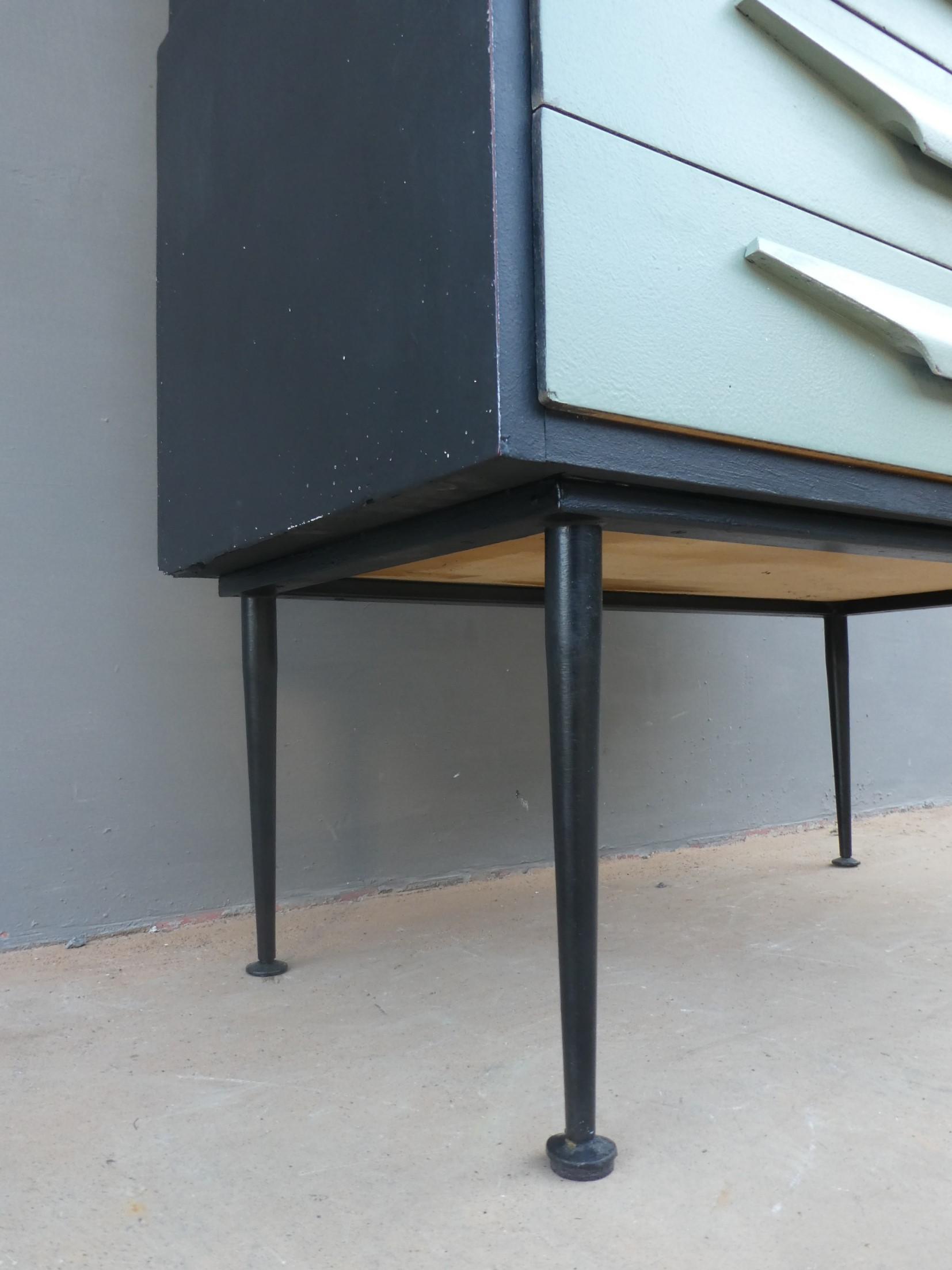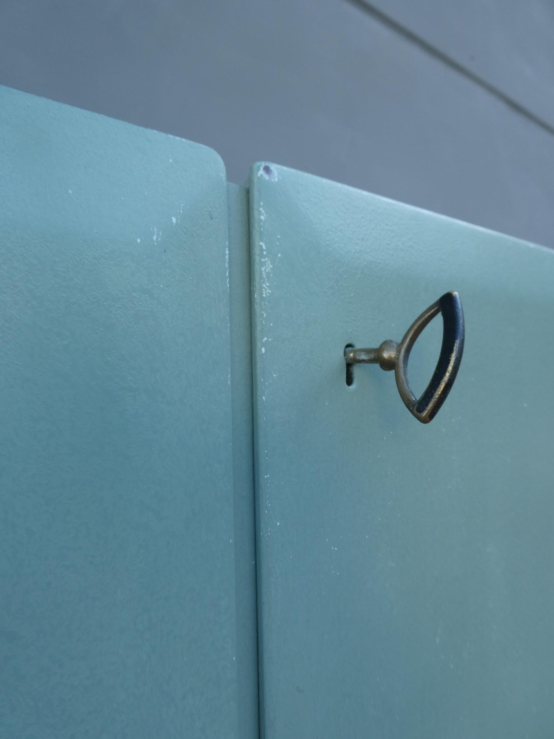 Mobile credenza dotato di due ante e tre cassetti frontali, laccato bicolore e rifinito con la tecnica “Shabby Chic”, che prevede l’uso di colori chiari e colori più scuri che affiorano dopo il trattamento di usura. Questo genere di mobile è caratterizzato da geometricità e grande leggerezza. La struttura, infatti, sorretta da quattro lineari montanti in ferro, e priva di decorazioni, si presenta semplice ed essenziale. Epoca seconda metà ‘900 – modernariato anni ’60.