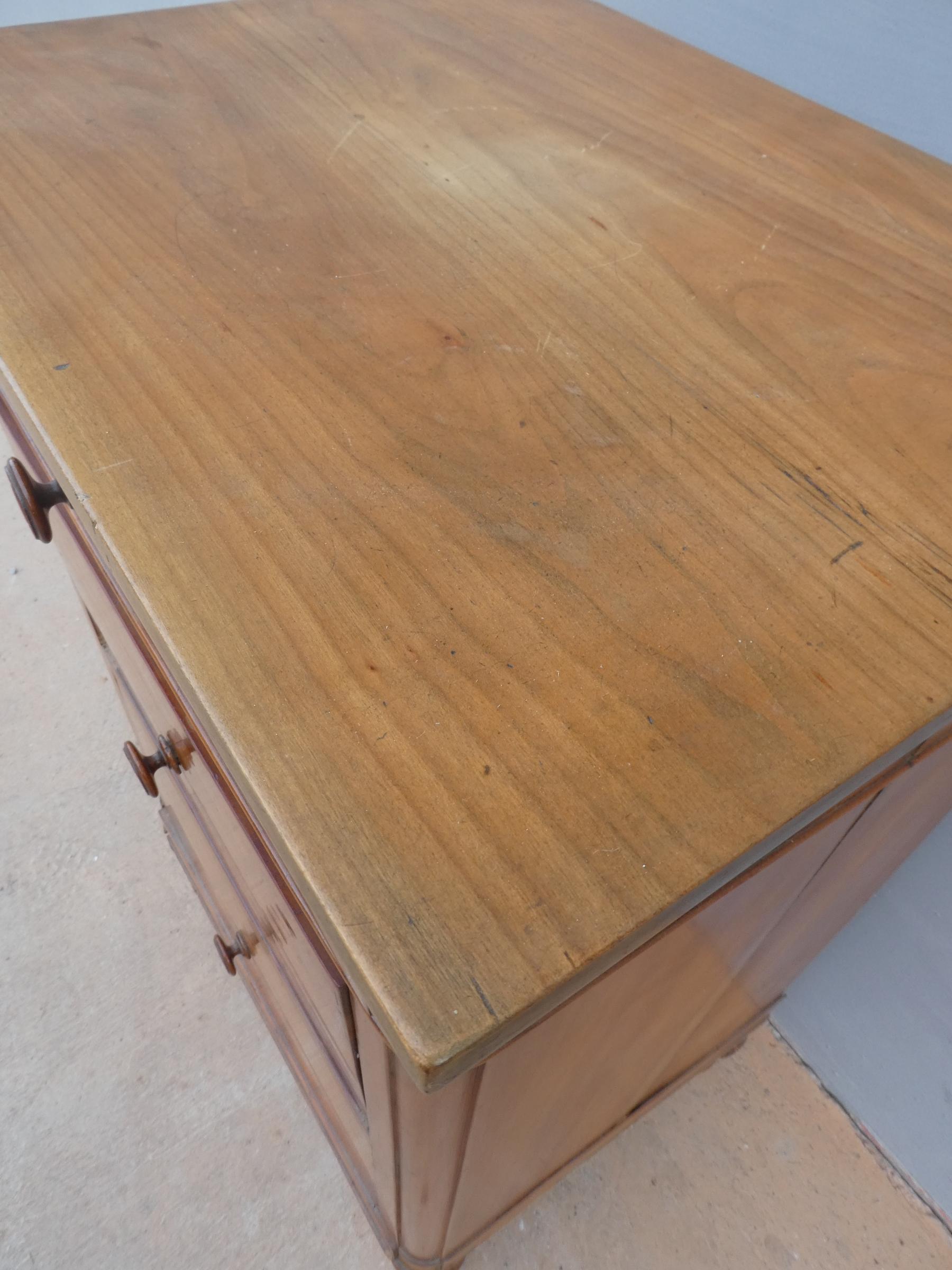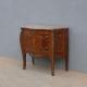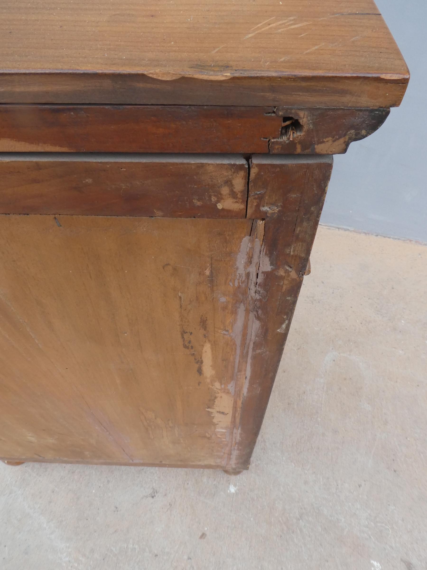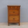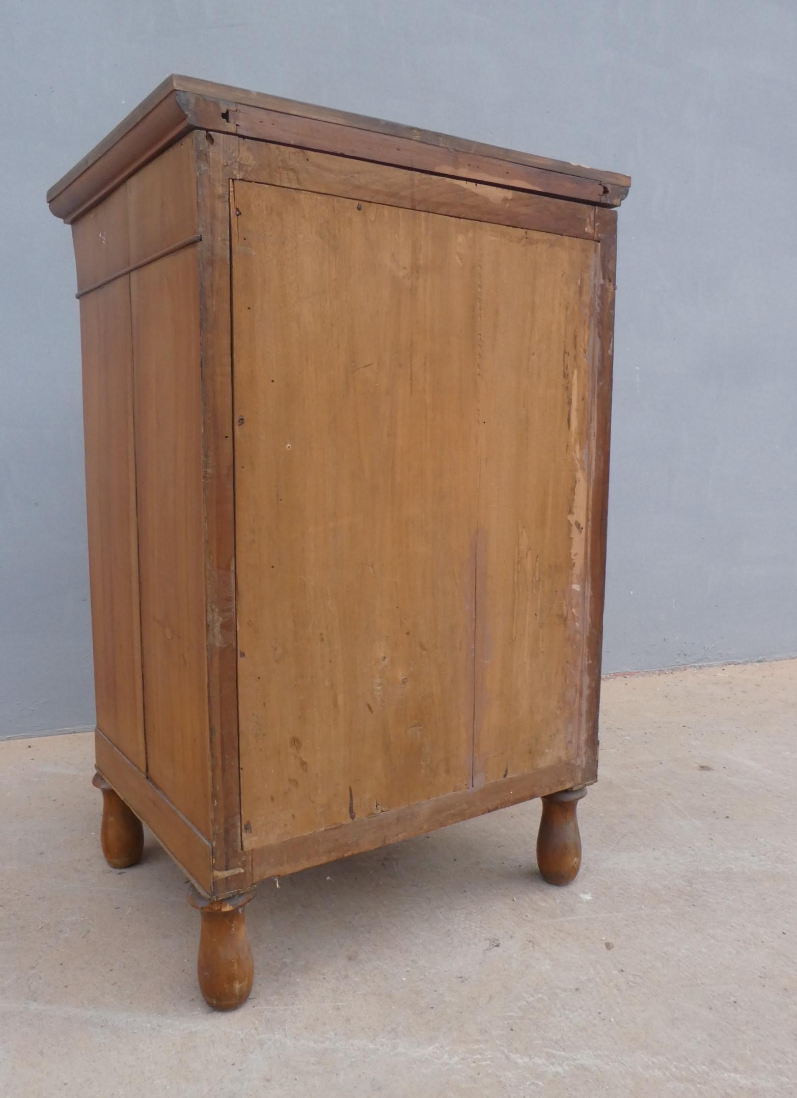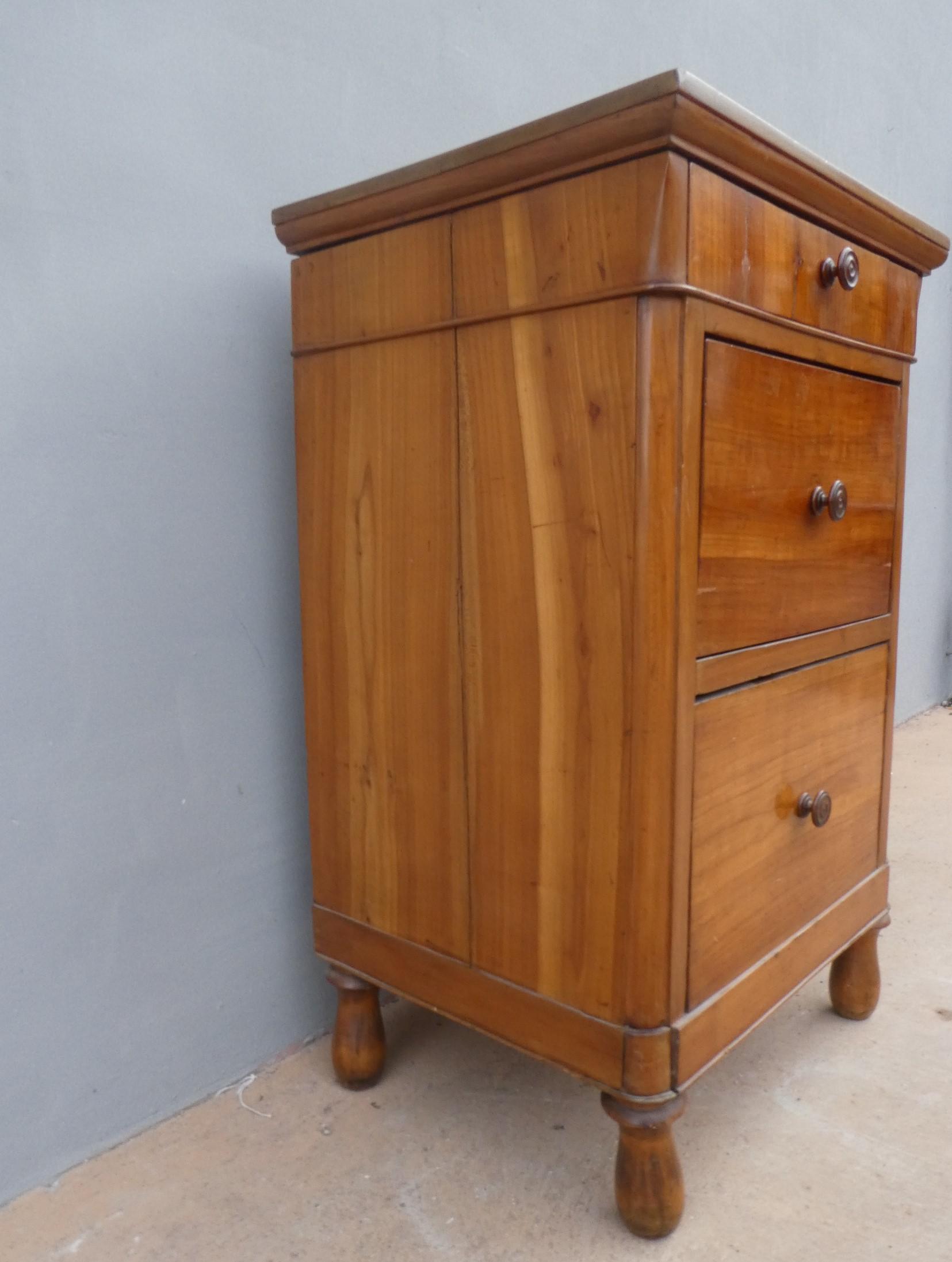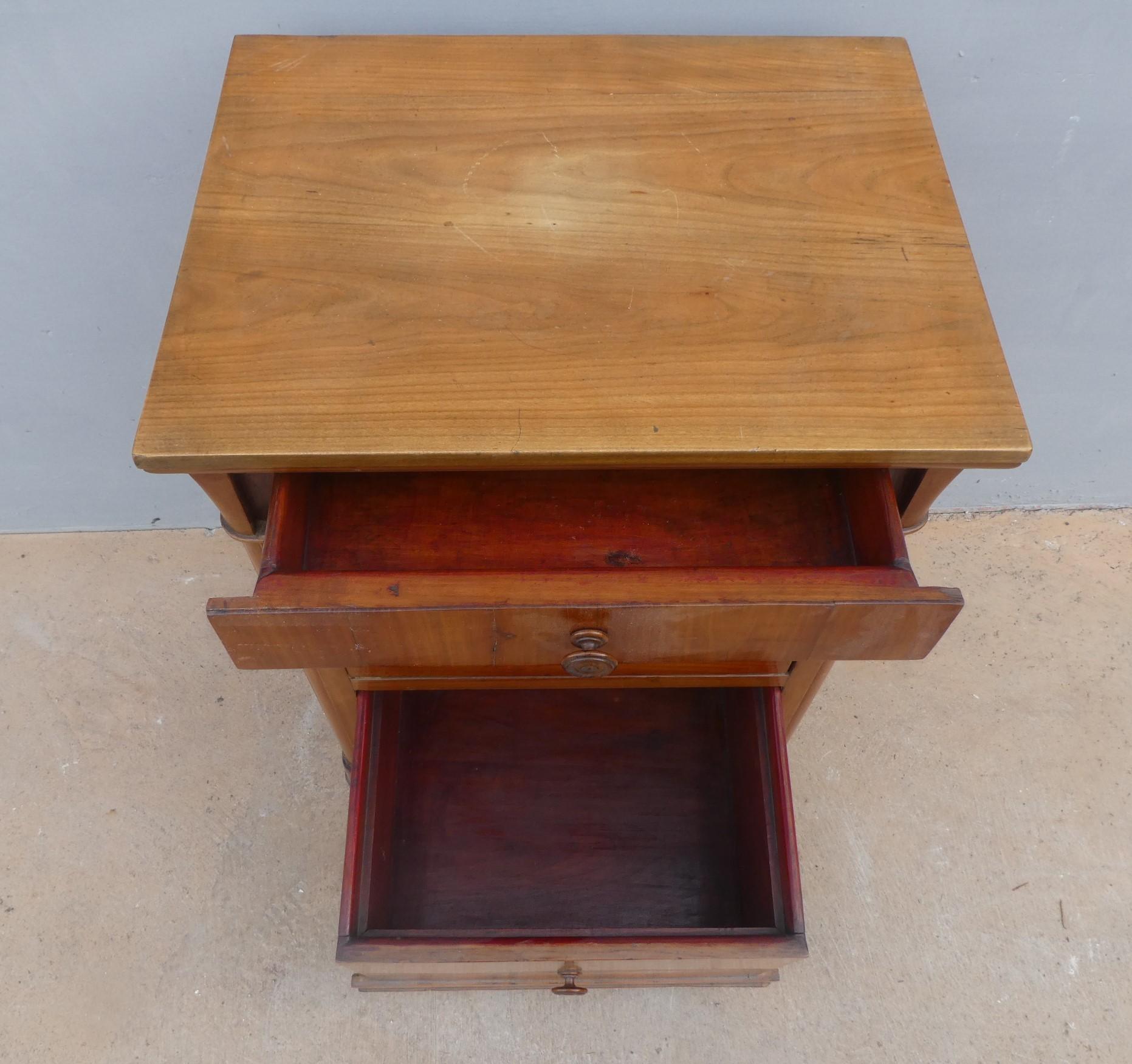 Comodino mobiletto realizzato in ciliegio, dotato di una calatoia centrale, due cassetti di diverse dimensioni ed un piano d’appoggio in legno. La struttura si presenta semplice e lineare, e vanta proporzioni contenute e sapientemente equilibrate. La ricerca di un sobrio decoro si riflette anche sulla scelta dei montanti, privi di elementi decorativi. Necessita di qualche intervento di restauro, sono presenti piccoli fori di tarlo (principalmente sul retro). Epoca seconda metà ‘800.
