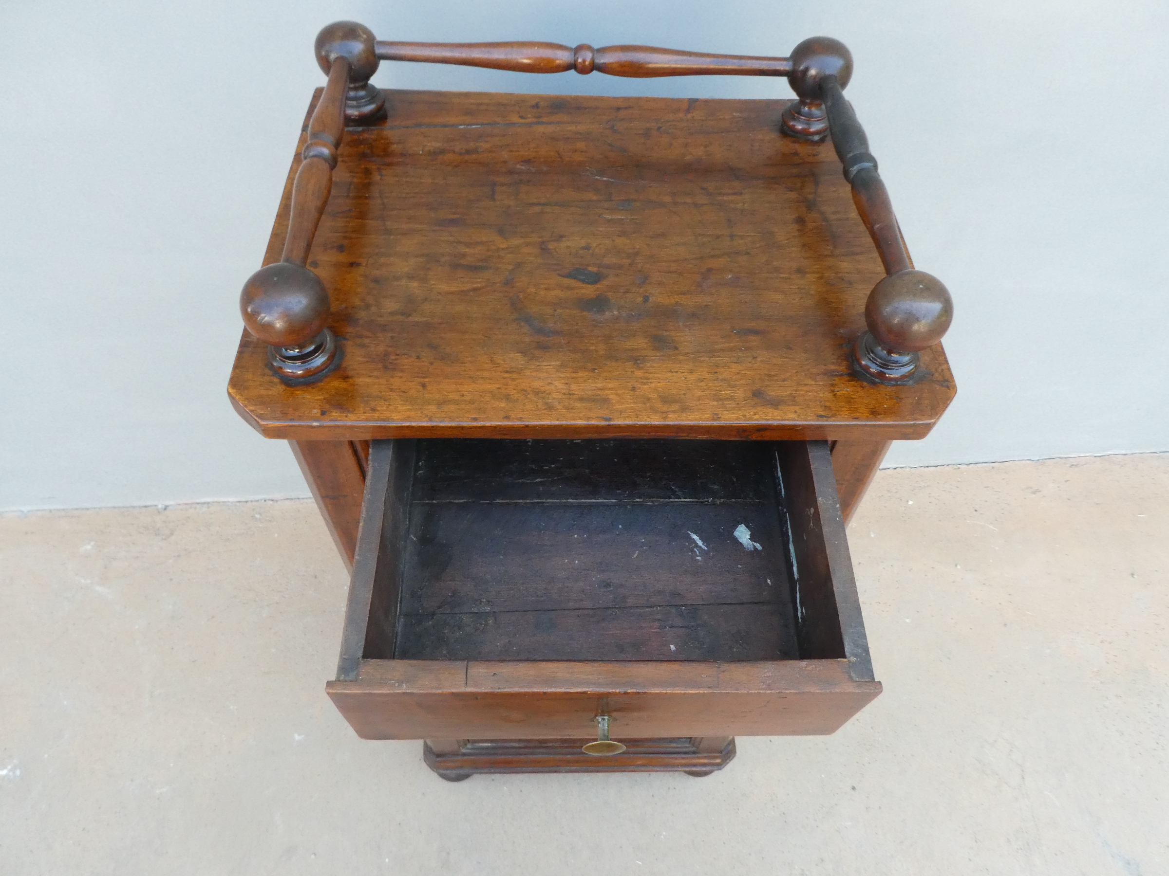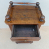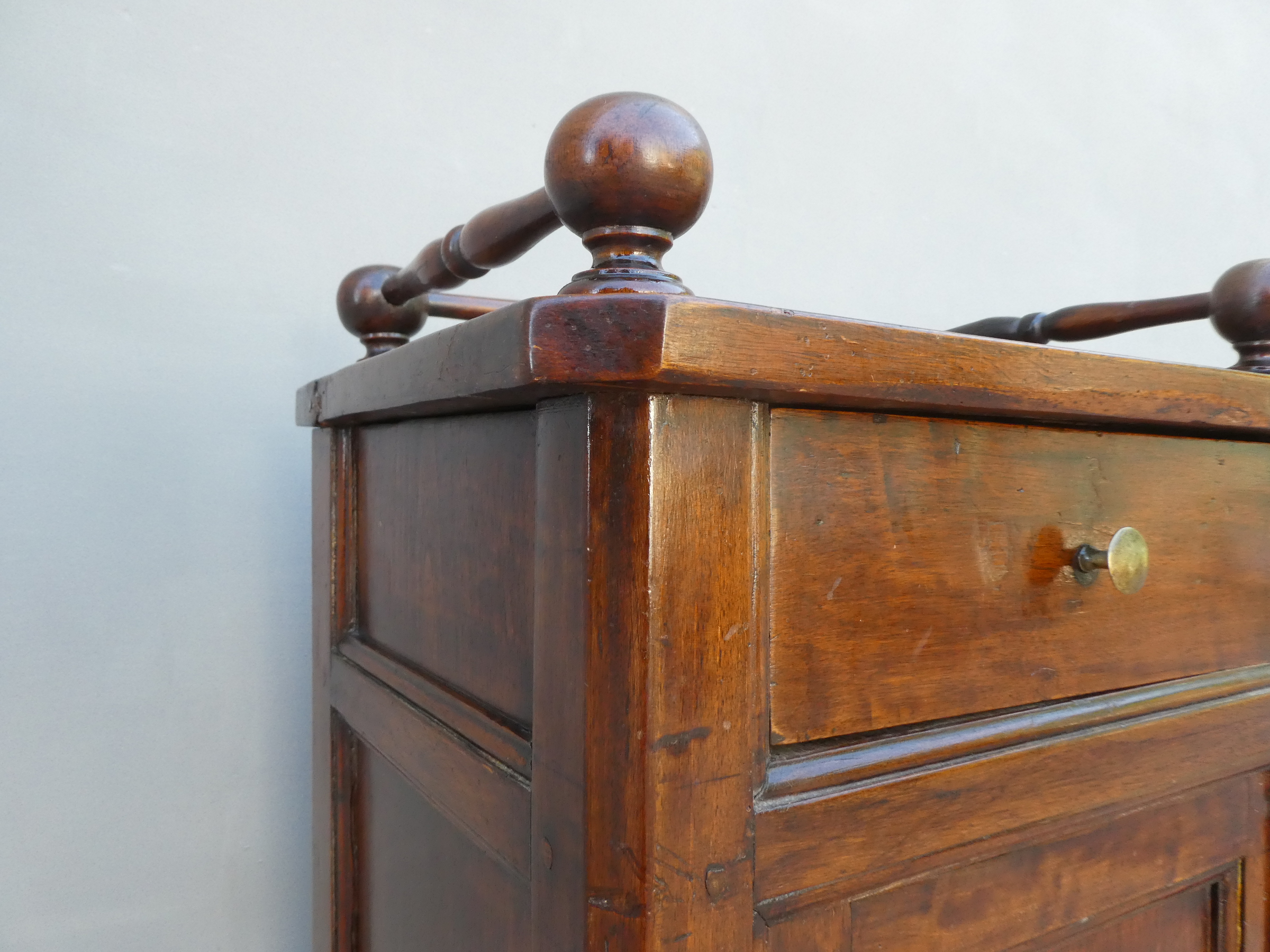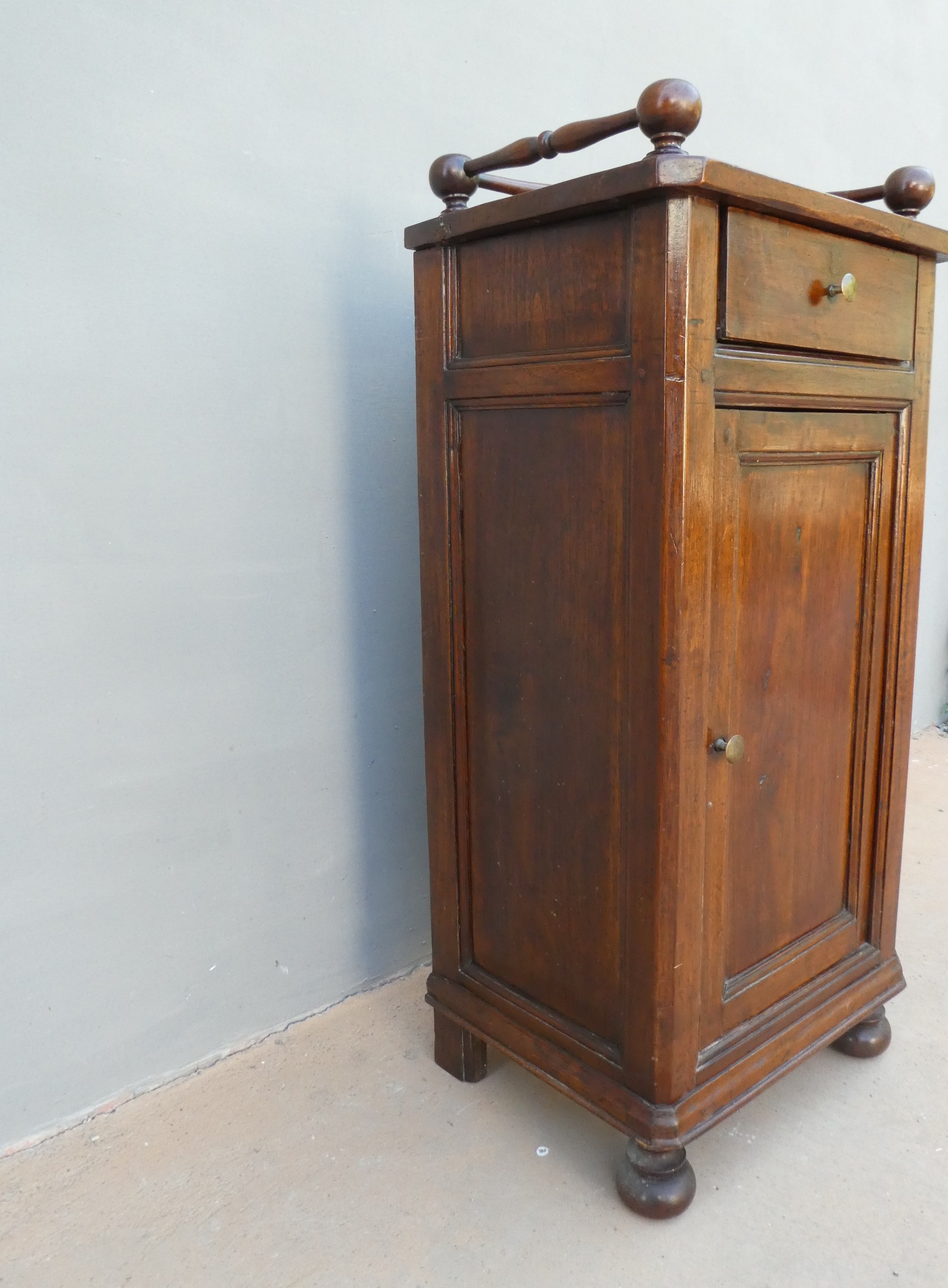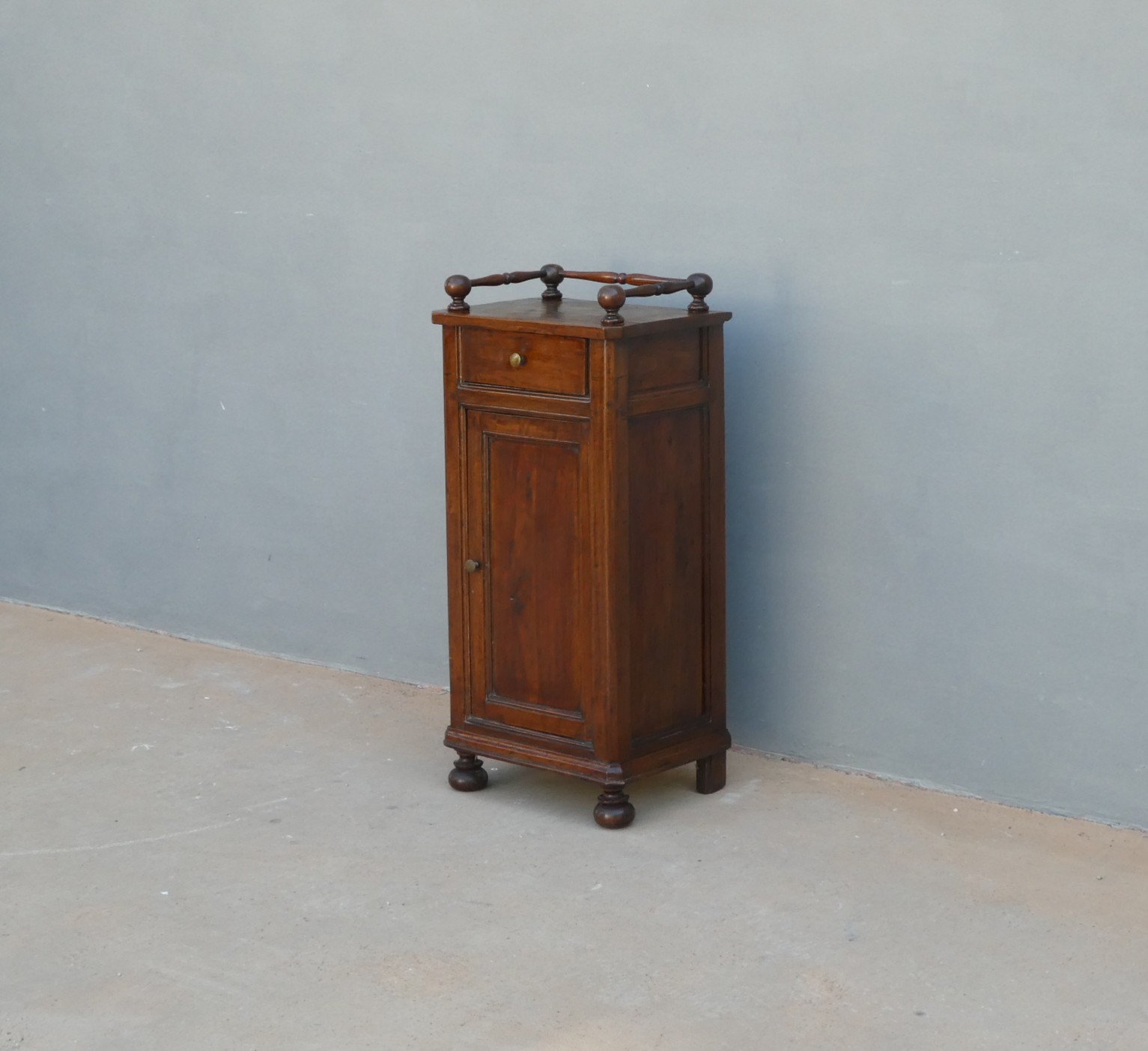 Comodino mobiletto corredato da un’anta ed un cassetto frontale, appartenente d’epoca alla fine dell’800. La struttura si presenta semplice ed armoniosa, e vanta proporzioni contenute e sapientemente equilibrate. La ricerca di un decoro delicato si riflette anche sulla scelta d’utilizzare la noce; un’essenza nota ed elegante, caratterizzata da fitte venature di tonalità più scure. All’interno ha un ripiano. Necessita di alcuni interventi di restauro (foto).