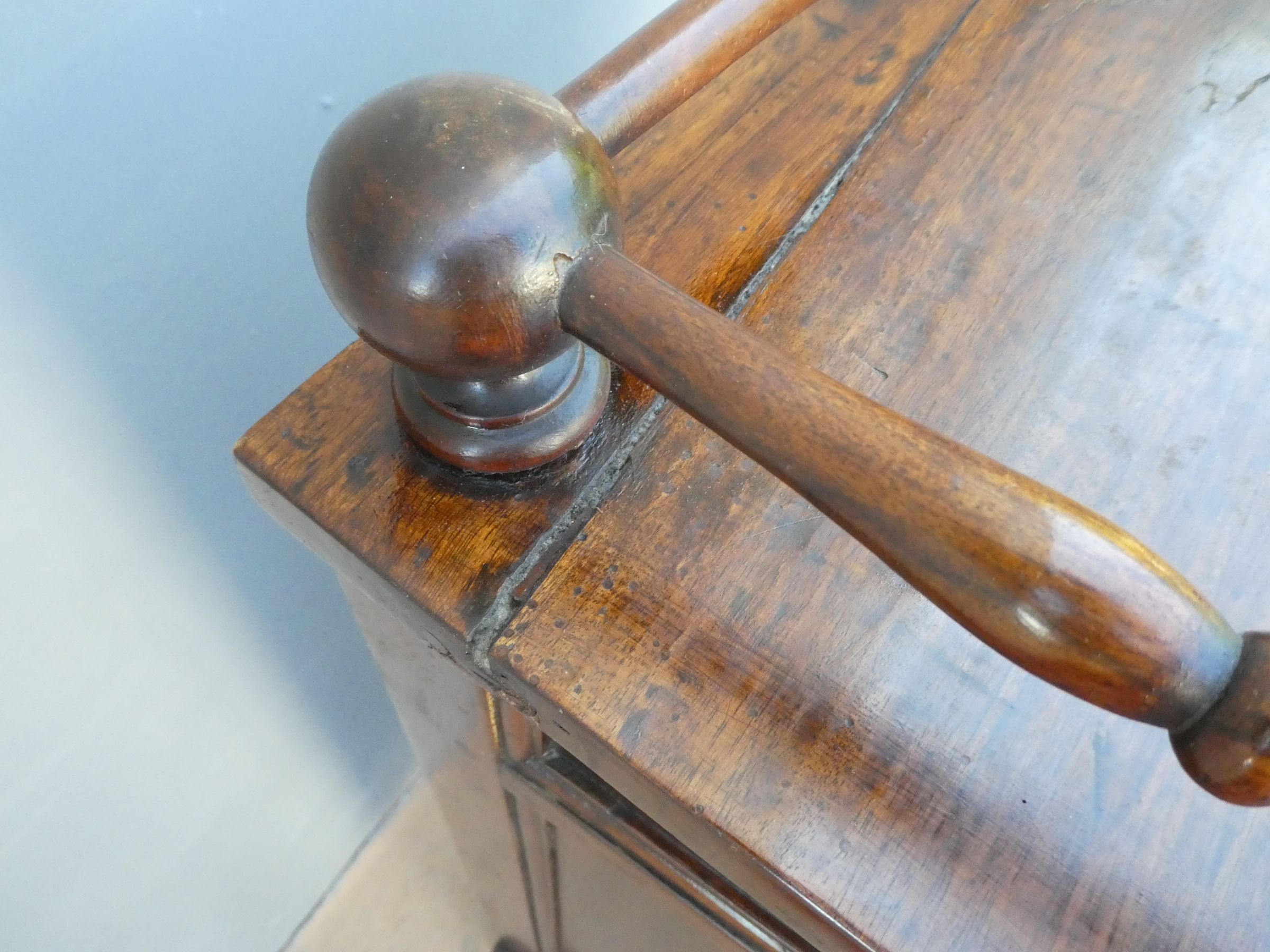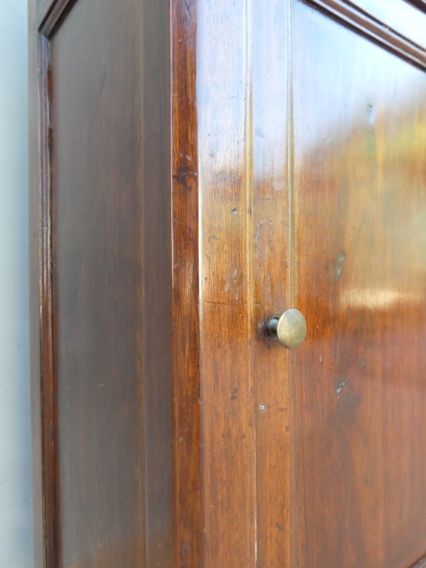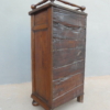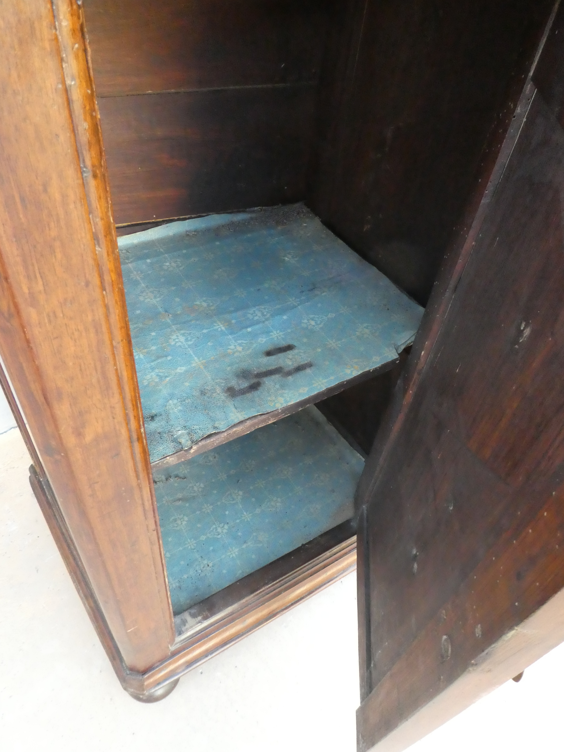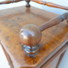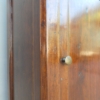 Comodino mobiletto corredato da un’anta ed un cassetto frontale, appartenente d’epoca alla fine dell’800. La struttura si presenta semplice ed armoniosa, e vanta proporzioni contenute e sapientemente equilibrate. La ricerca di un decoro delicato si riflette anche sulla scelta d’utilizzare la noce; un’essenza nota ed elegante, caratterizzata da fitte venature di tonalità più scure. All’interno ha un ripiano. Necessita di alcuni interventi di restauro (foto).