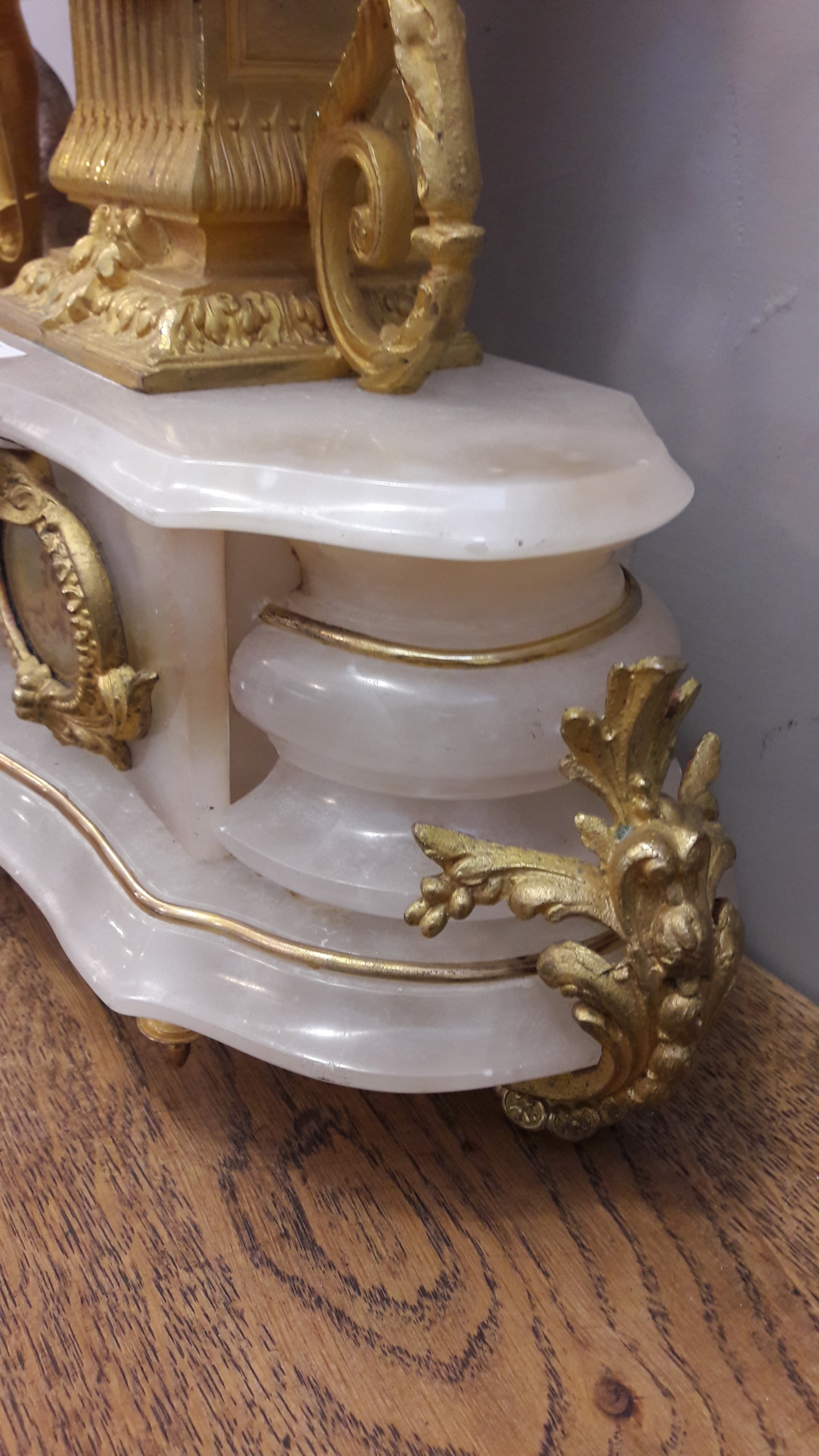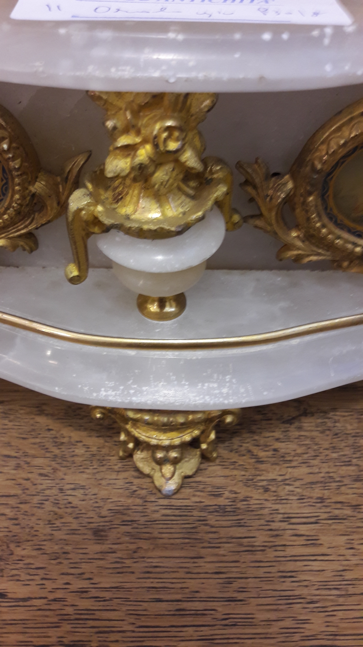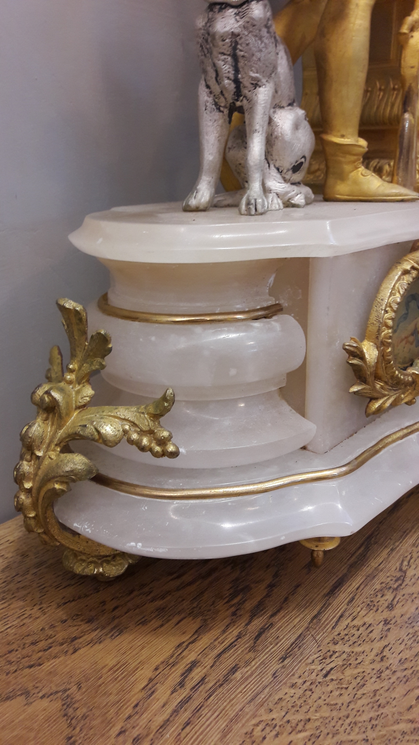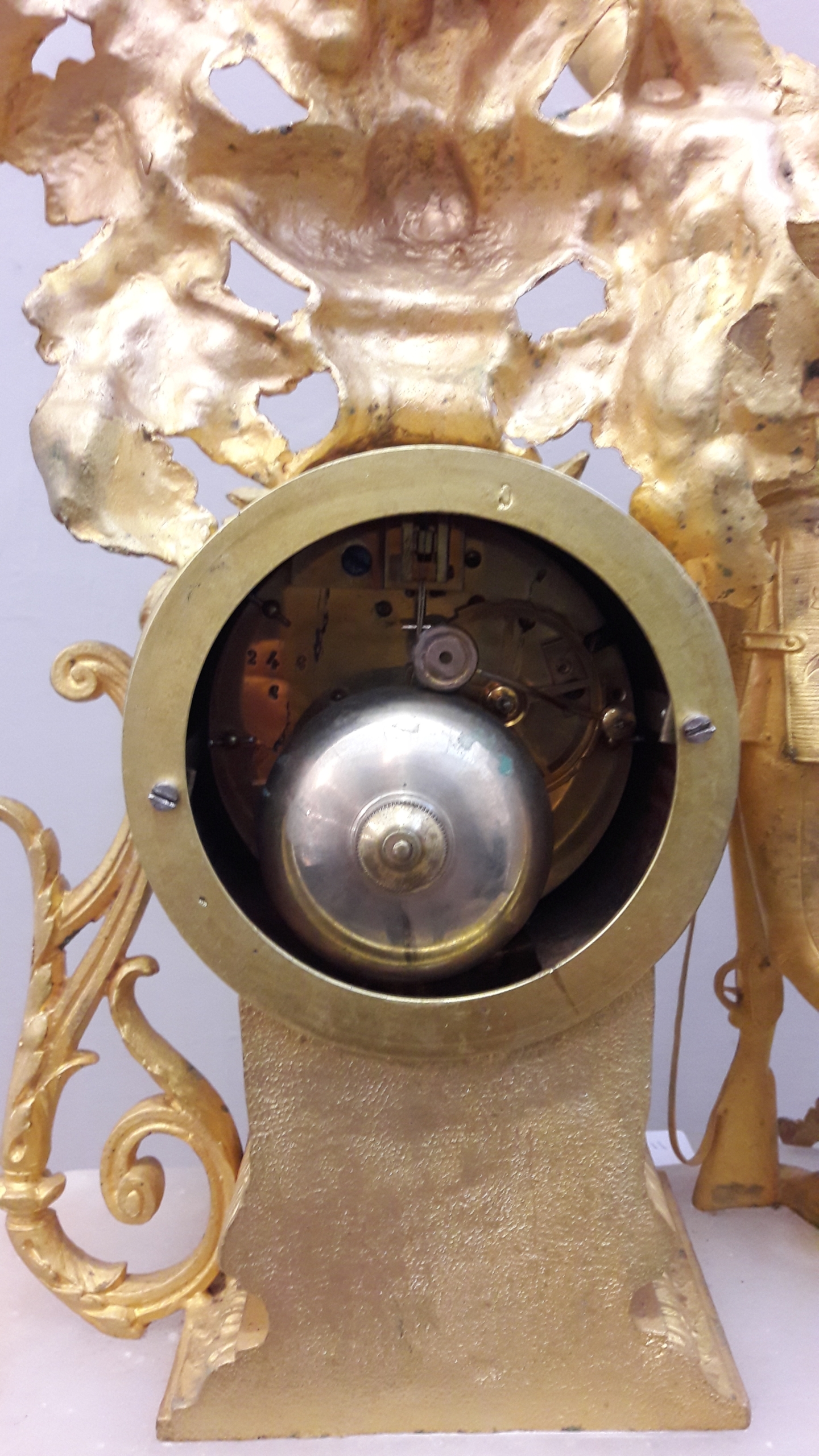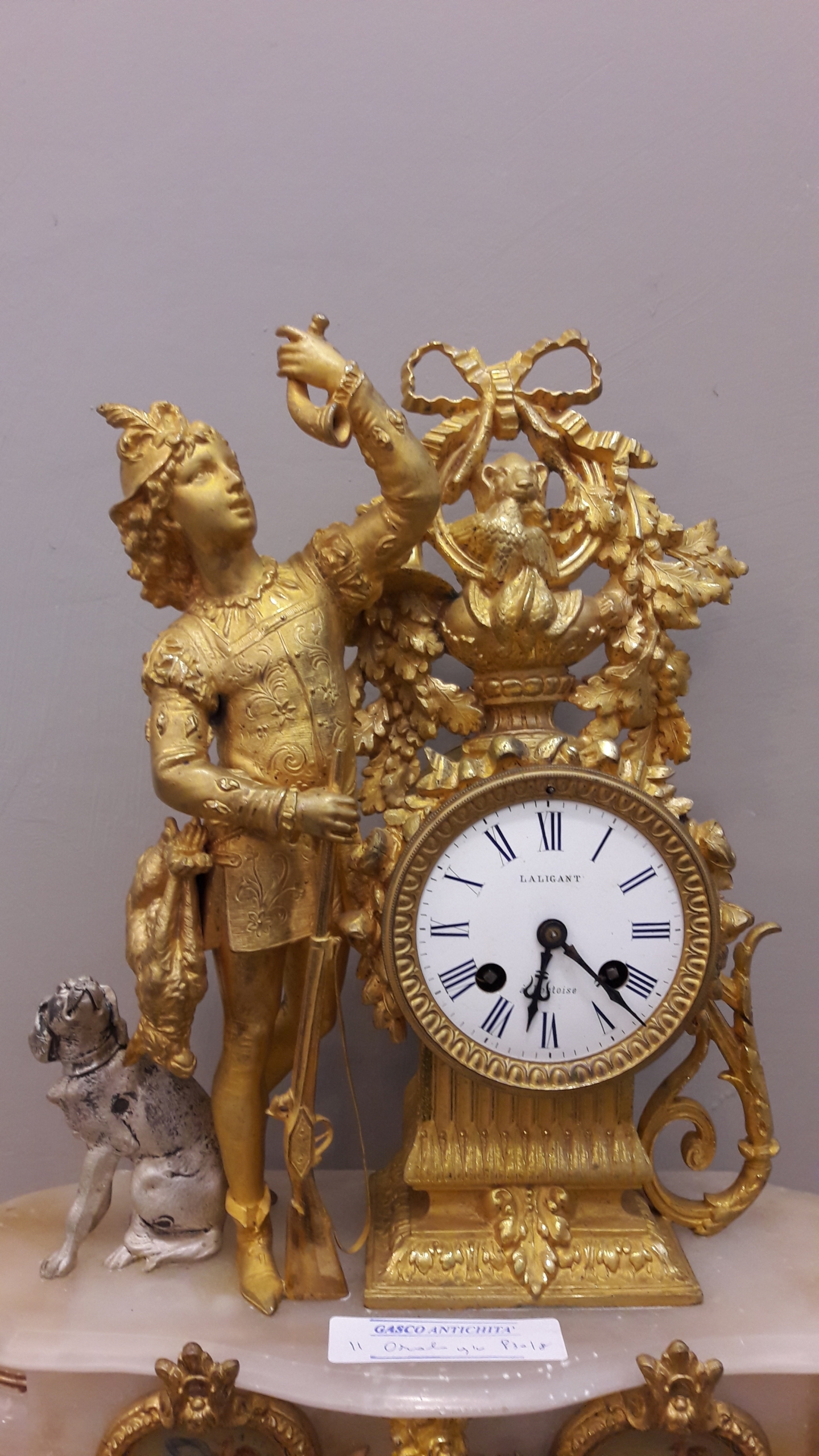 Orologio da tavolo/camino in bronzo dorato al mercurio con quadrante frontale circolare e basamento in marmo, contraddistinto dalla minuzia con la quale sono stati rappresentati i dettagli ed impreziosito da una coppia di inserti frontali. Non garantiamo il funzionamento dell’orologio. Appartenente d’epoca alla fine ‘800.