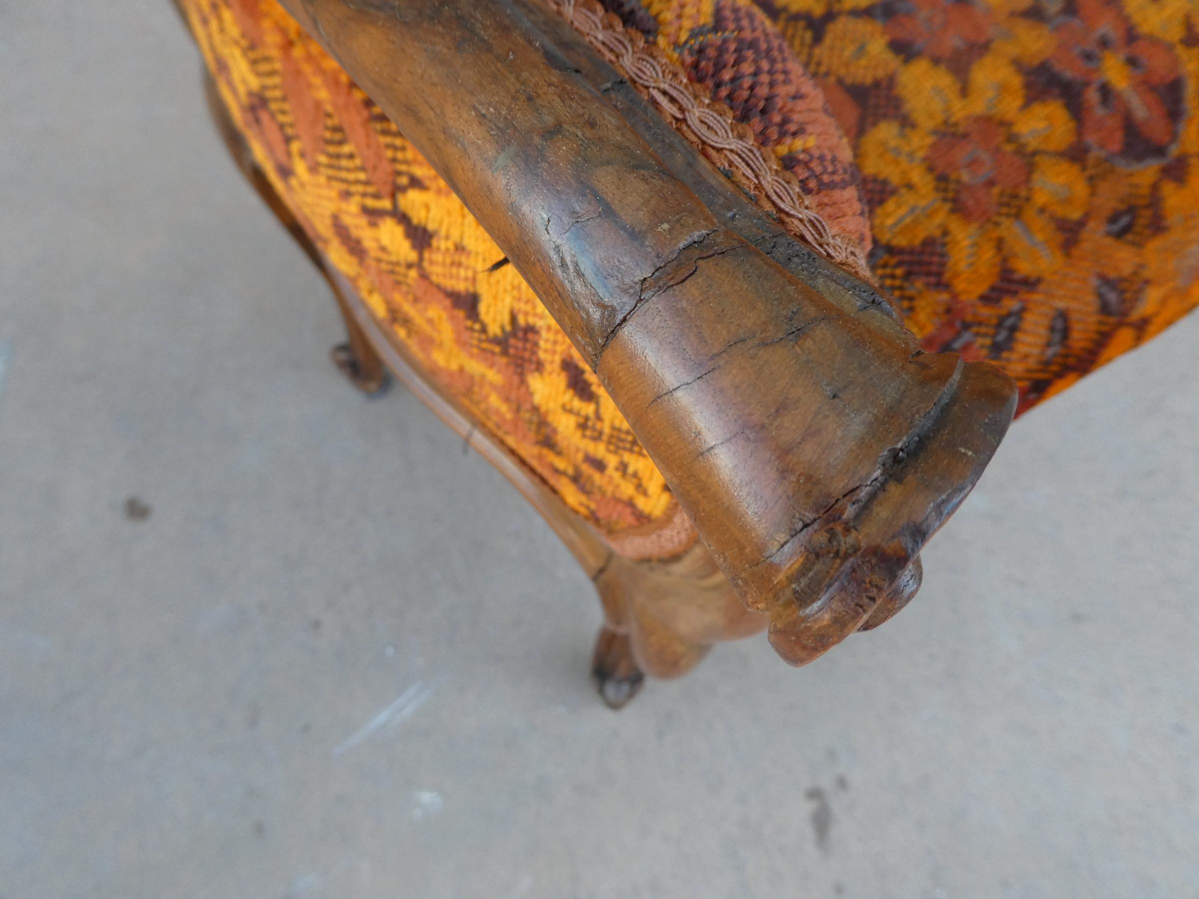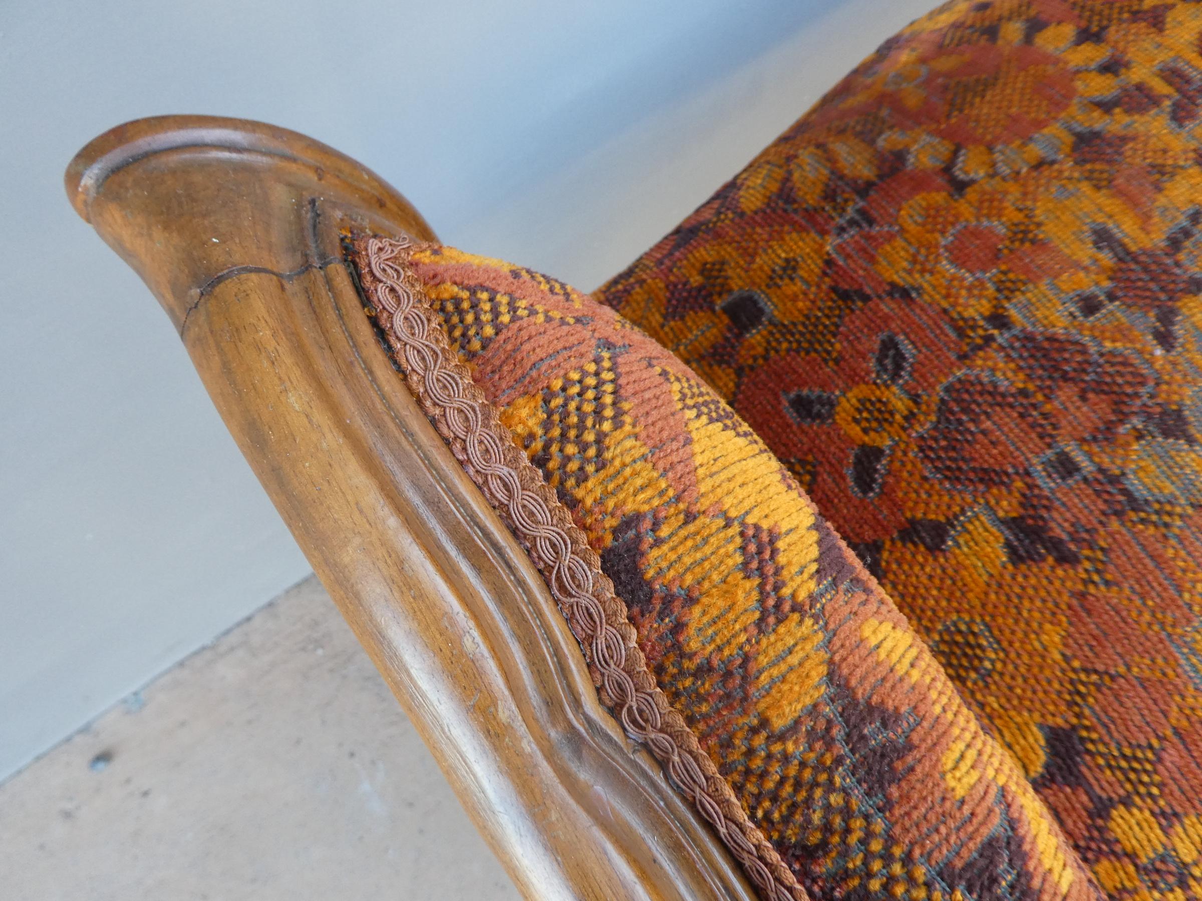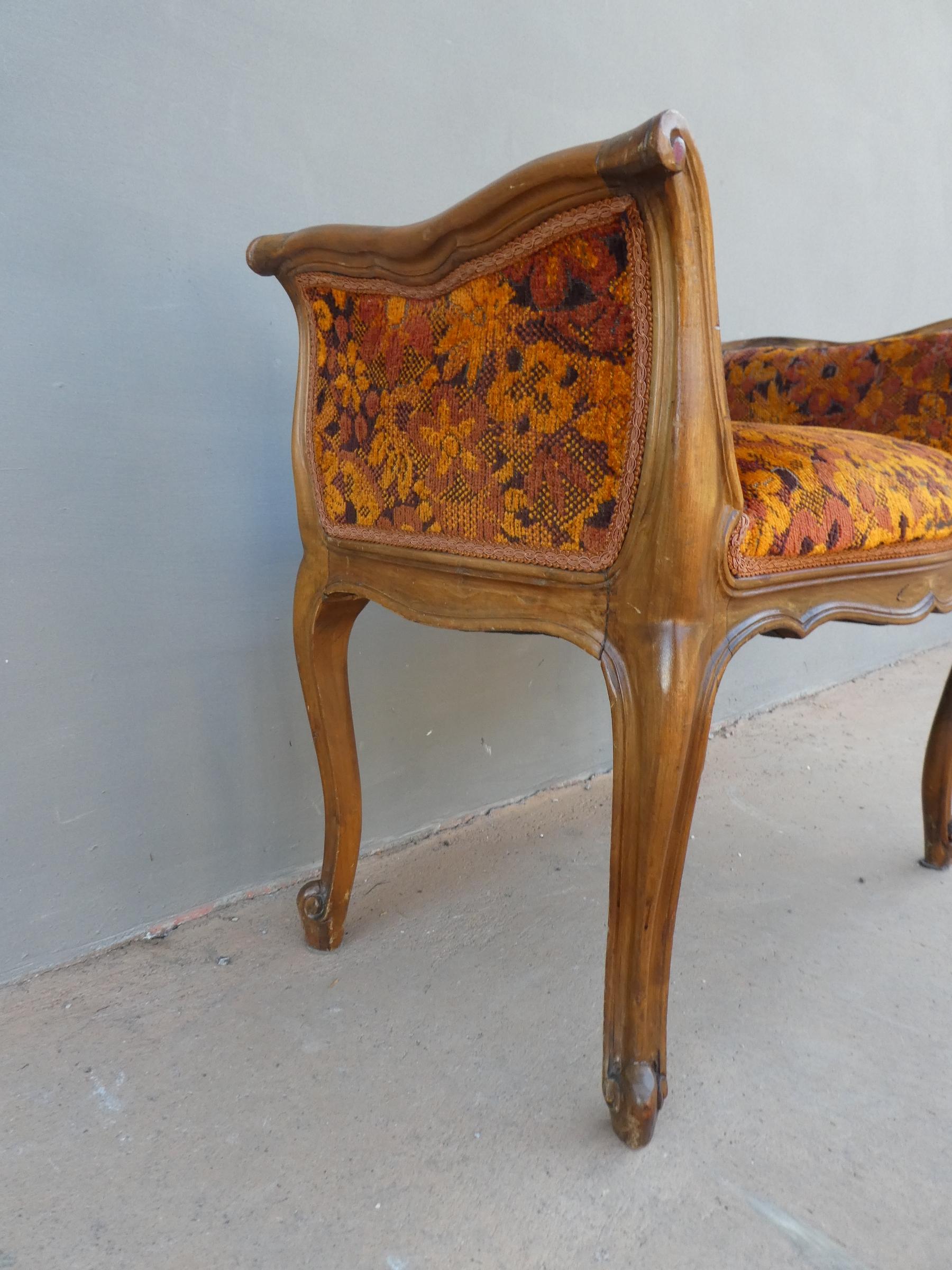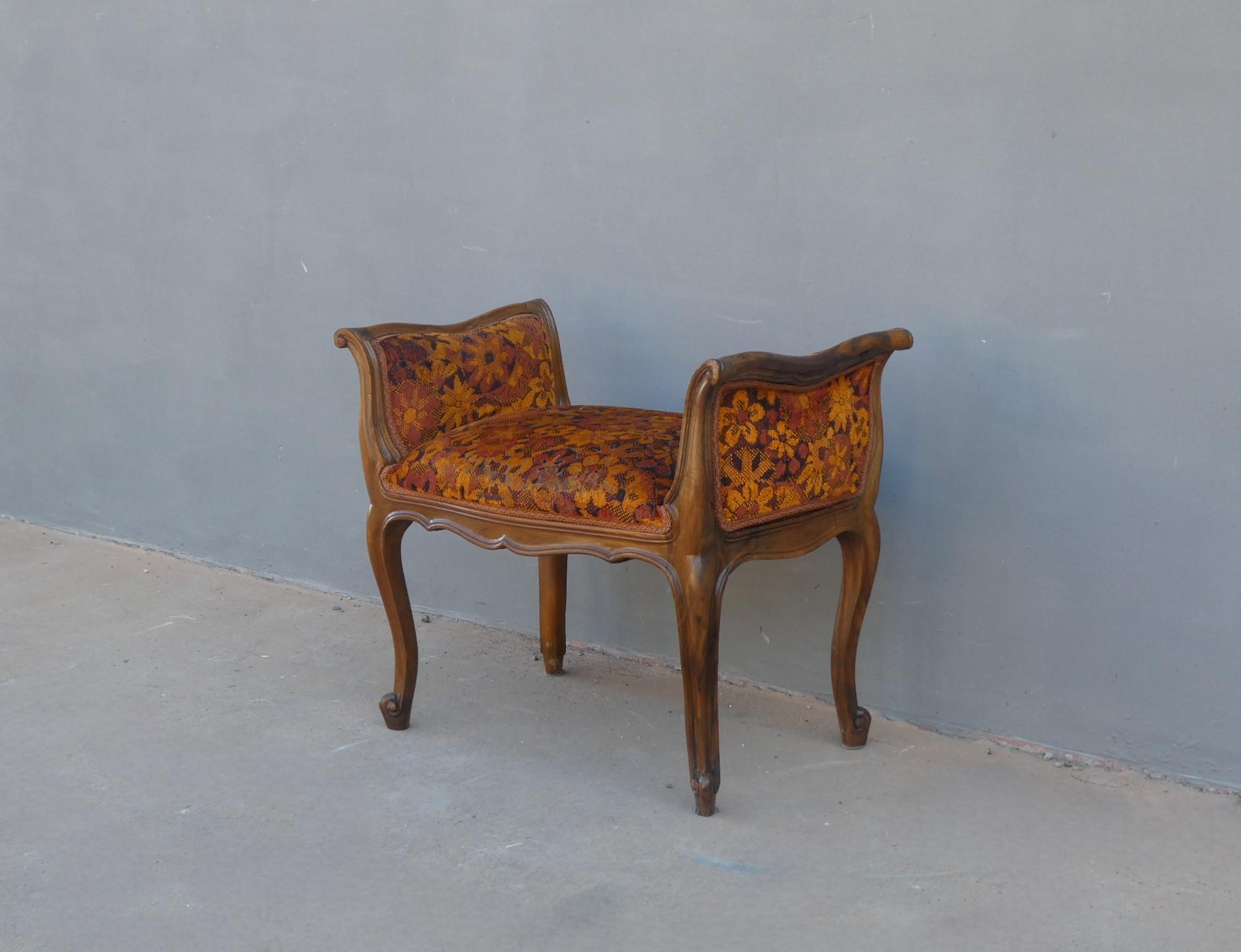 Panchetta panca poggiapiedi scendiletto d’arredo in stile realizzata in legno di noce e la seduta rivestita in tessuto. Necessita di piccoli interventi di restauro (facoltativi – foto). Epoca metà ‘900.