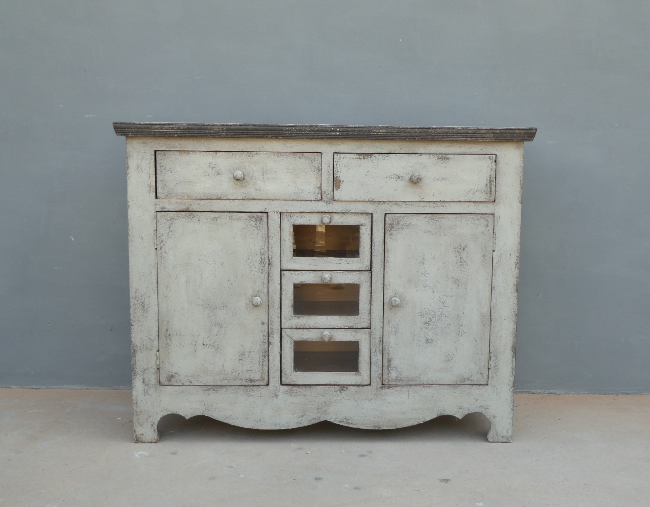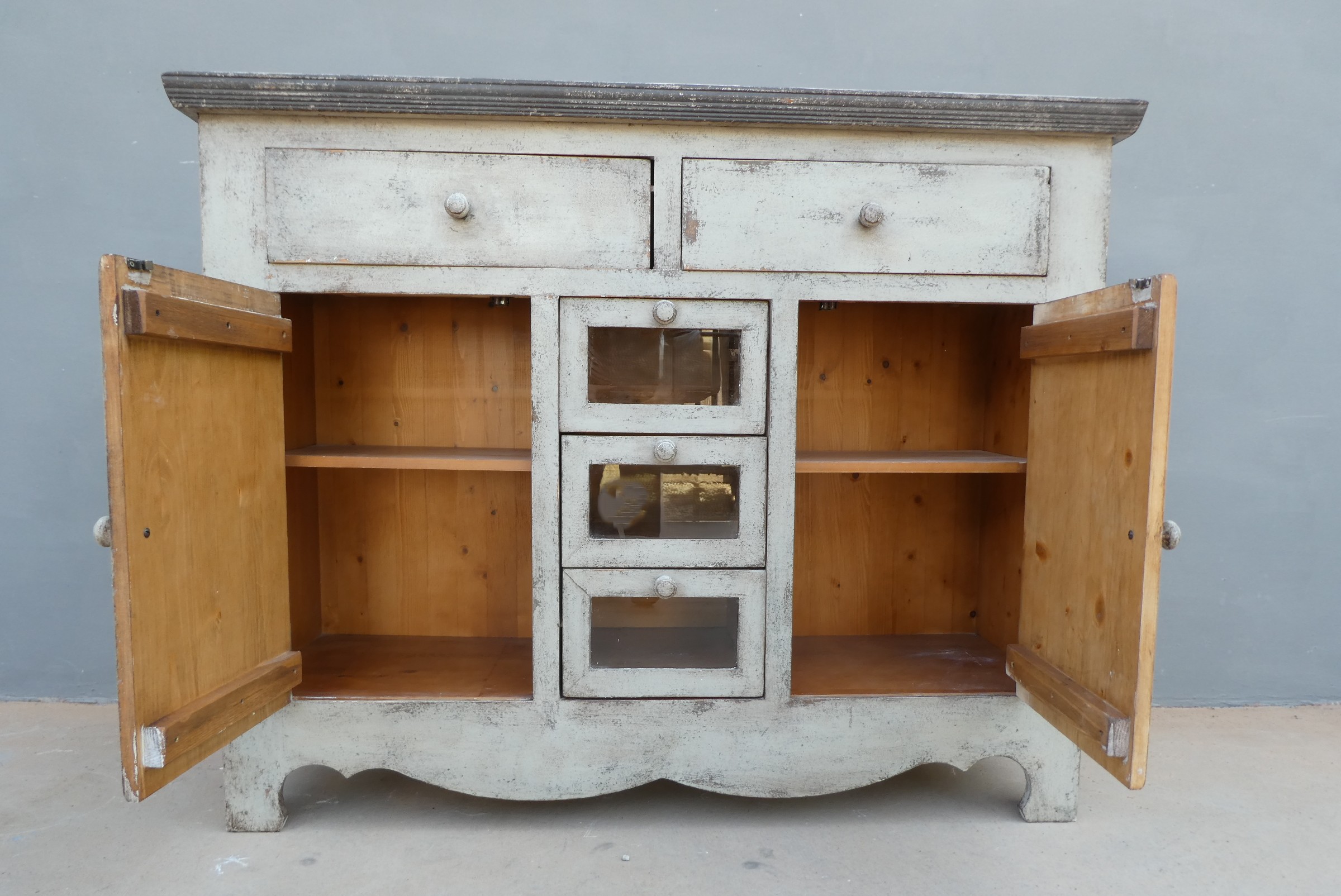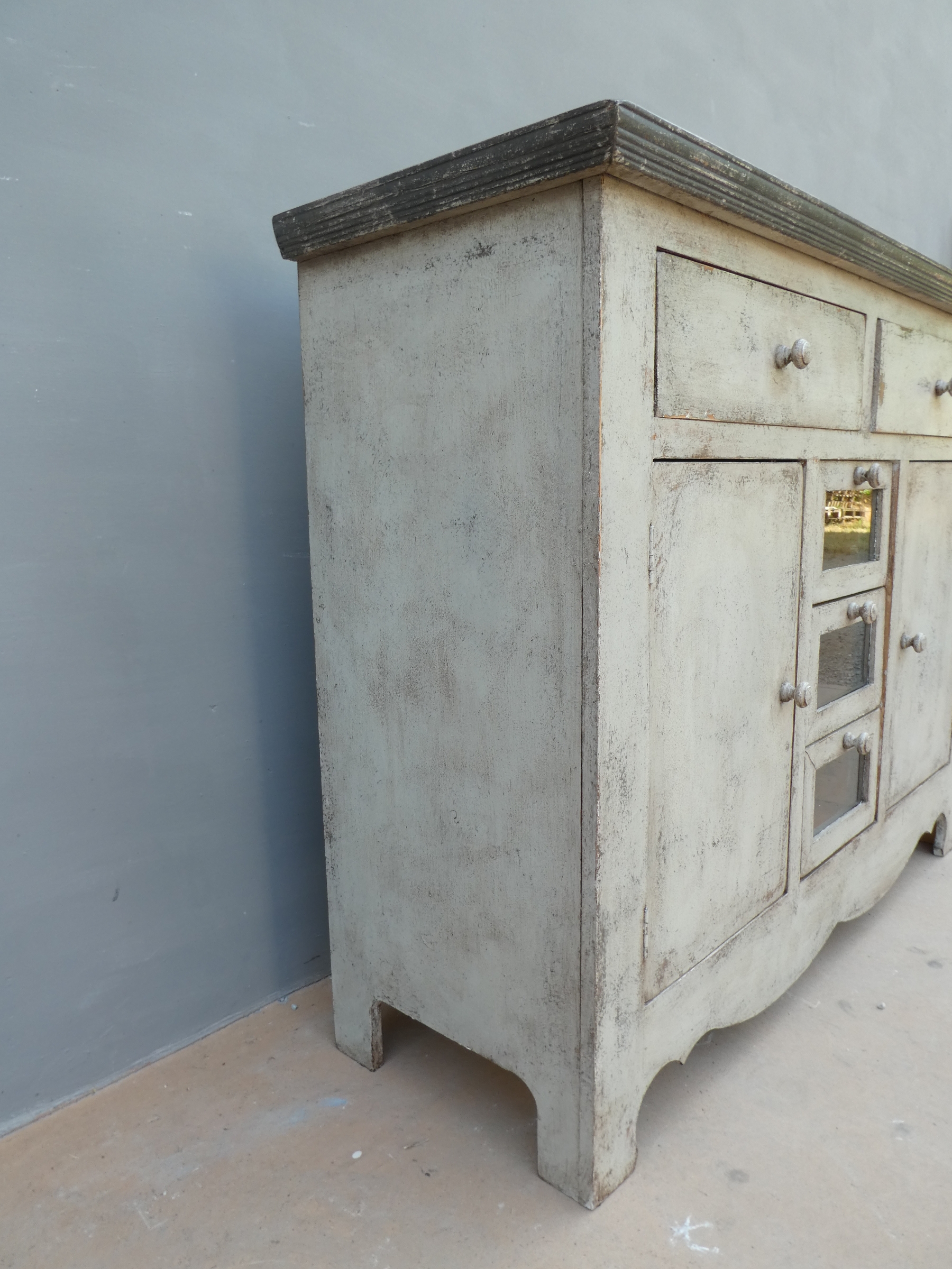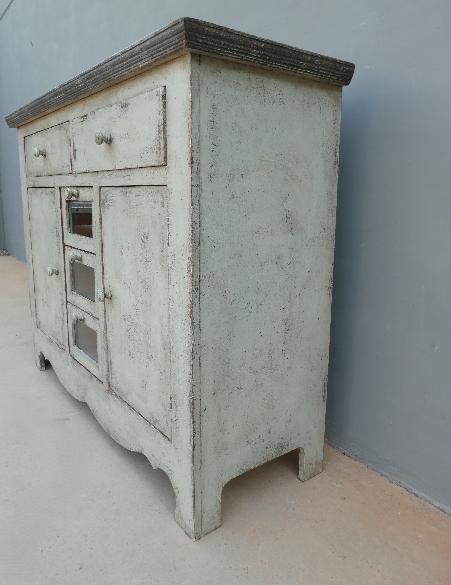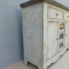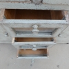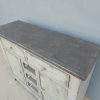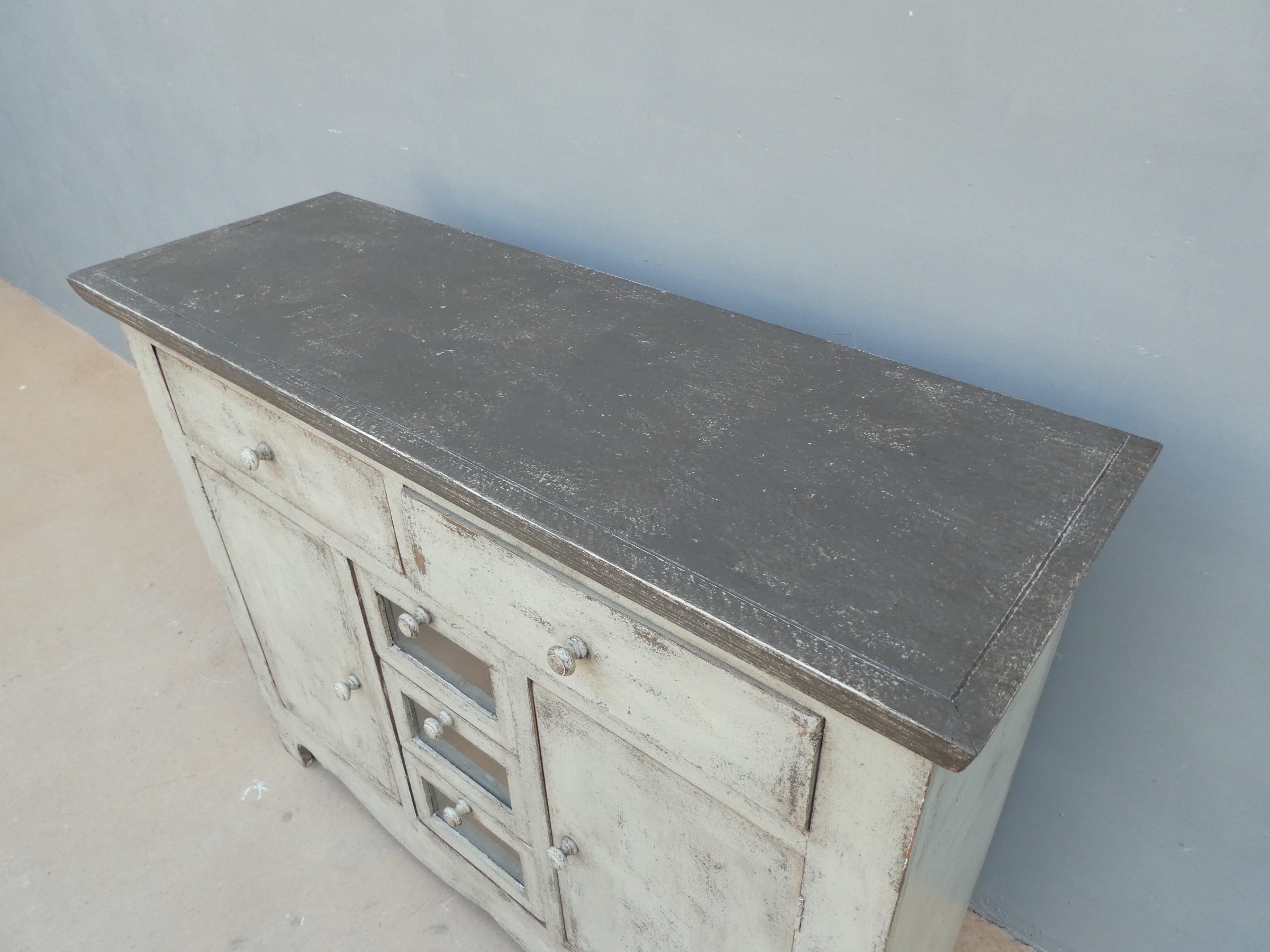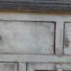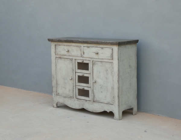 Particolare mobile credenza corredata da due ante laterali e cinque cassetti di due diverse dimensioni, laccata e rifinita con la tecnica “Shabby Chic”. Ciò che rende elegante ed originale questo mobile è il contrasto creato dalla lacca chiara utilizzata per il corpo, con il piano d’appoggio decisamente più scuro. Epoca seconda metà ‘900.