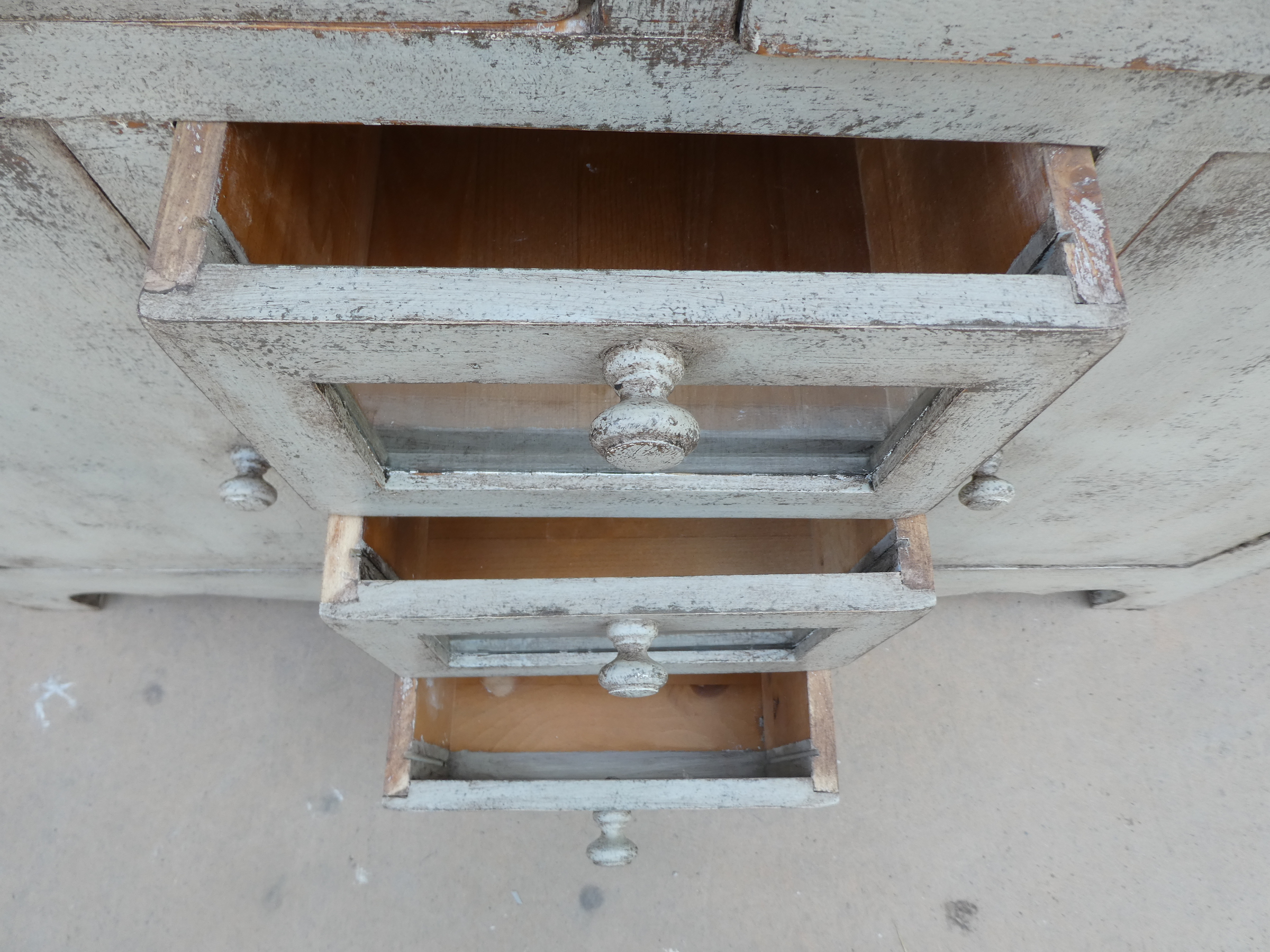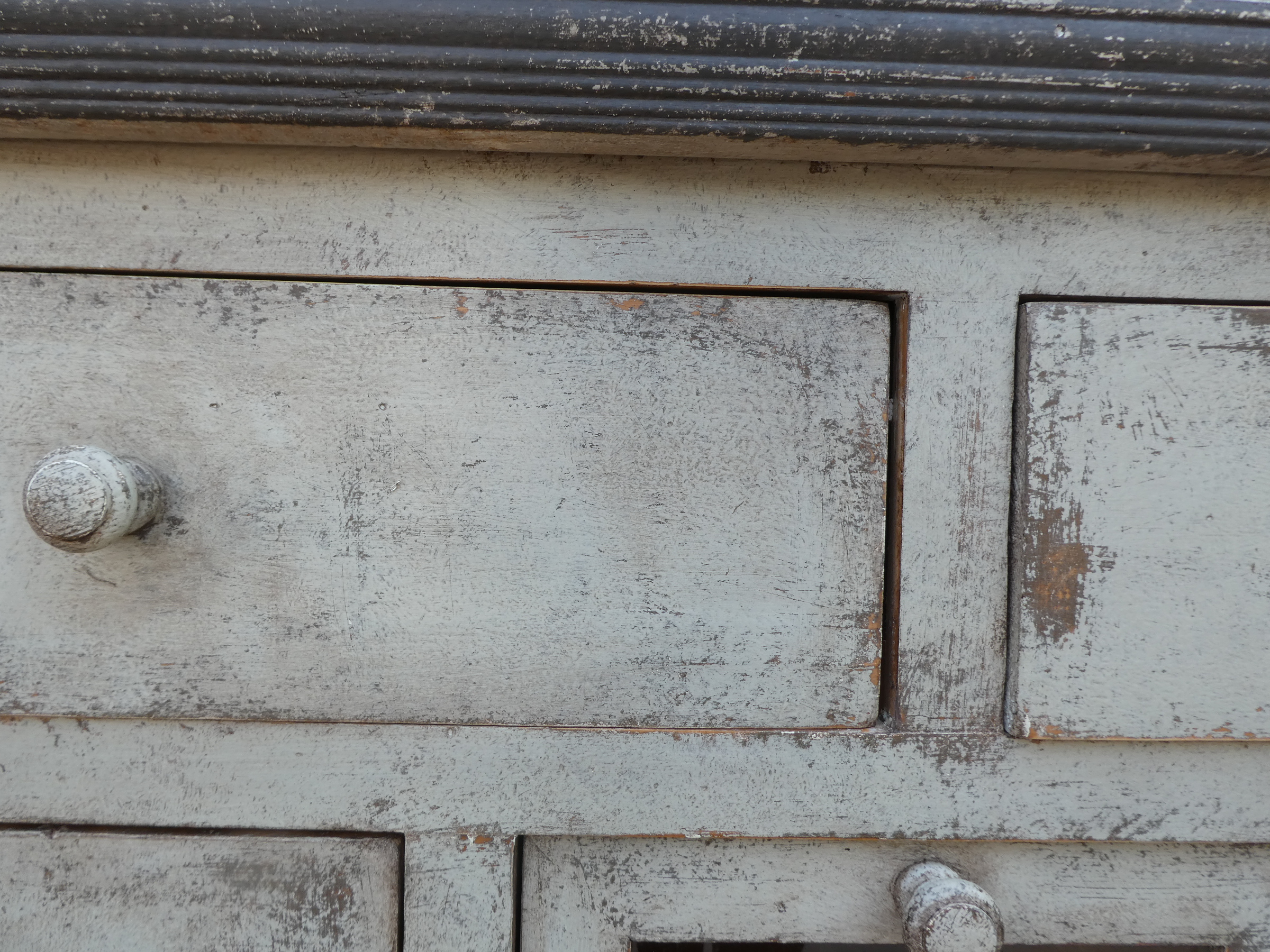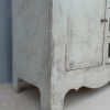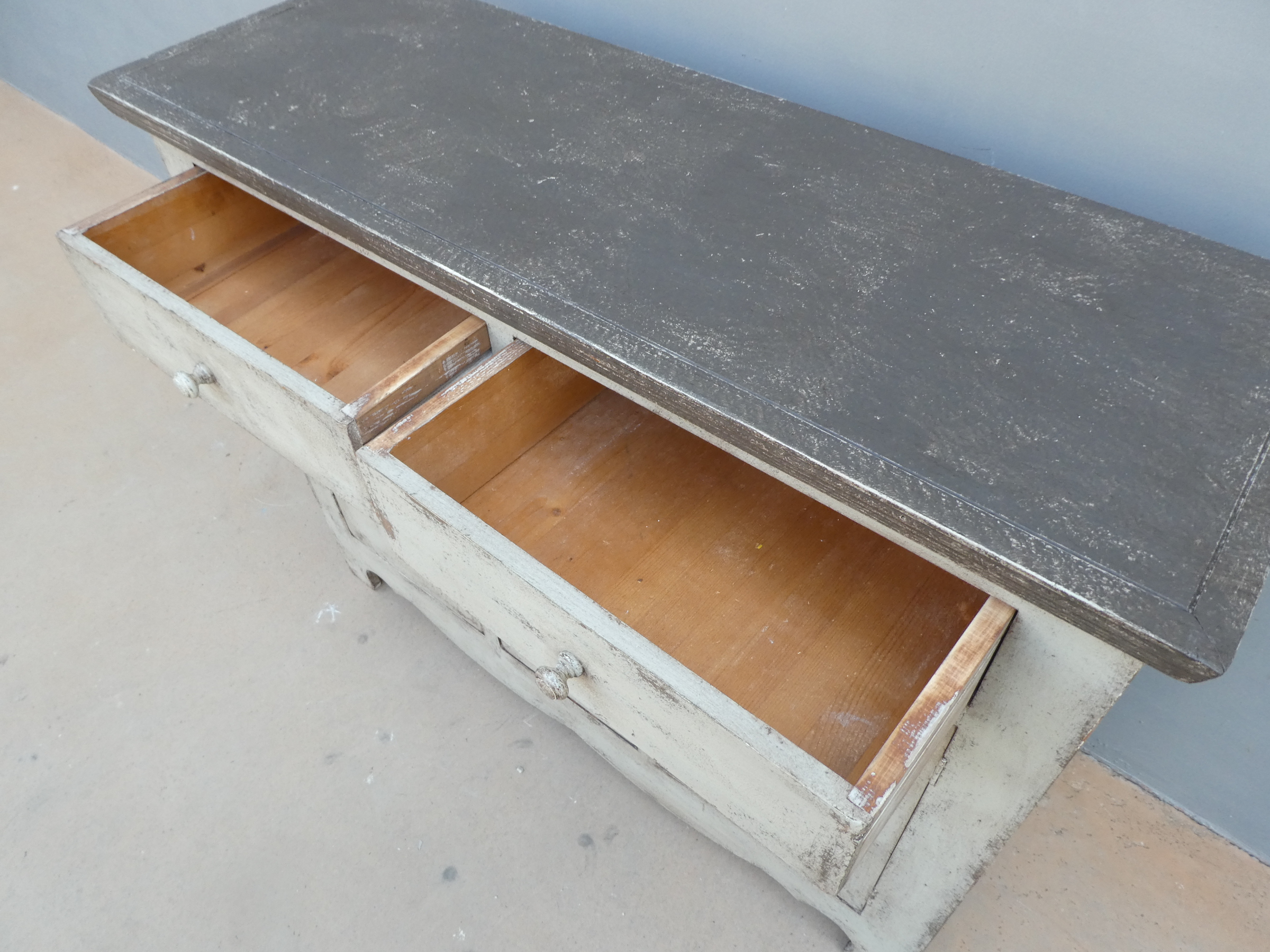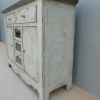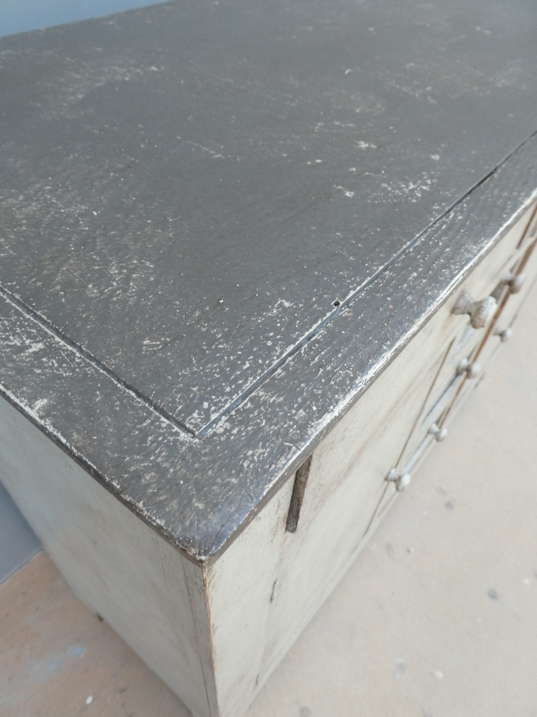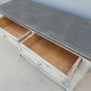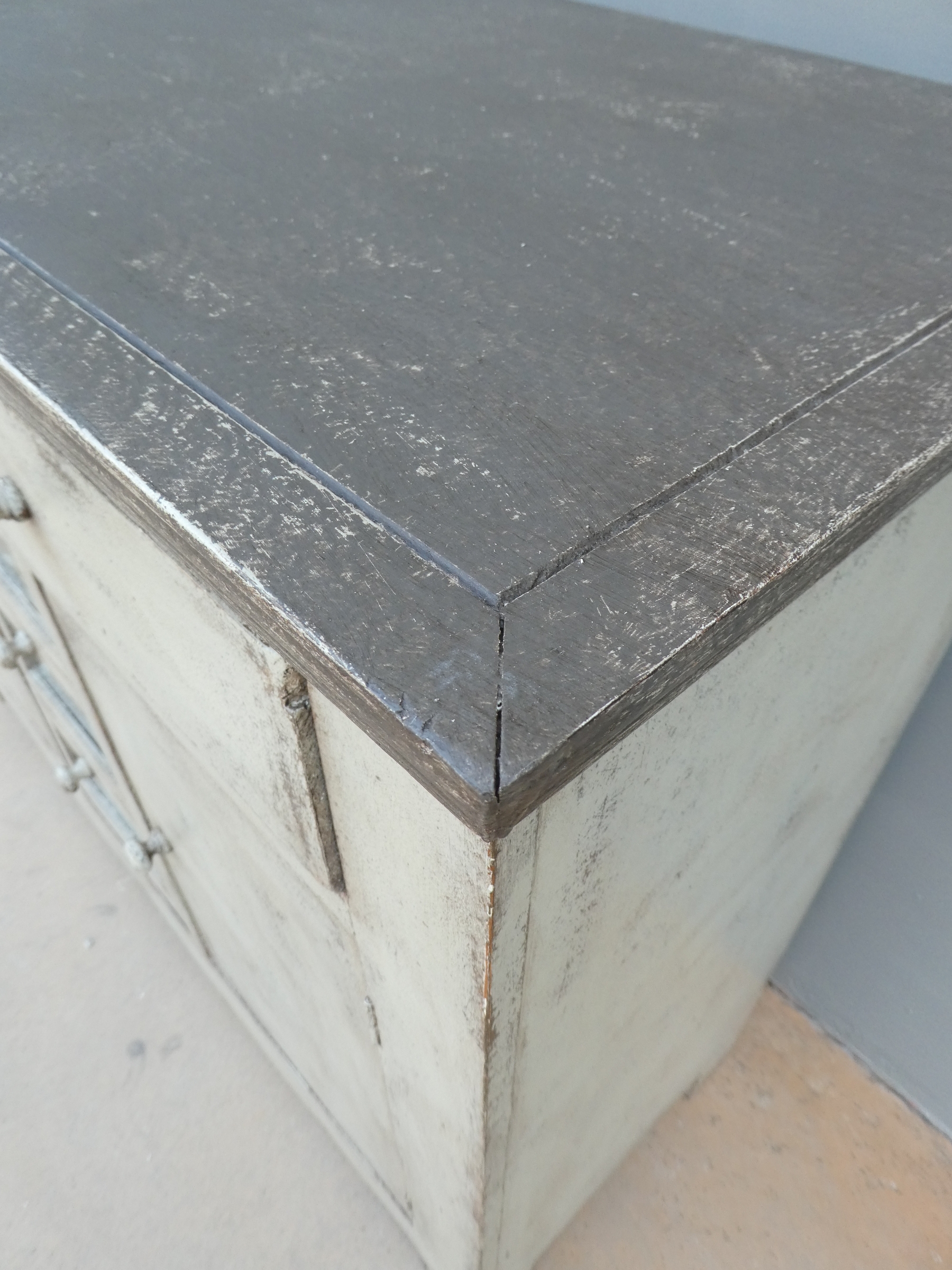Particolare mobile credenza corredata da due ante laterali e cinque cassetti di due diverse dimensioni, laccata e rifinita con la tecnica “Shabby Chic”. Ciò che rende elegante ed originale questo mobile è il contrasto creato dalla lacca chiara utilizzata per il corpo, con il piano d’appoggio decisamente più scuro. Epoca seconda metà ‘900.
