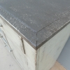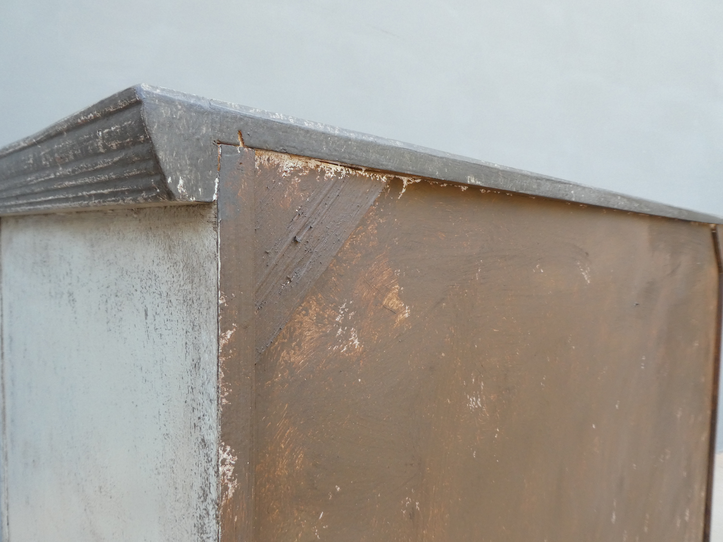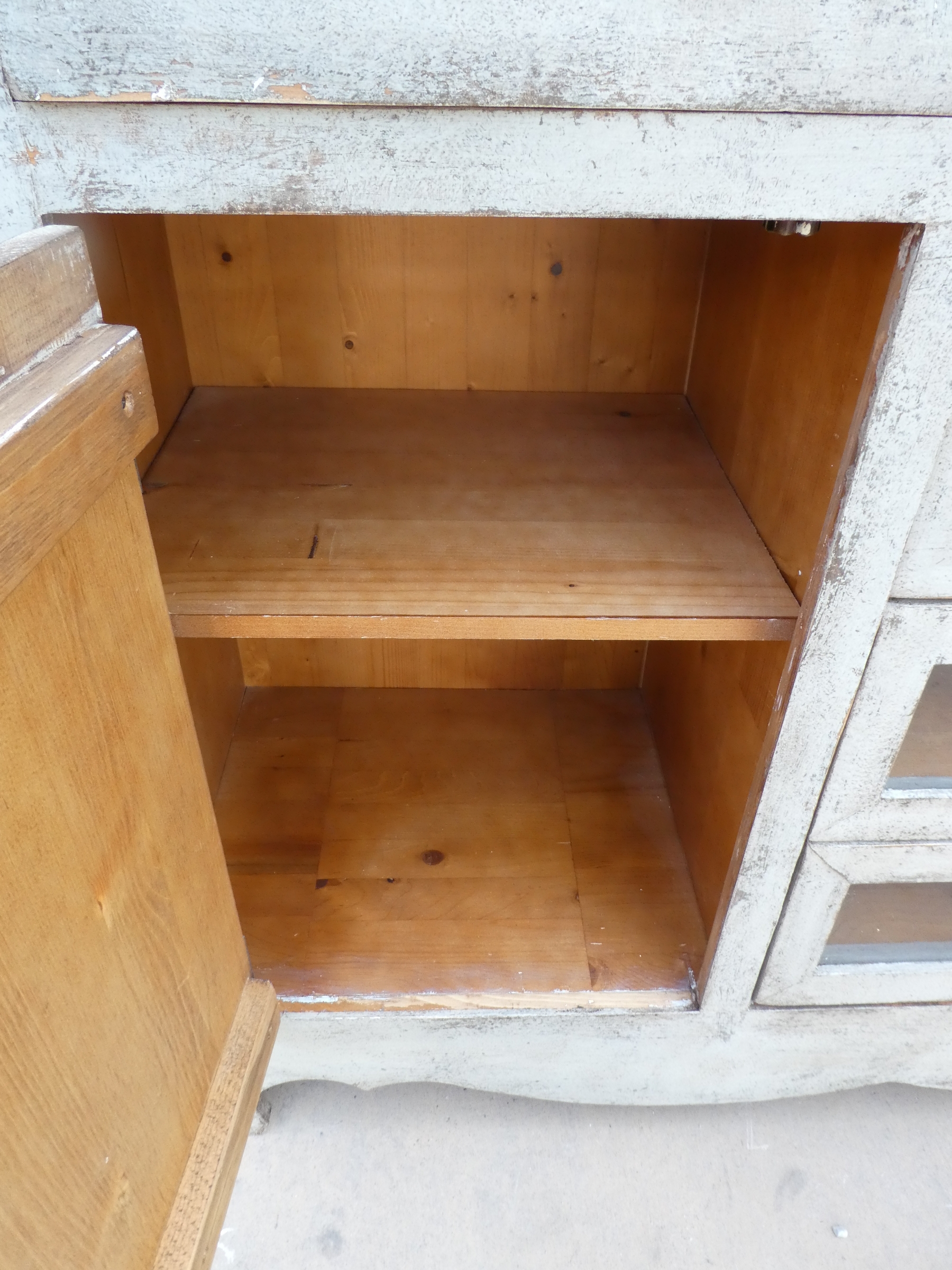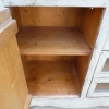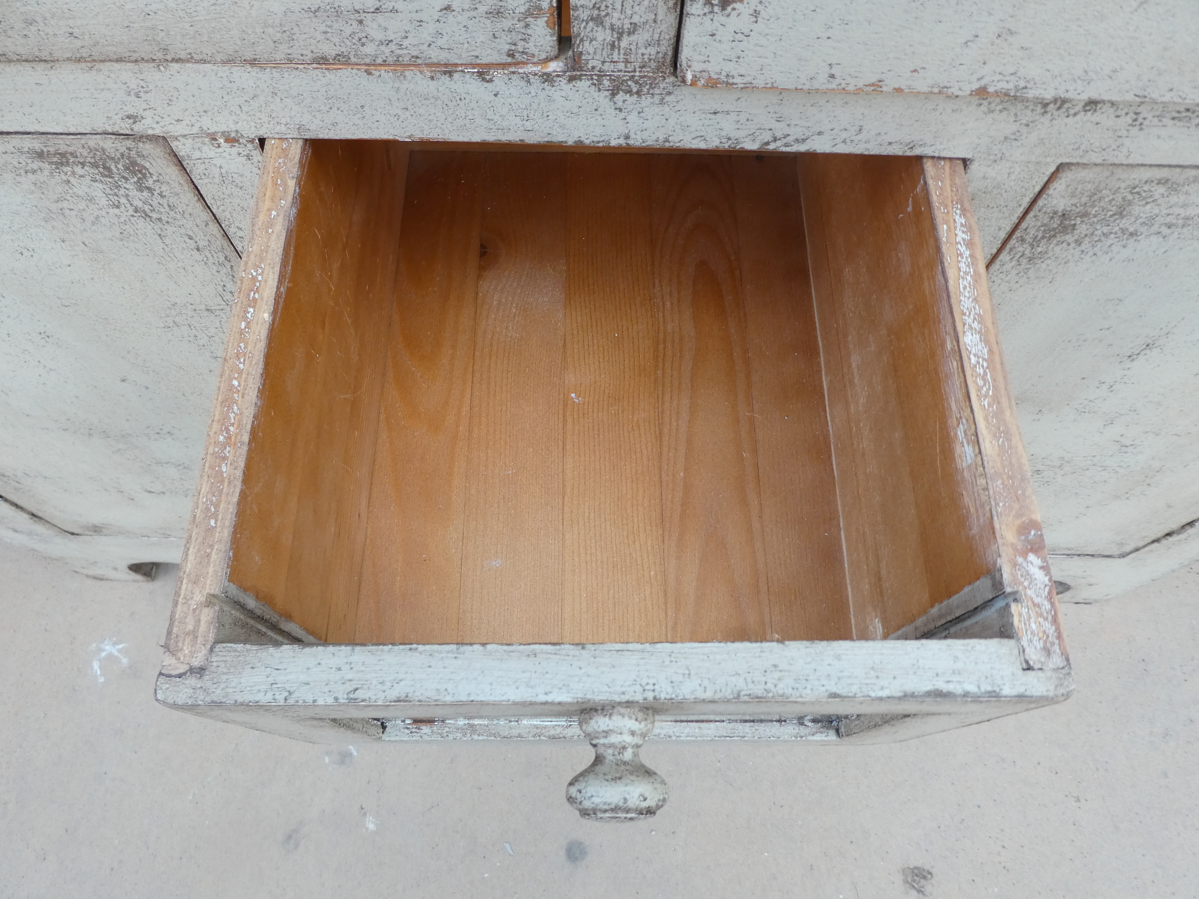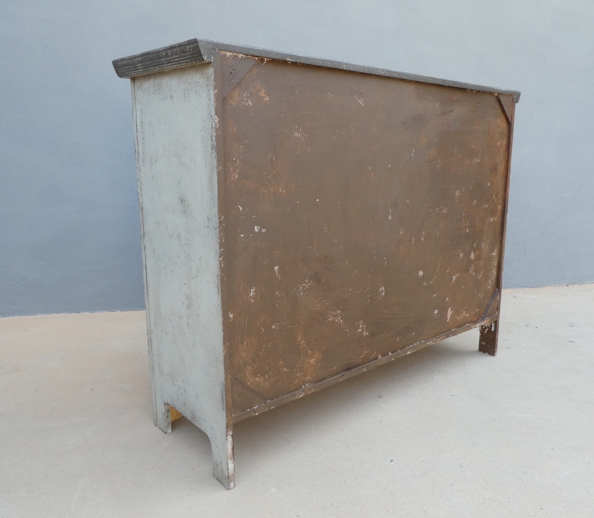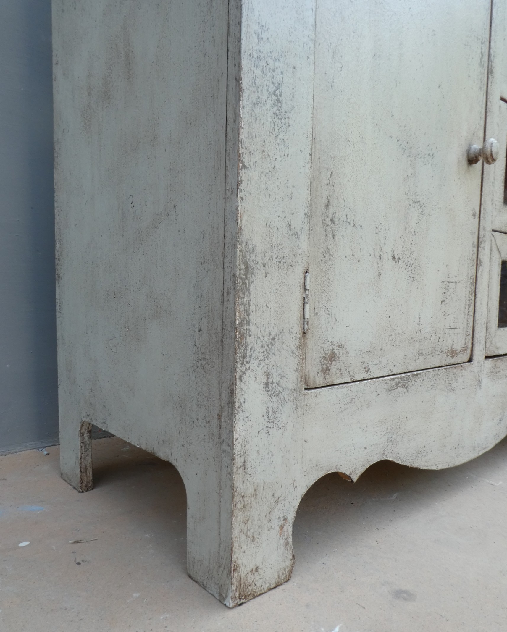 Particolare mobile credenza corredata da due ante laterali e cinque cassetti di due diverse dimensioni, laccata e rifinita con la tecnica “Shabby Chic”. Ciò che rende elegante ed originale questo mobile è il contrasto creato dalla lacca chiara utilizzata per il corpo, con il piano d’appoggio decisamente più scuro. Epoca seconda metà ‘900.