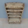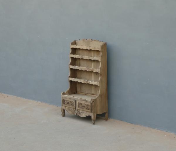Mobile piattaia scaffale pensile a ripiani fissi, realizzata in legno di noce e dotata di un doppio cassetto sul fronte. La grande cura riservata all’intaglio, e l’armonioso movimento della struttura, sono gli elementi chiave appartenenti allo stile provenzale francese. All’occorrenza, grazie agli appositi ganci sul retro, si può anche appendere. Necessita di leggeri interventi di restauro, sono presenti buchi di tarlo. Epoca metà ‘900.